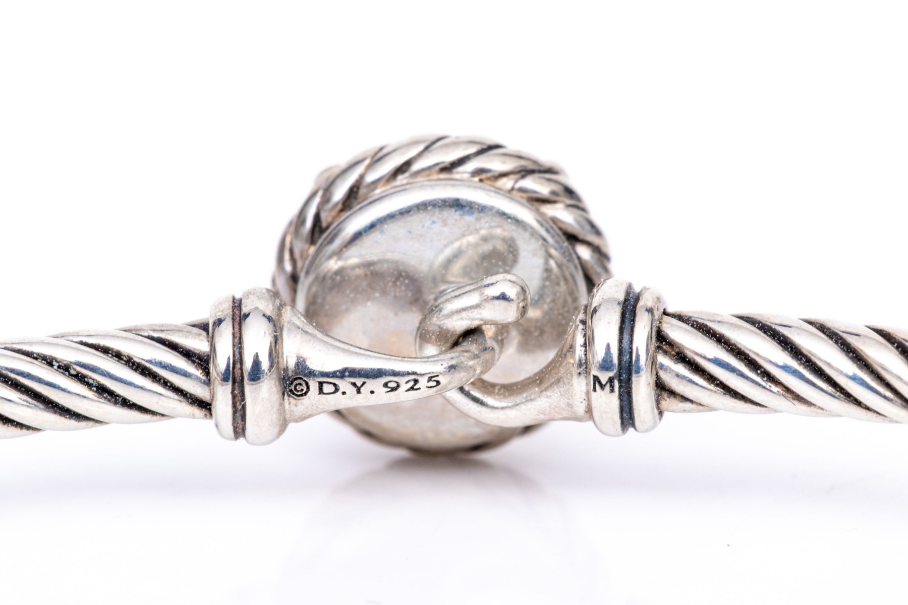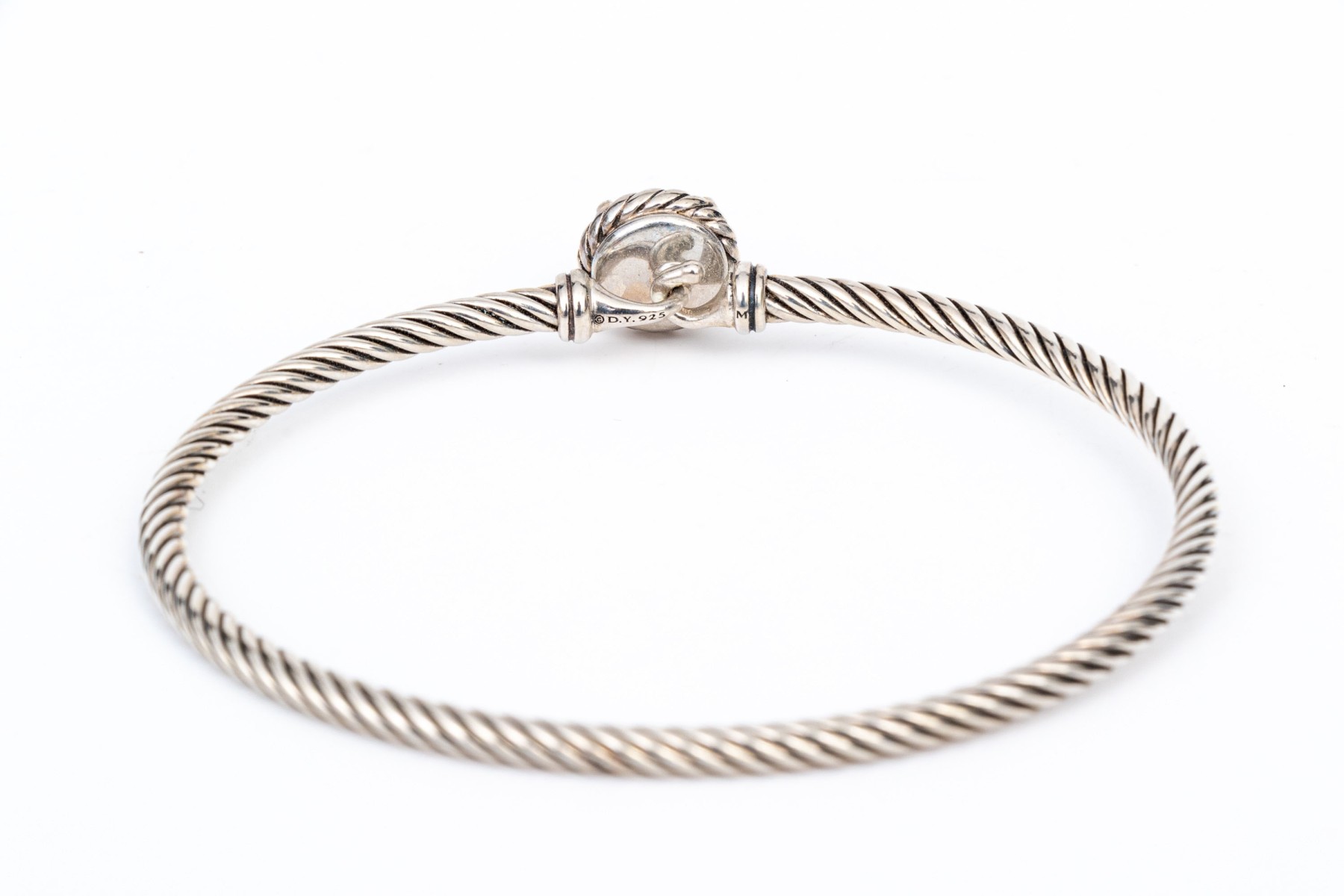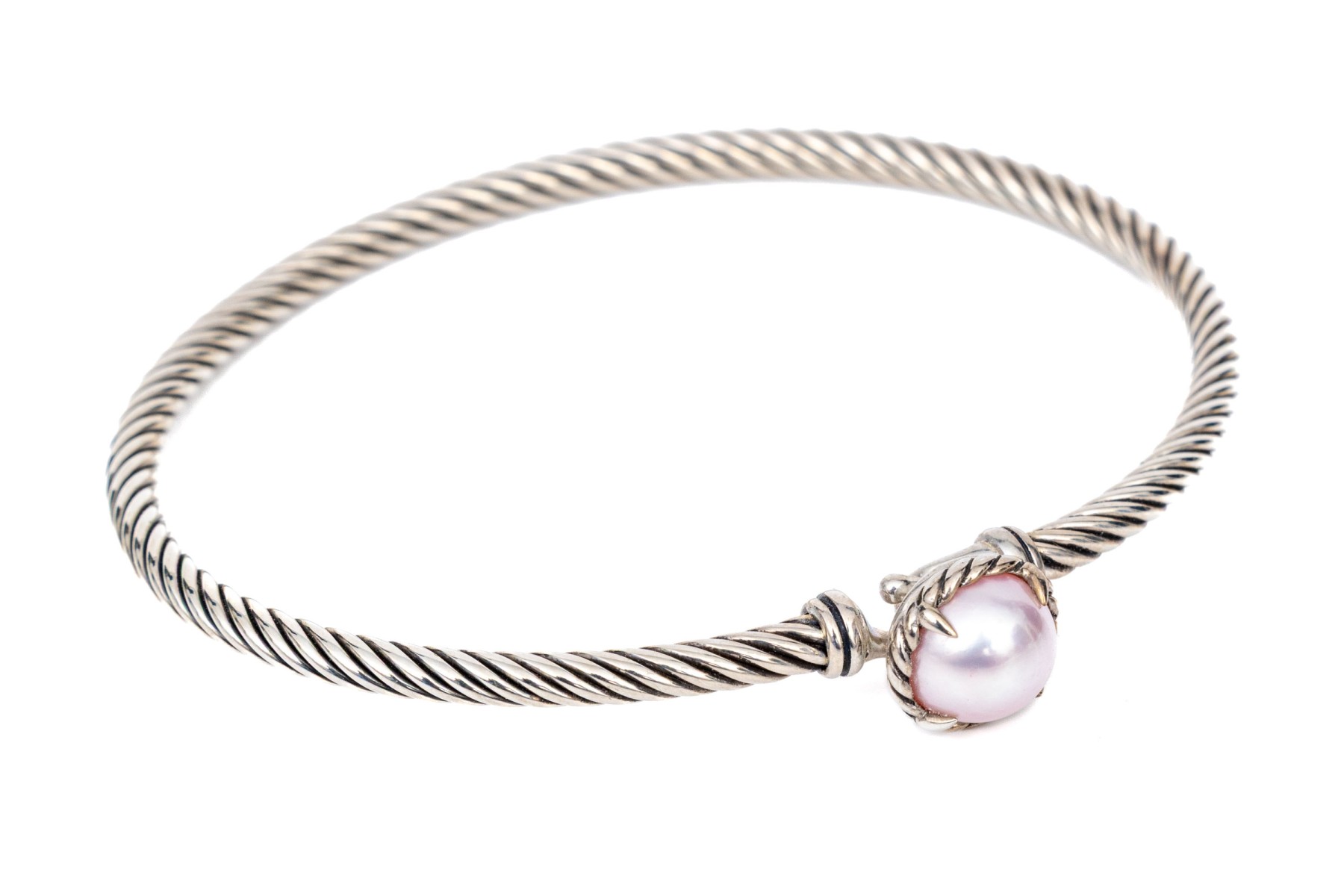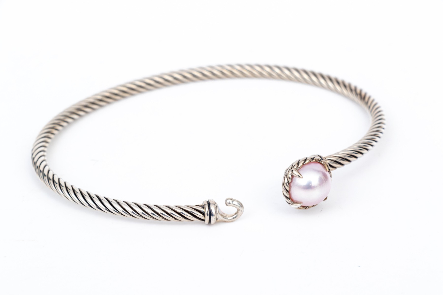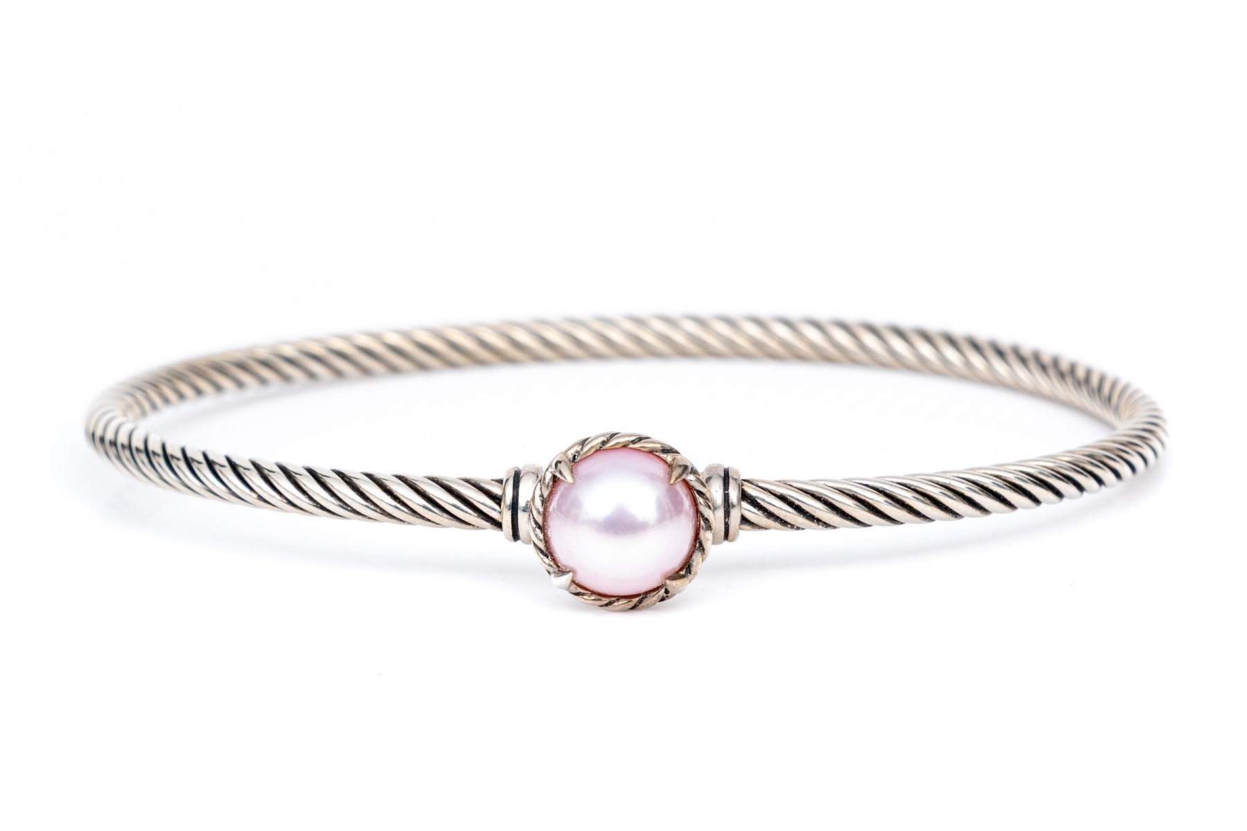 David Yurman sterling silver "Petite Chatelaine" cultured mabe pearl bangle bracelet. This striking sterling silver bangle bracelet featured a cable form, set with a cultured mabe pearl top, and finished with a hook style closure
