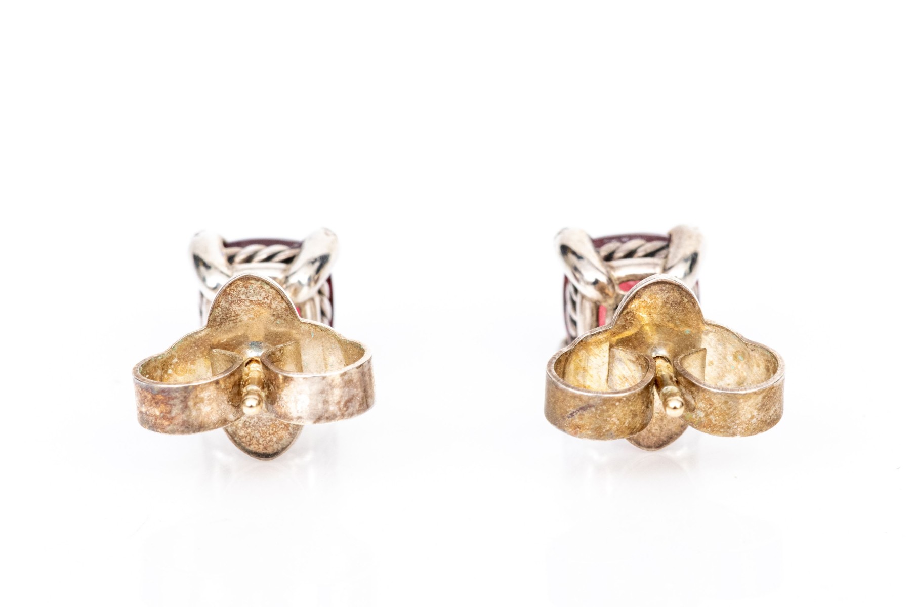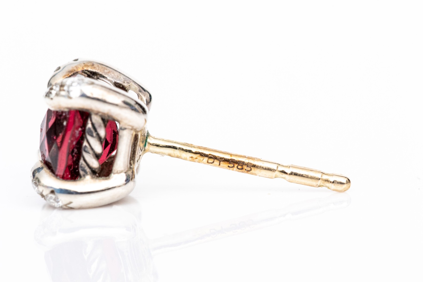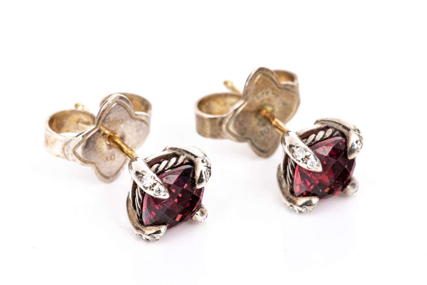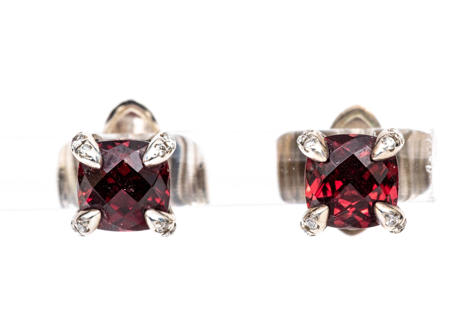 David Yurman sterling silver "Petite Chatelaine" rhodolite garnet and diamond earrings. These striking earrings feature a checkerboard cushion rhodolite garnet center, 2.50 TCW, set with diamond accented prongs, app. 0.05 TCW, finished with posts and clutch style backs