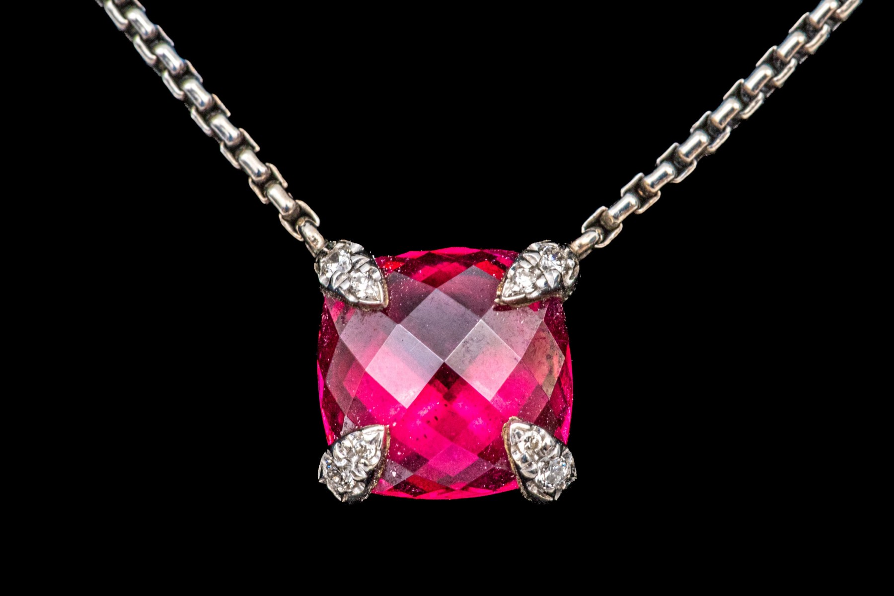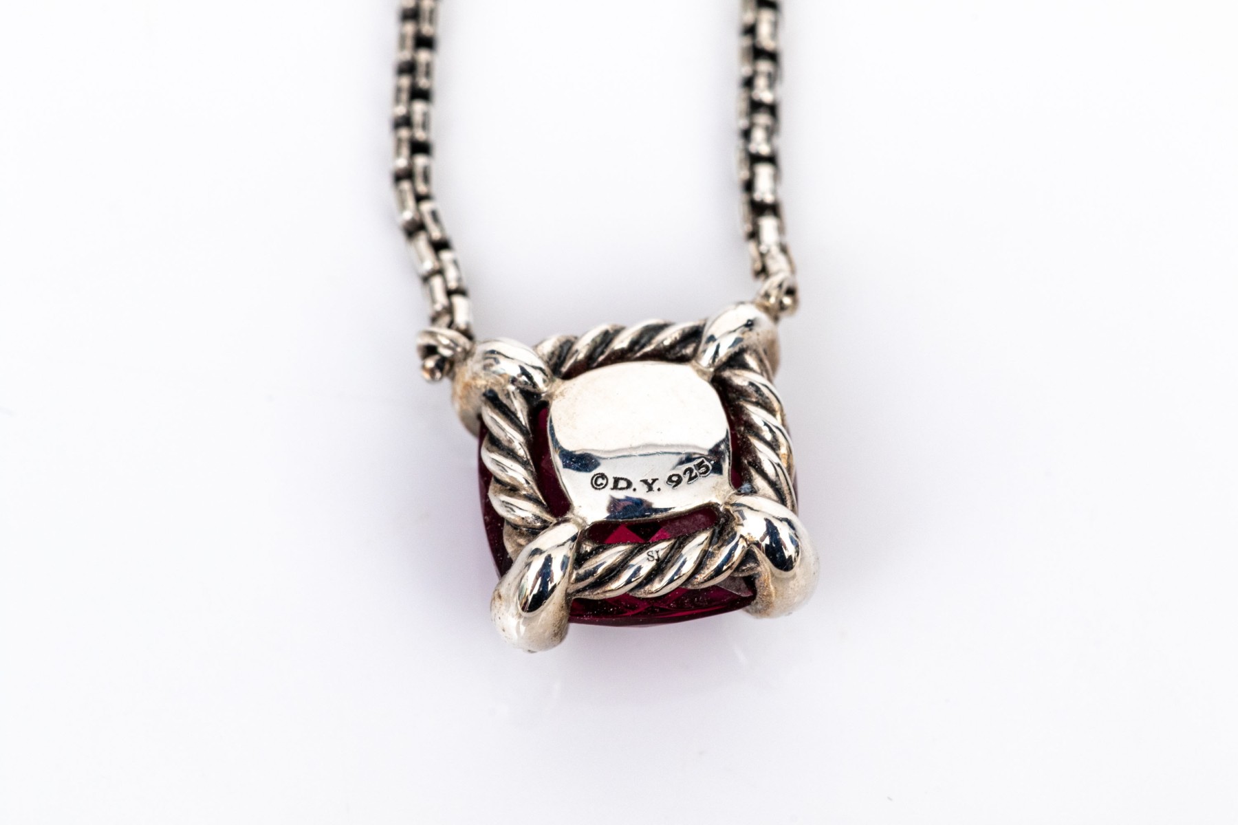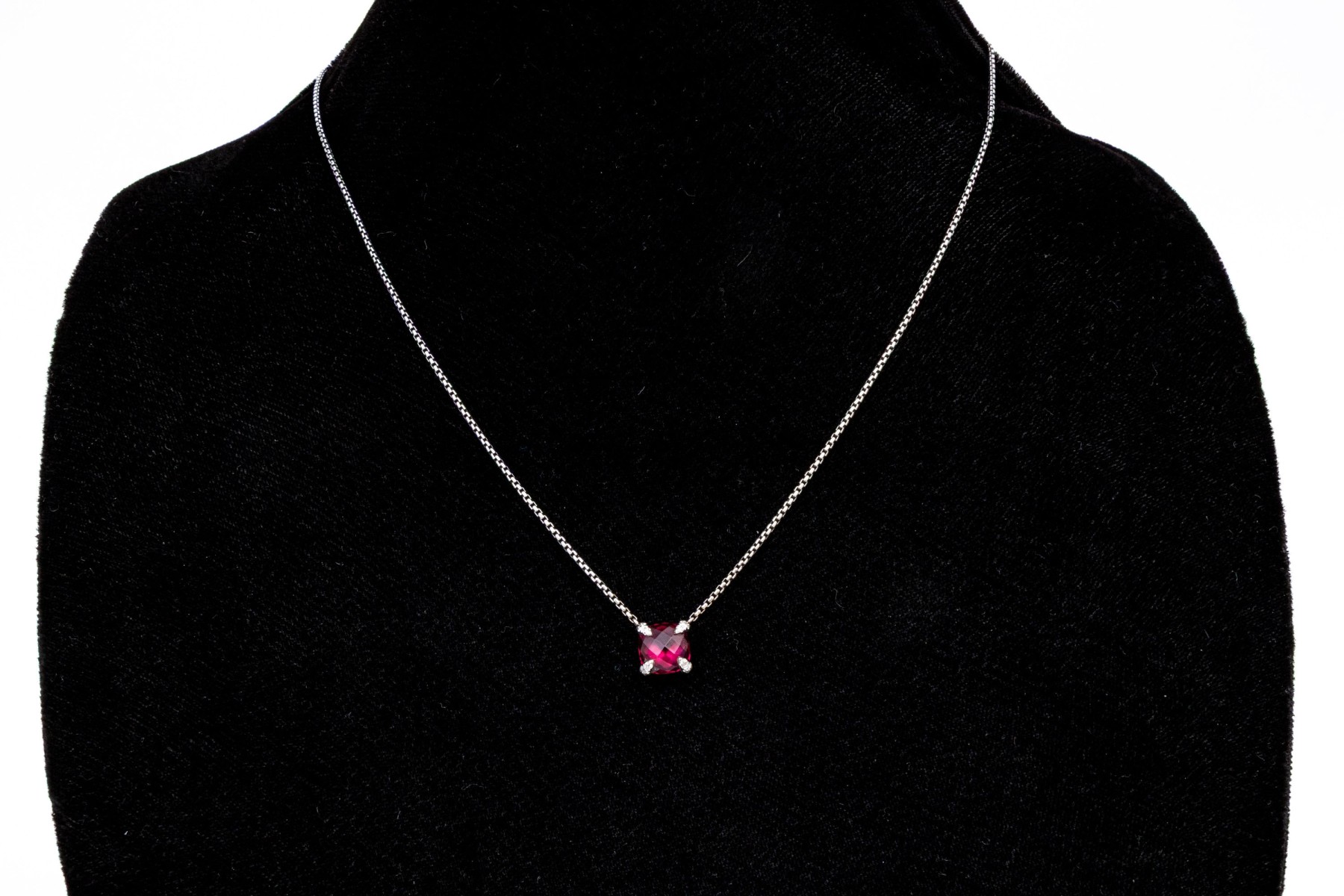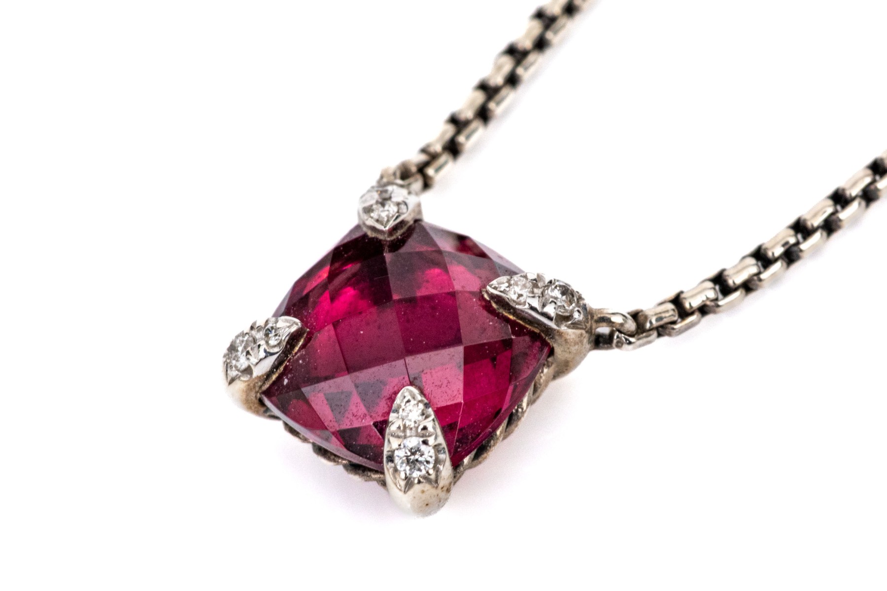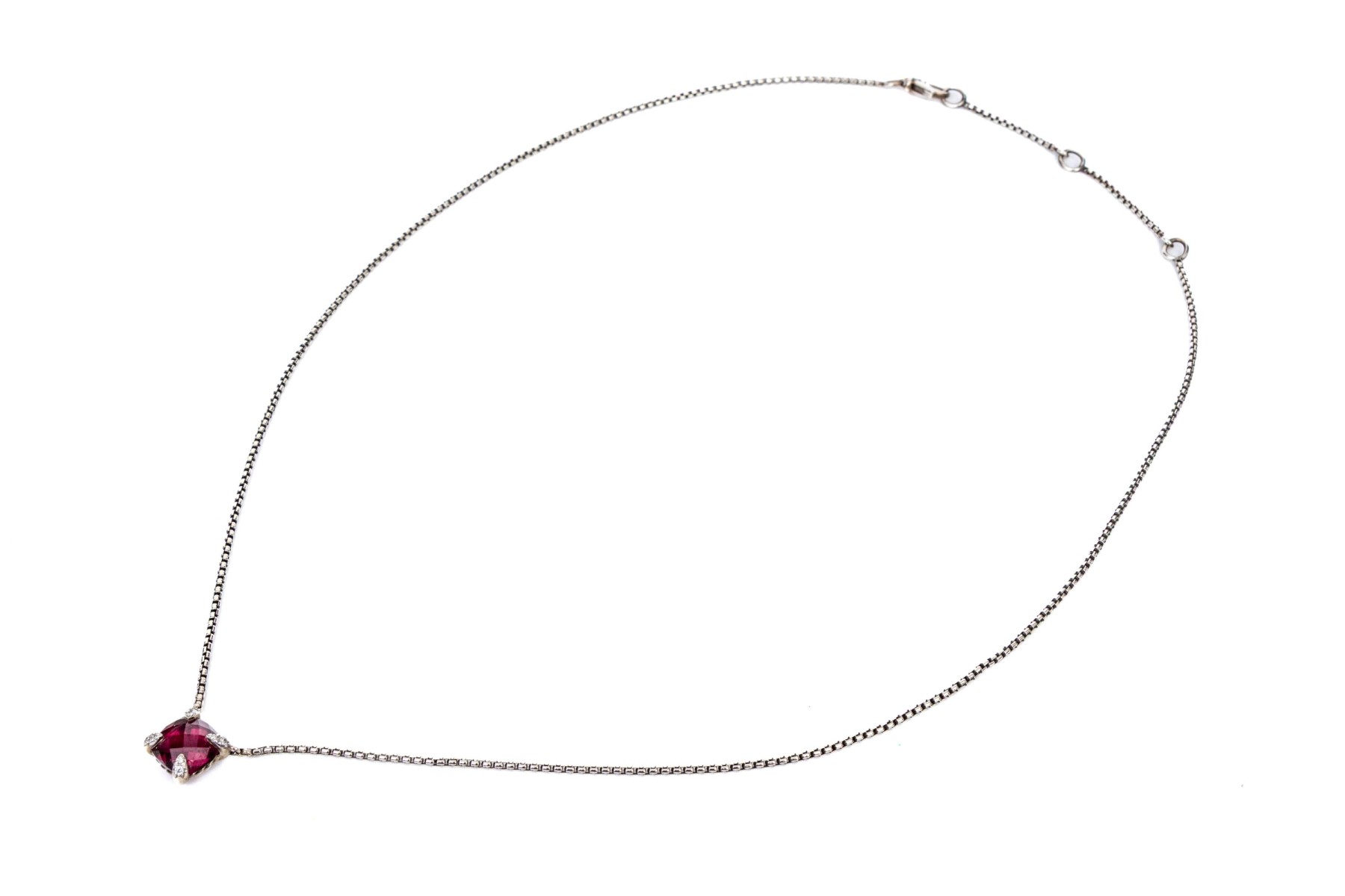 David Yurman sterling silver "Petite Chatelaine" rhodolite garnet and diamond pendant, on chain. This lovely pendant features a checkerboard cushion rhodolite garnet, 2.89 CTS, set with diamond accented prongs, app. 0.02 TCW, displayed on a box style chain and finished with a lobster claw style clasp.