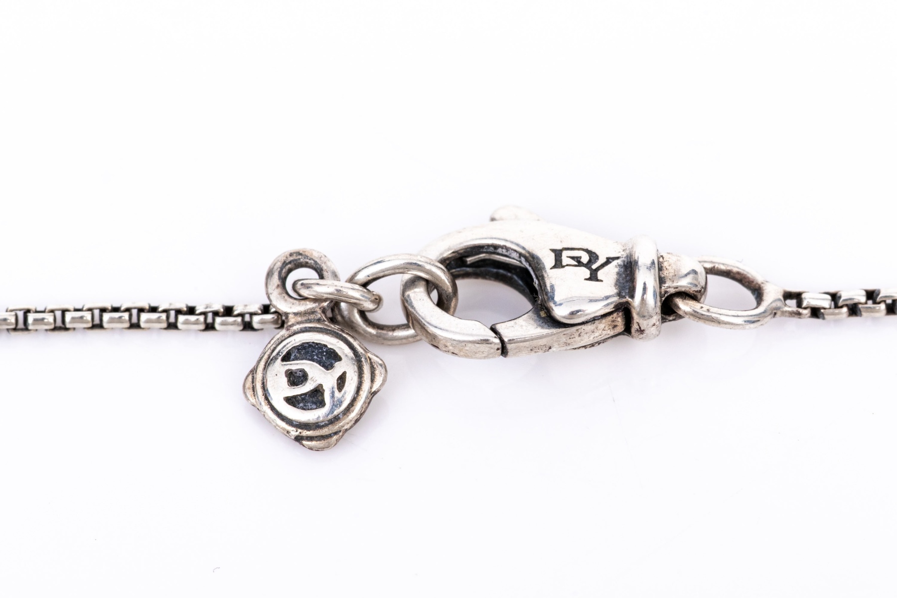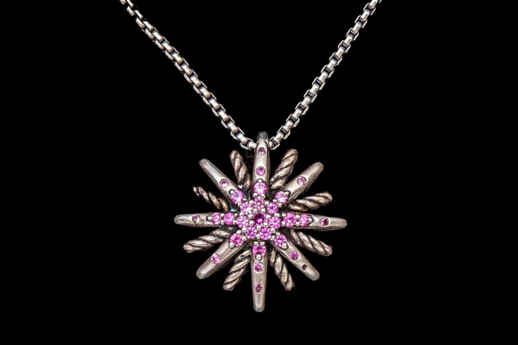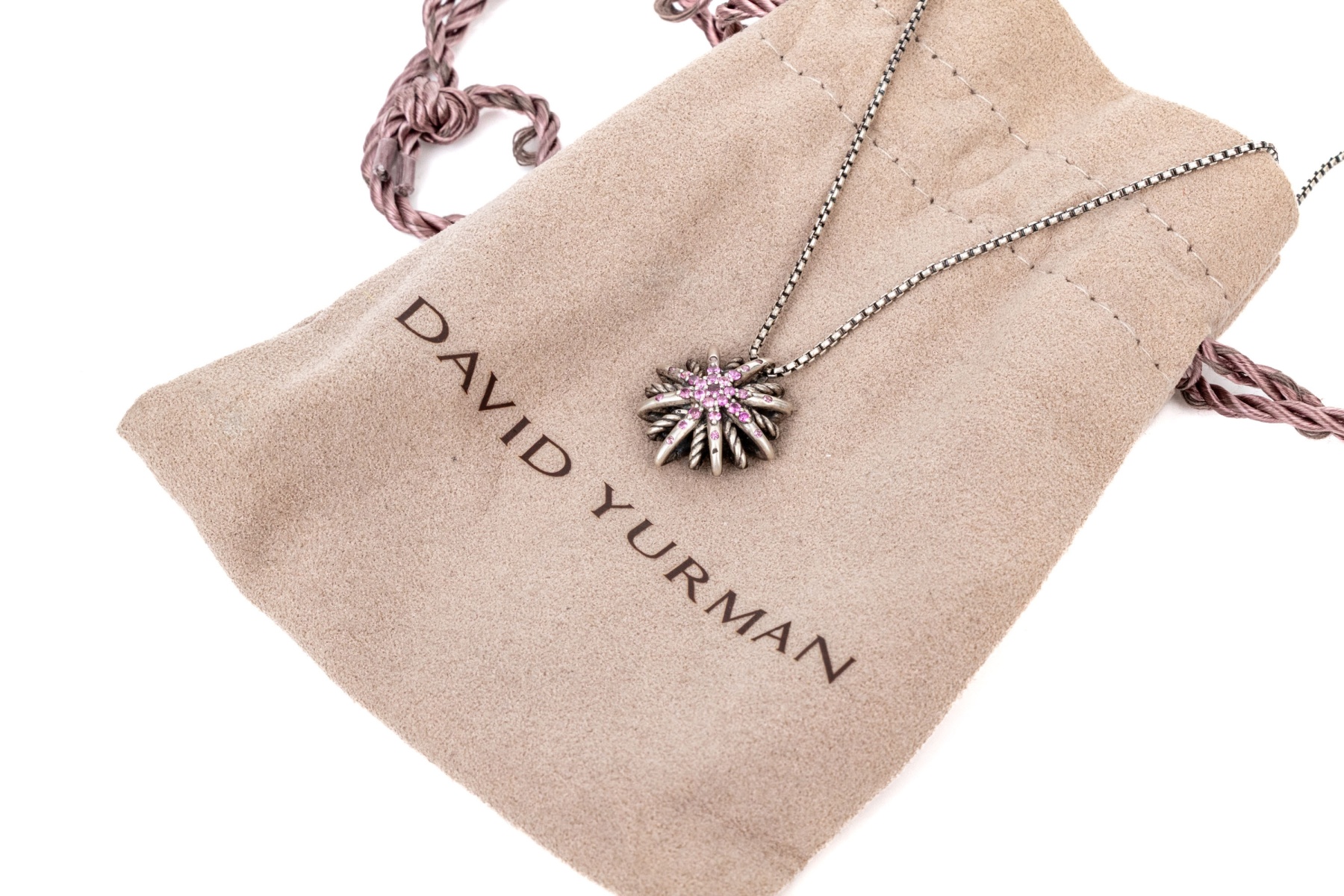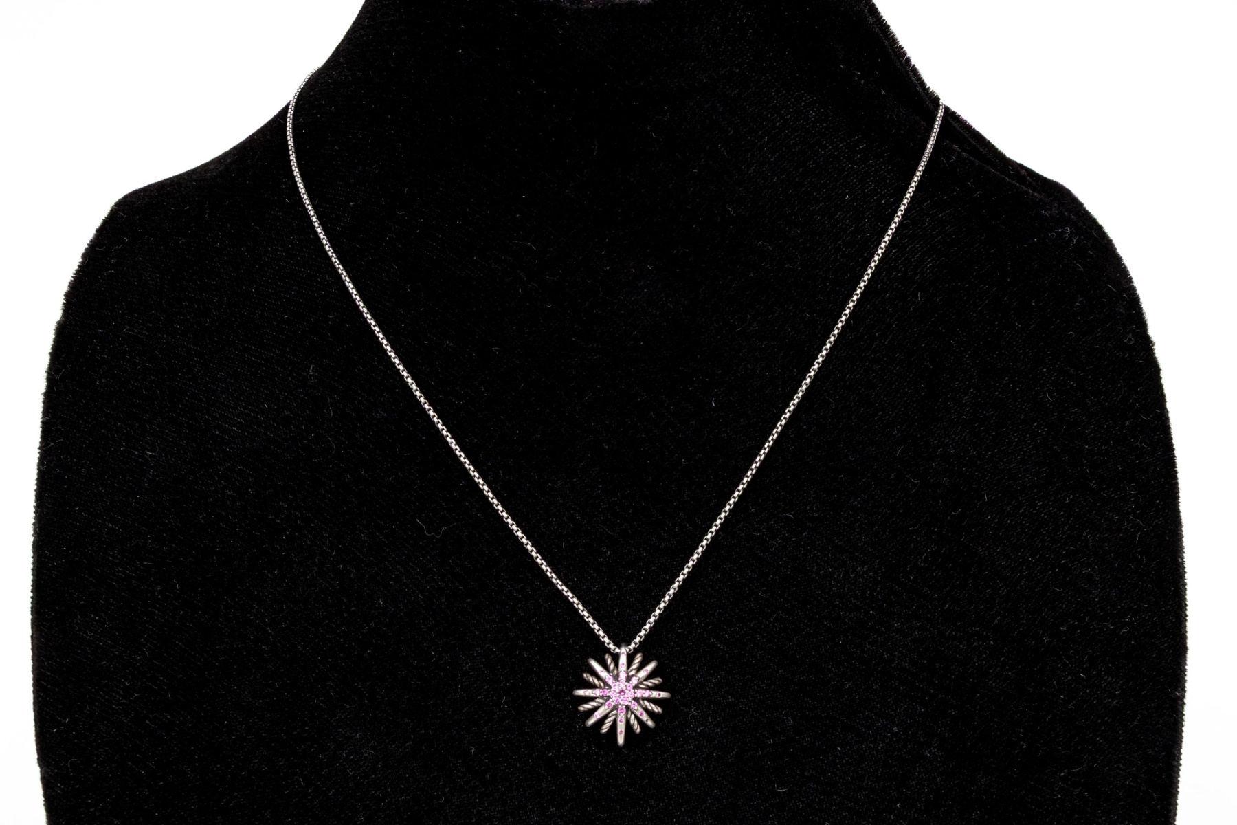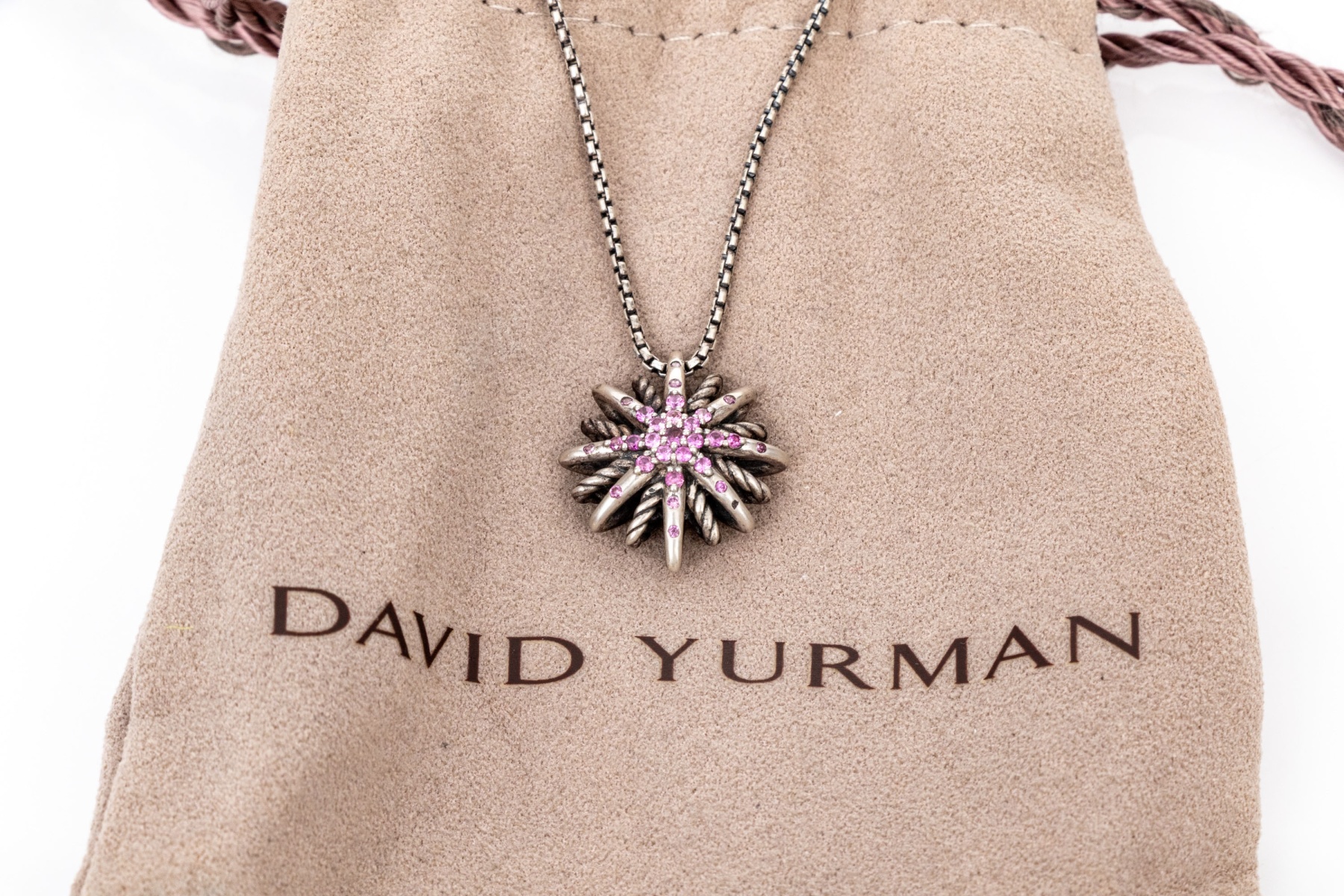 This lovely sterling silver pendant and chain by David Yurman is a 2013 special edition, featuring a cabled starburst pendant, set with a cluster of round faceted pink sapphires, approximately 0.30 TCW, prong set, displayed on a box style chain and finished with a lobster claw style clasp. Accompanied by a pouch