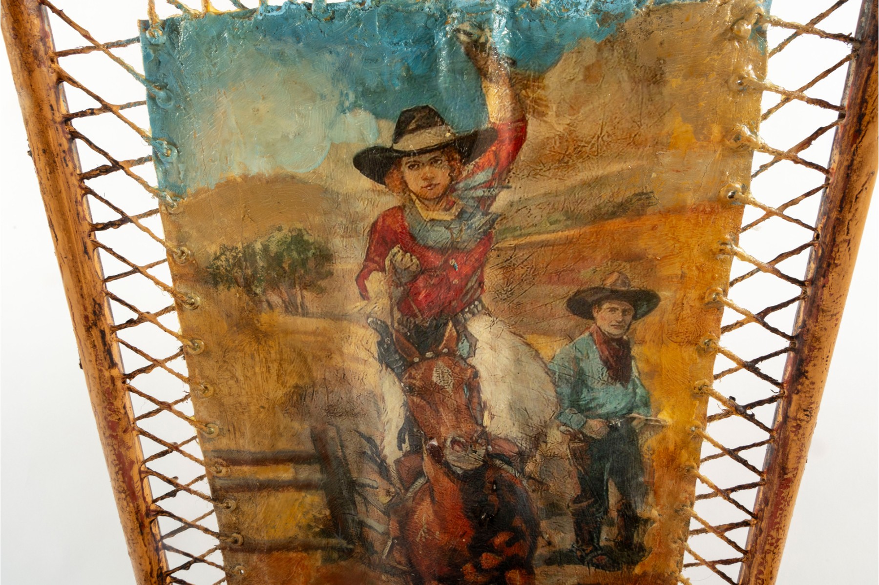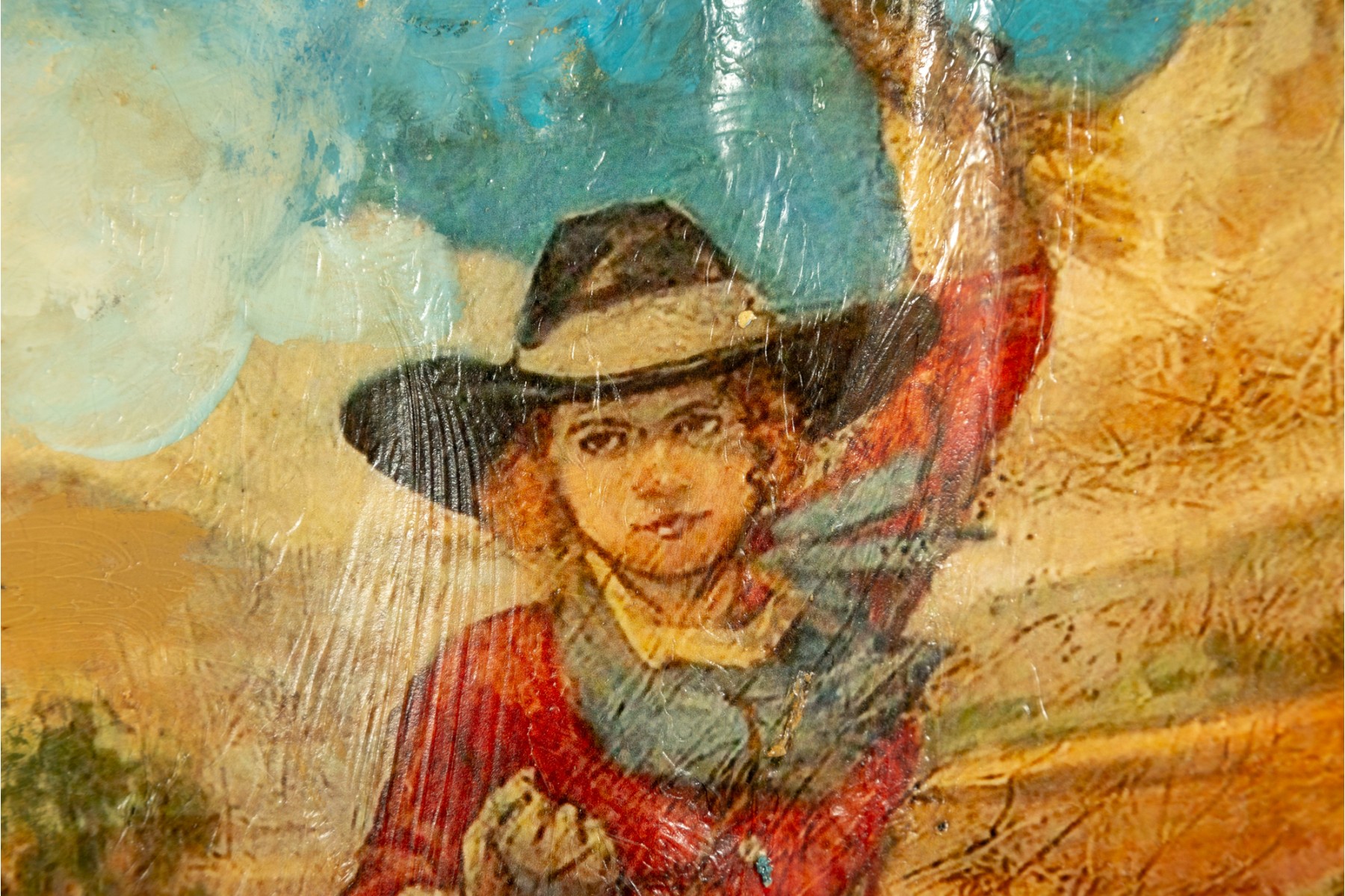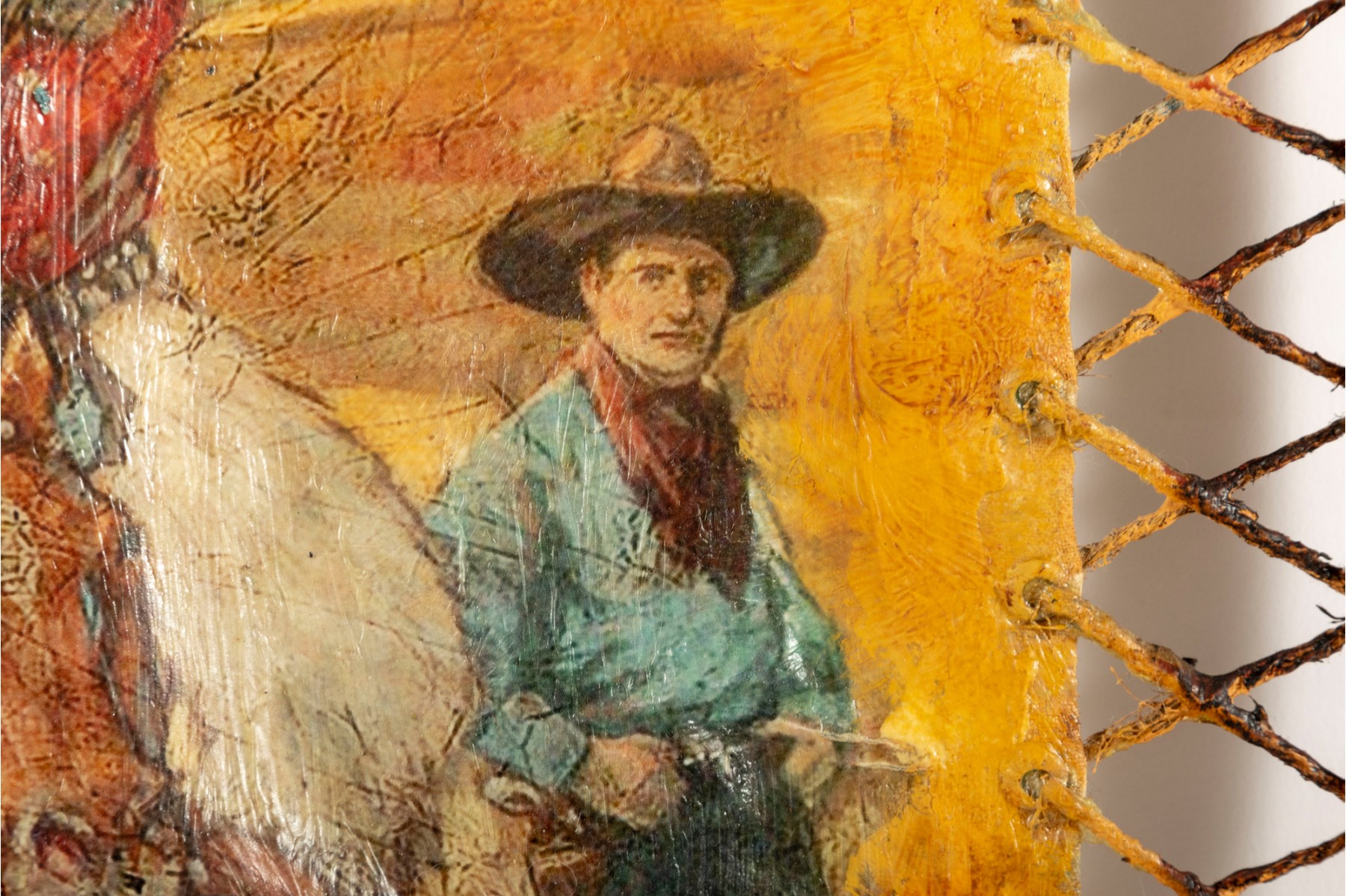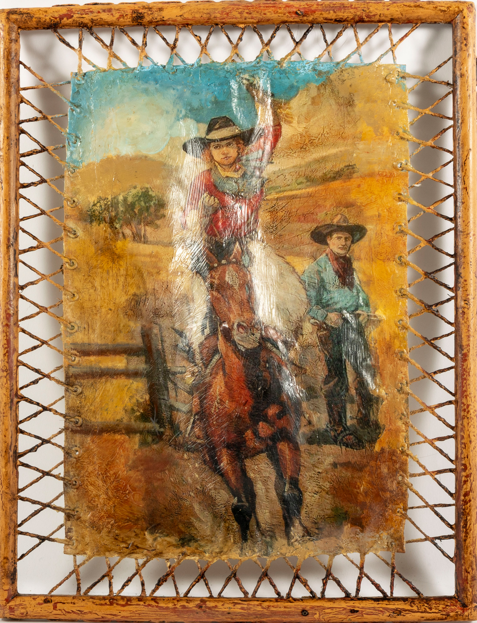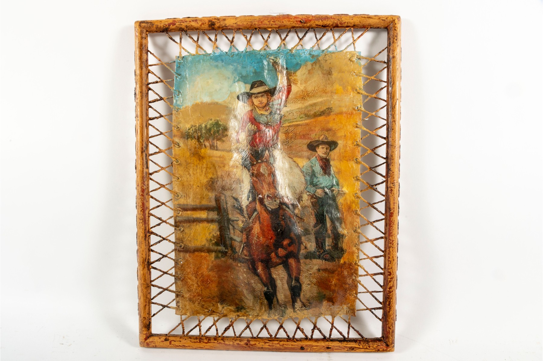 A suspended oil on leather painting depicting a western horse-riding scene — signed by Dax Cordrau, dated 2013 and presented on an open wood frame strung with cord.