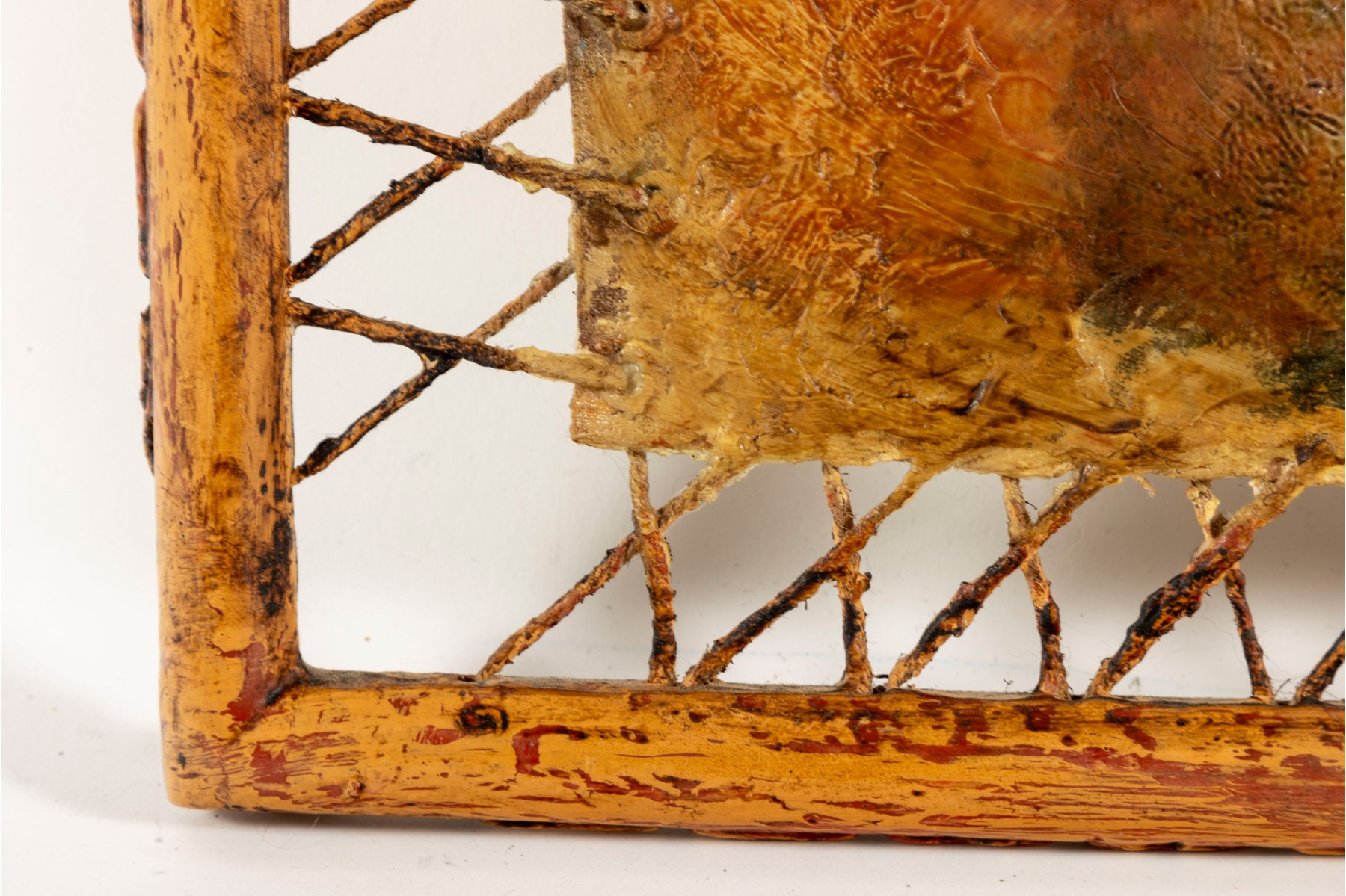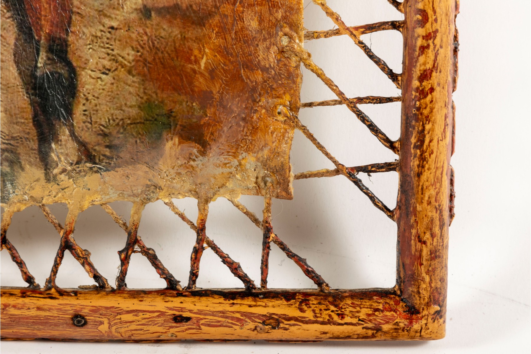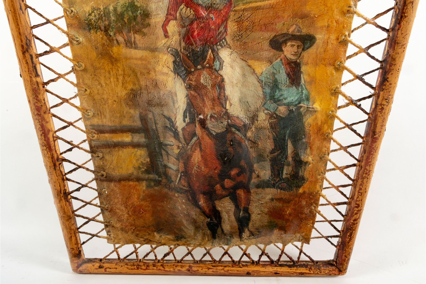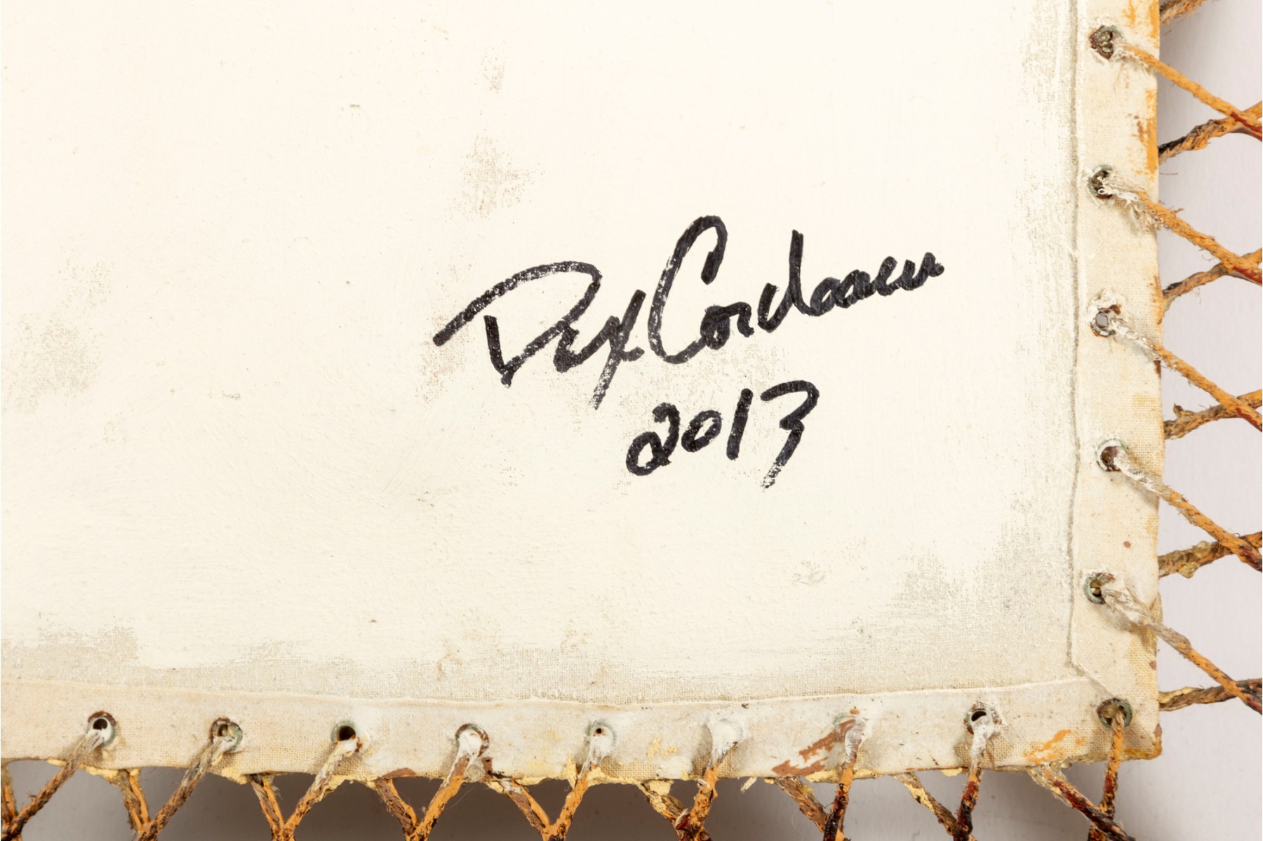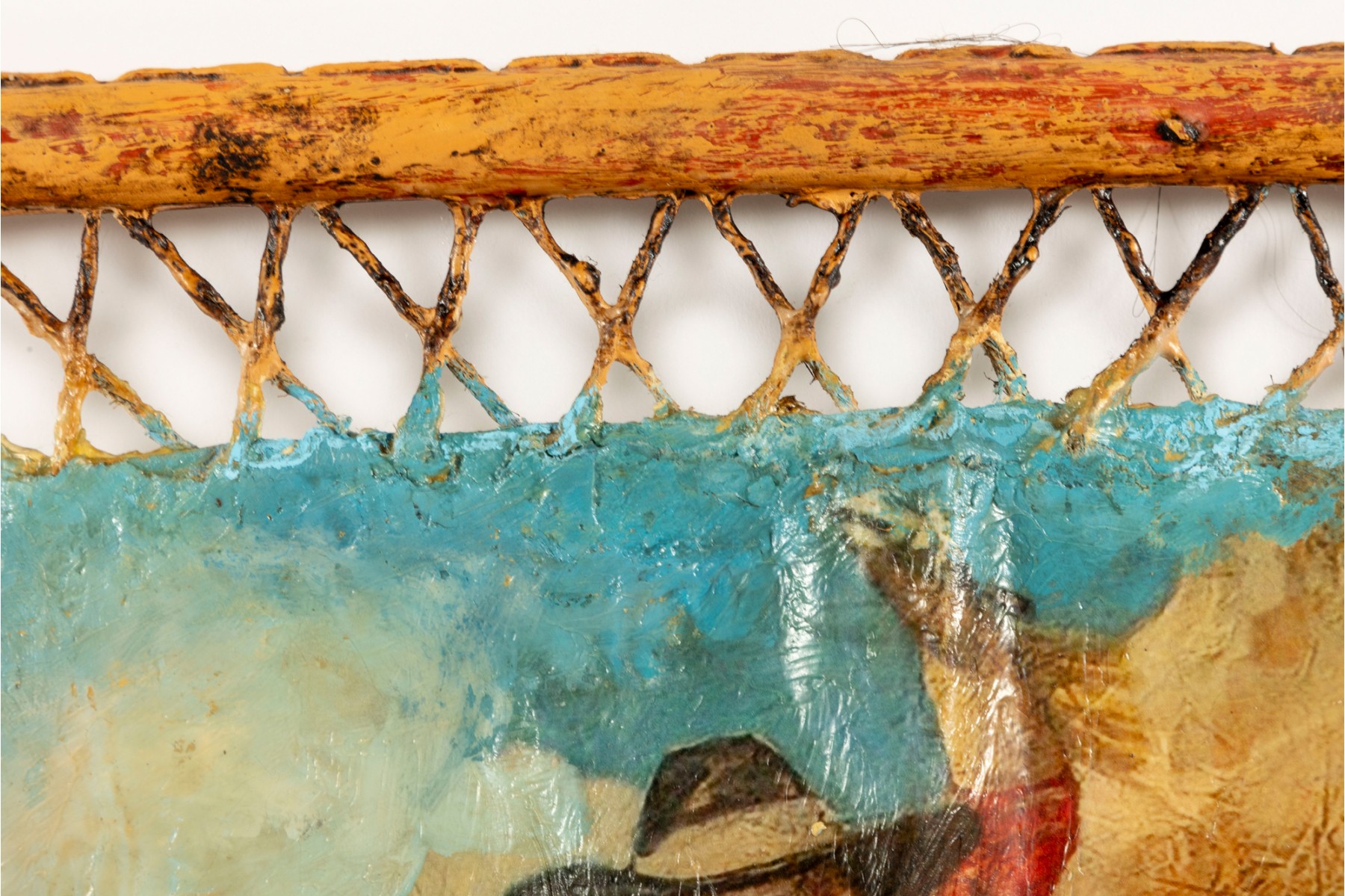 A suspended oil on leather painting depicting a western horse-riding scene — signed by Dax Cordrau, dated 2013 and presented on an open wood frame strung with cord.
