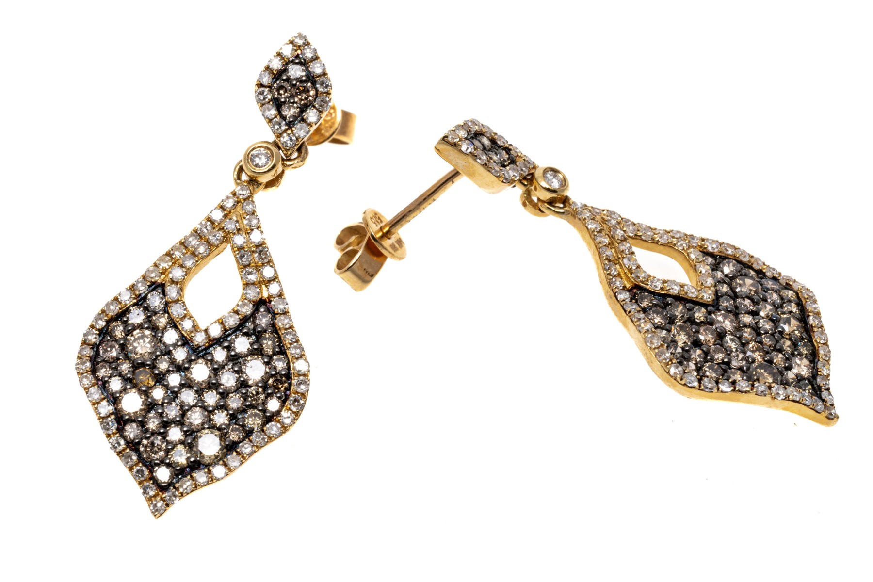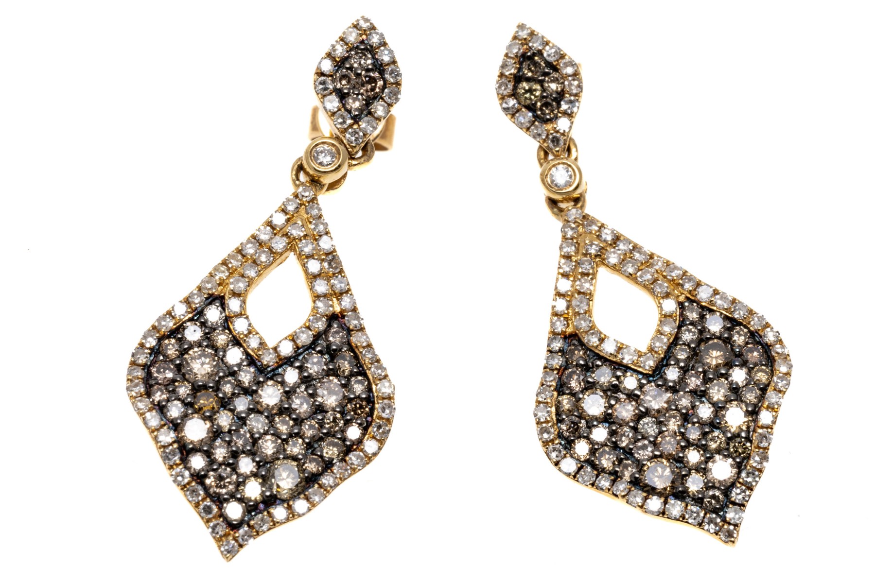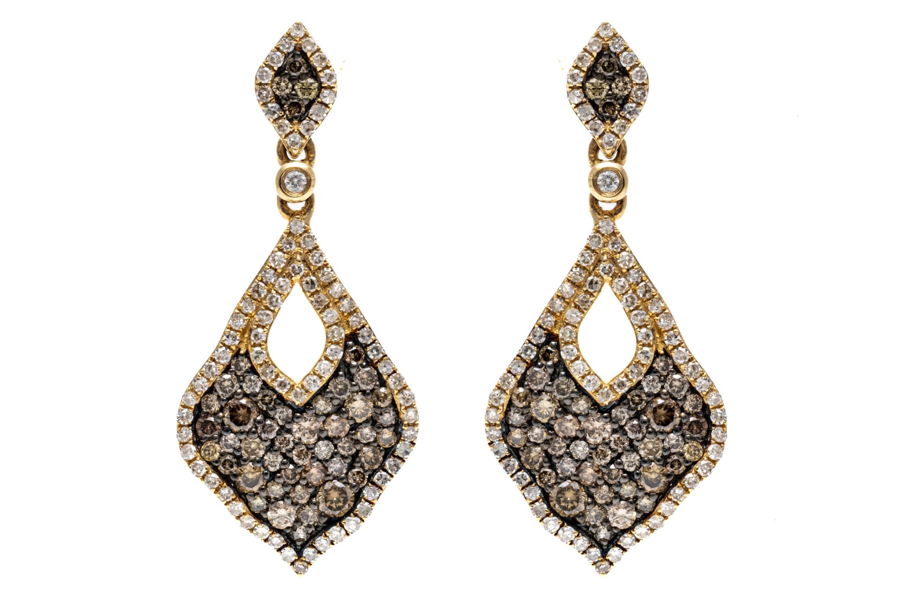Dazzling pair of 14K yellow gold pendant style earrings. The earrings are pave set with brown diamonds within a boarder or white diamonds. The diamonds are approximately 2.3 TCW. Post and clutch backings.