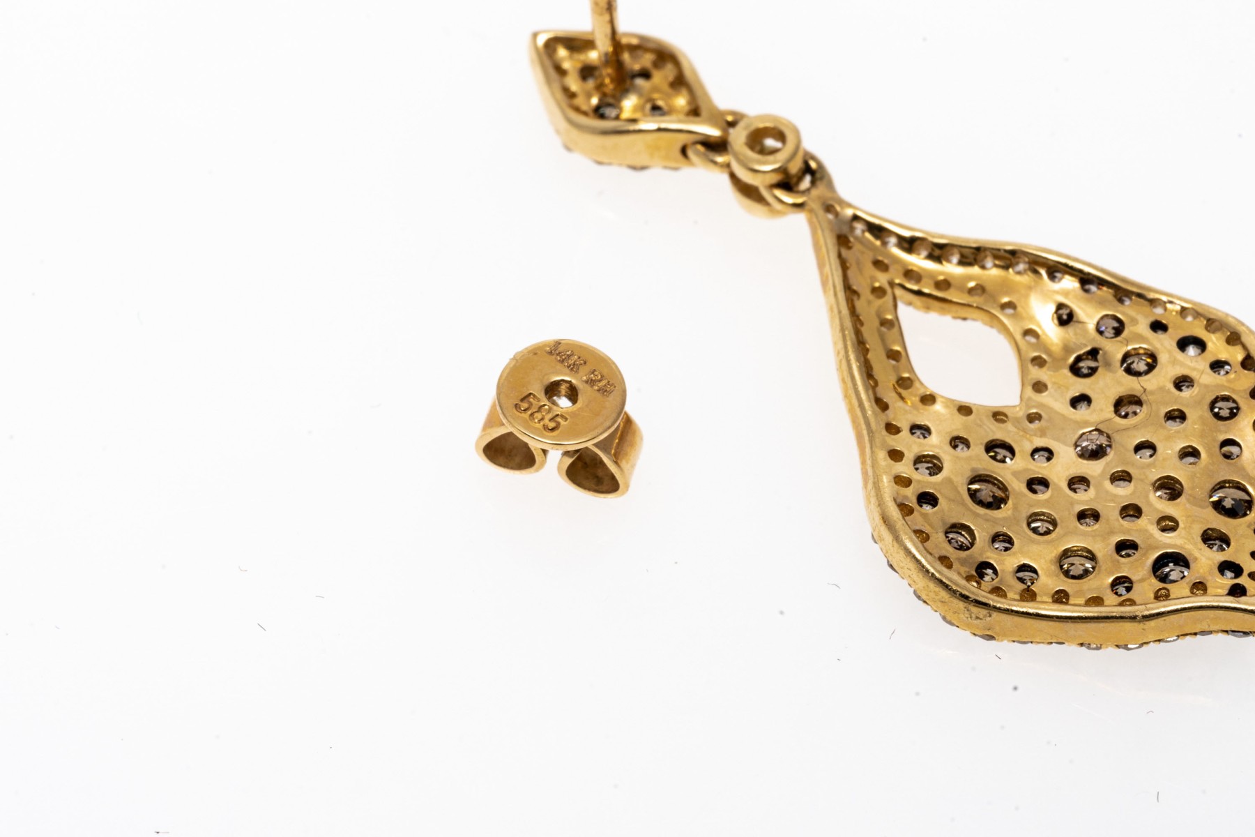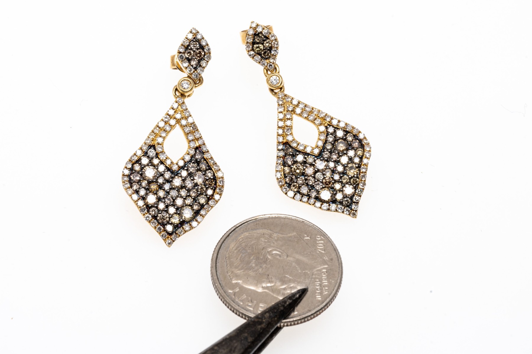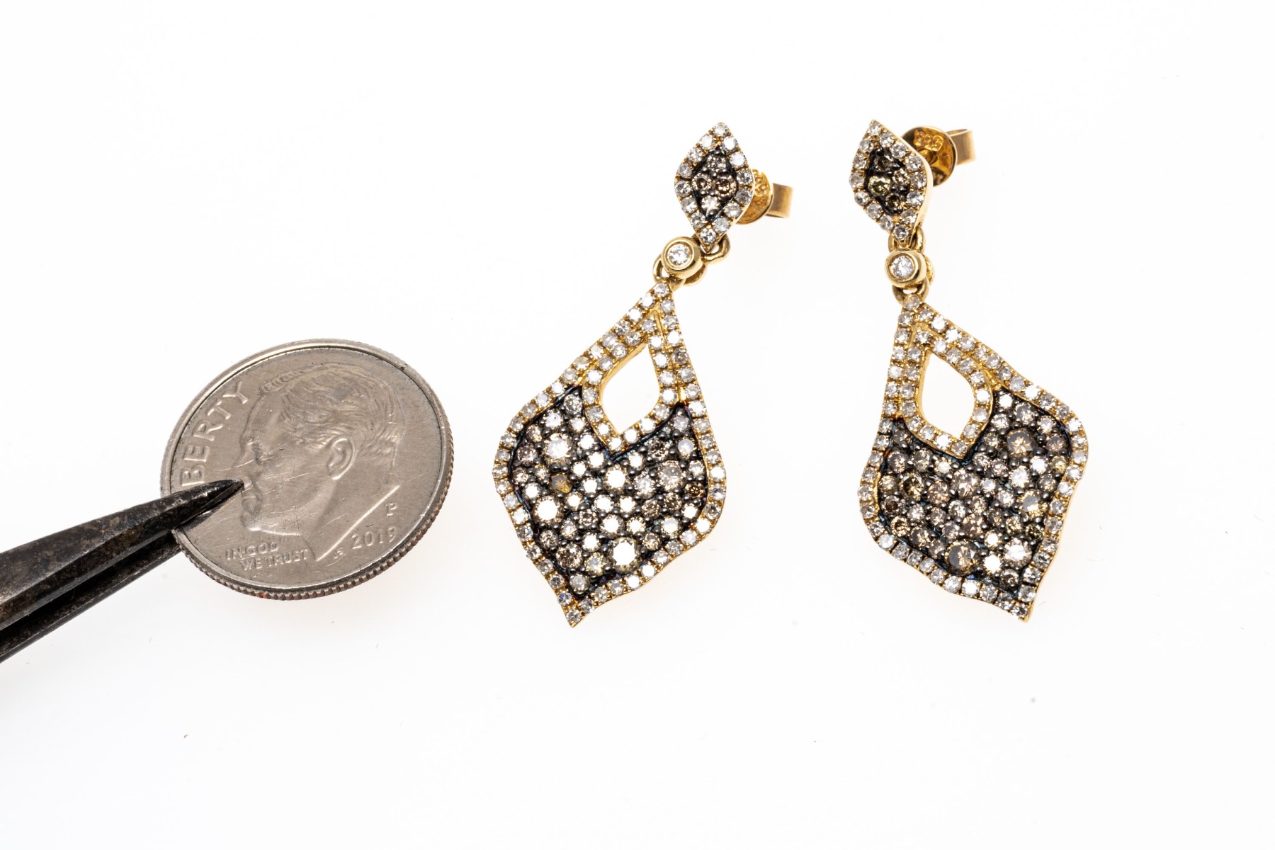 Dazzling pair of 14K yellow gold pendant style earrings. The earrings are pave set with brown diamonds within a boarder or white diamonds. The diamonds are approximately 2.3 TCW. Post and clutch backings.
