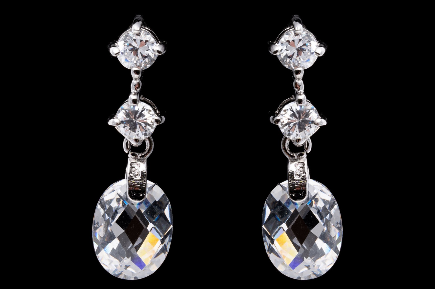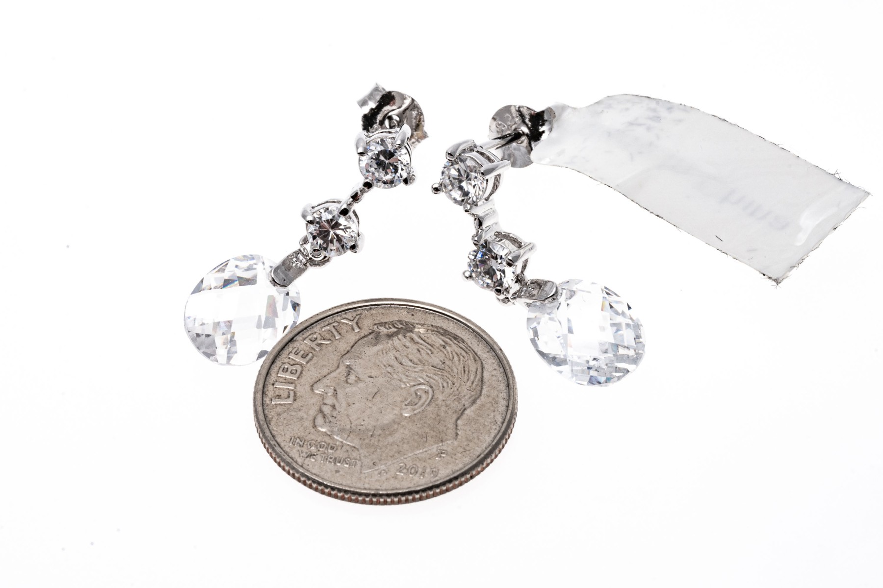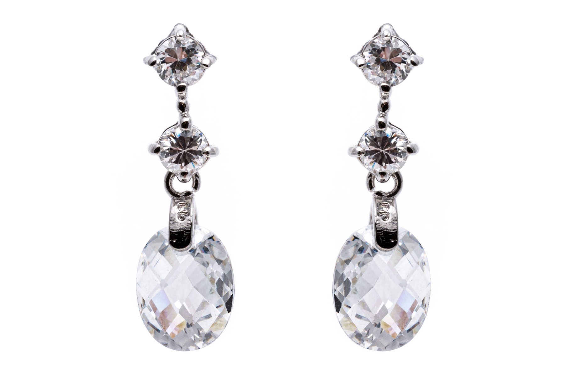 A brilliant pair of sterling silver drop earrings presenting dazzling white round cut cubic zirconia. Suspended at the base of the earrings are oval checker board cut zirconia that add a bright shimmer as they move. Post and clutch backings.