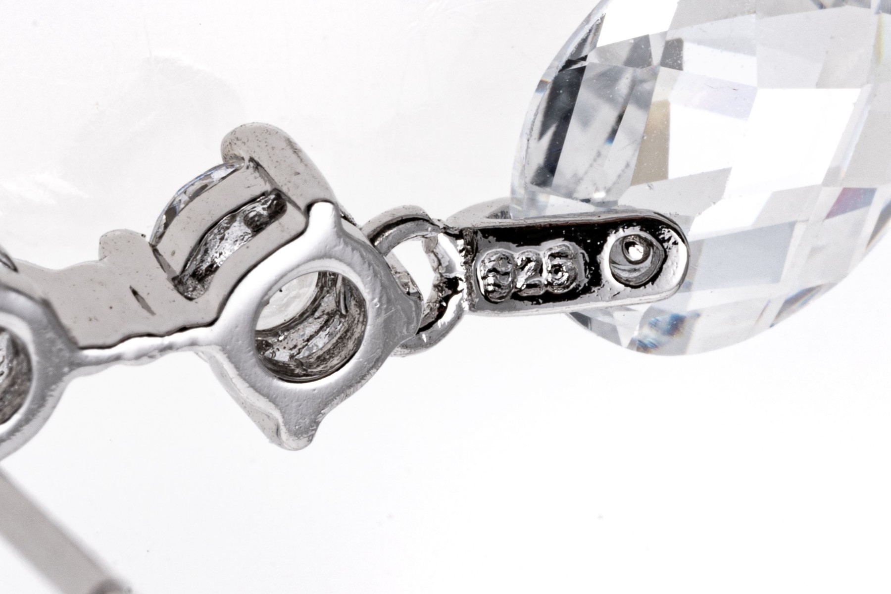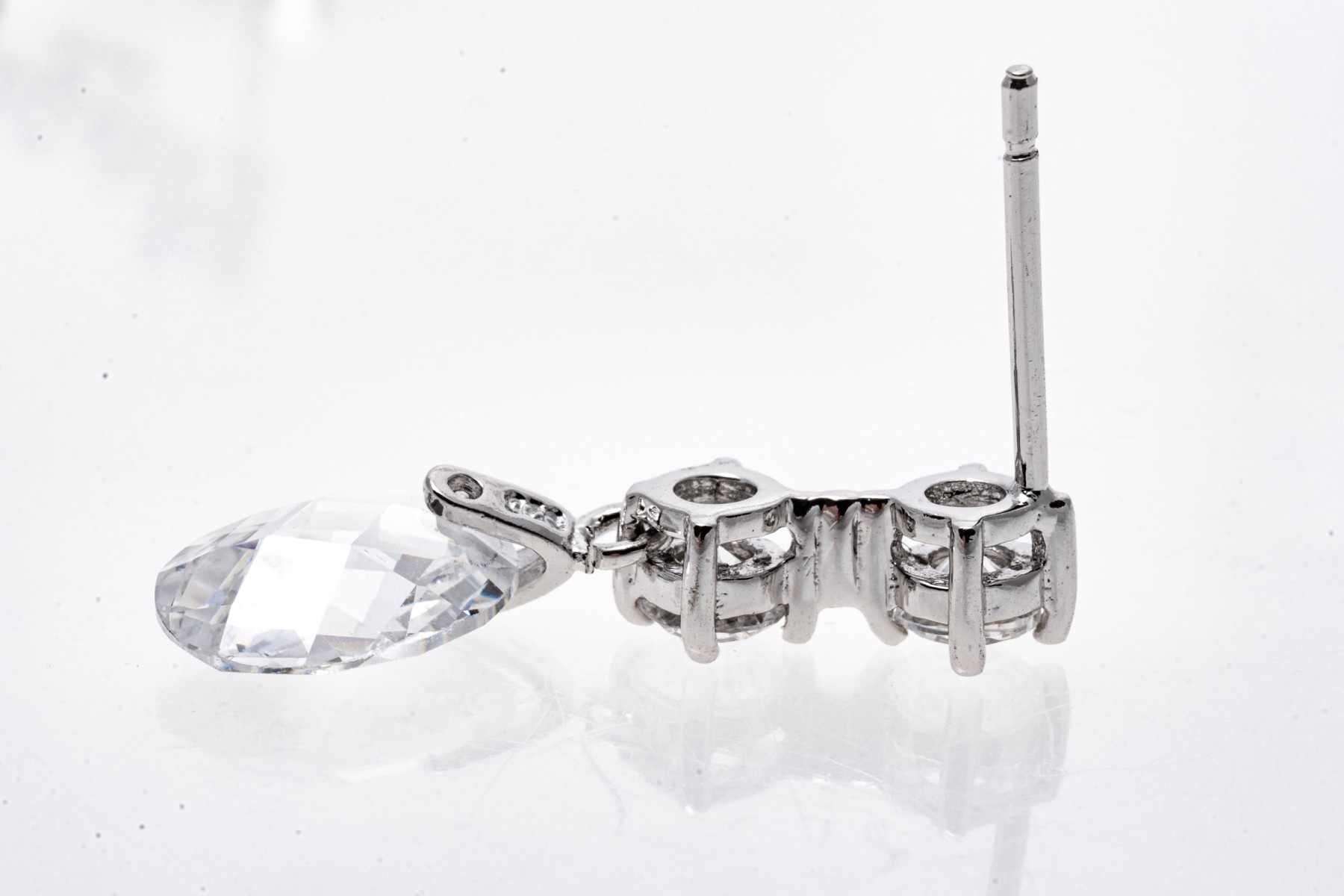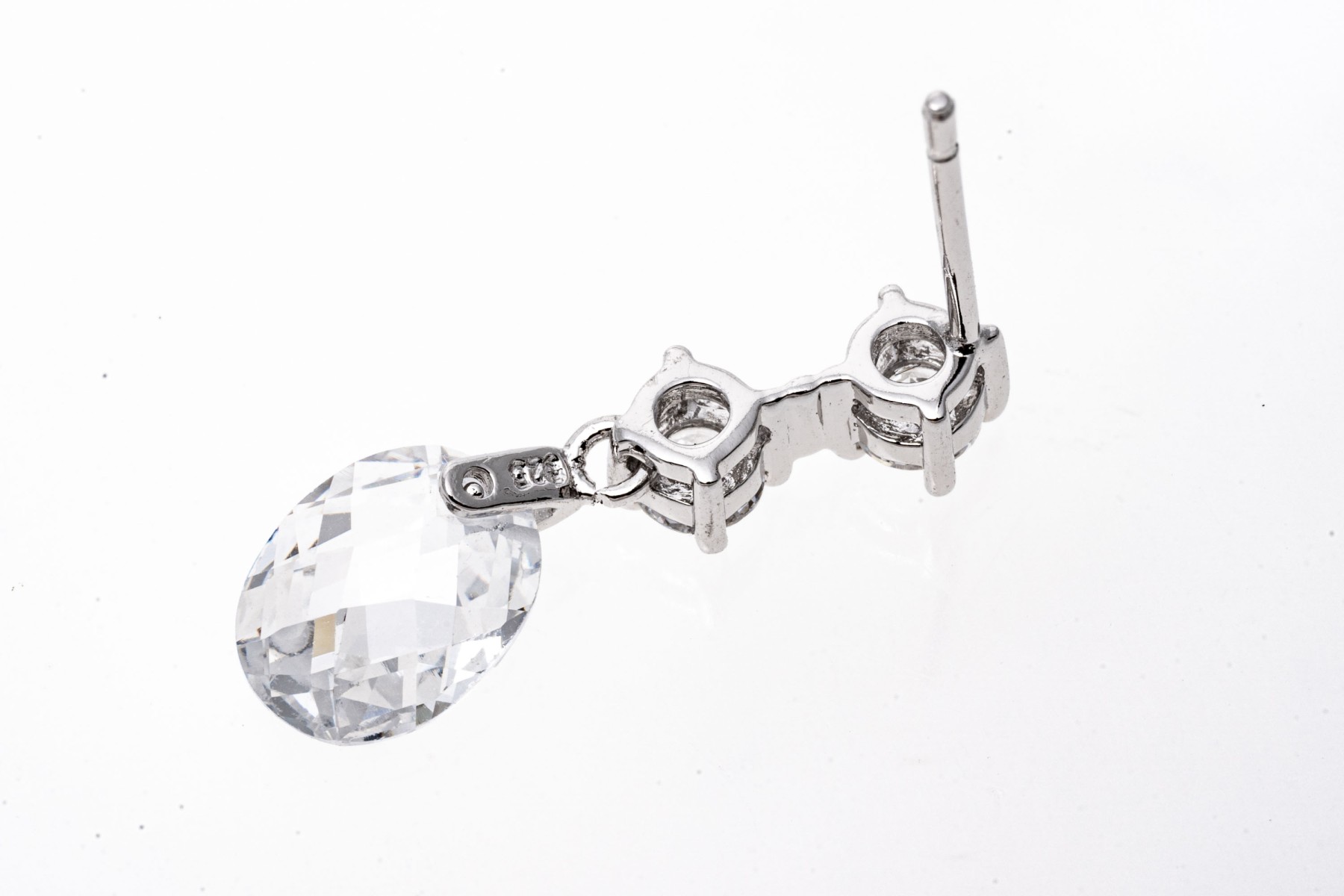 A brilliant pair of sterling silver drop earrings presenting dazzling white round cut cubic zirconia. Suspended at the base of the earrings are oval checker board cut zirconia that add a bright shimmer as they move. Post and clutch backings.