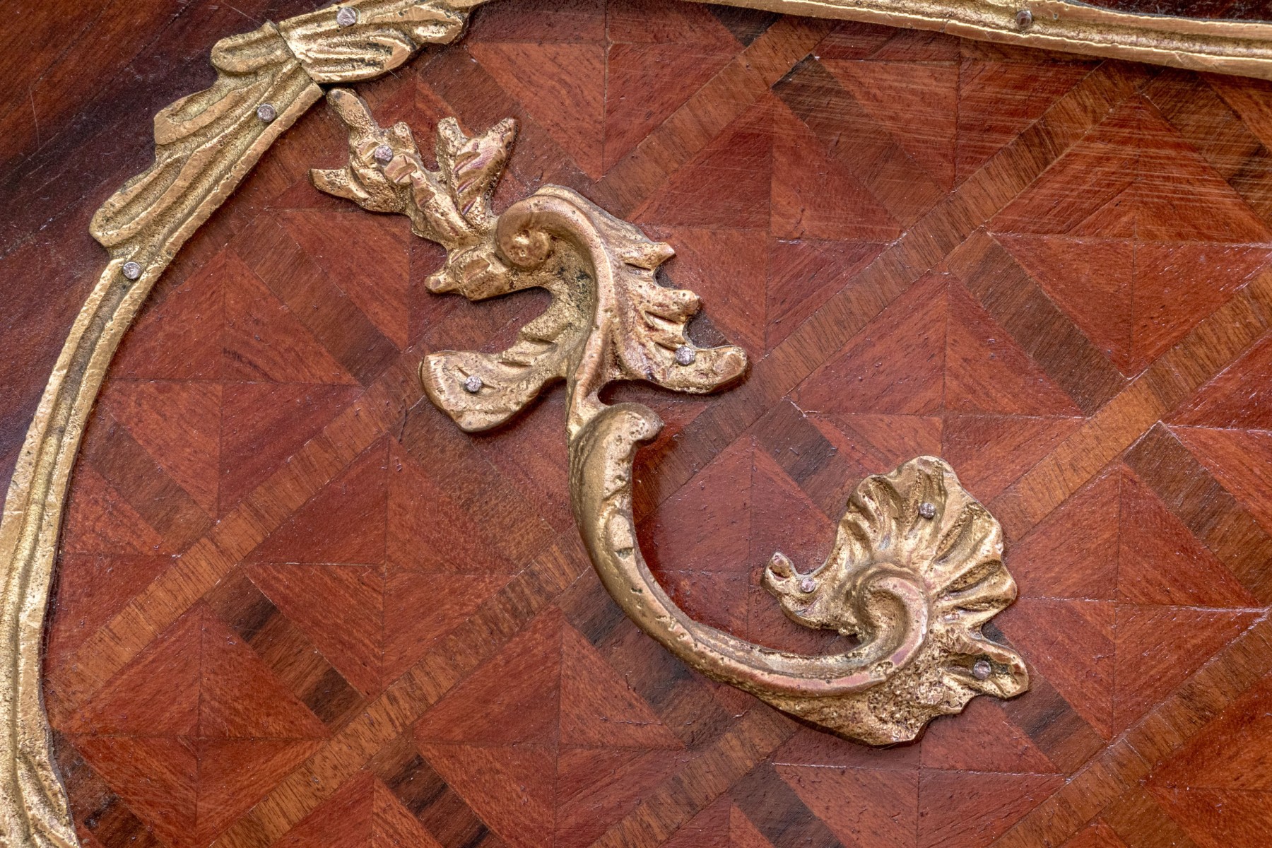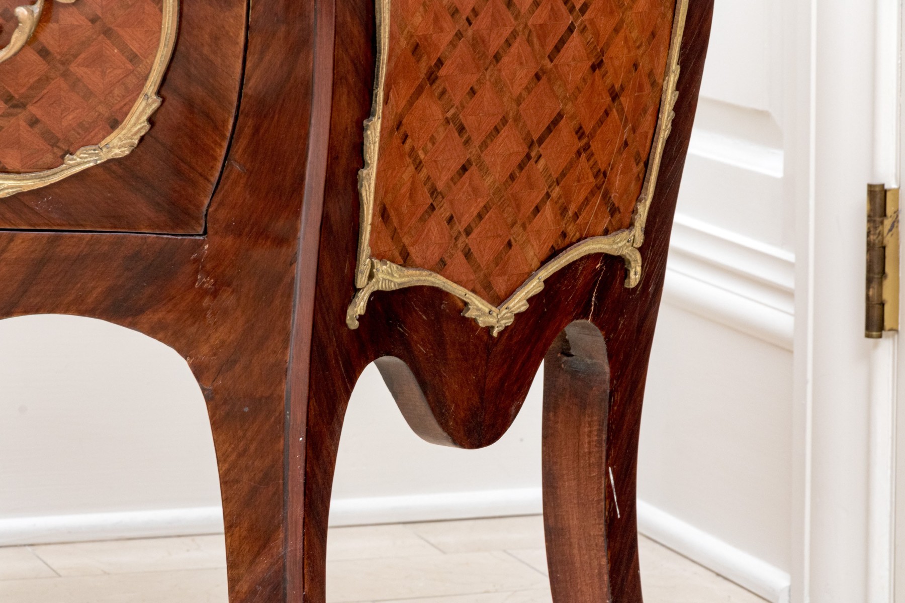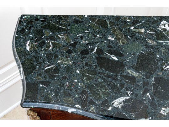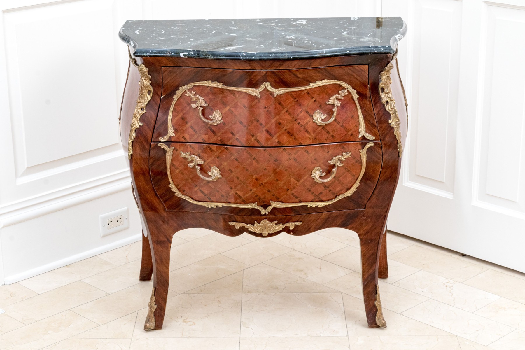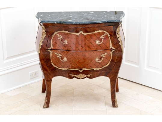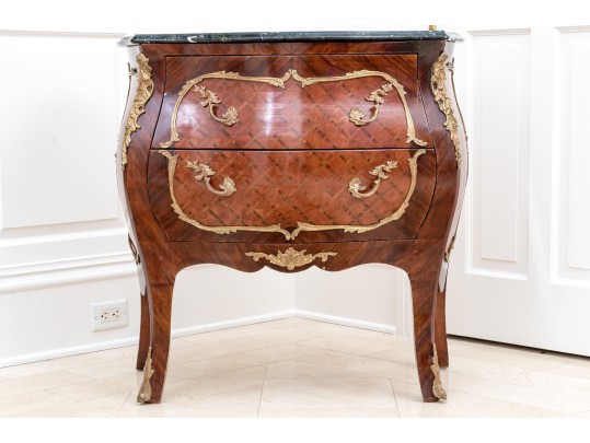 A handsome Louis XV style commode in bombe form, beautifully veneered with richly hued, warm-toned brown wood. A green marble top with a serpentine edge overhangs two drawers with brass double handles, adorned with fine lattice parquetry.