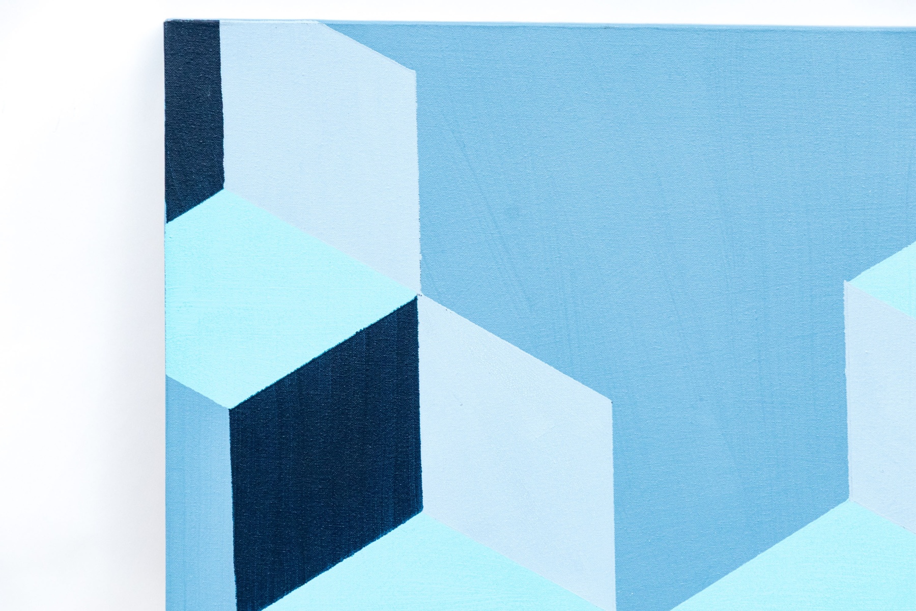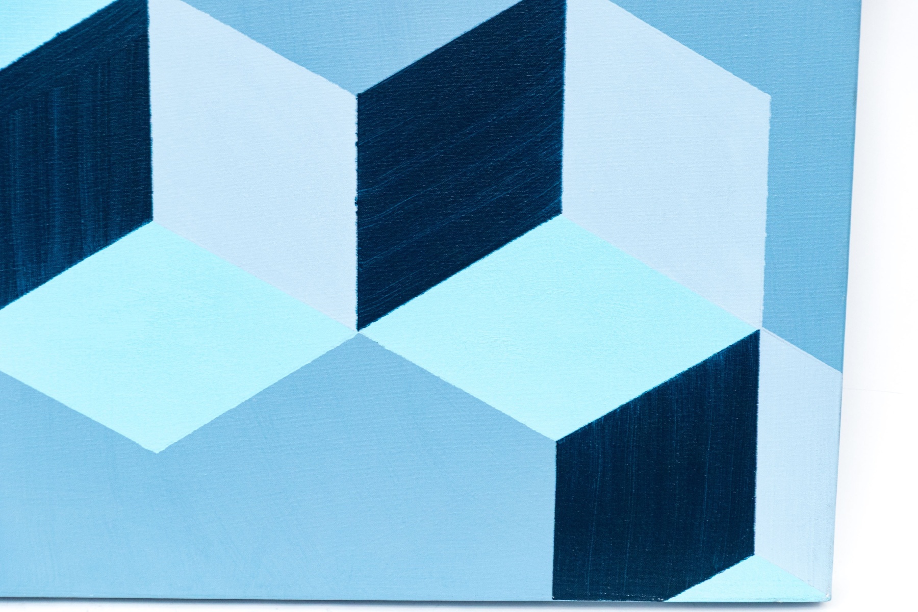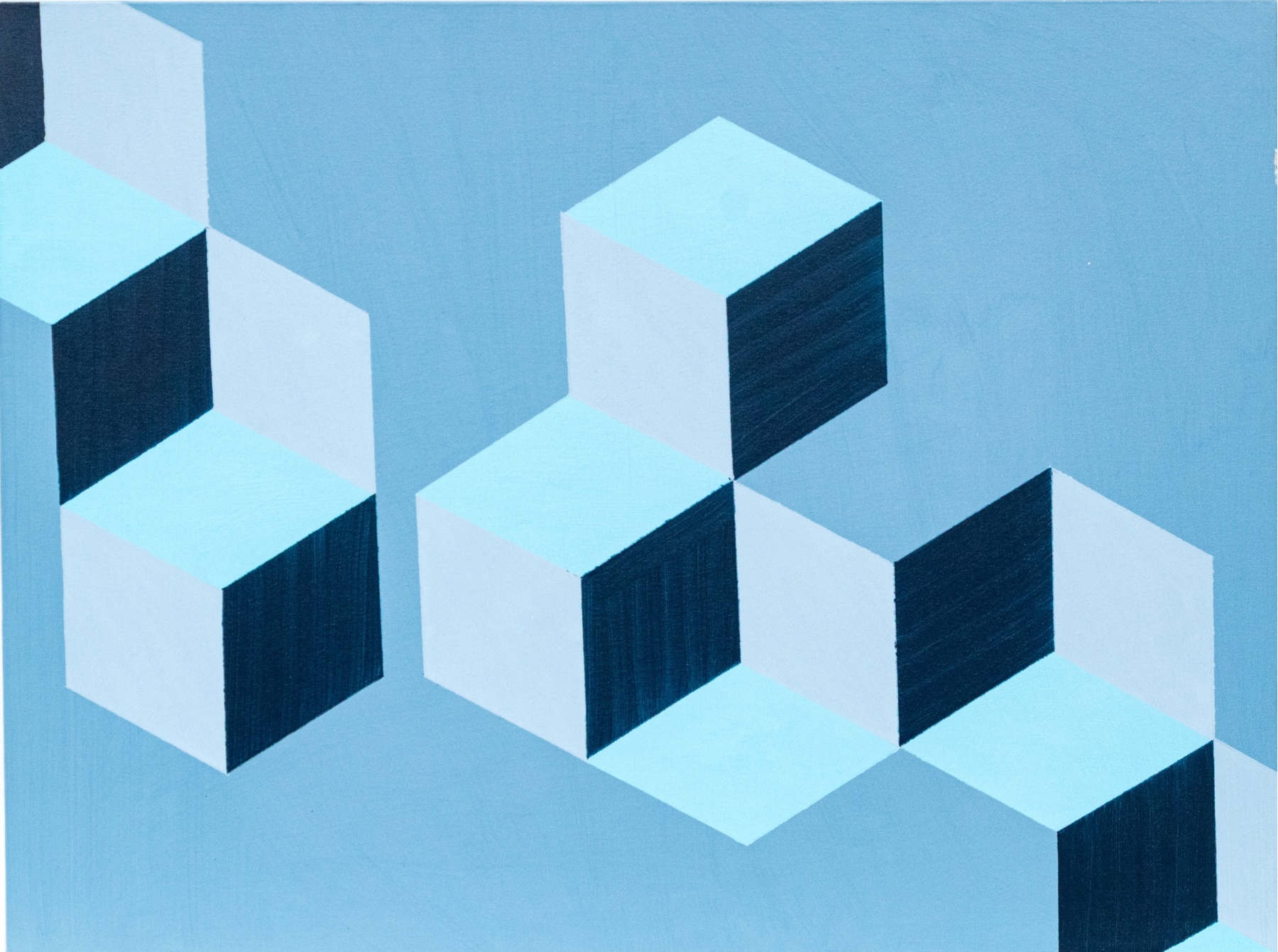 In four colors, grey, black, light blue and a darker hue of blue. Presented mounted on stretcher support.