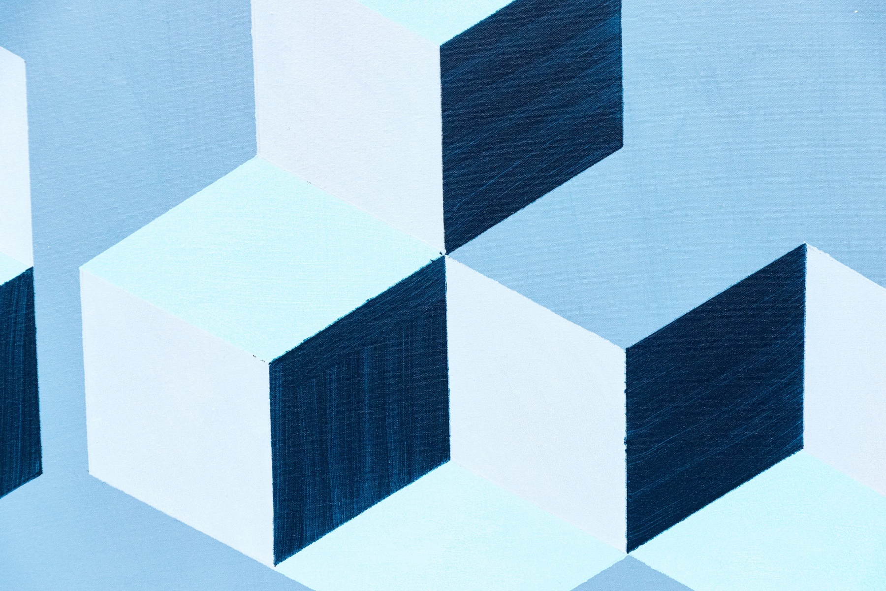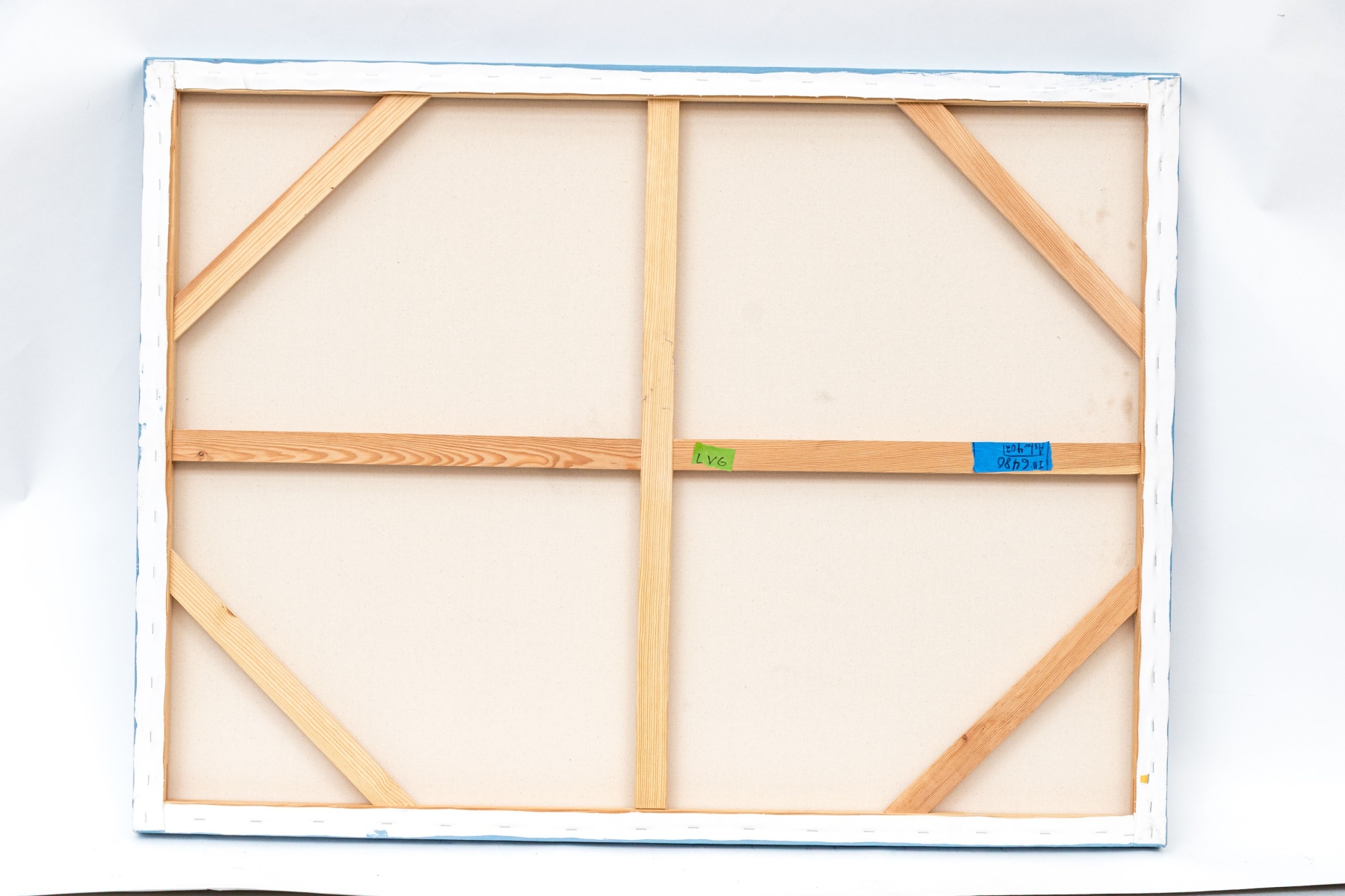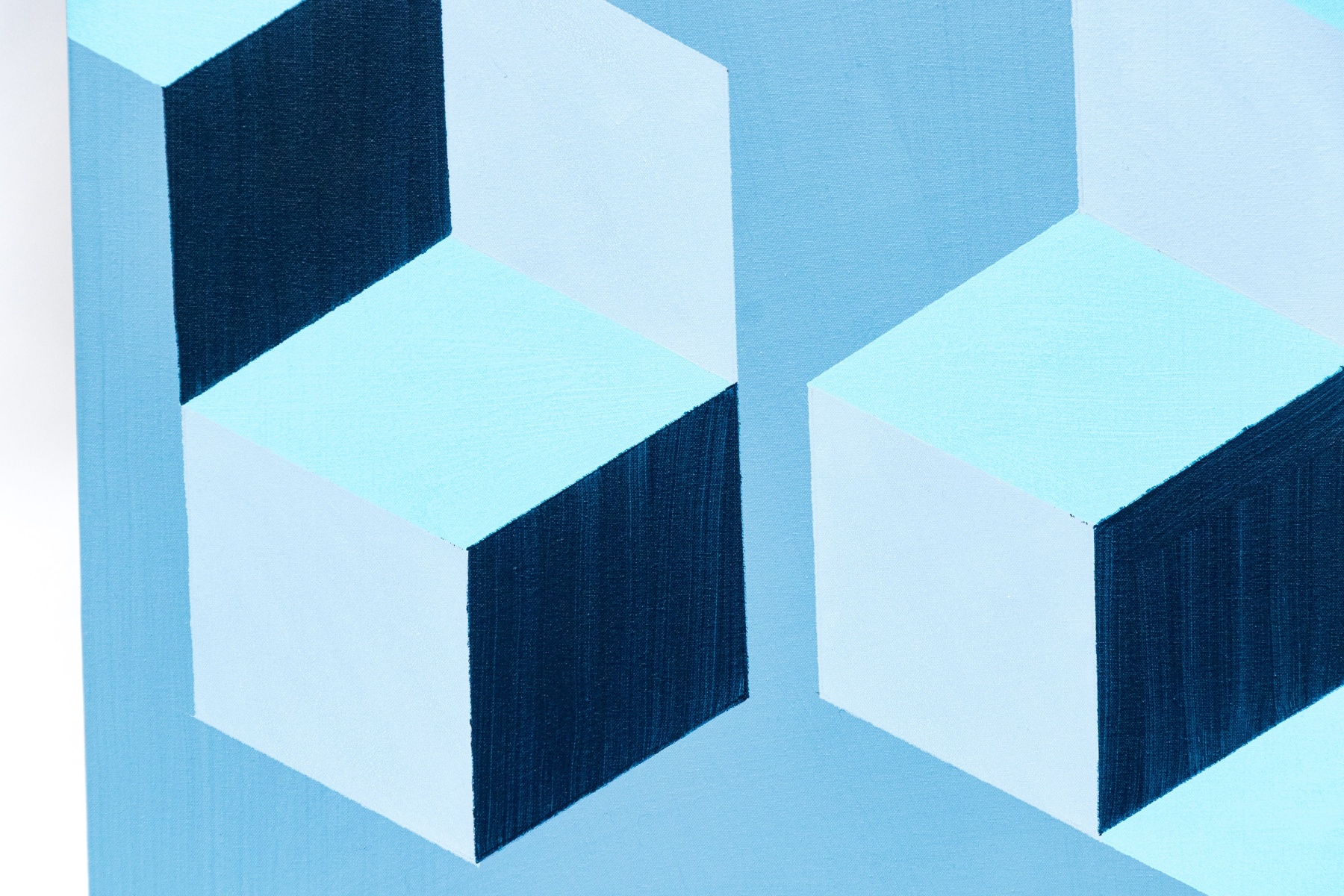 In four colors, grey, black, light blue and a darker hue of blue. Presented mounted on stretcher support.
