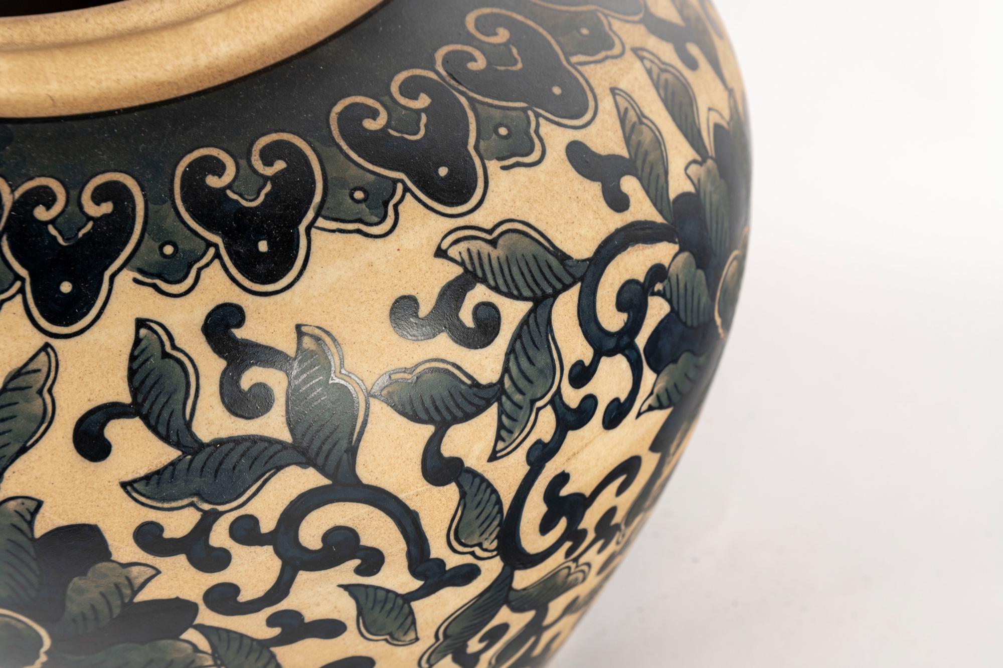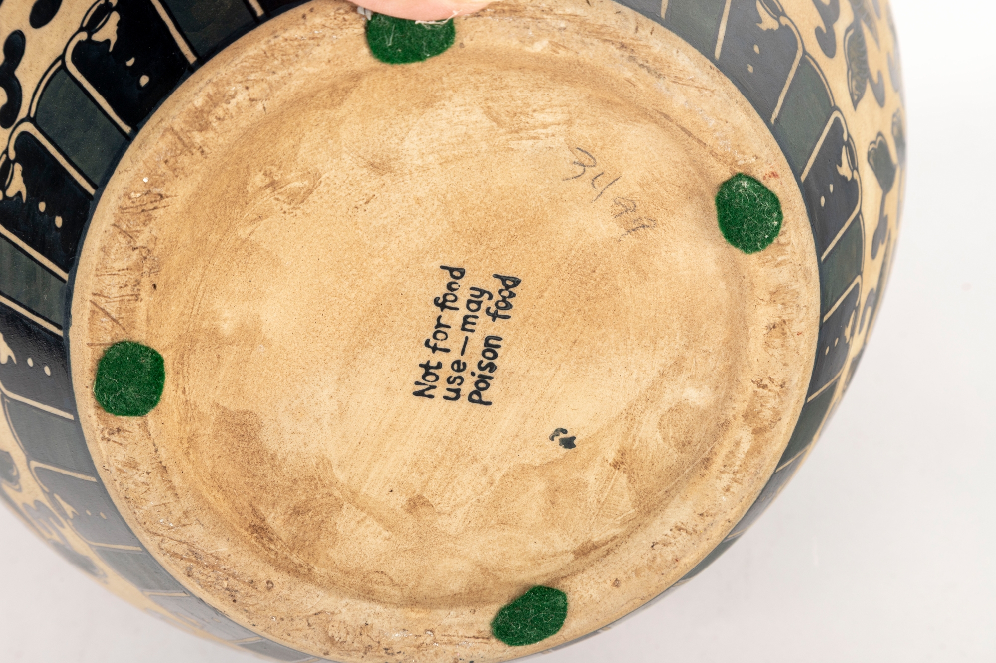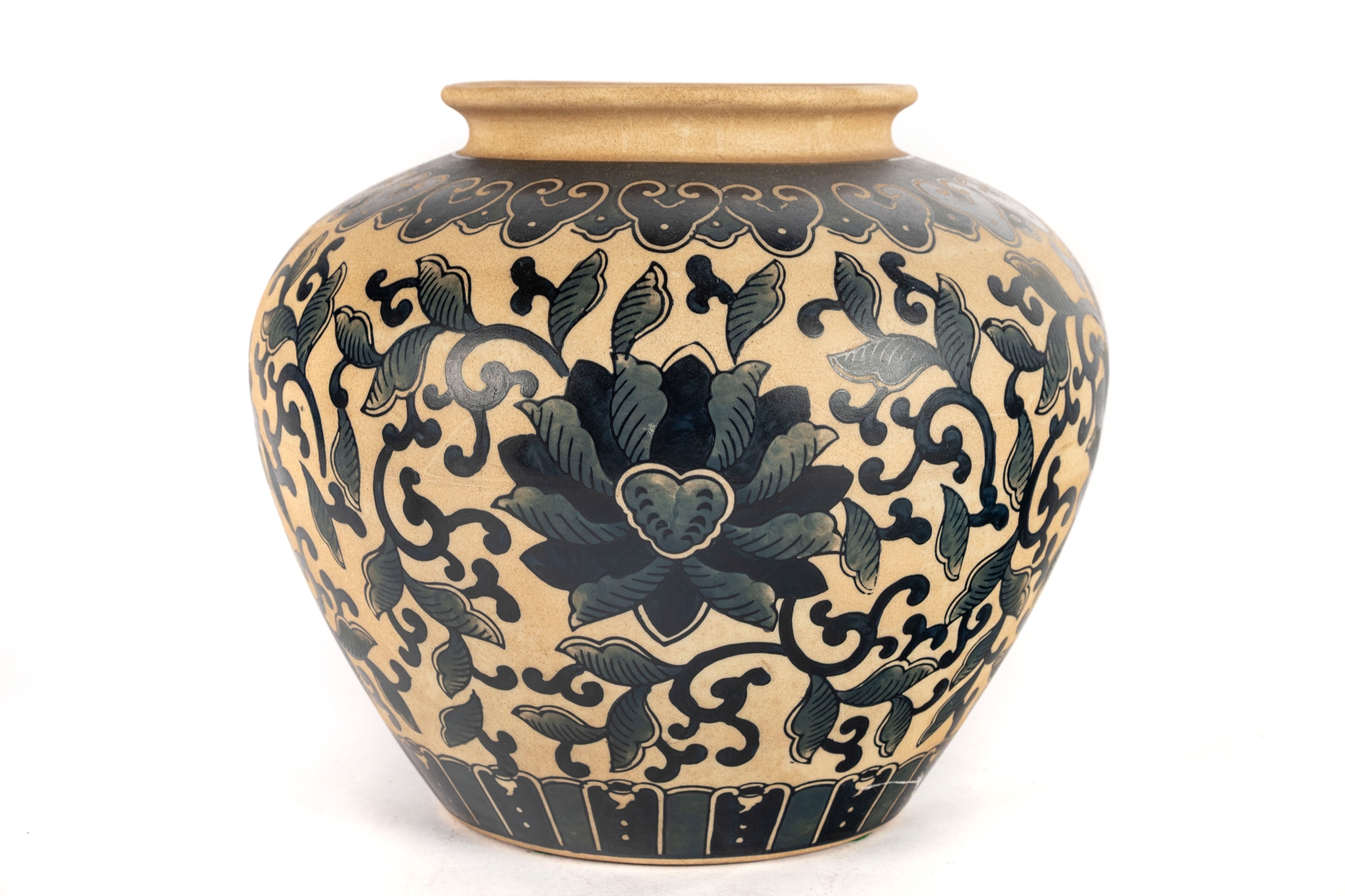 Large ceramic vase featuring an intricate hand-painted floral and foliate motif in deep blue and green against a tan matte ground. The design includes scrolling tendrils and stylized lotus blossoms bordered by a repeating heart-shaped cloud pattern around the neck. Marked on underside "Not for food use—may poison food."
