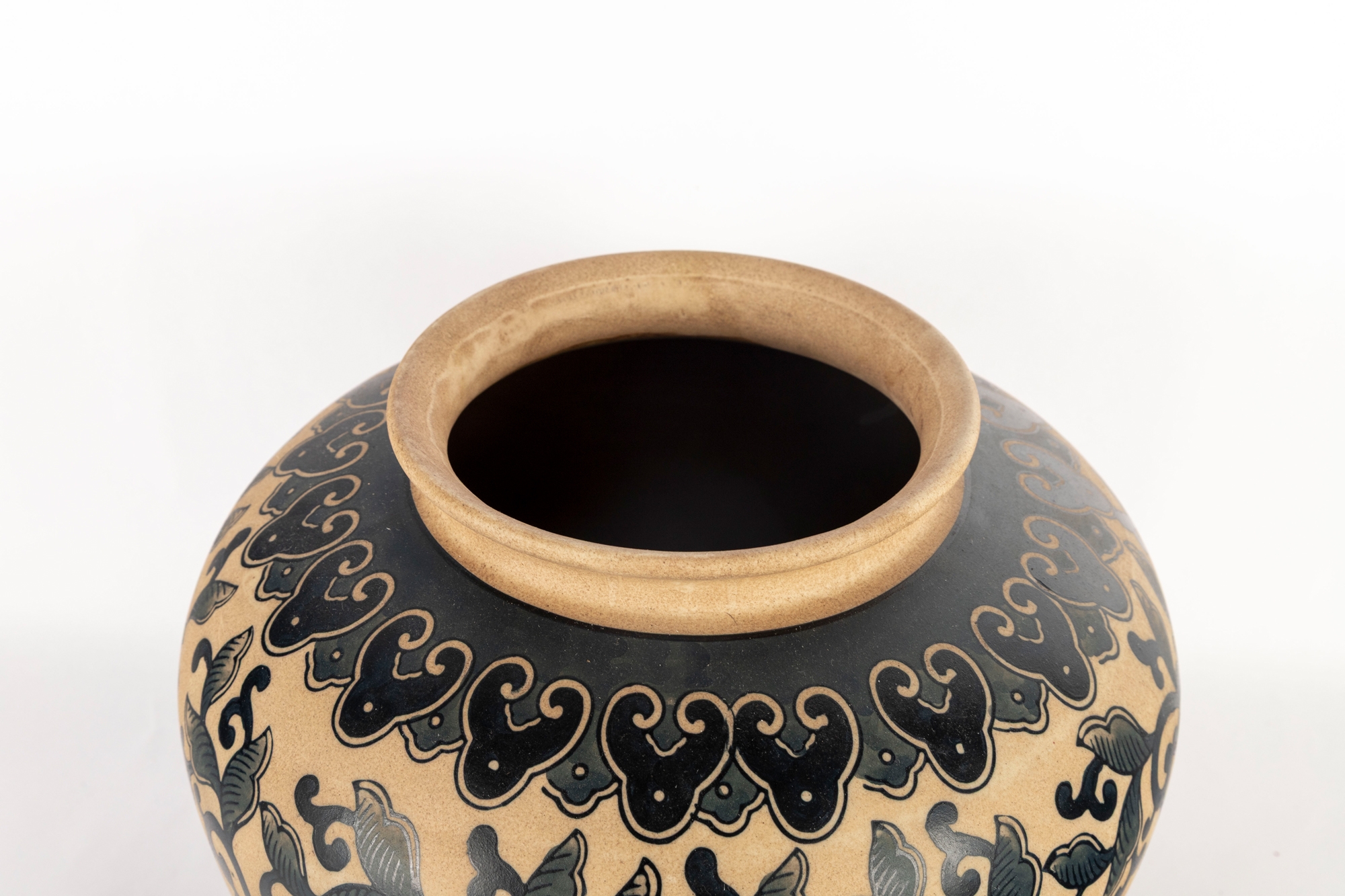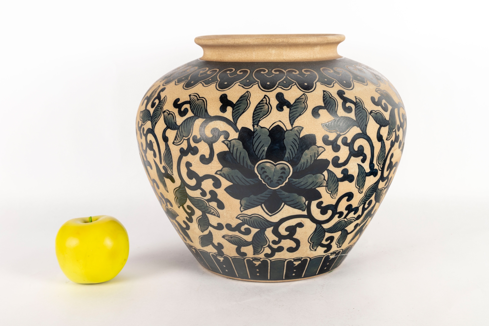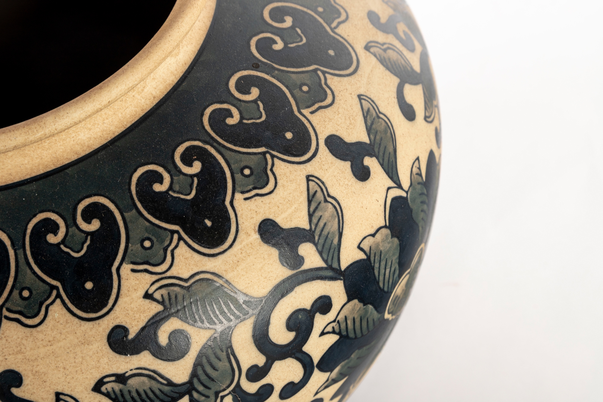 Large ceramic vase featuring an intricate hand-painted floral and foliate motif in deep blue and green against a tan matte ground. The design includes scrolling tendrils and stylized lotus blossoms bordered by a repeating heart-shaped cloud pattern around the neck. Marked on underside "Not for food use—may poison food."