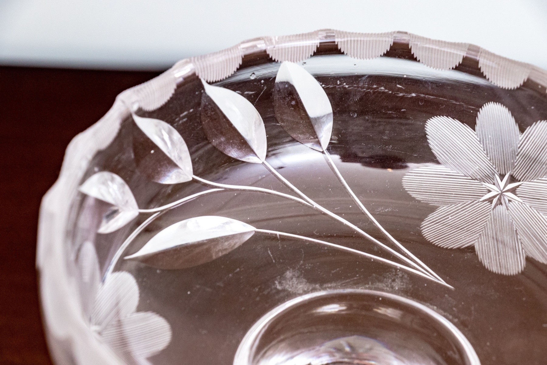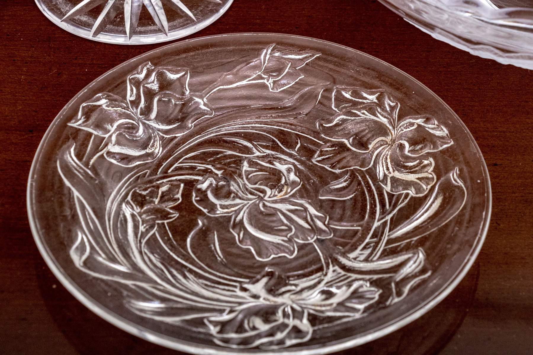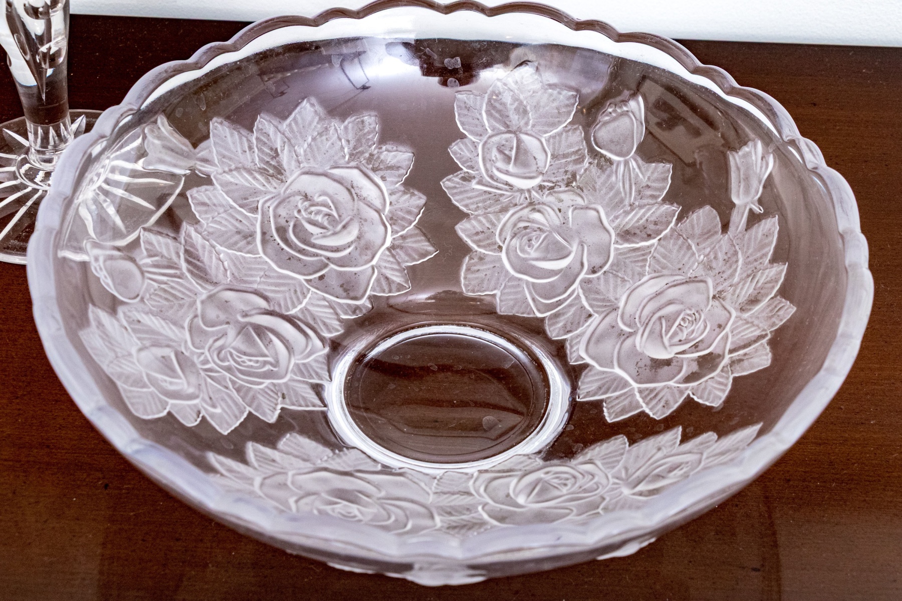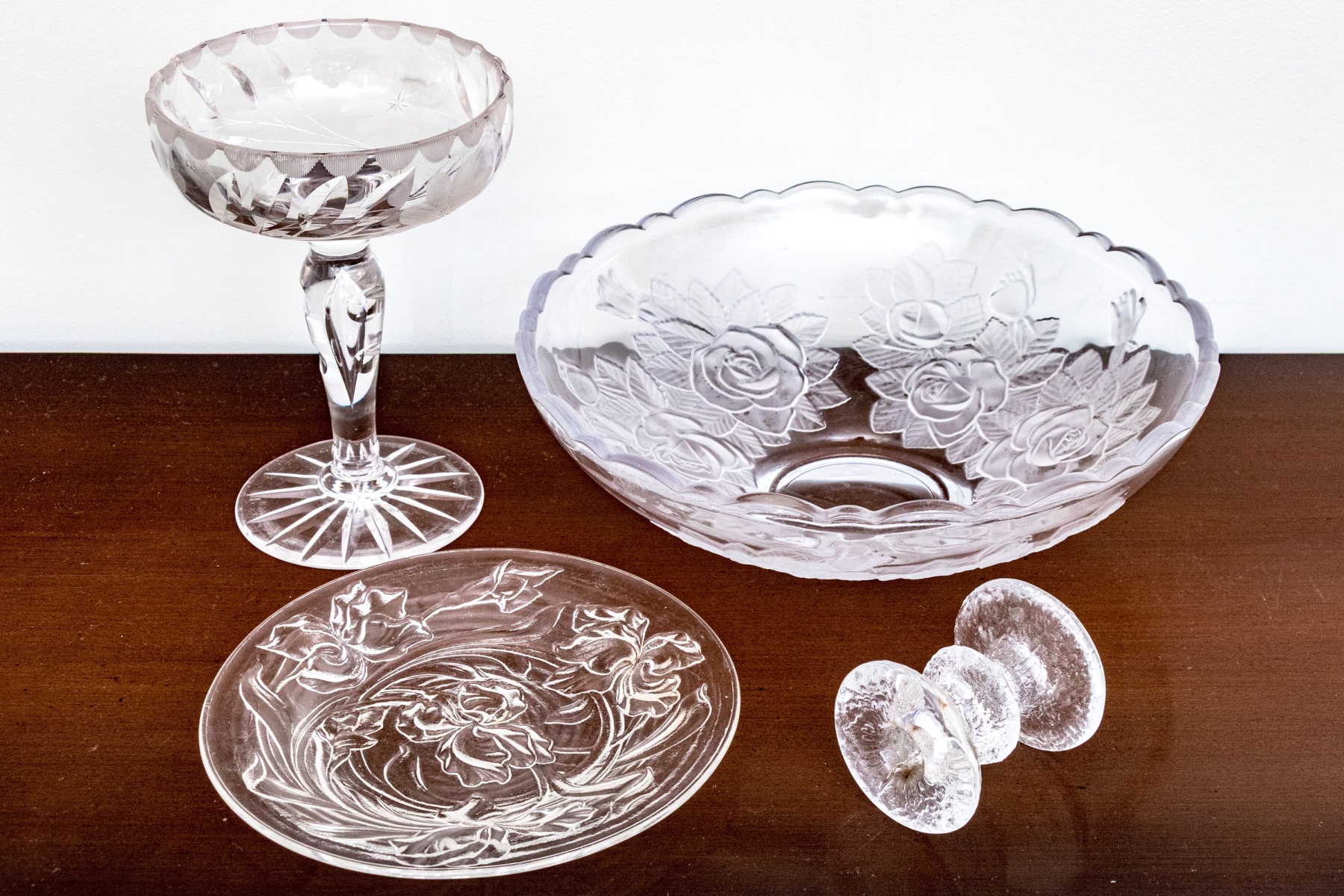 A wonderful assortment of decorative table wares comprised of a single candlestick, a lavish center bowl with scalloped trim and moulded rose motif to the outer body, a tall footed compote with etched floral motifs to the upper bowl, and a plate with moulded floral motifs.