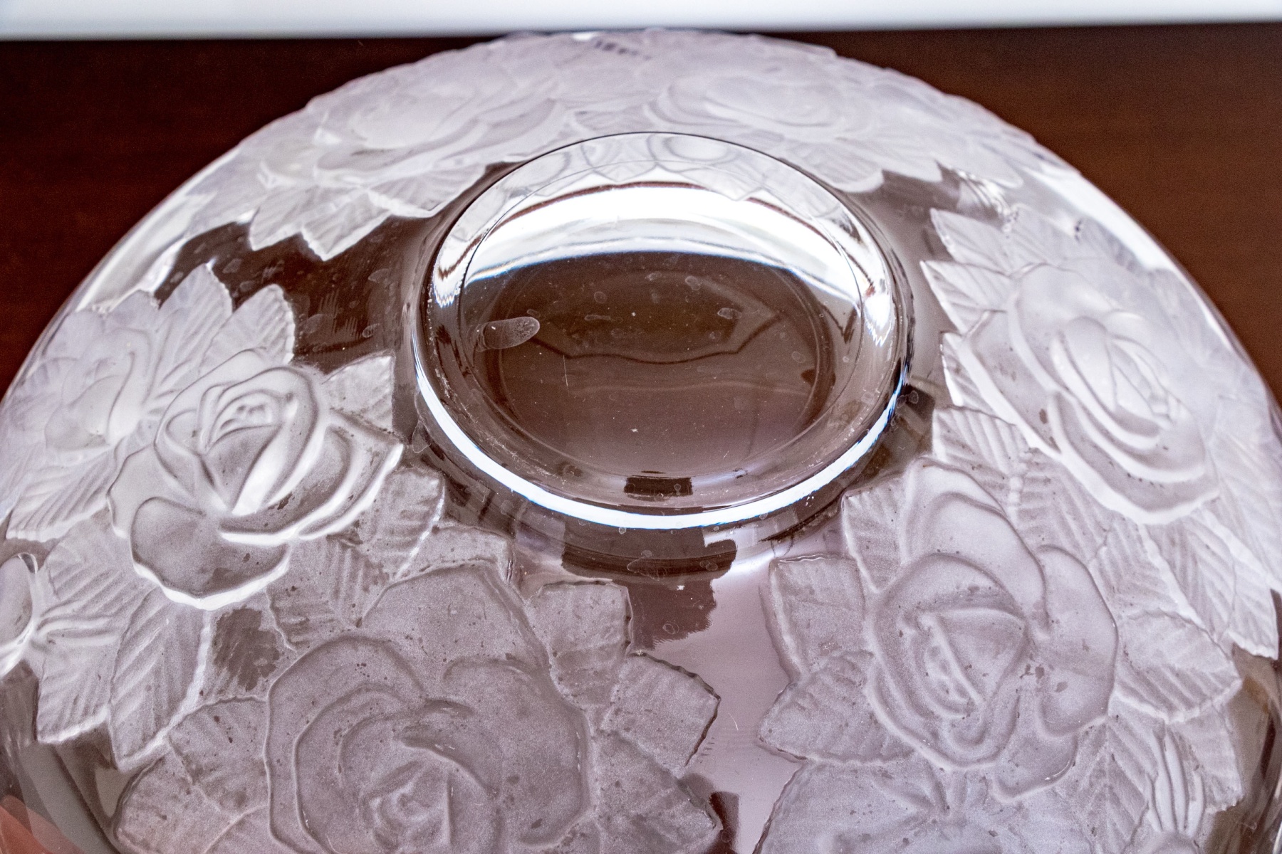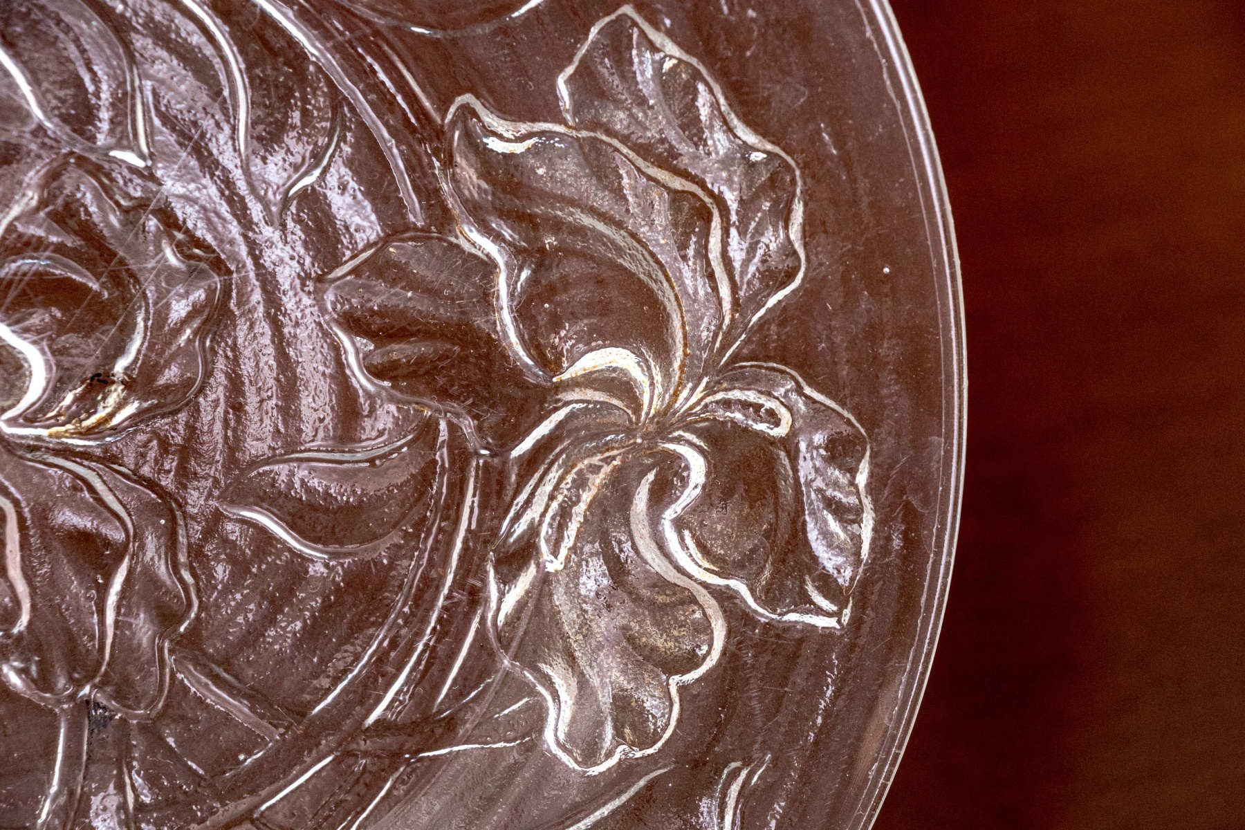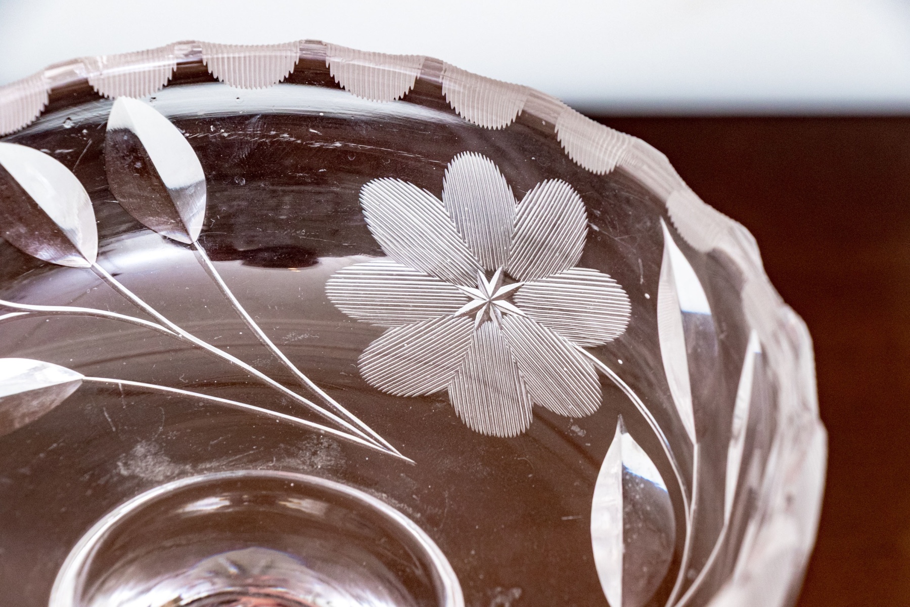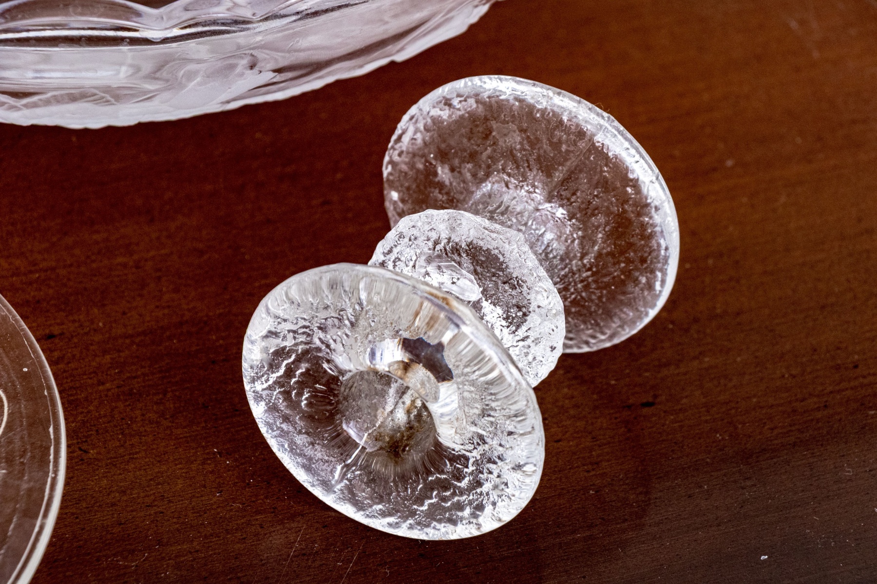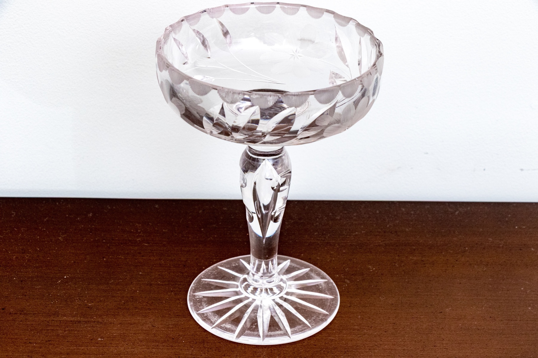 A wonderful assortment of decorative table wares comprised of a single candlestick, a lavish center bowl with scalloped trim and moulded rose motif to the outer body, a tall footed compote with etched floral motifs to the upper bowl, and a plate with moulded floral motifs.