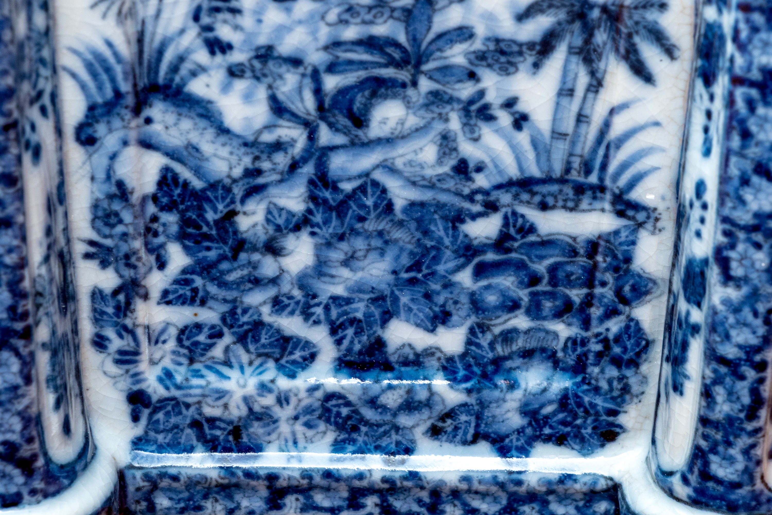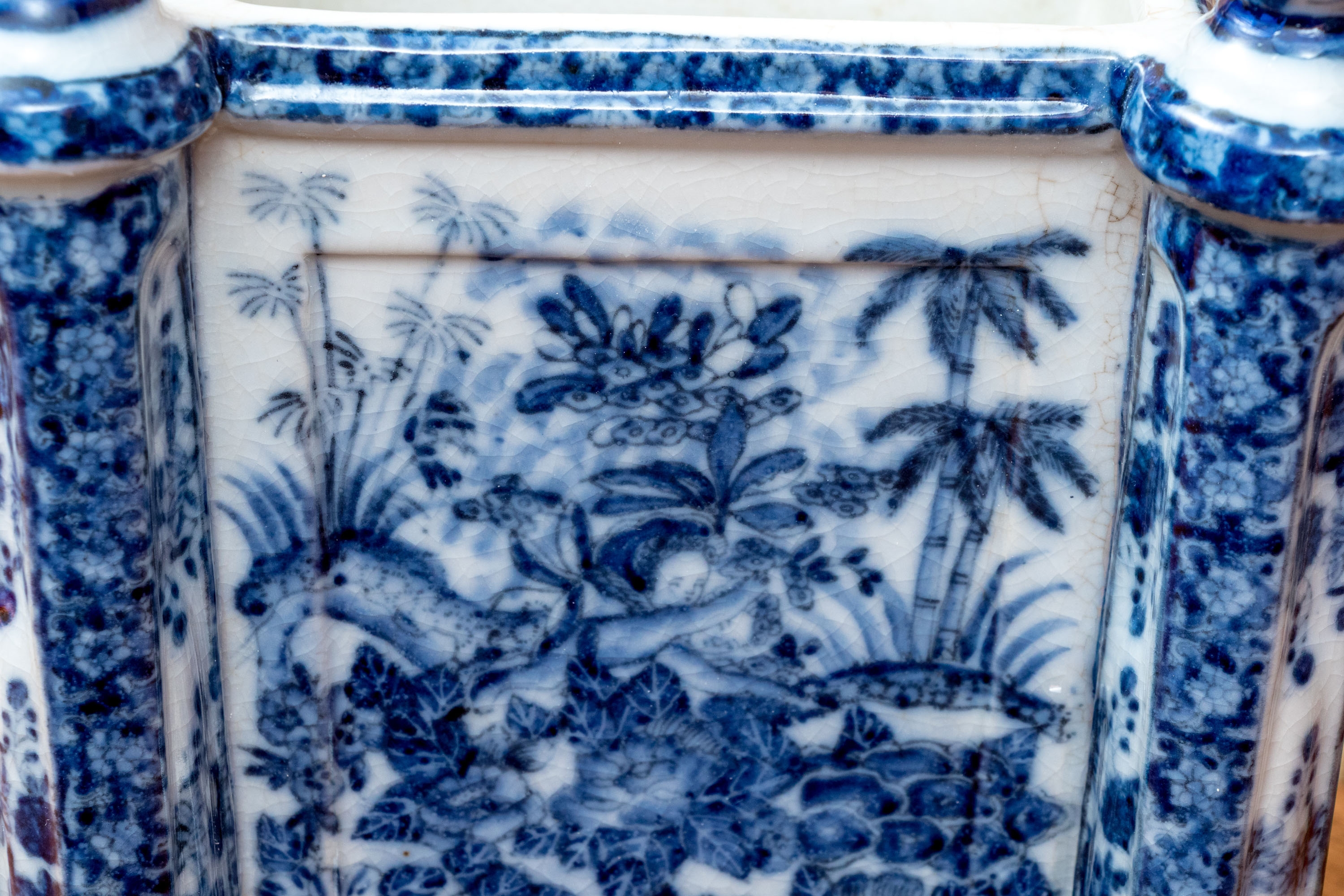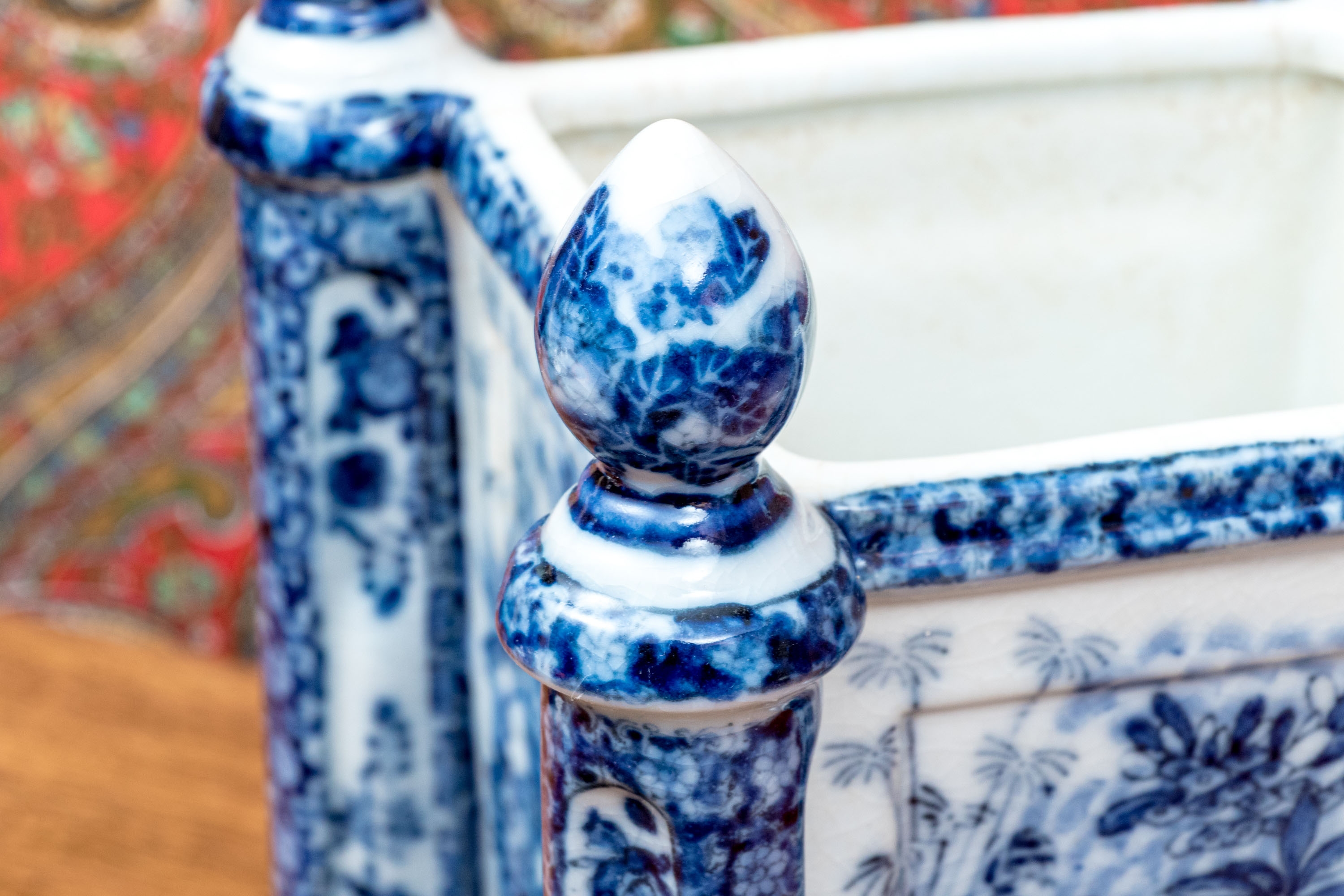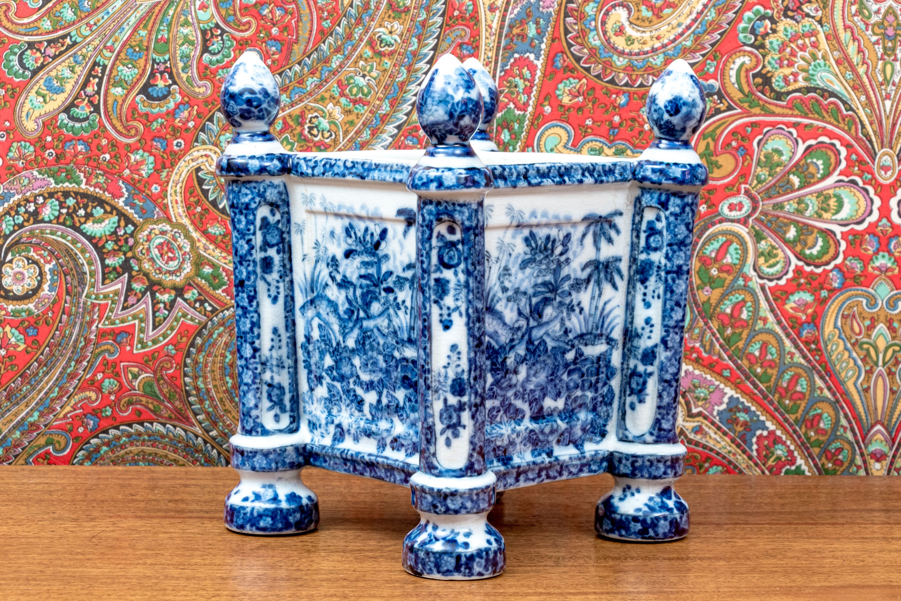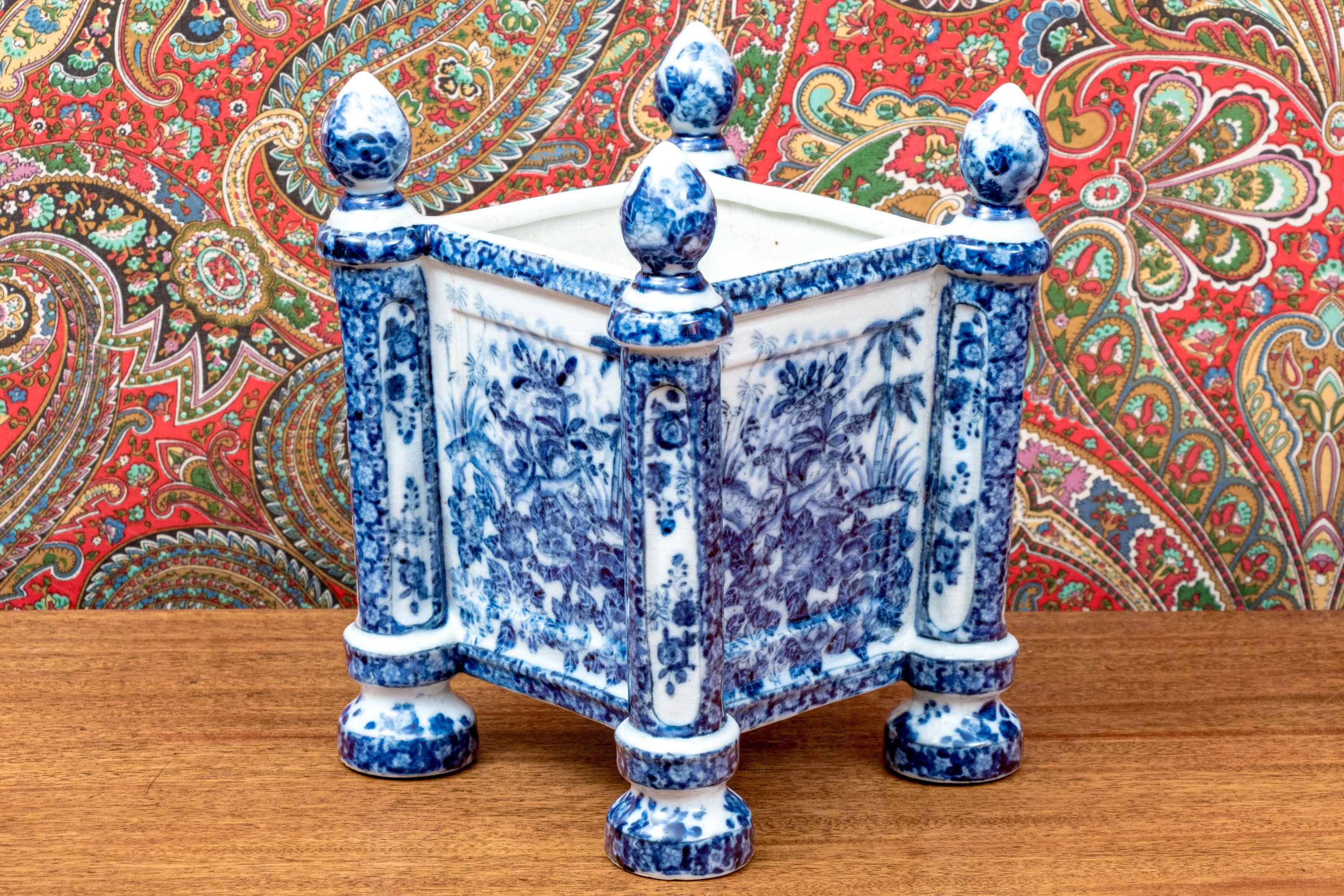 A fantastic porcelain cache pot with eye-catching chinoiserie style, showcasing ovoid finials decorated with scenes of landscapes that continue down the sides of the square body and cylindrical columns. Raised on bun feet. Marked underfoot.
