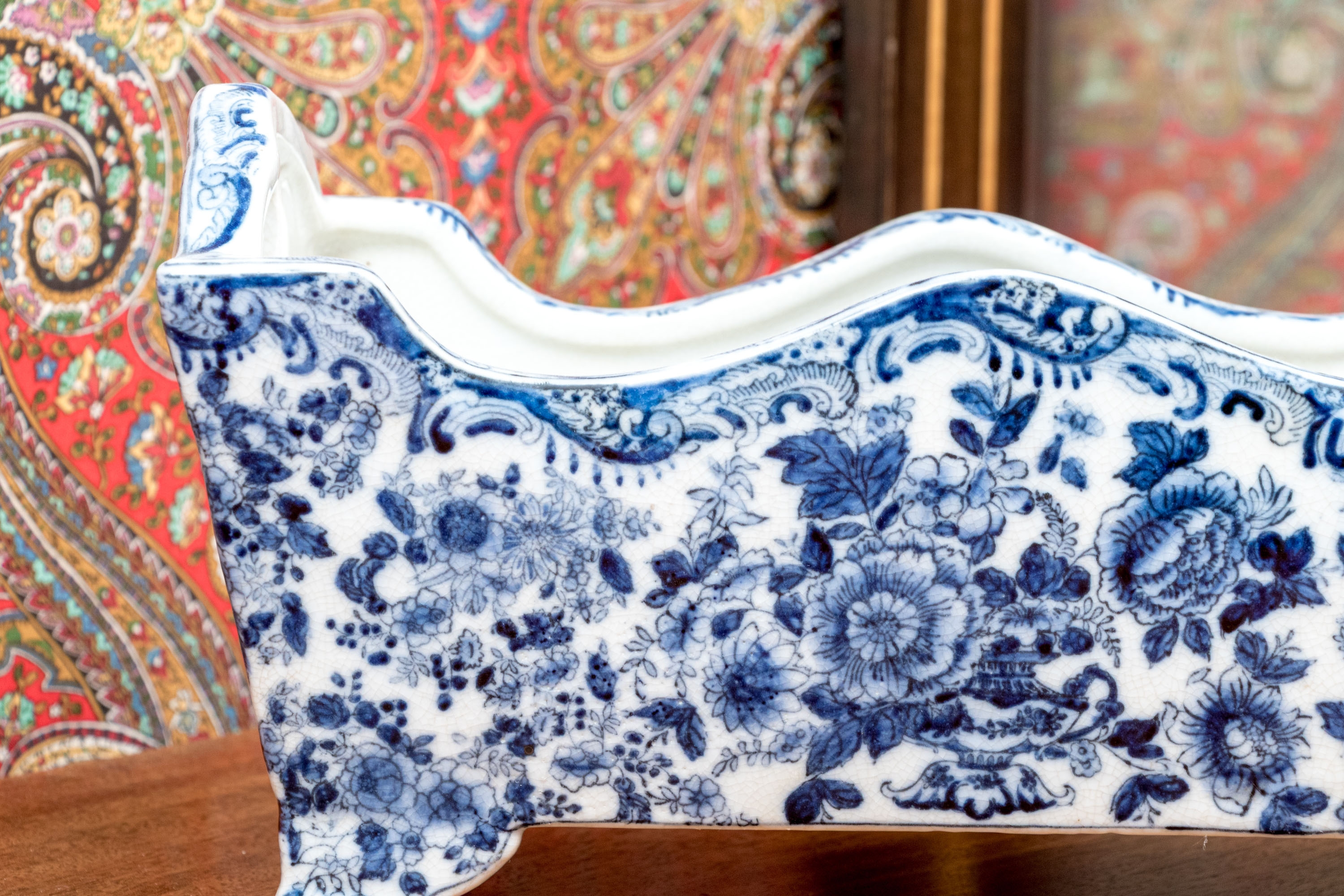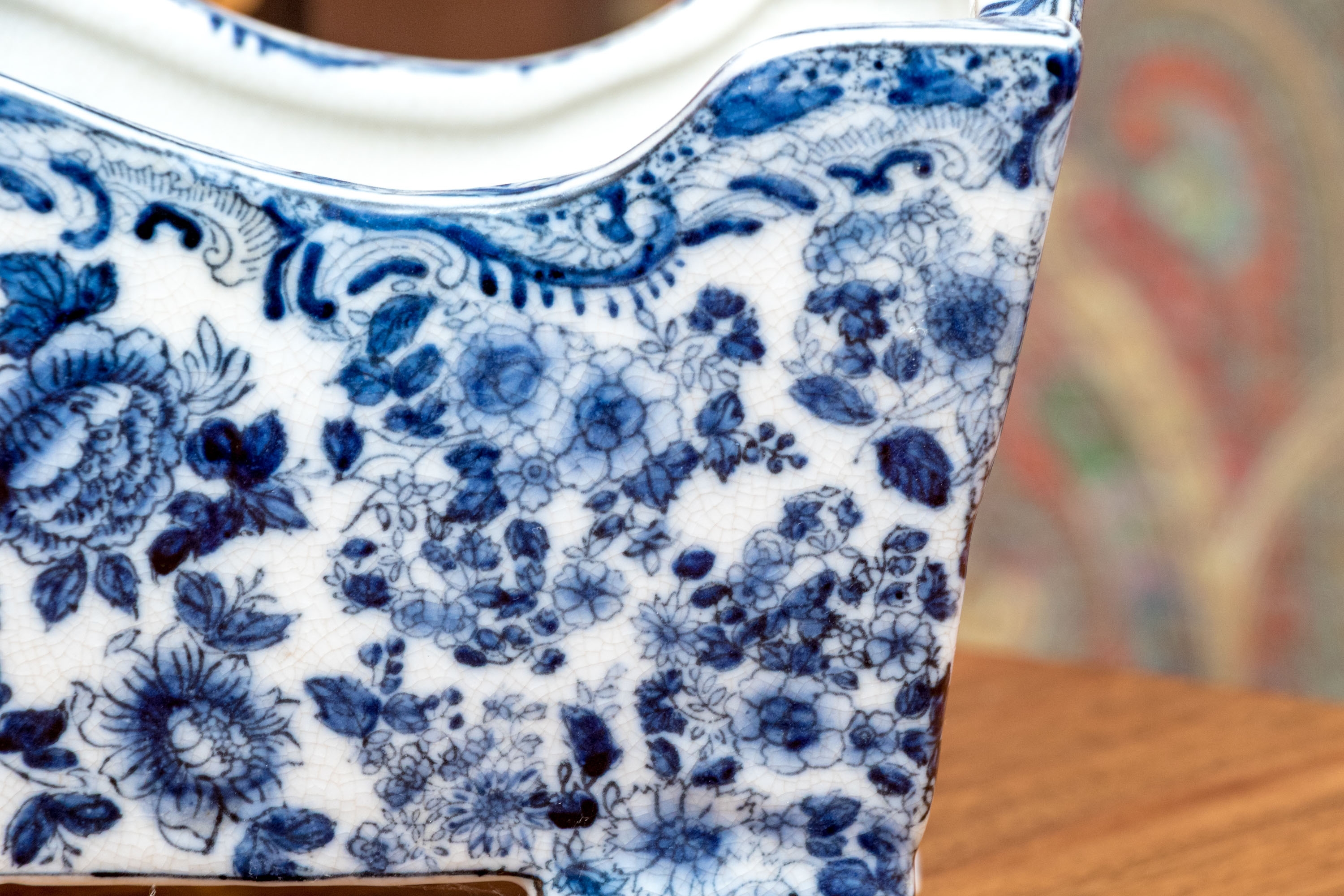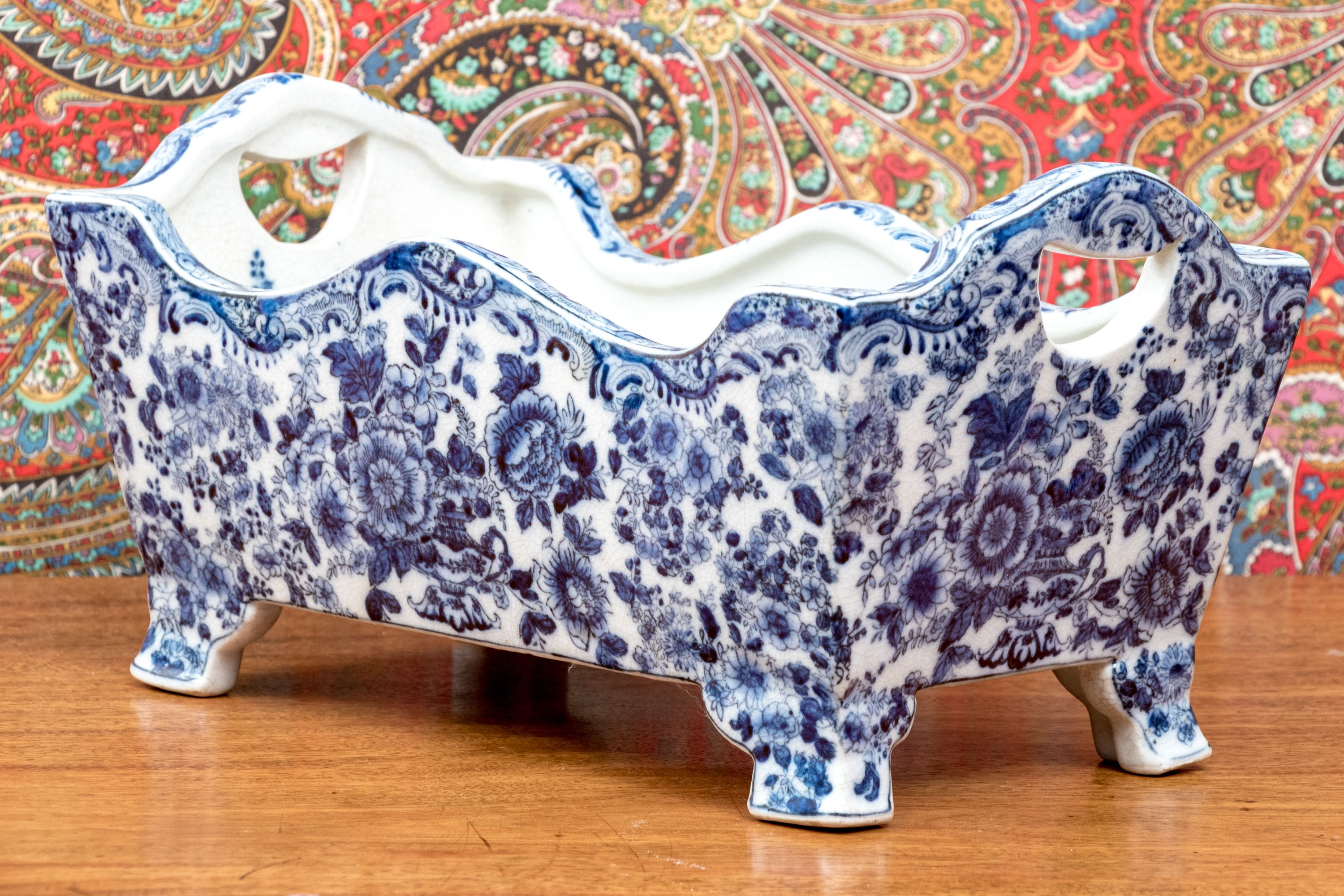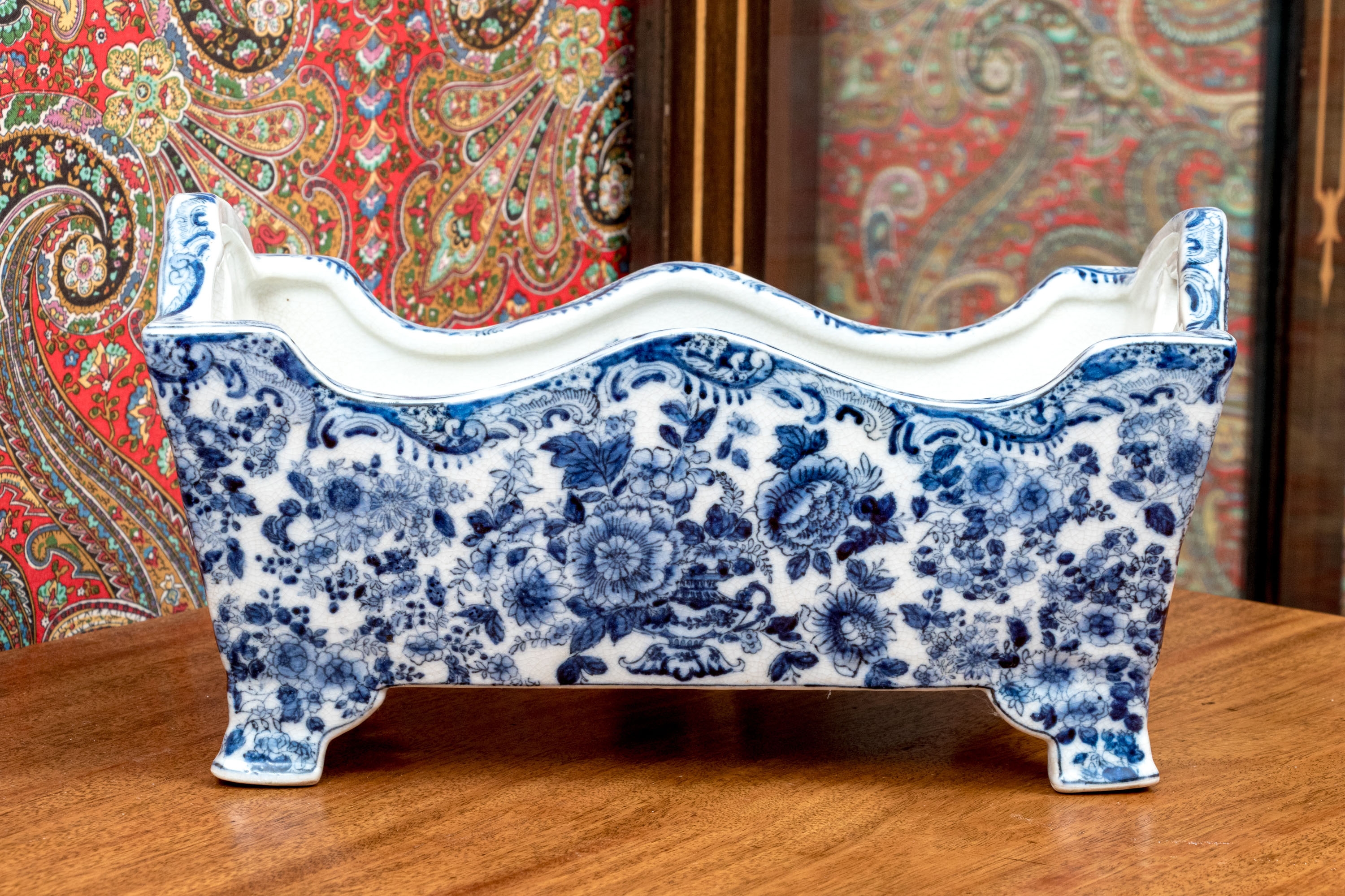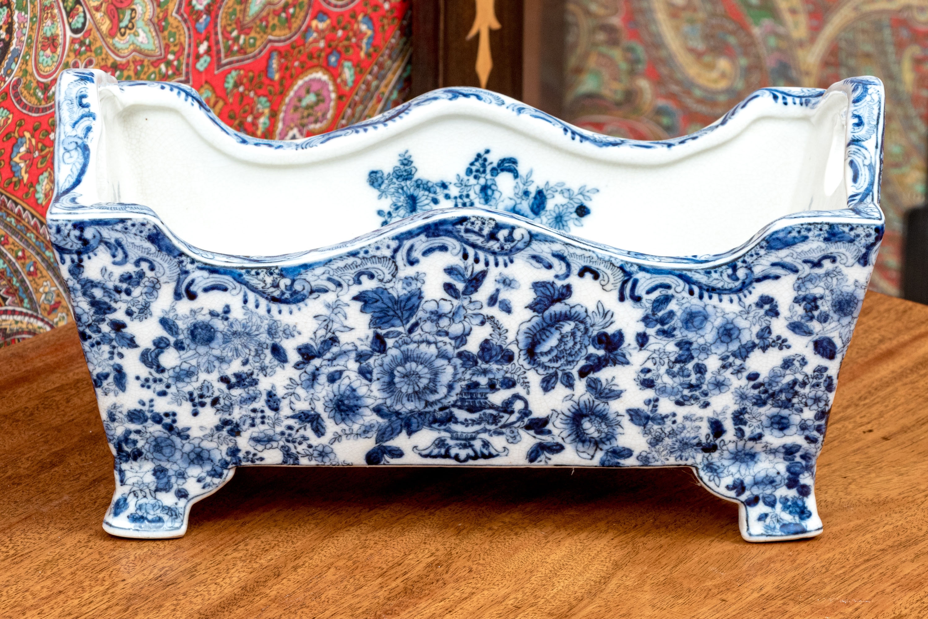 A fabulous export style porcelain cachepot in rectangular form with a deeply undulating rim and integrated demilune handles. The exterior is richly decorated with monochromatic blue underglaze floral sprays in a wonderful crackle glaze. The rectangular body gently tapers down to high bracket feet. Marked underfoot.