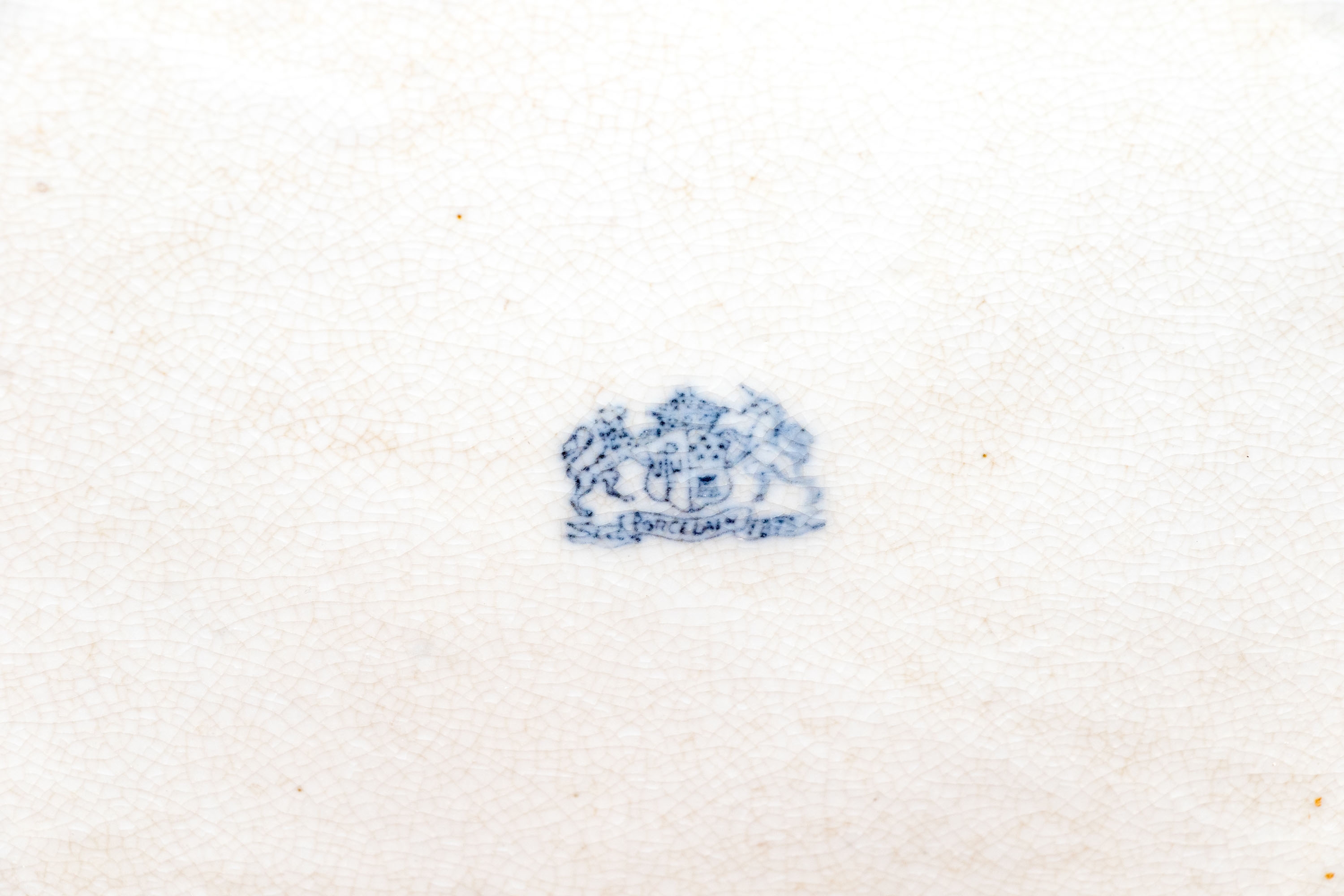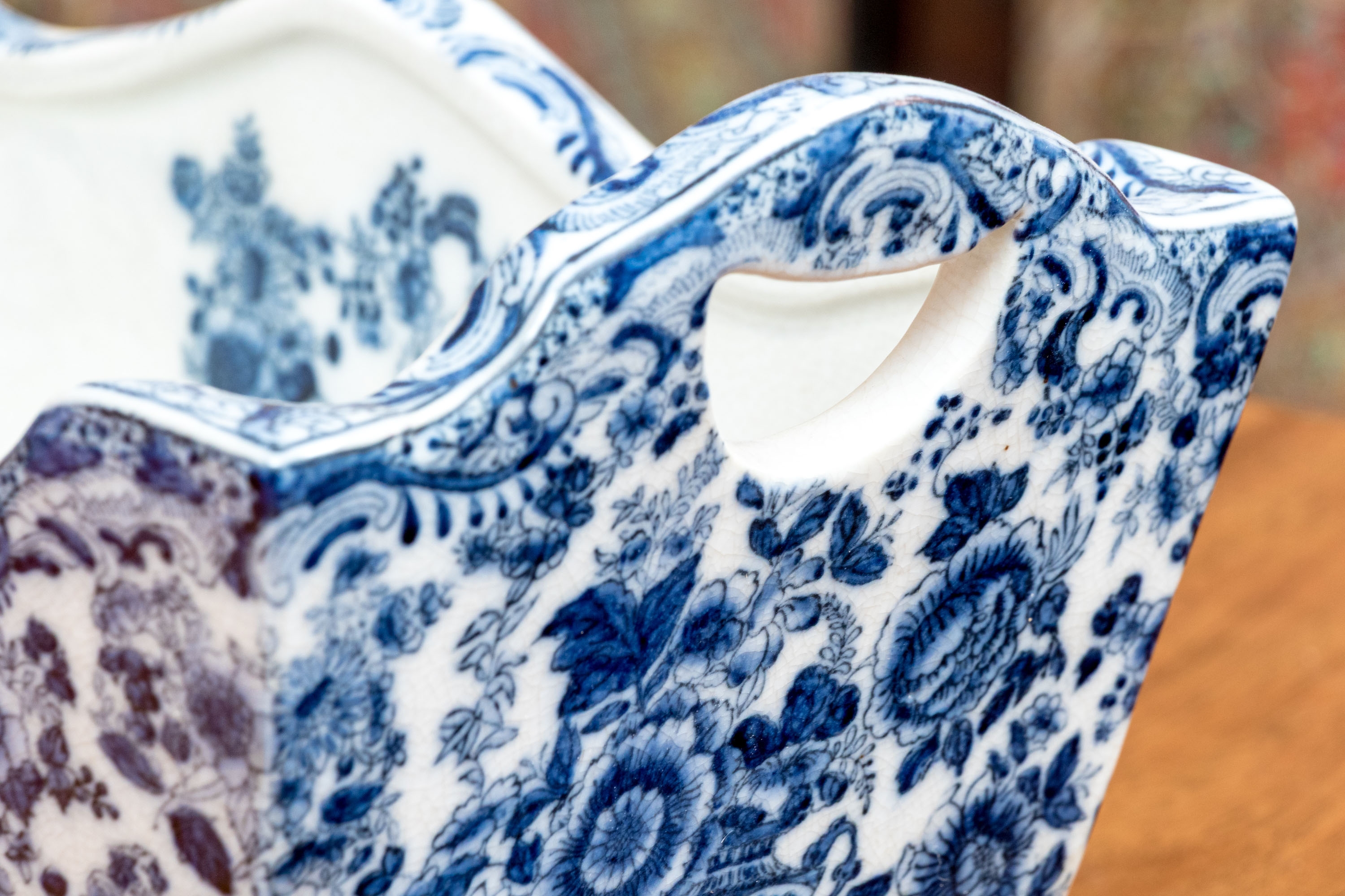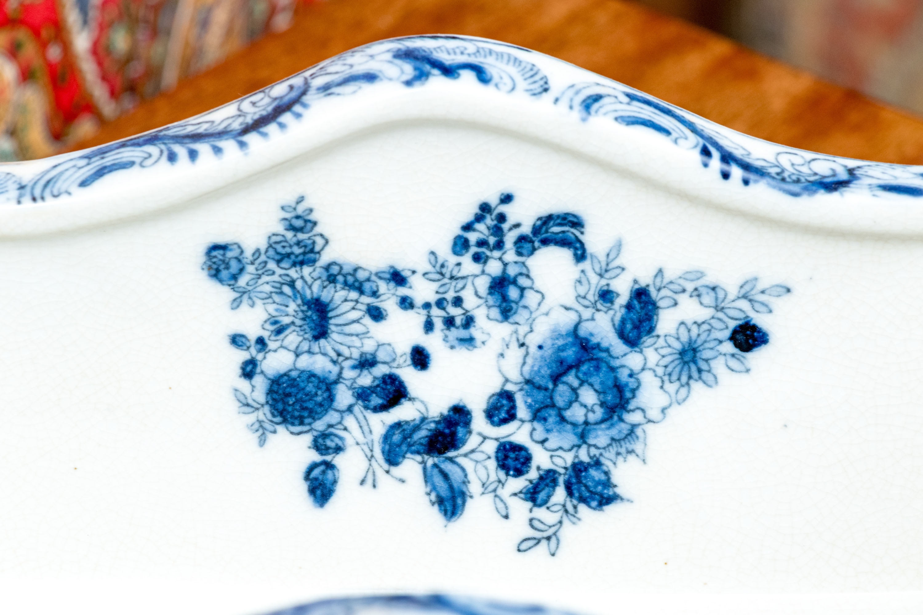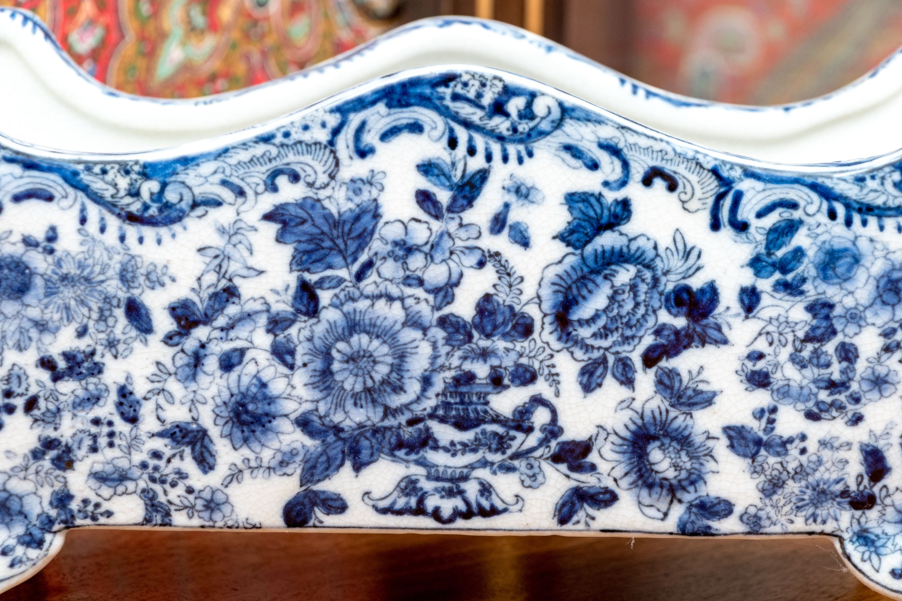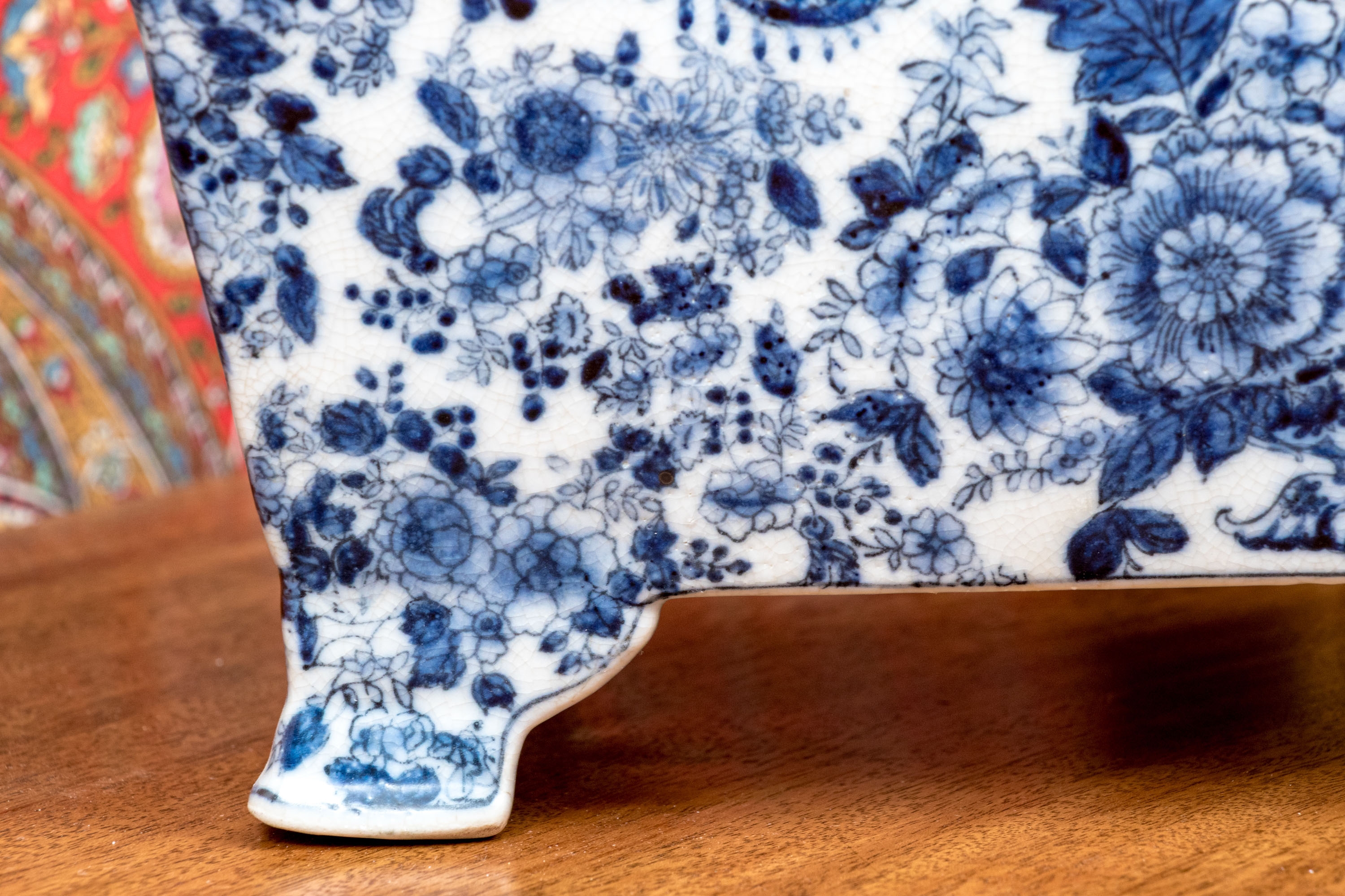 A fabulous export style porcelain cachepot in rectangular form with a deeply undulating rim and integrated demilune handles. The exterior is richly decorated with monochromatic blue underglaze floral sprays in a wonderful crackle glaze. The rectangular body gently tapers down to high bracket feet. Marked underfoot.