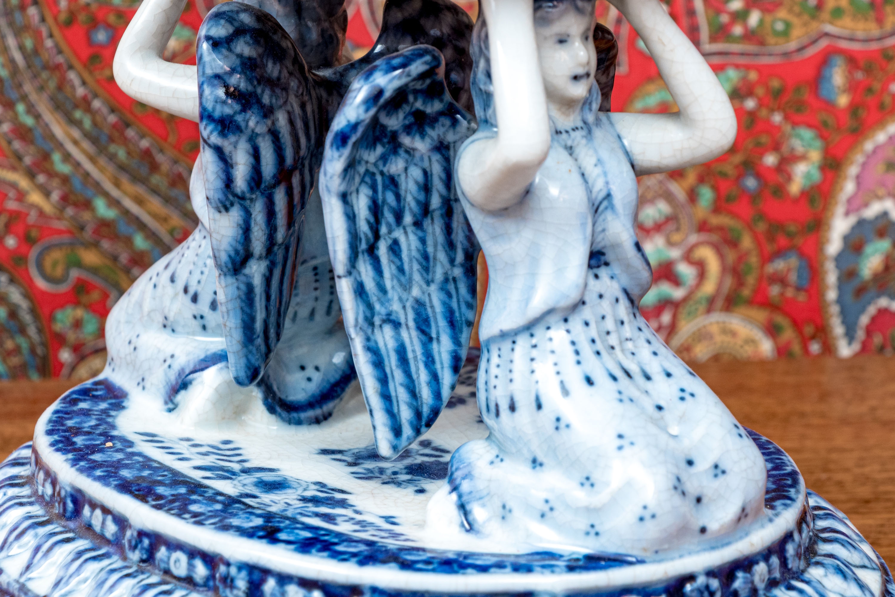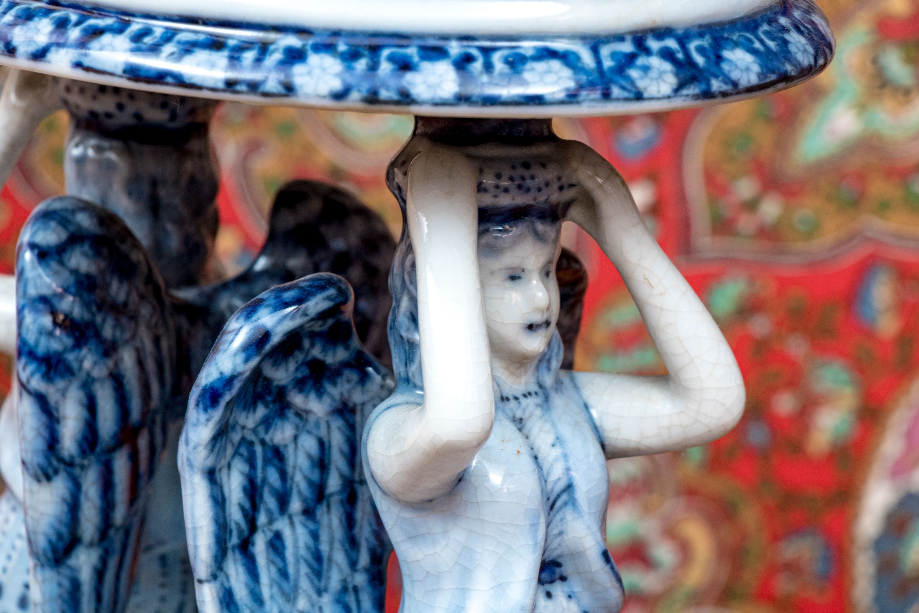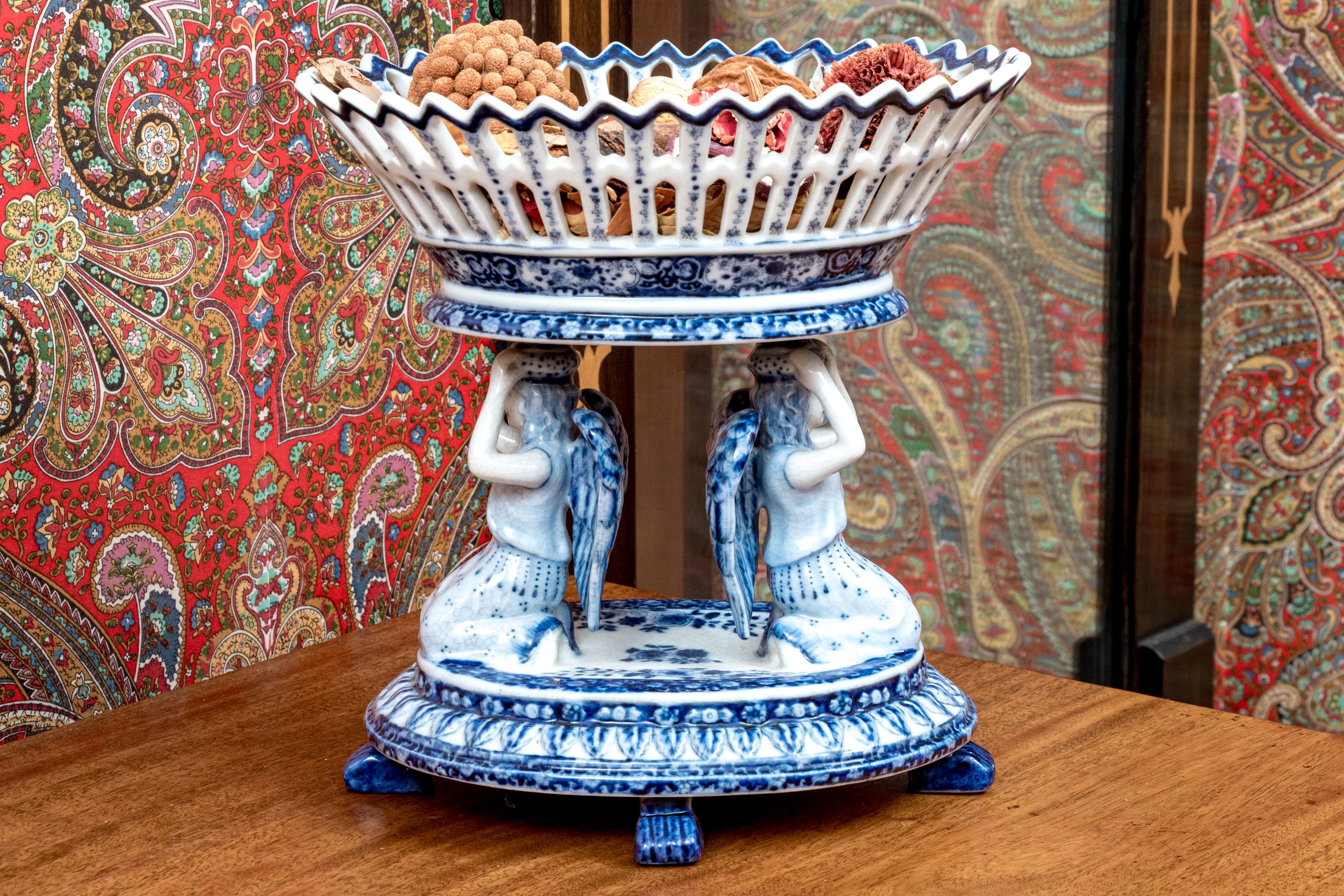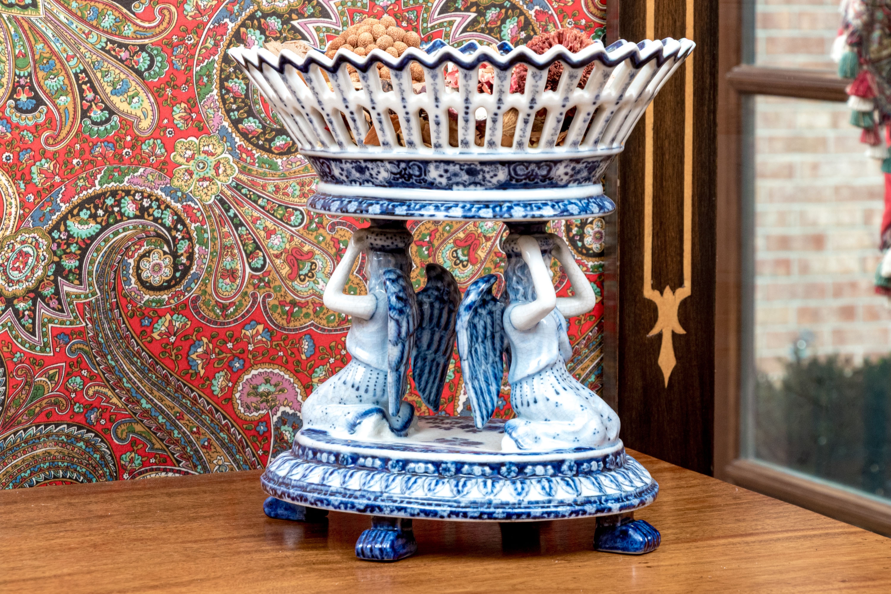 A fabulous and highly decorative porcelain compote centerpiece bowl showcasing a finely reticulated bowl with a zig-zag border raised by two angels with gorgeous monochromatic blue underglaze. The angels kneel over an oval base raised on four paw feet. Marked underfoot.