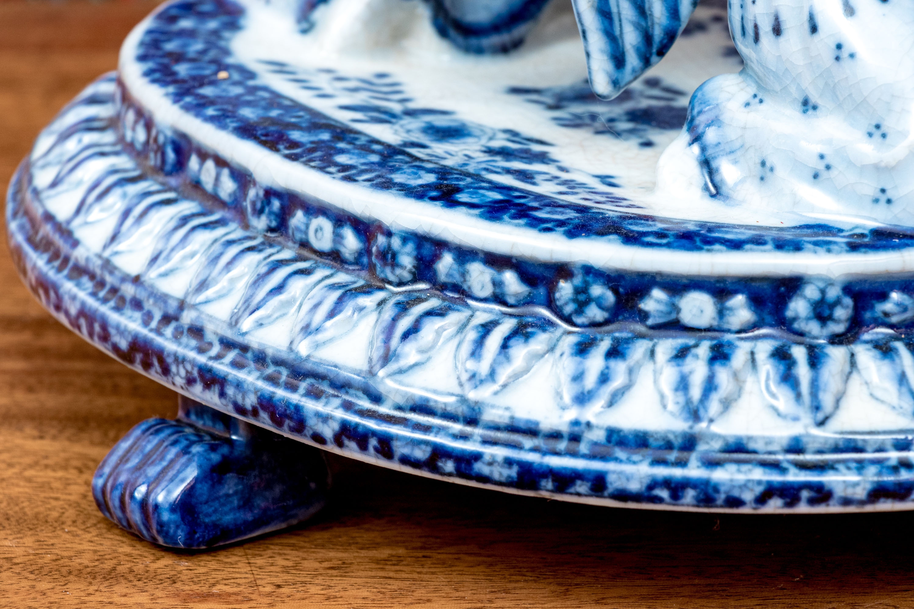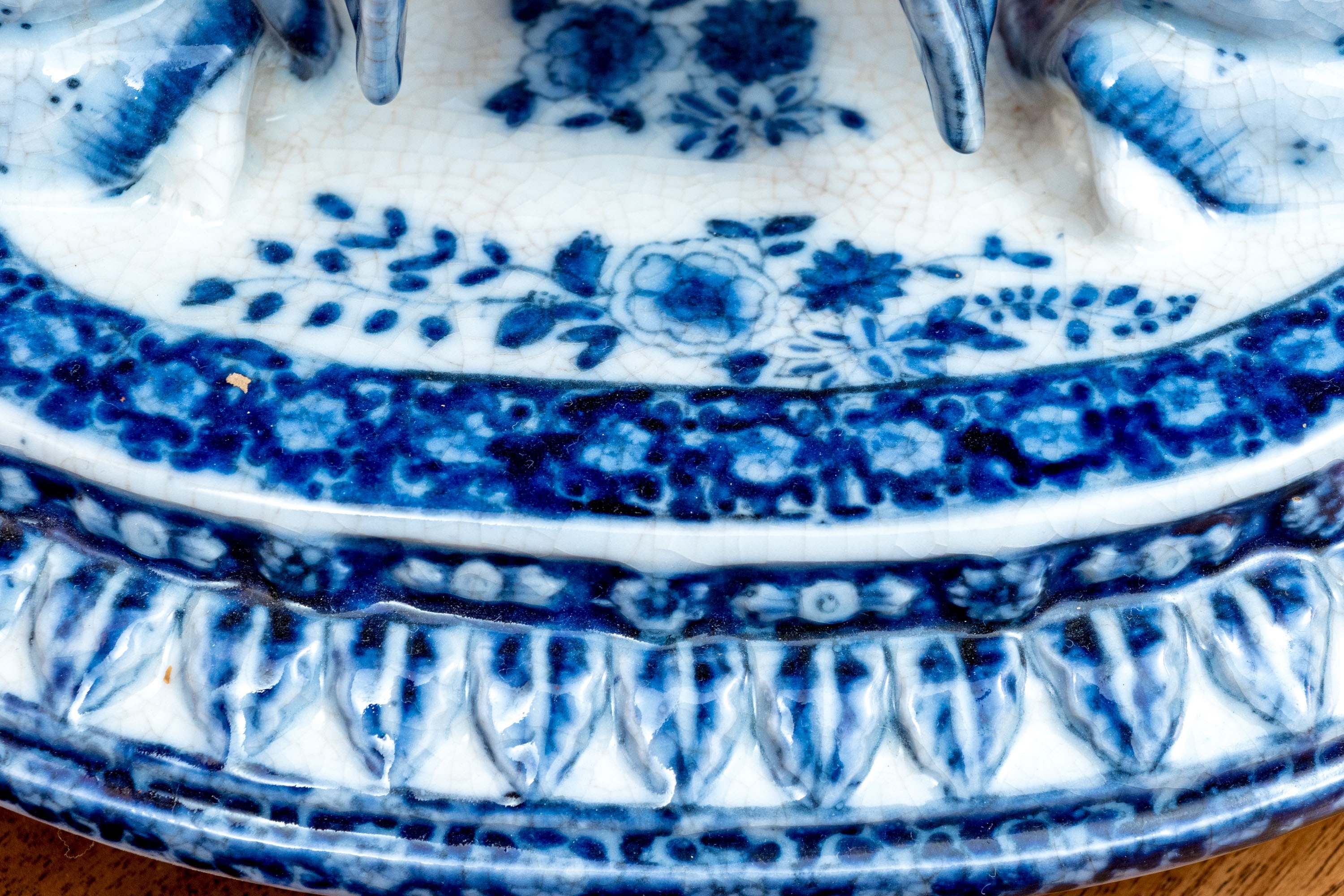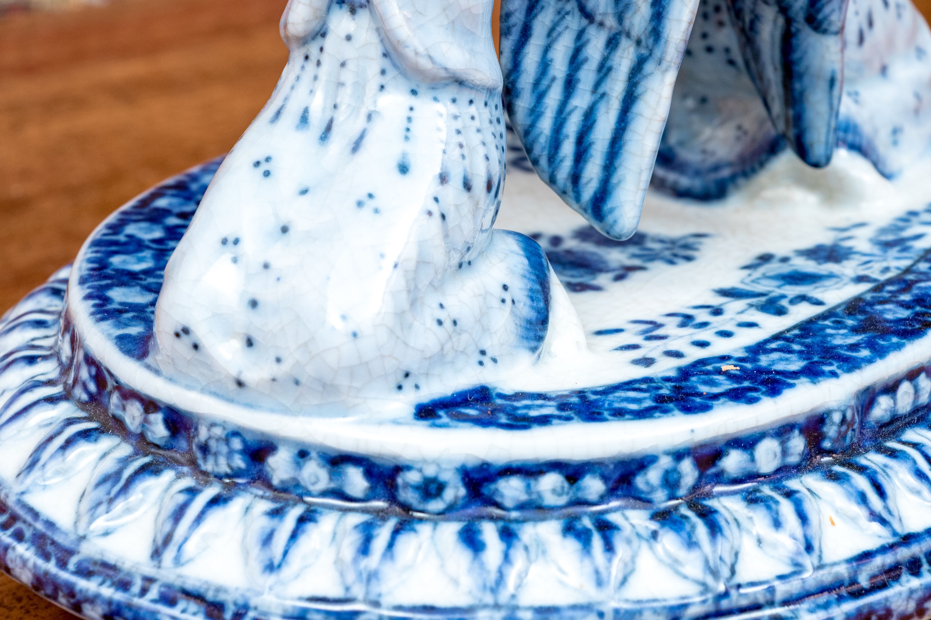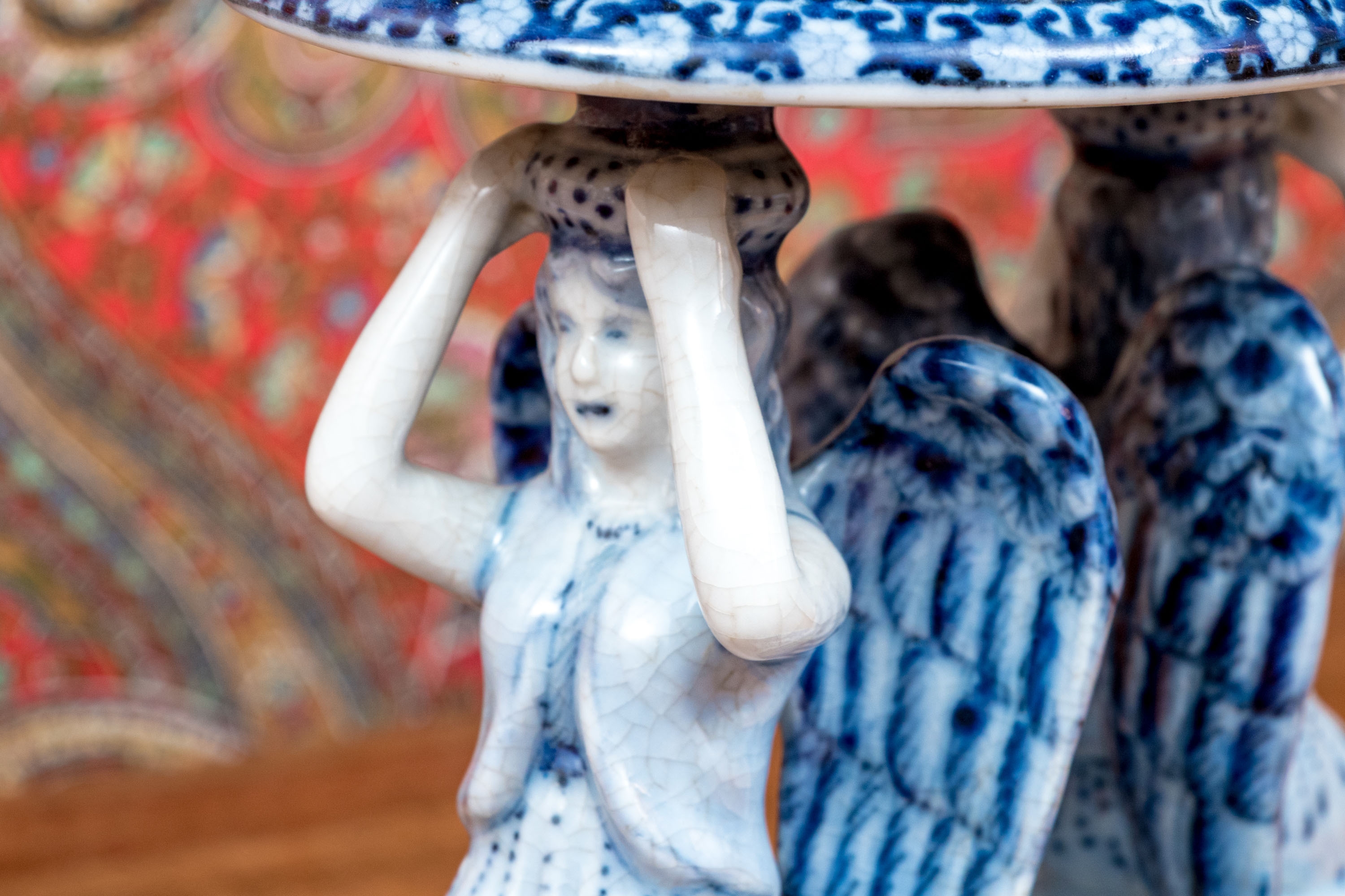 A fabulous and highly decorative porcelain compote centerpiece bowl showcasing a finely reticulated bowl with a zig-zag border raised by two angels with gorgeous monochromatic blue underglaze. The angels kneel over an oval base raised on four paw feet. Marked underfoot.