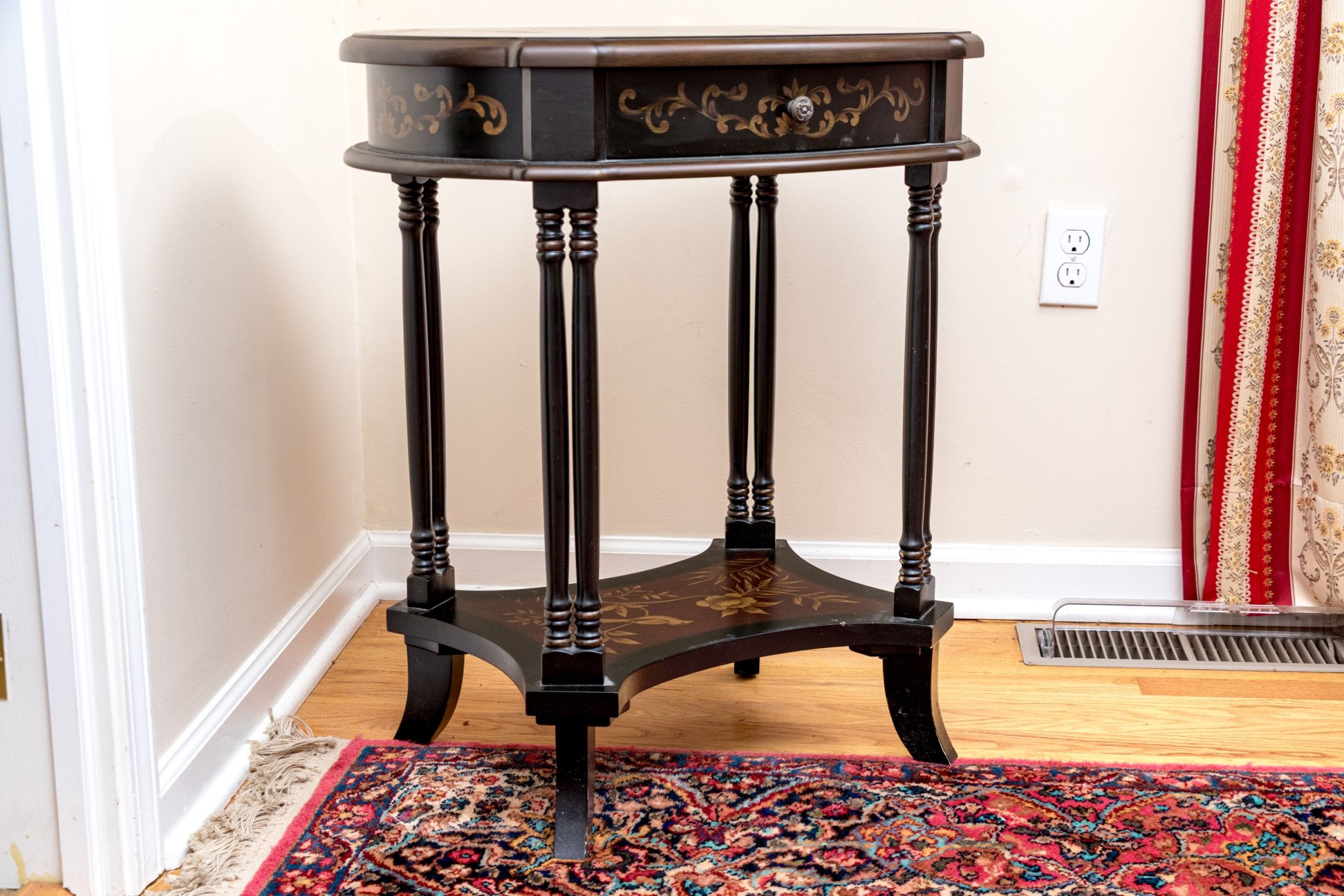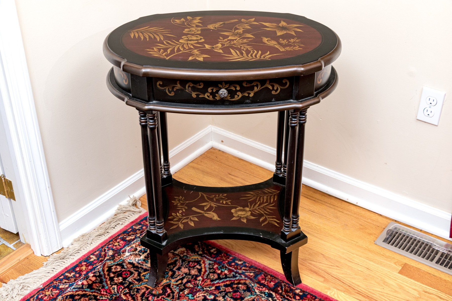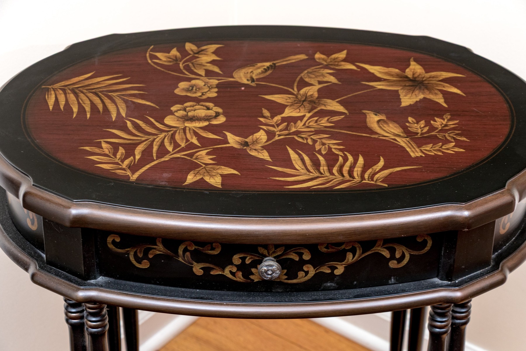 A handsome end table with great Italianate and chinoiserie appeal sporting an oval top with a maroon center decorated by yellow tropical foliage within an ebonized border. The apron follows suit with elegant scrolled foliage around a single drawer with a circular knob. Raised over double-column rails leading to a concave curved open lower shelf atop curved and flared feet. Made by Bombay Co. 2010. on verso.