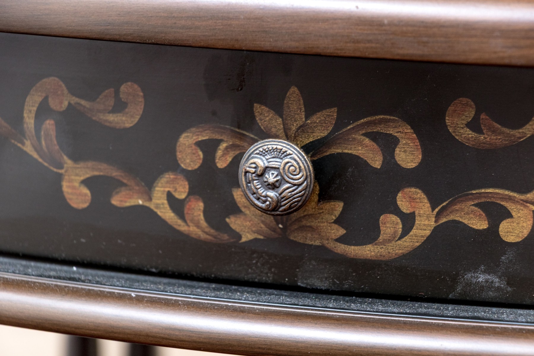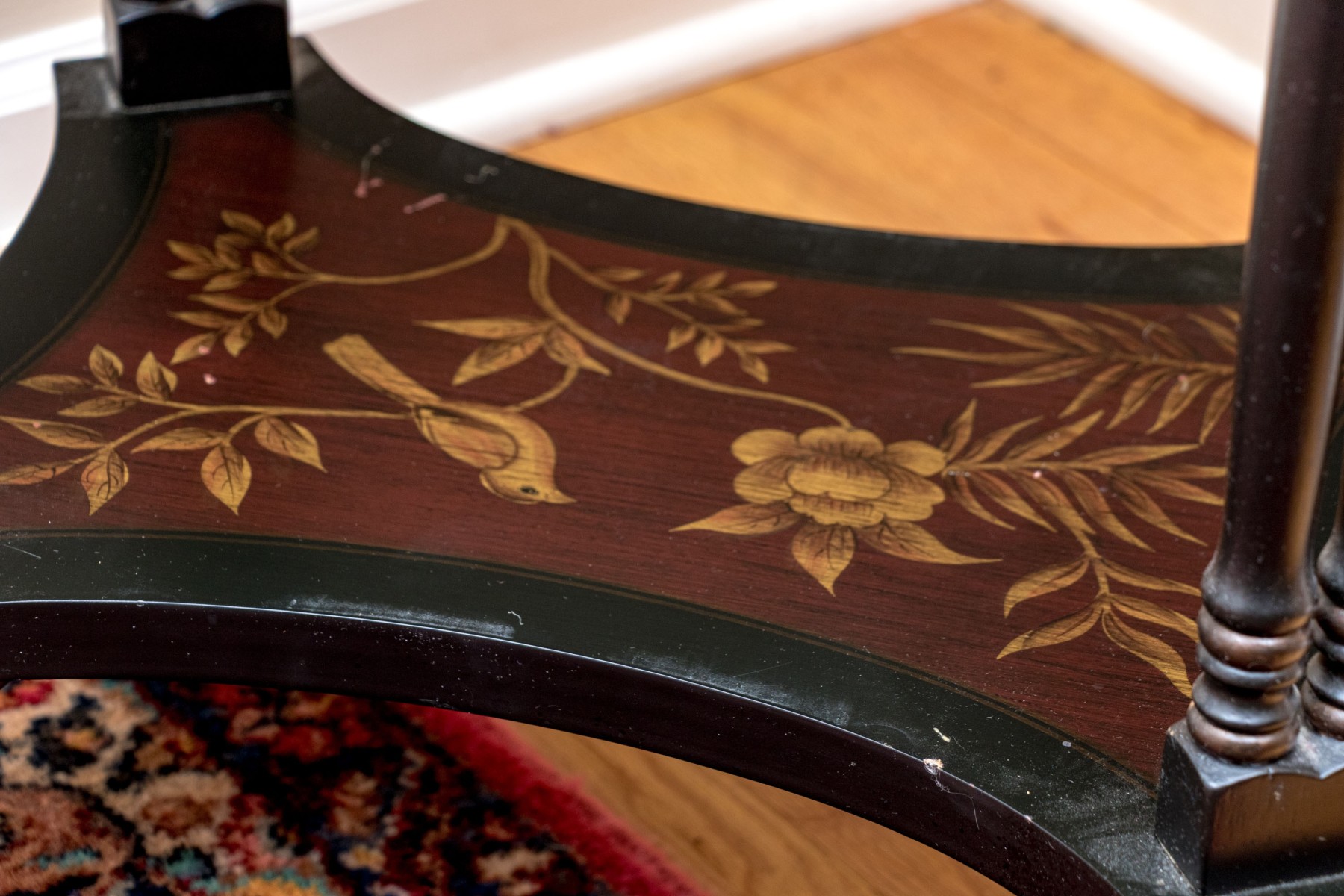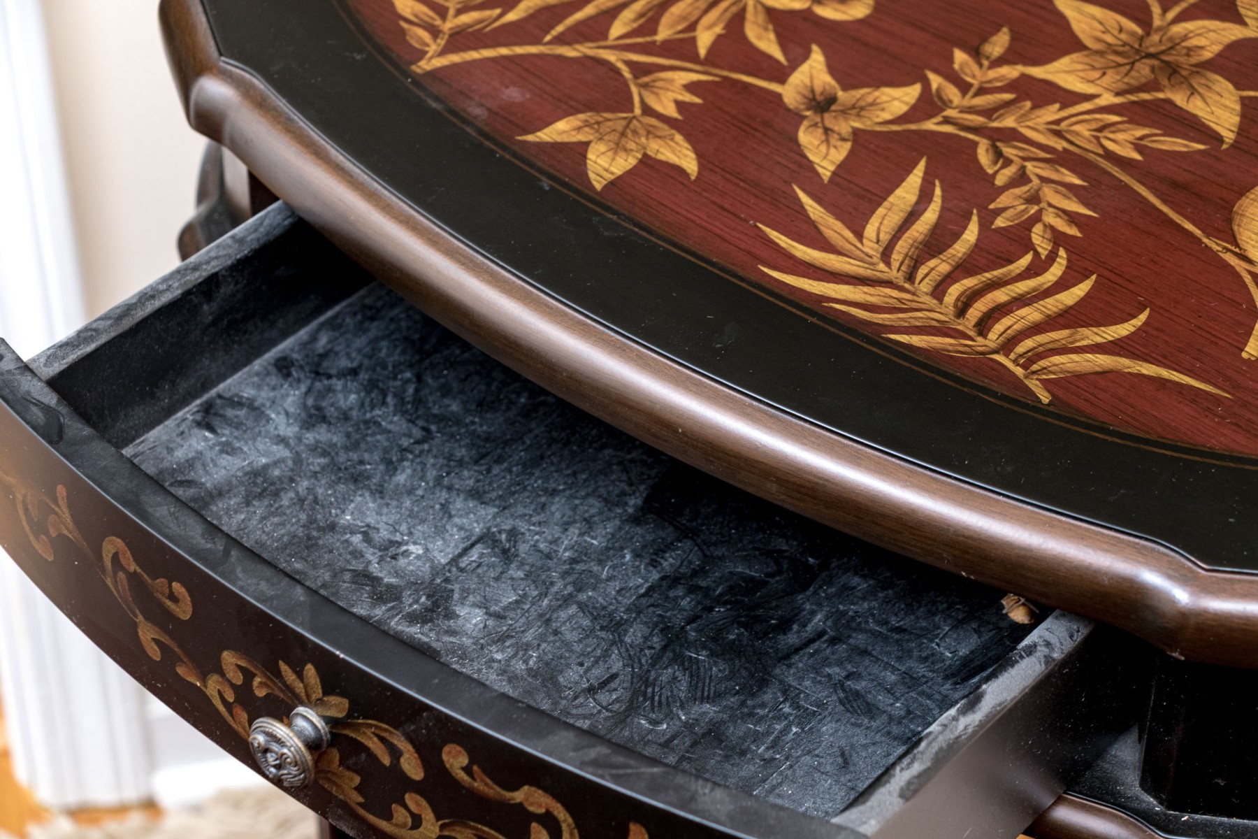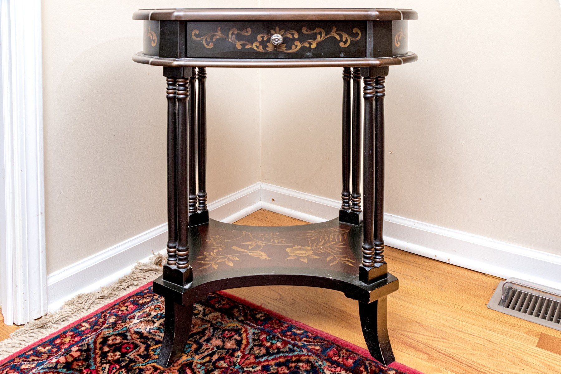 A handsome end table with great Italianate and chinoiserie appeal sporting an oval top with a maroon center decorated by yellow tropical foliage within an ebonized border. The apron follows suit with elegant scrolled foliage around a single drawer with a circular knob. Raised over double-column rails leading to a concave curved open lower shelf atop curved and flared feet. Made by Bombay Co. 2010. on verso.