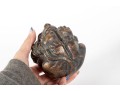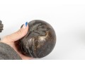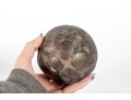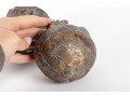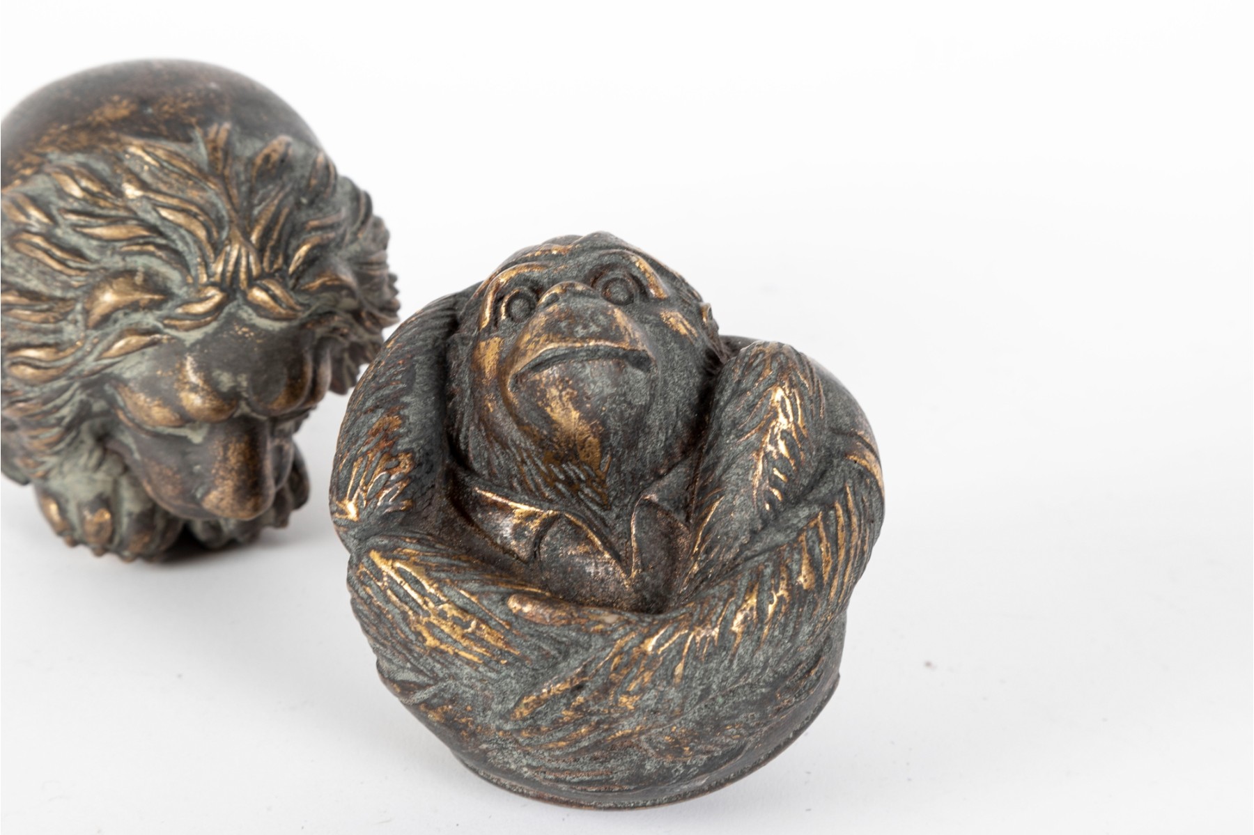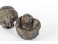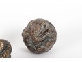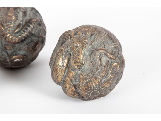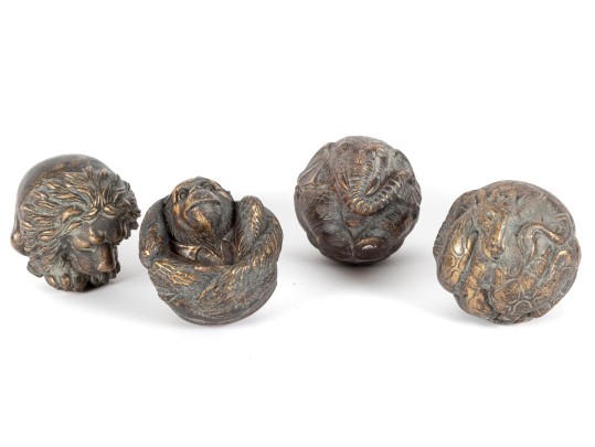 A set of four decorative 4" spheres crafted from resin and tinted in a distressed gold finish -- each one representing an animal; a giraffe, snake, monkey and elephant.
