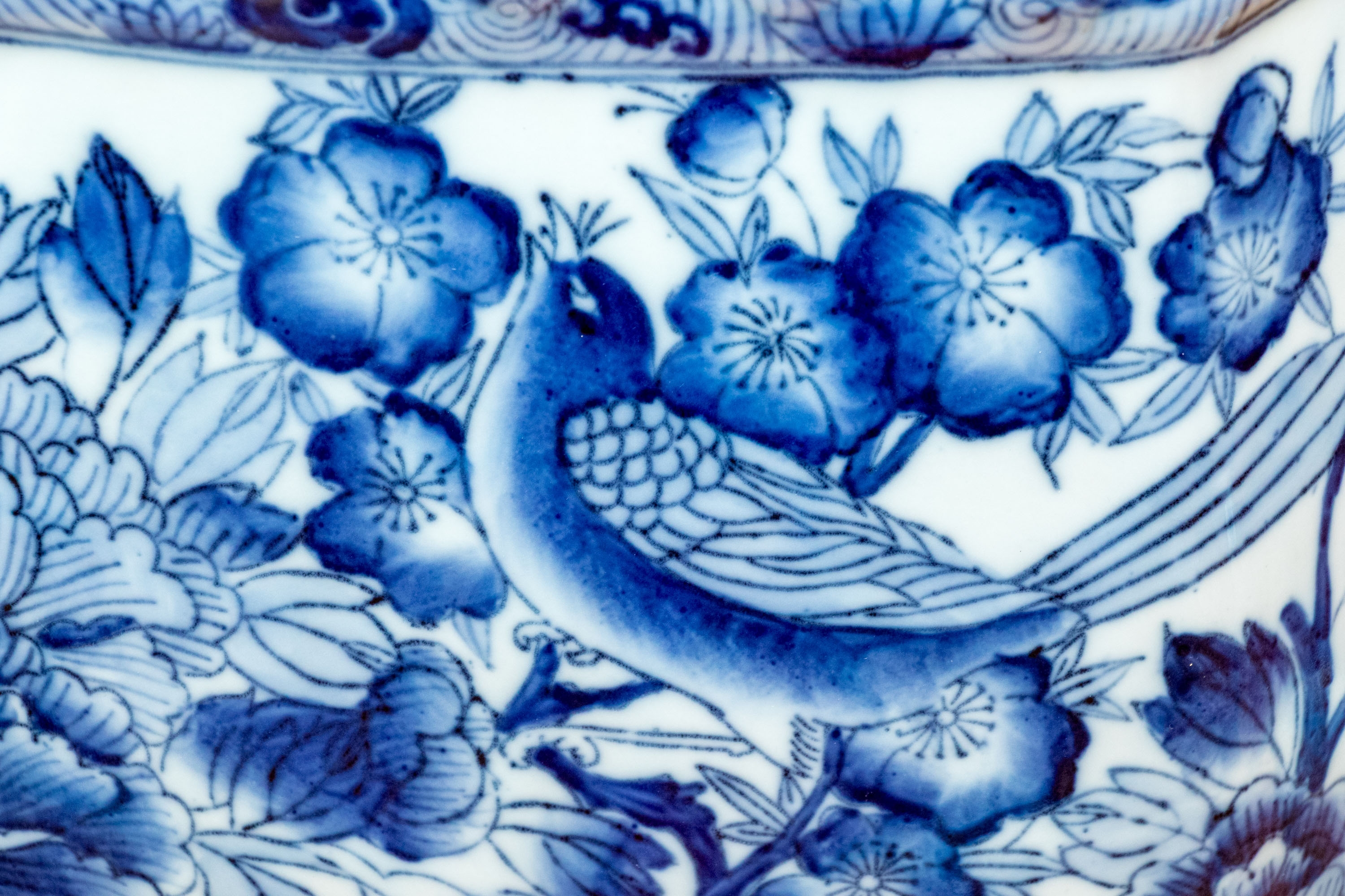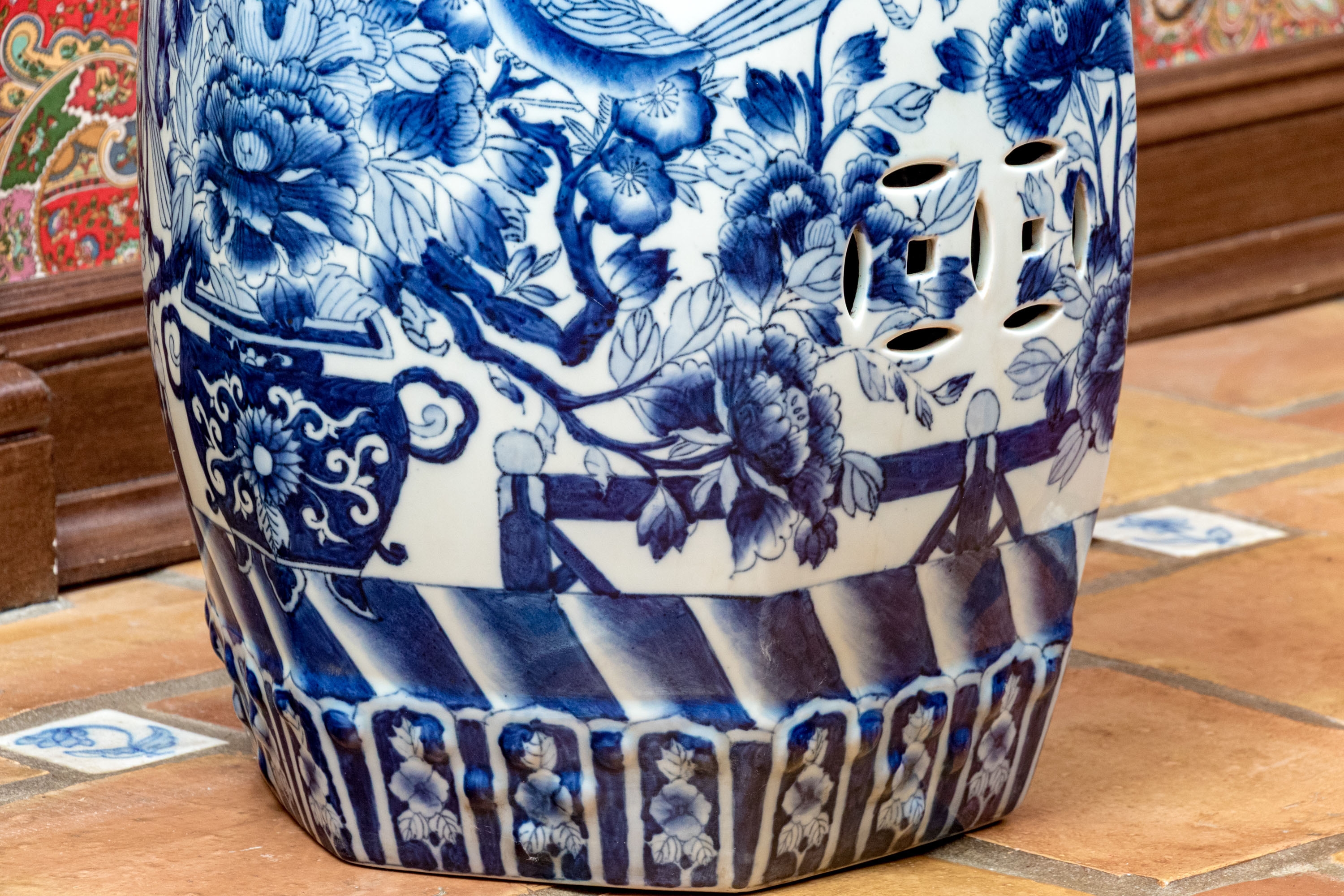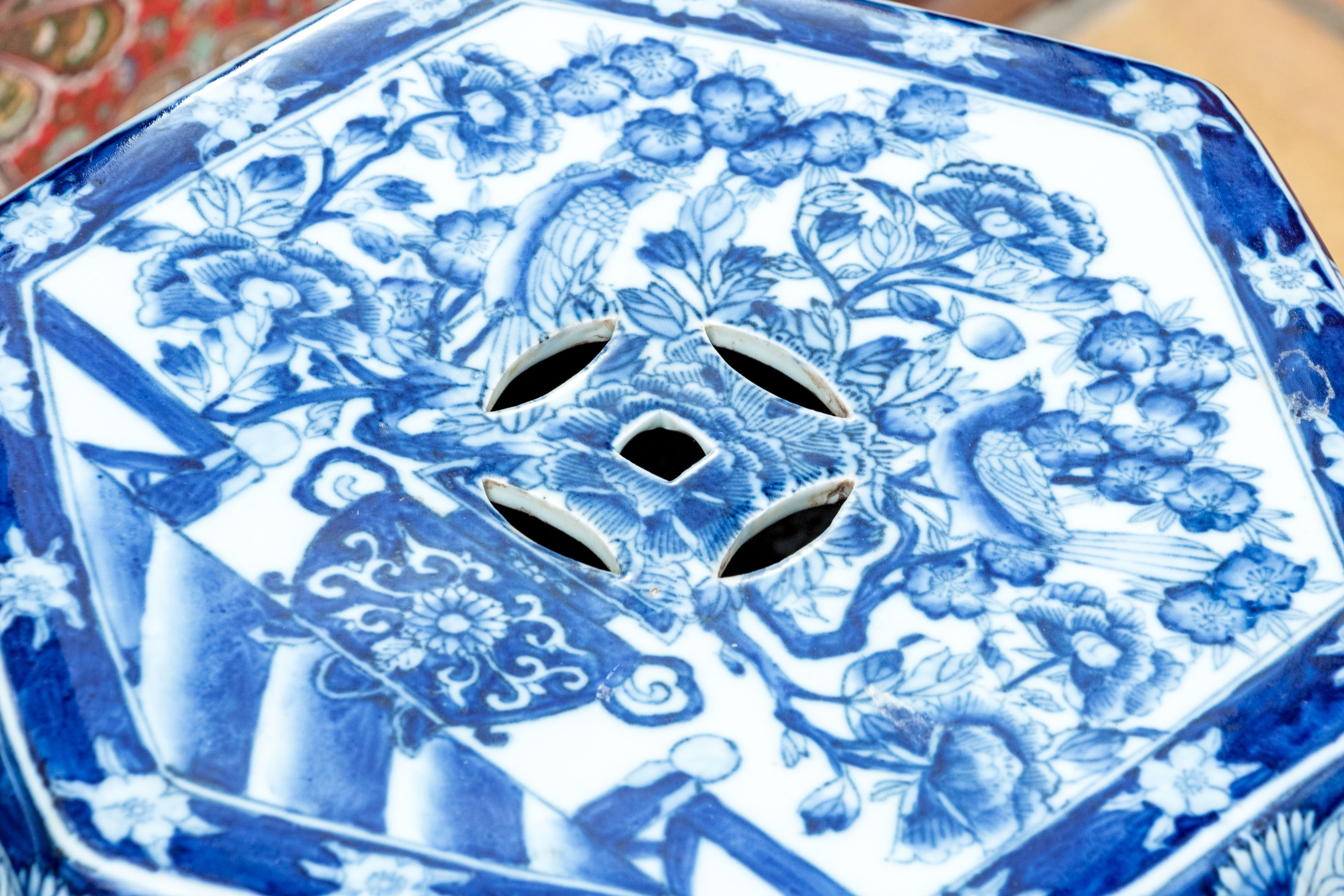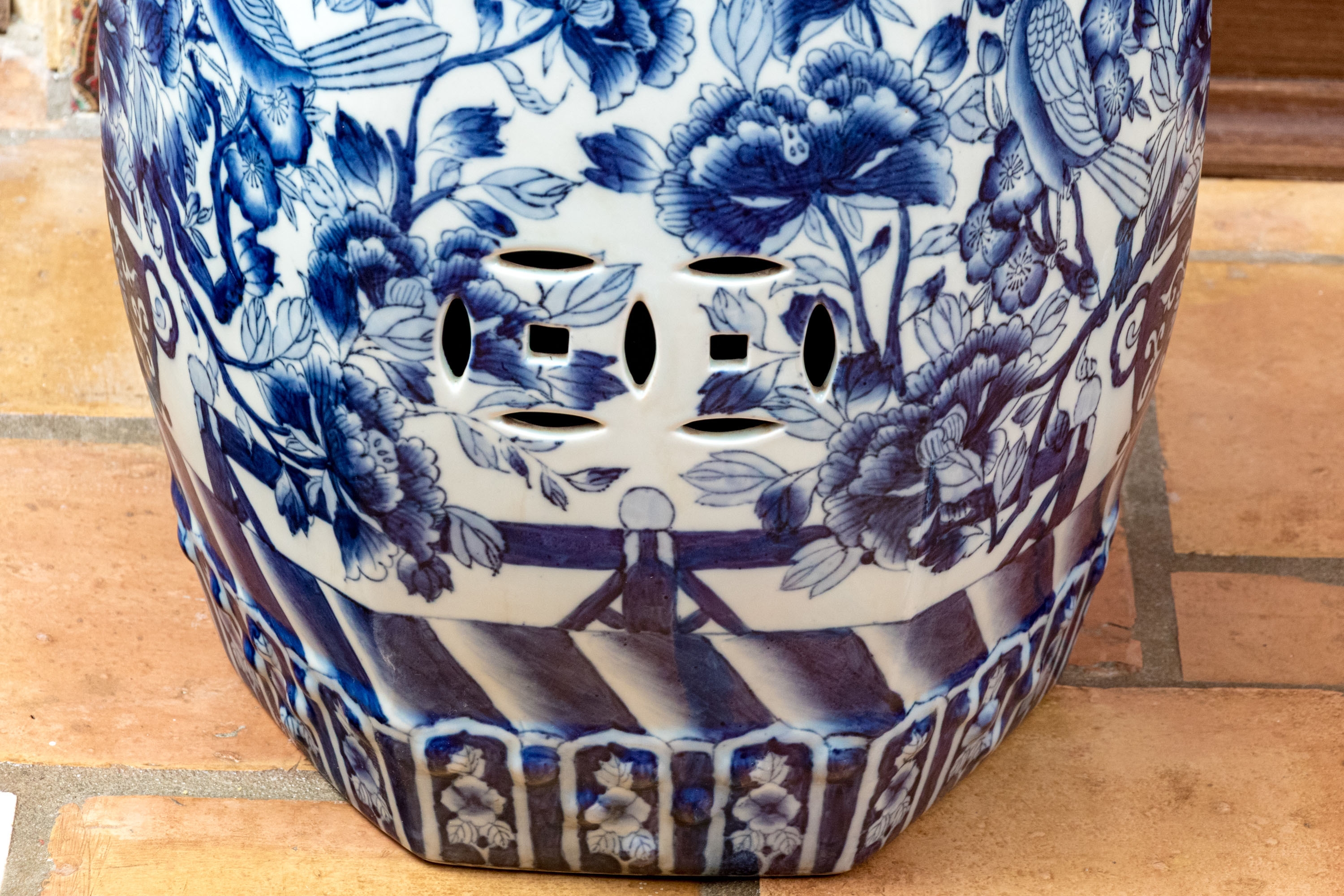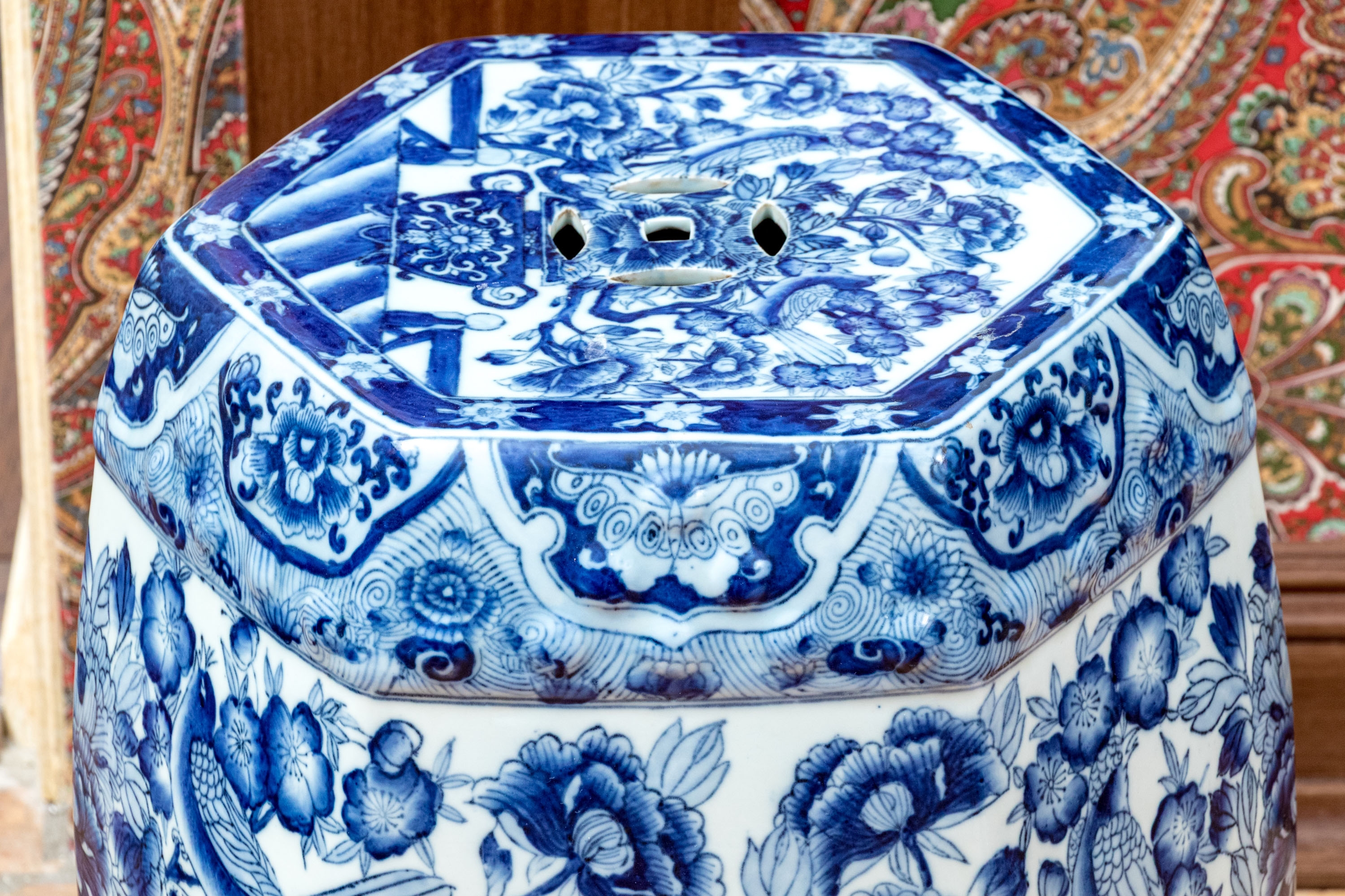 A handsome Chinese porcelain garden stool showcasing a hexagonal barrel form with a pierced coin motif at the center top and double coins at the sides. The extended top border features reserves of moths and flowers over a gorgeous swirling field like ripples on water, leading to a body decorated with birds, foliage, and large flowers.