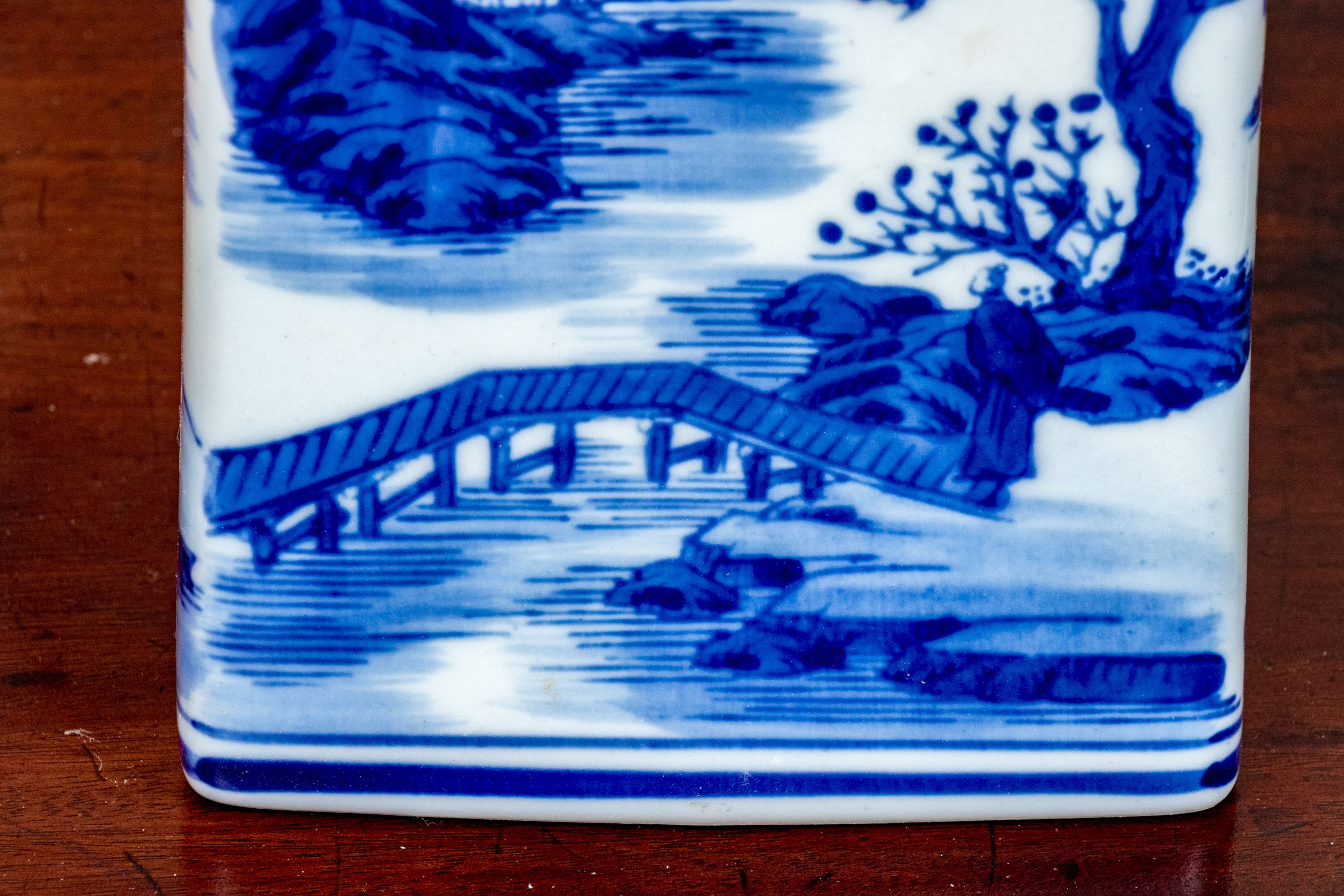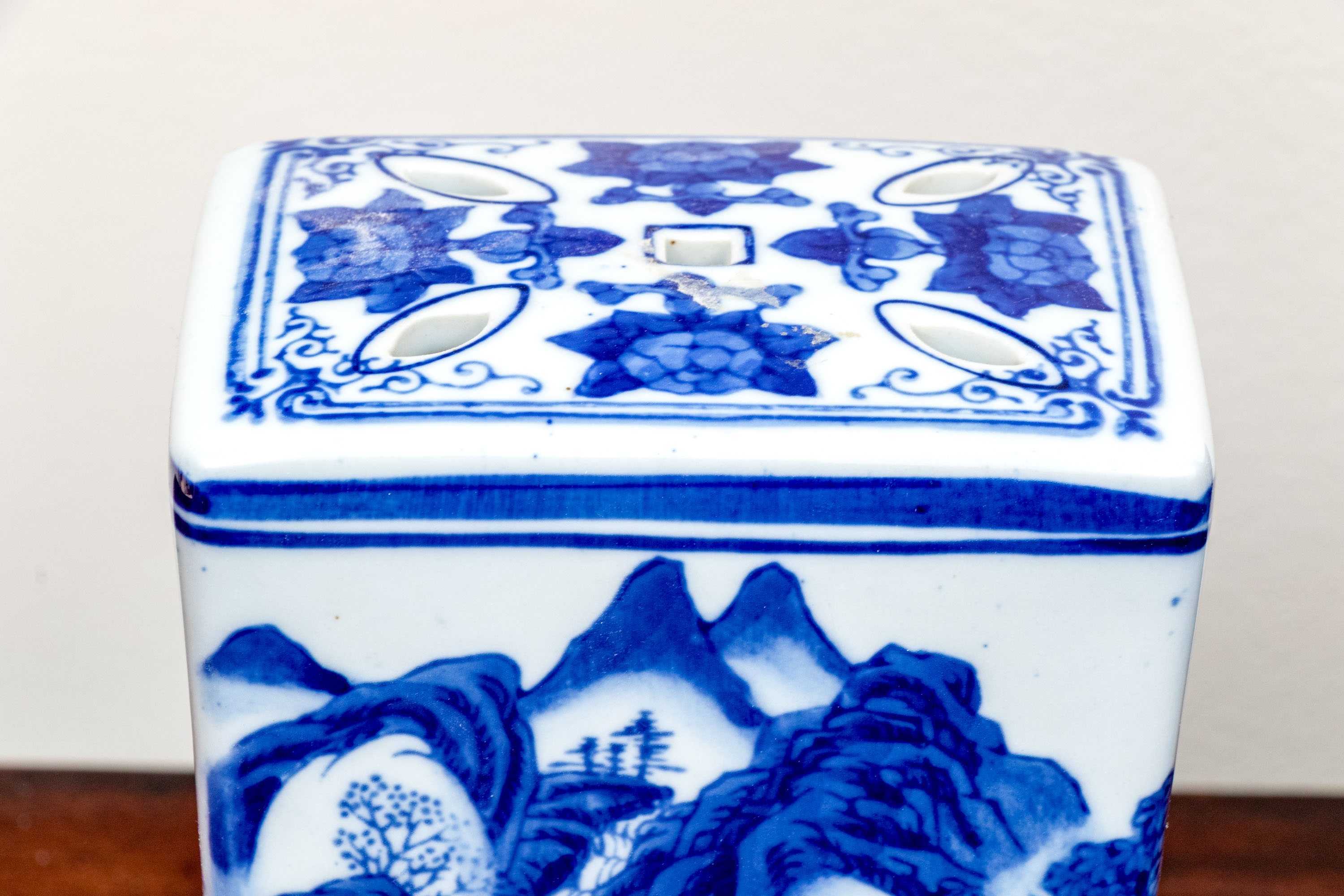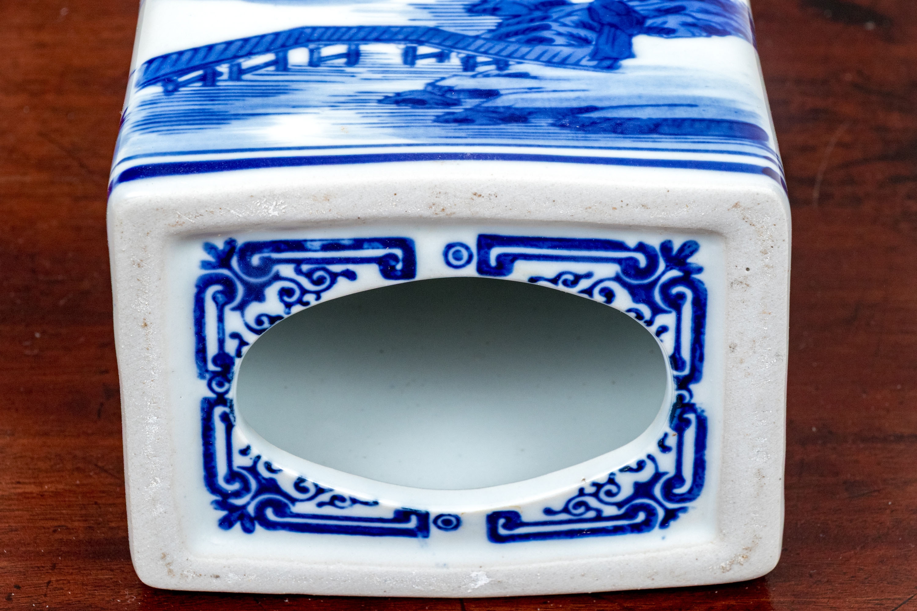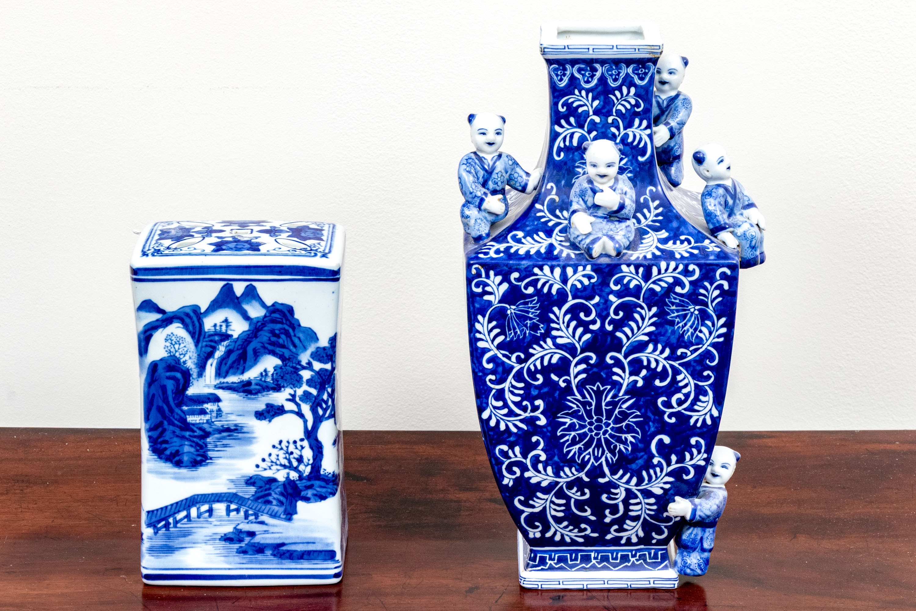 A gorgeous duo of Chinese ceramics including a rectangular pillow or incense cover decorated with a scene of a bridge over a lake with mountains and architecture in the background, and a delightful vase with figural children surrounding a square rim on an urn-shaped body in vibrant cobalt blue with ornate foliate vines.