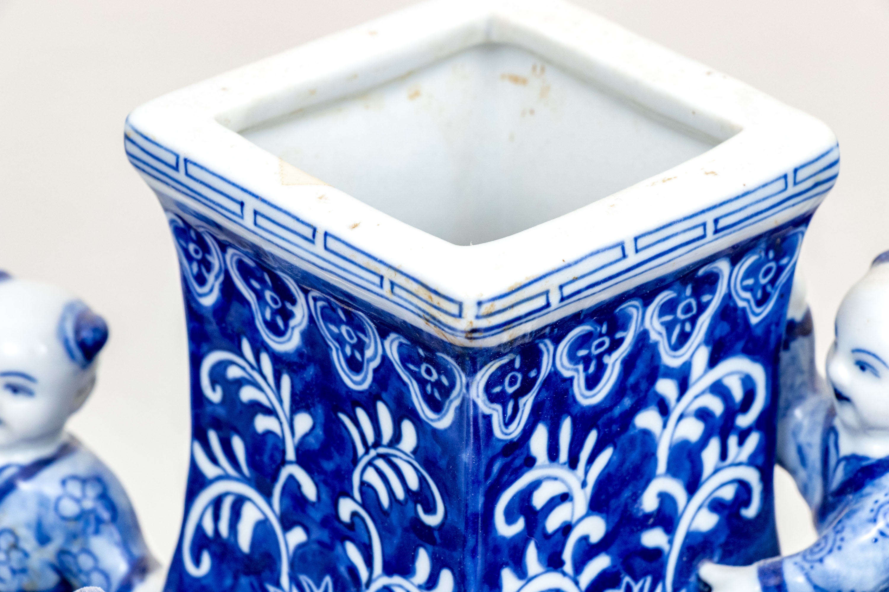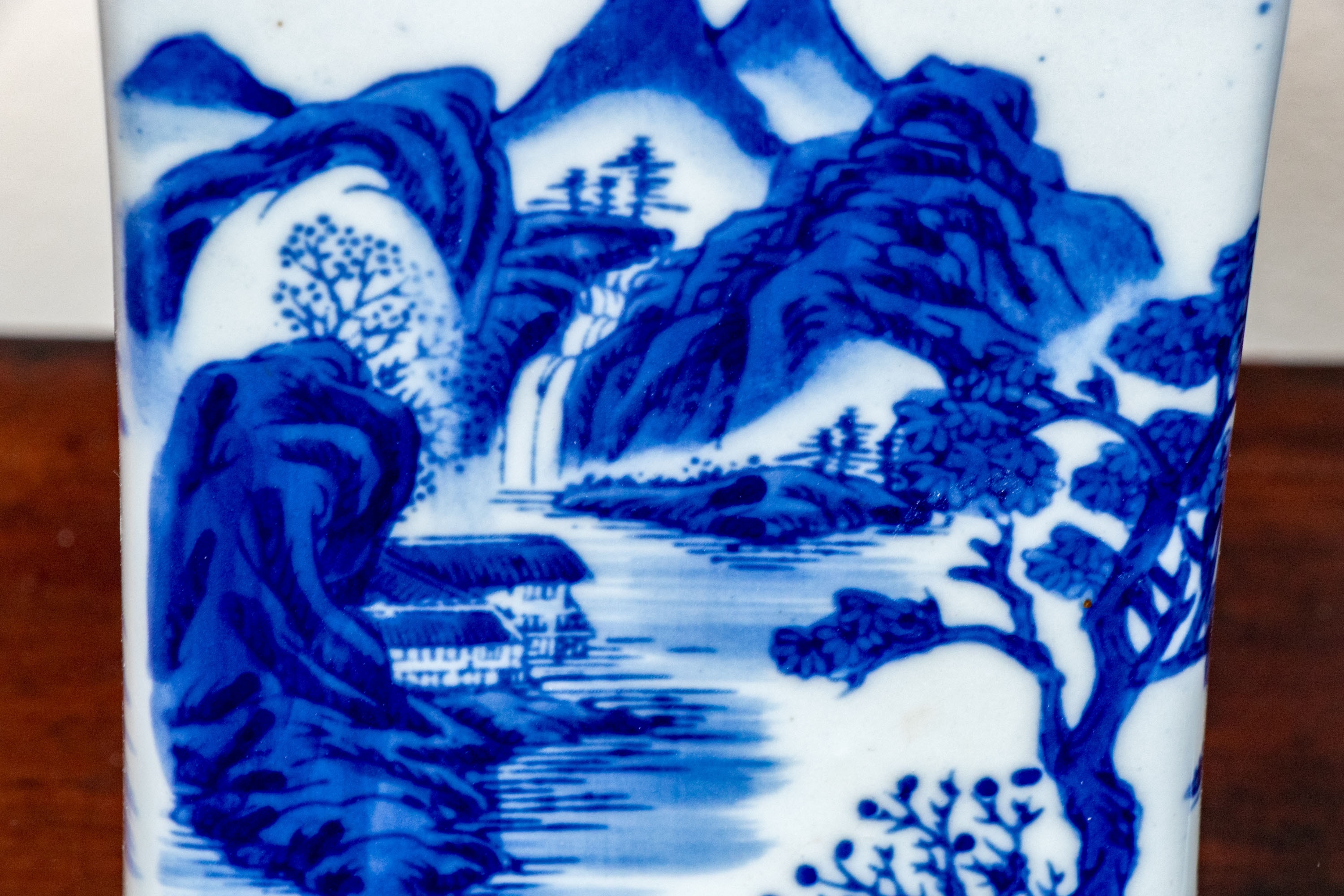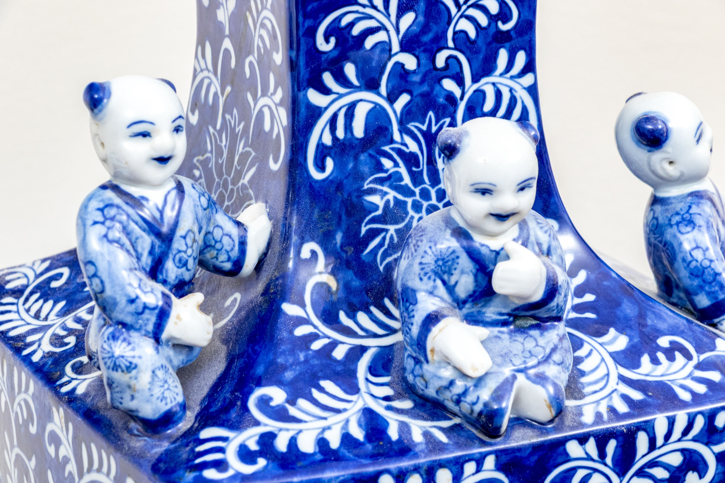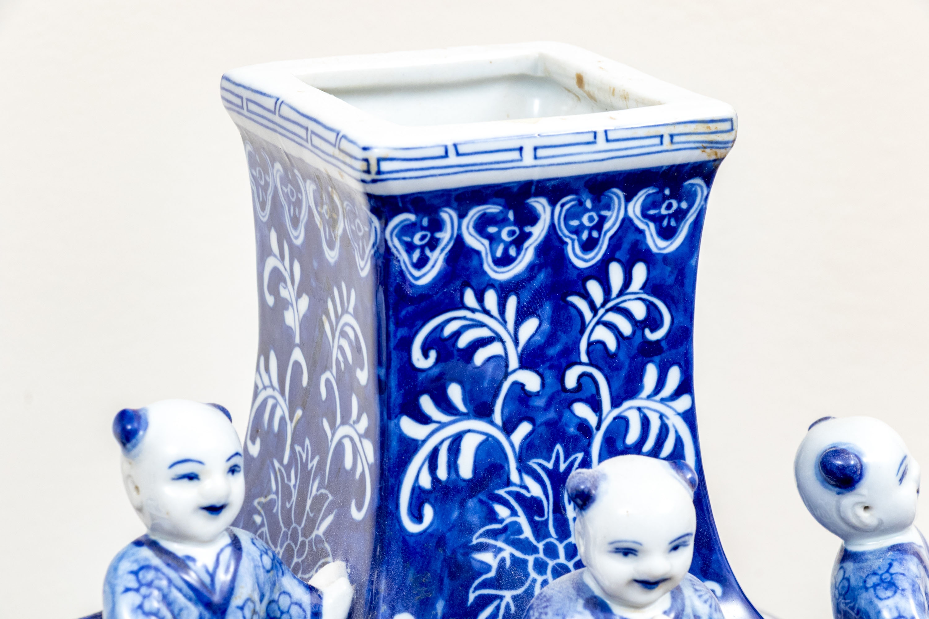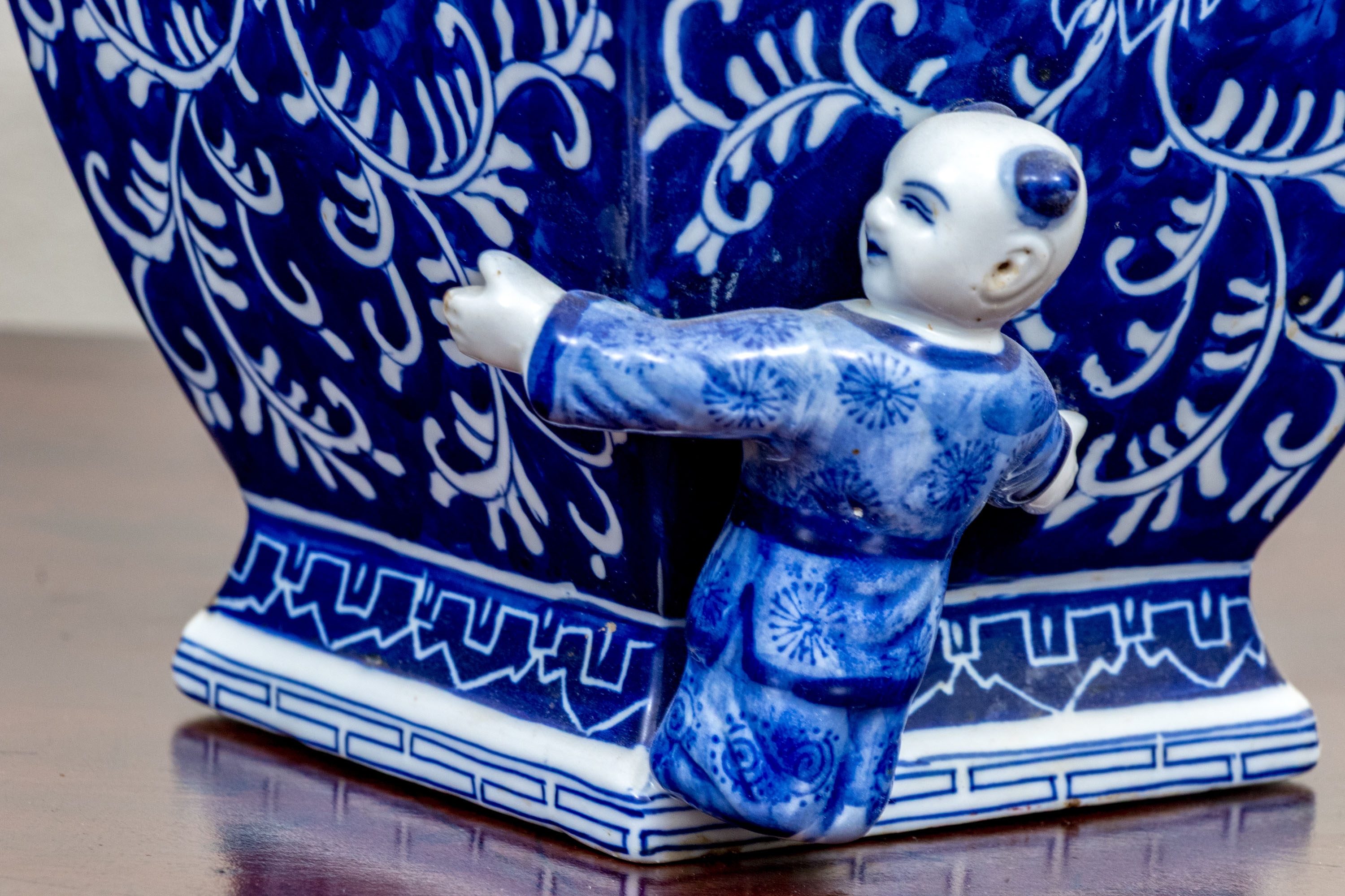 A gorgeous duo of Chinese ceramics including a rectangular pillow or incense cover decorated with a scene of a bridge over a lake with mountains and architecture in the background, and a delightful vase with figural children surrounding a square rim on an urn-shaped body in vibrant cobalt blue with ornate foliate vines.