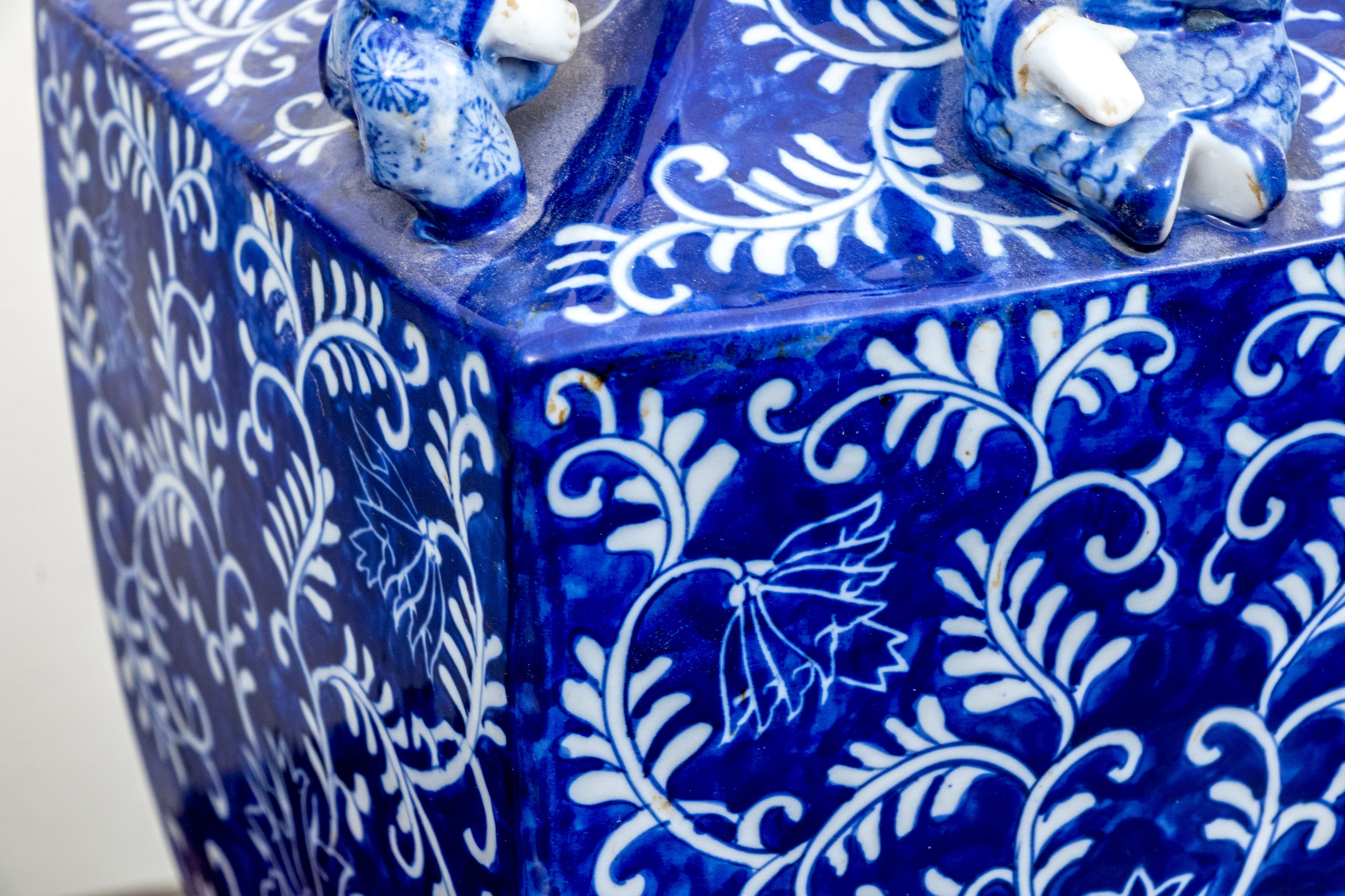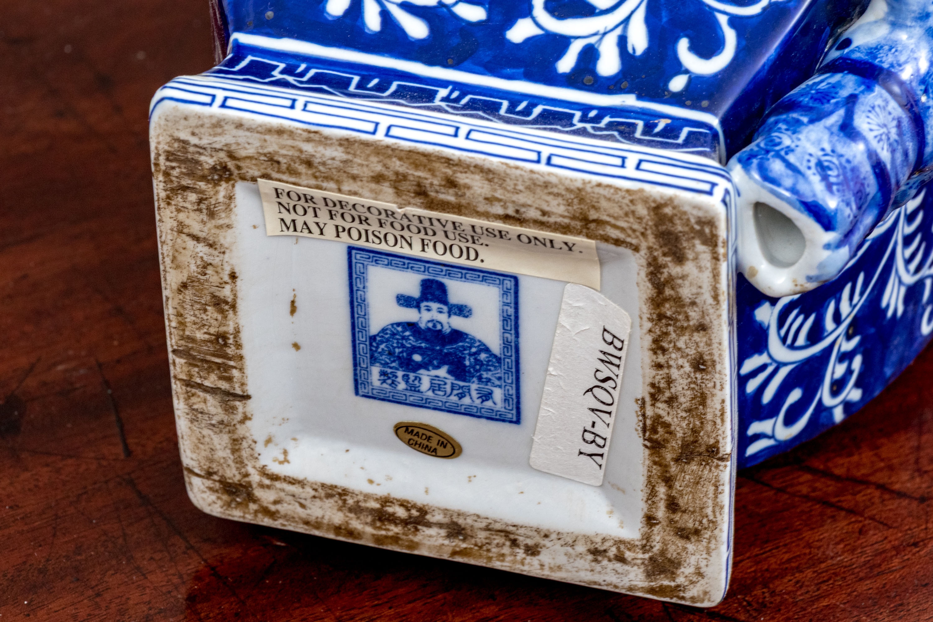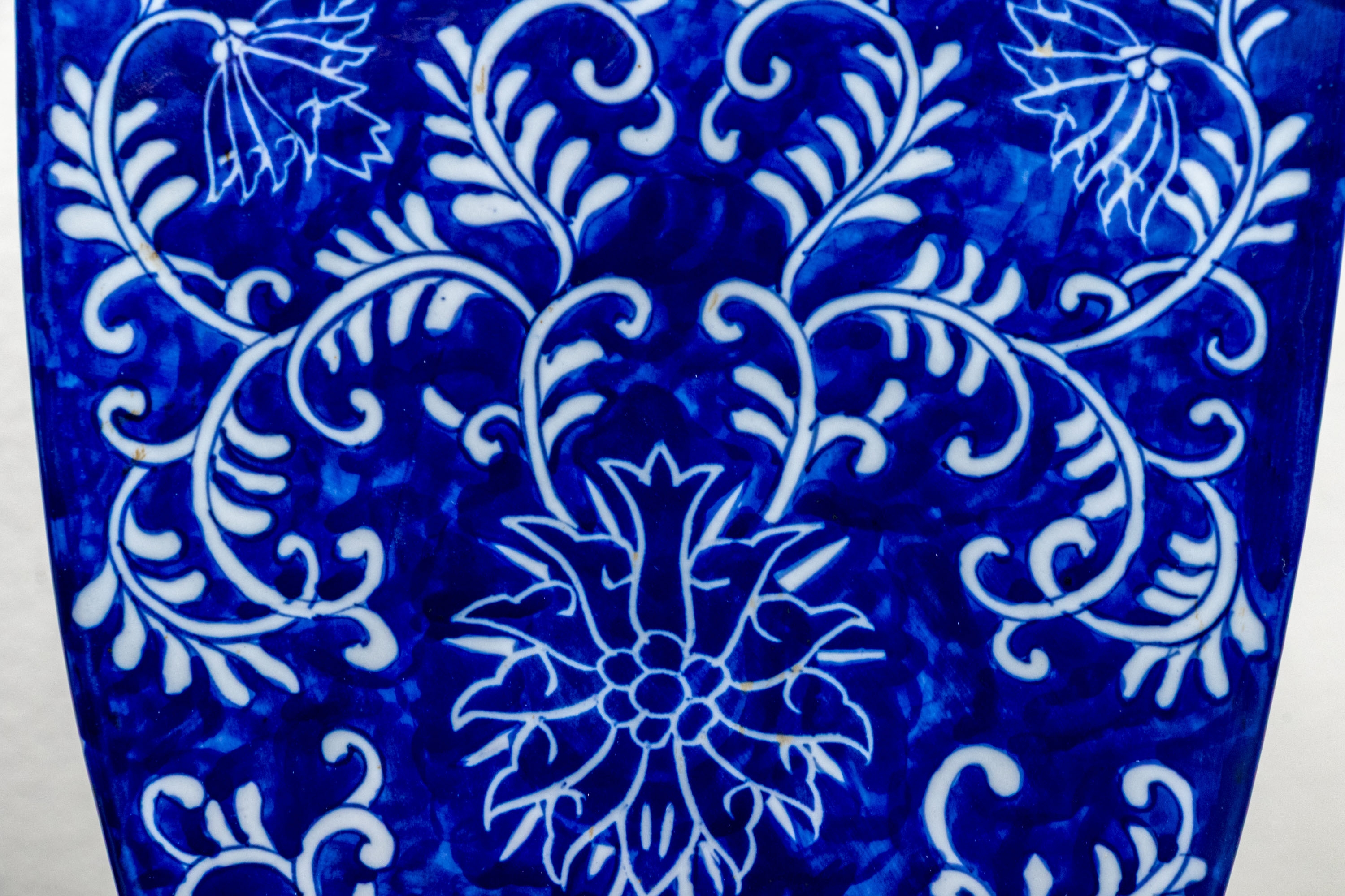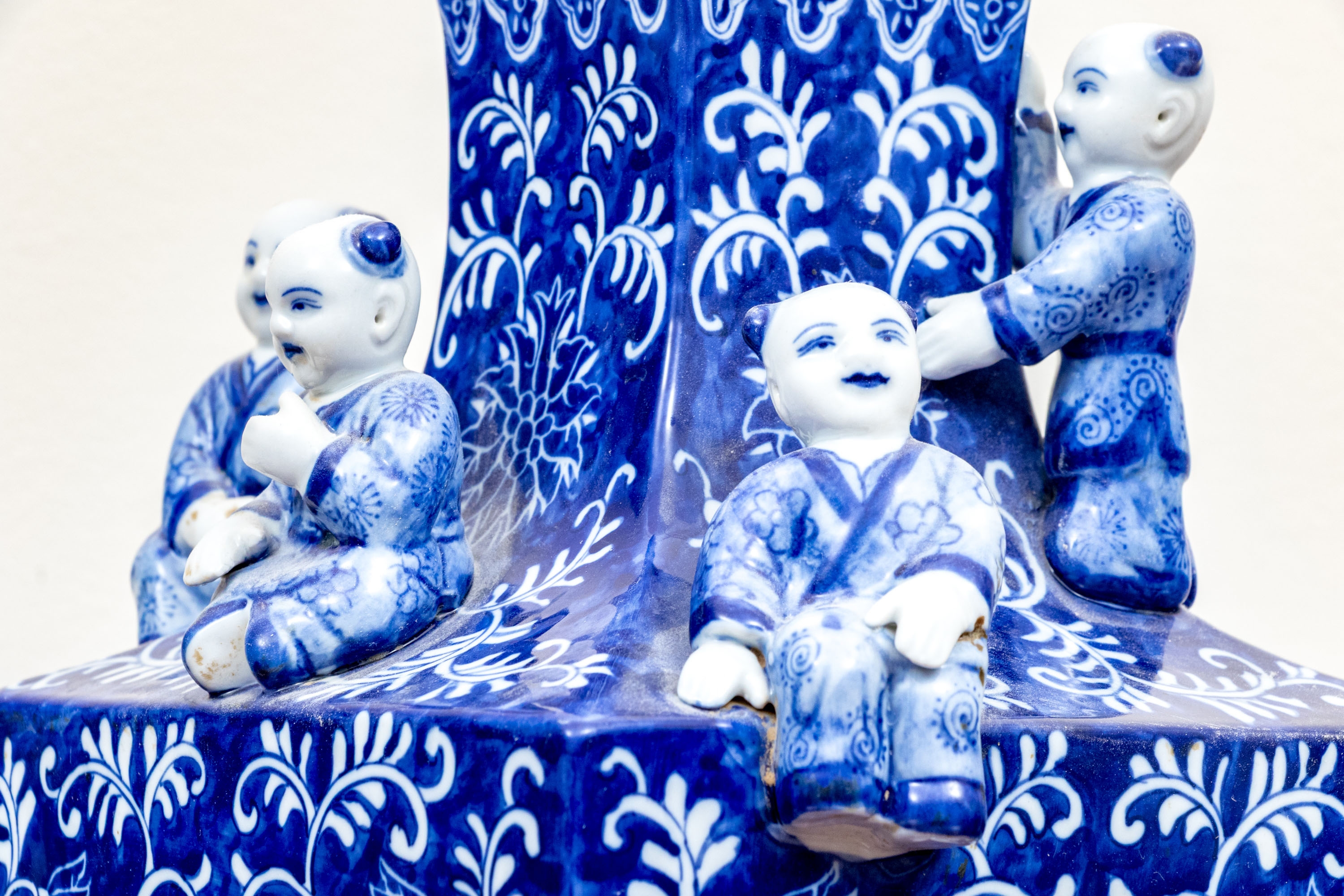A gorgeous duo of Chinese ceramics including a rectangular pillow or incense cover decorated with a scene of a bridge over a lake with mountains and architecture in the background, and a delightful vase with figural children surrounding a square rim on an urn-shaped body in vibrant cobalt blue with ornate foliate vines.