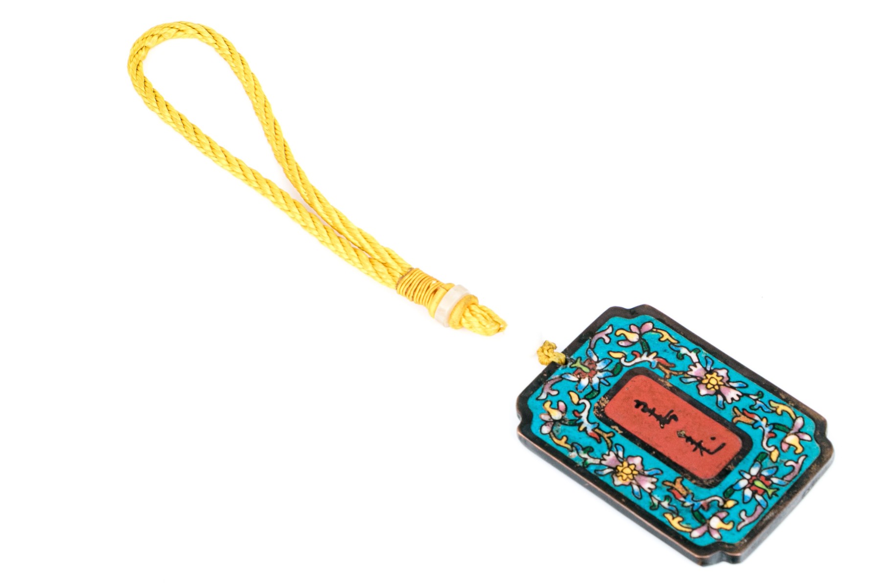 Shaped rectangular with cut corners, the plaque is threaded with a yellow rope with beads.
