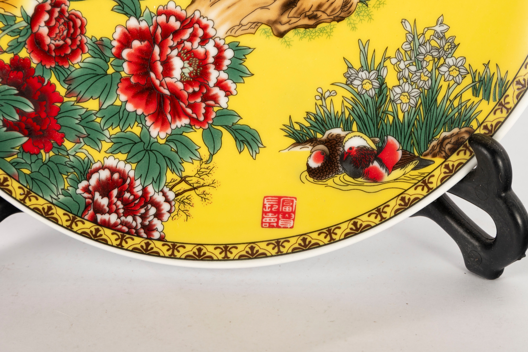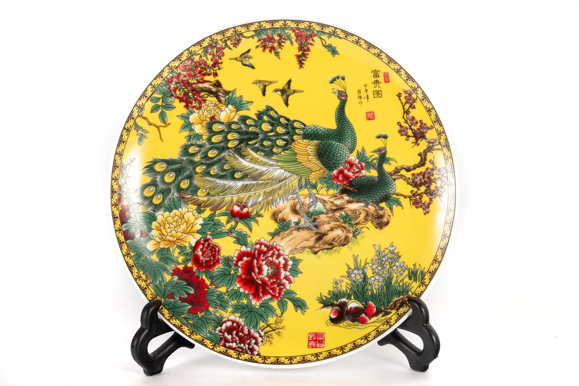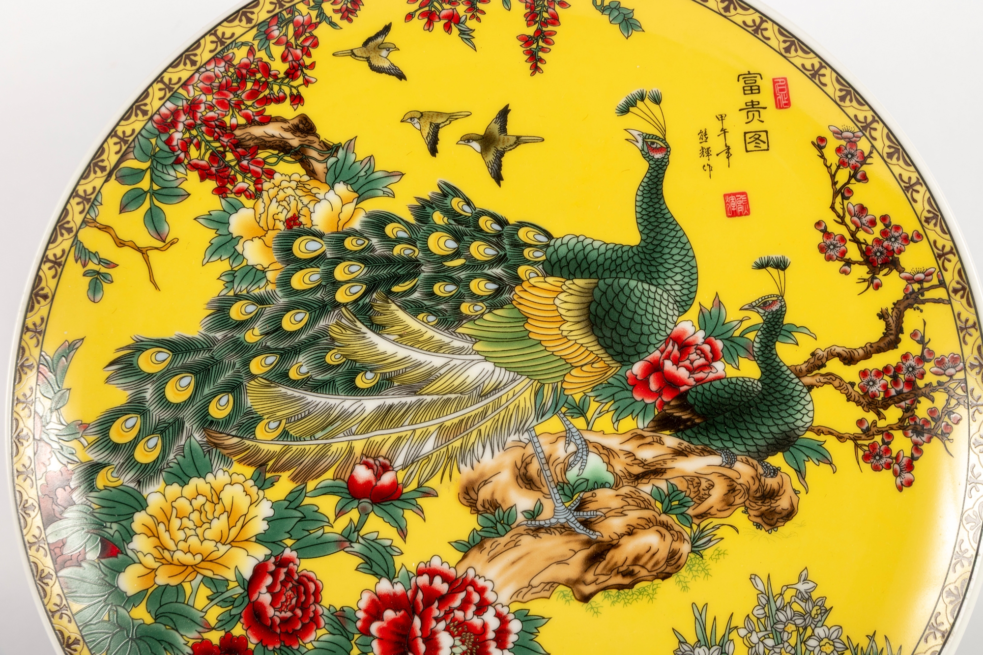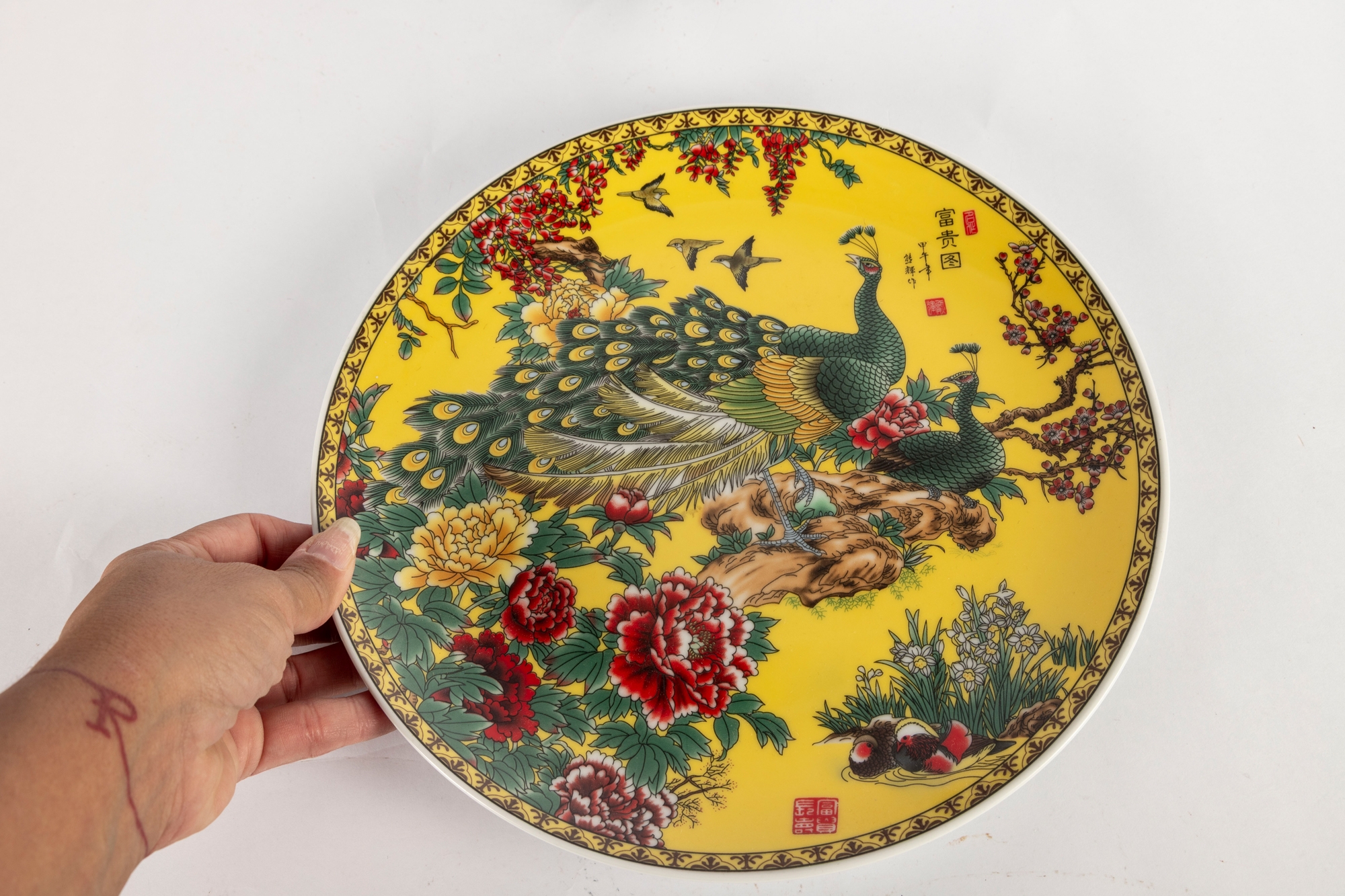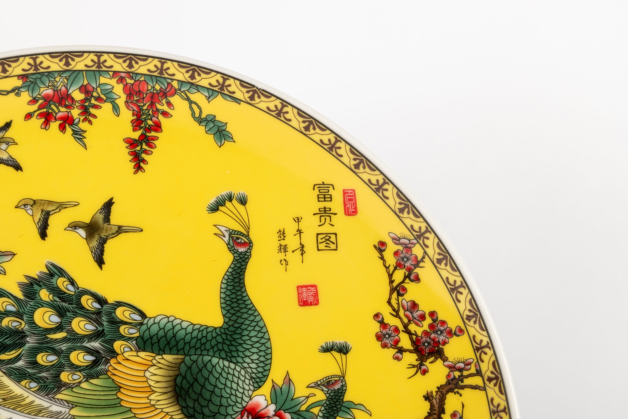 A vibrant Chinese decorative porcelain plate featuring an elegant peacock amid blooming florals, symbolizing beauty and prosperity. The richly colored design showcases fine enamel detailing in shades of red and green against a contrasting yellow background.