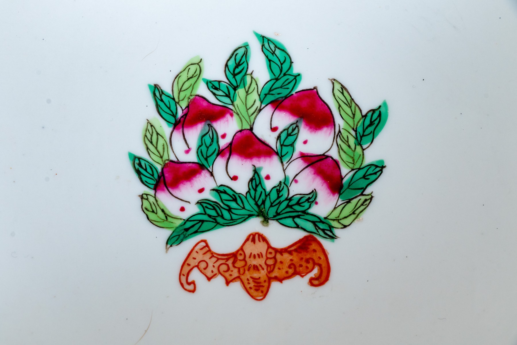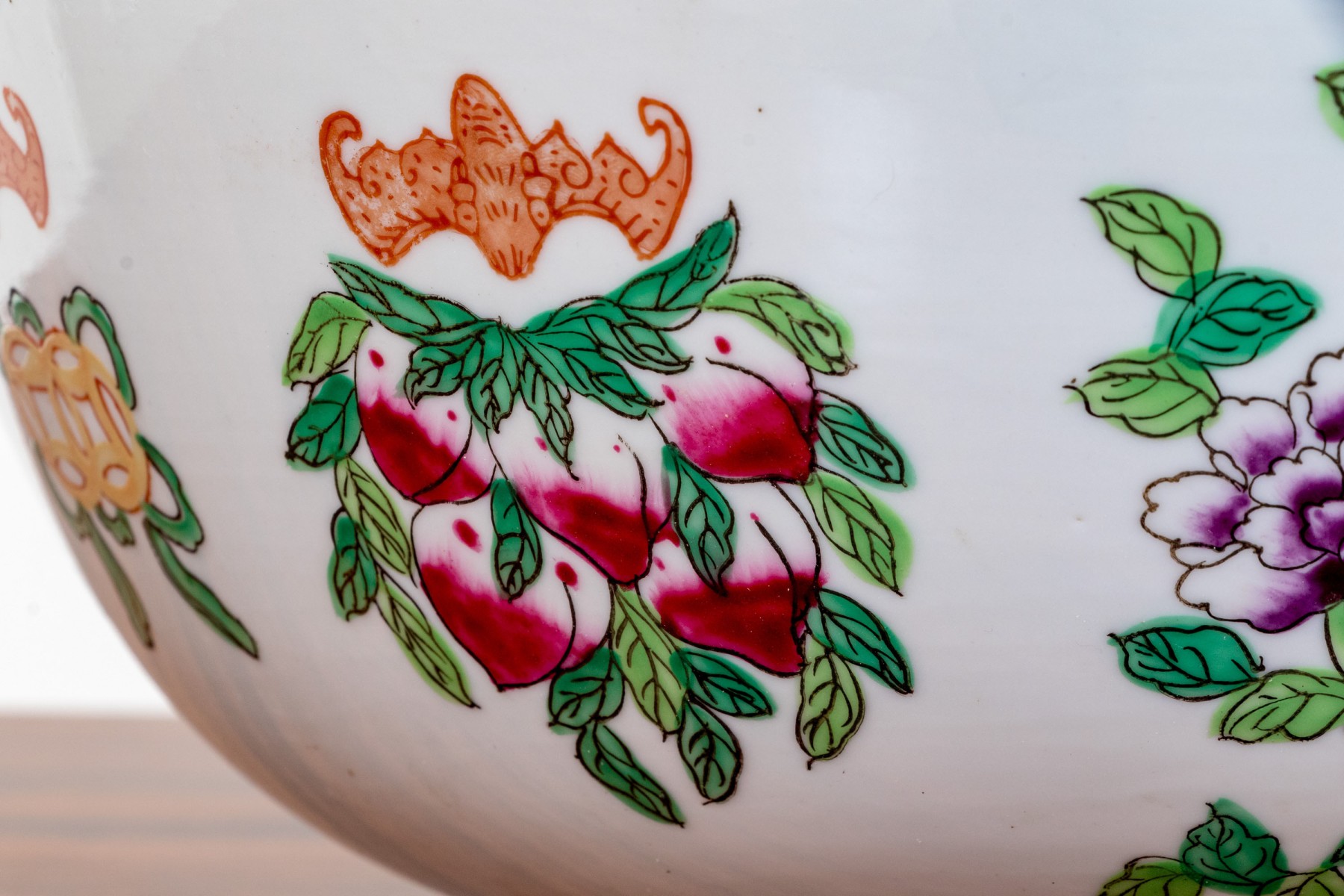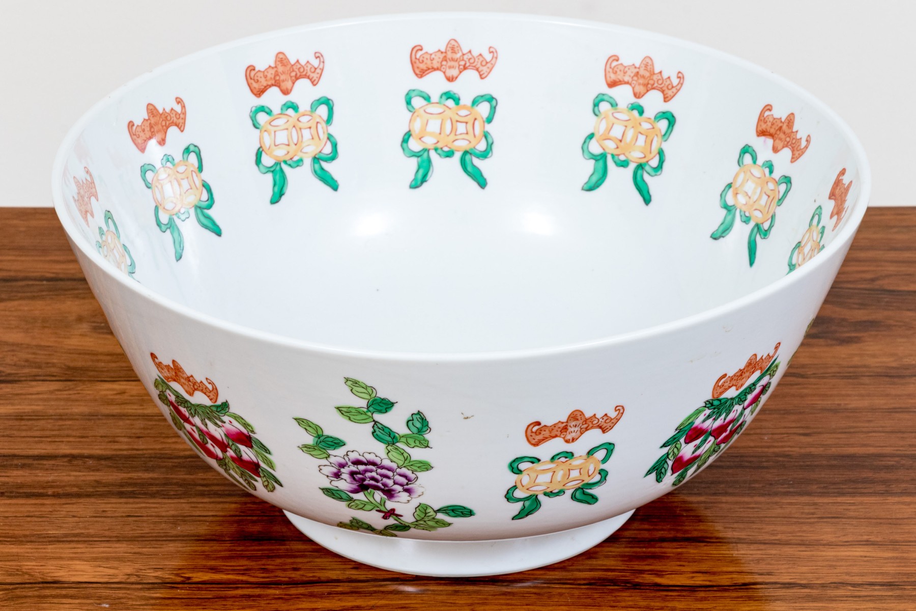 Adorned with a delightful peaches and bats motif, along with cash coin and endless knot motifs, this Chinese famille rose porcelain bowl symbolizes prosperity and good fortune.