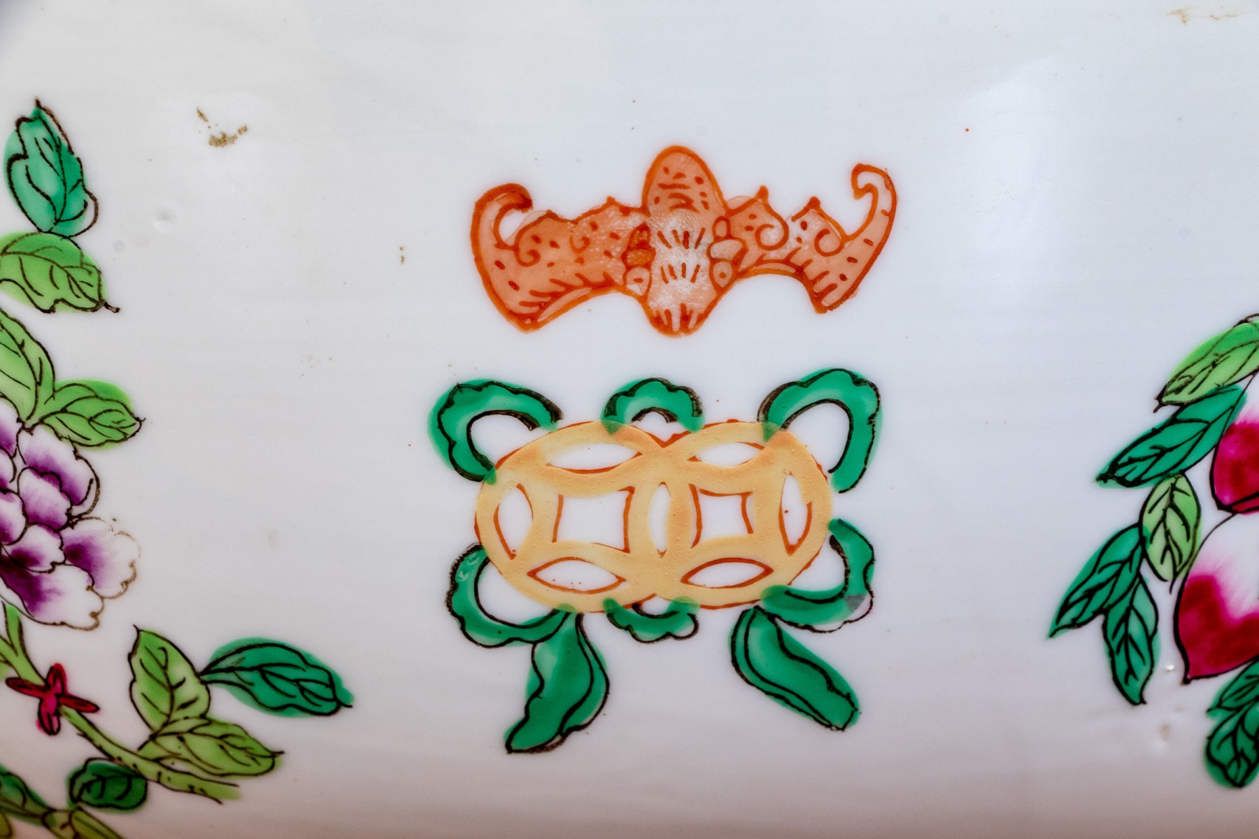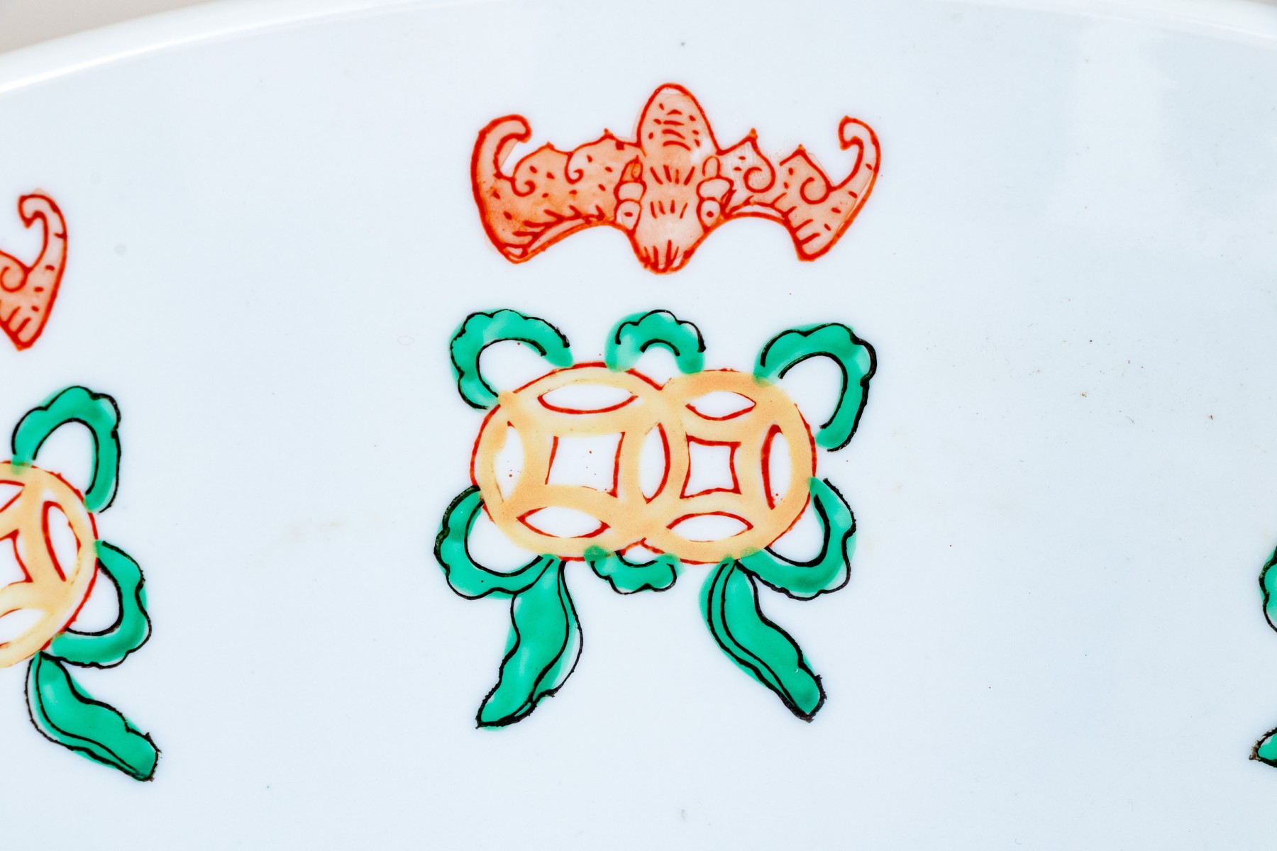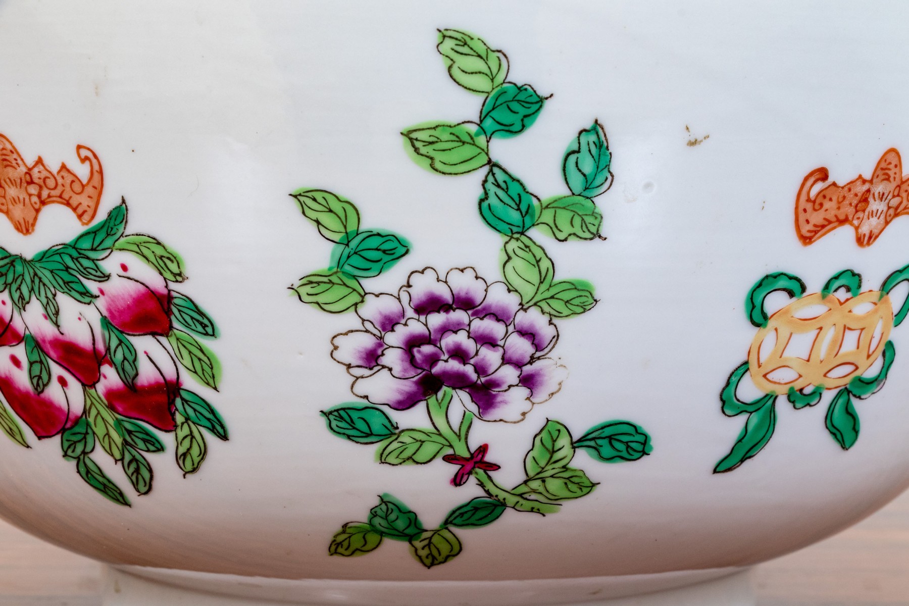 Adorned with a delightful peaches and bats motif, along with cash coin and endless knot motifs, this Chinese famille rose porcelain bowl symbolizes prosperity and good fortune.