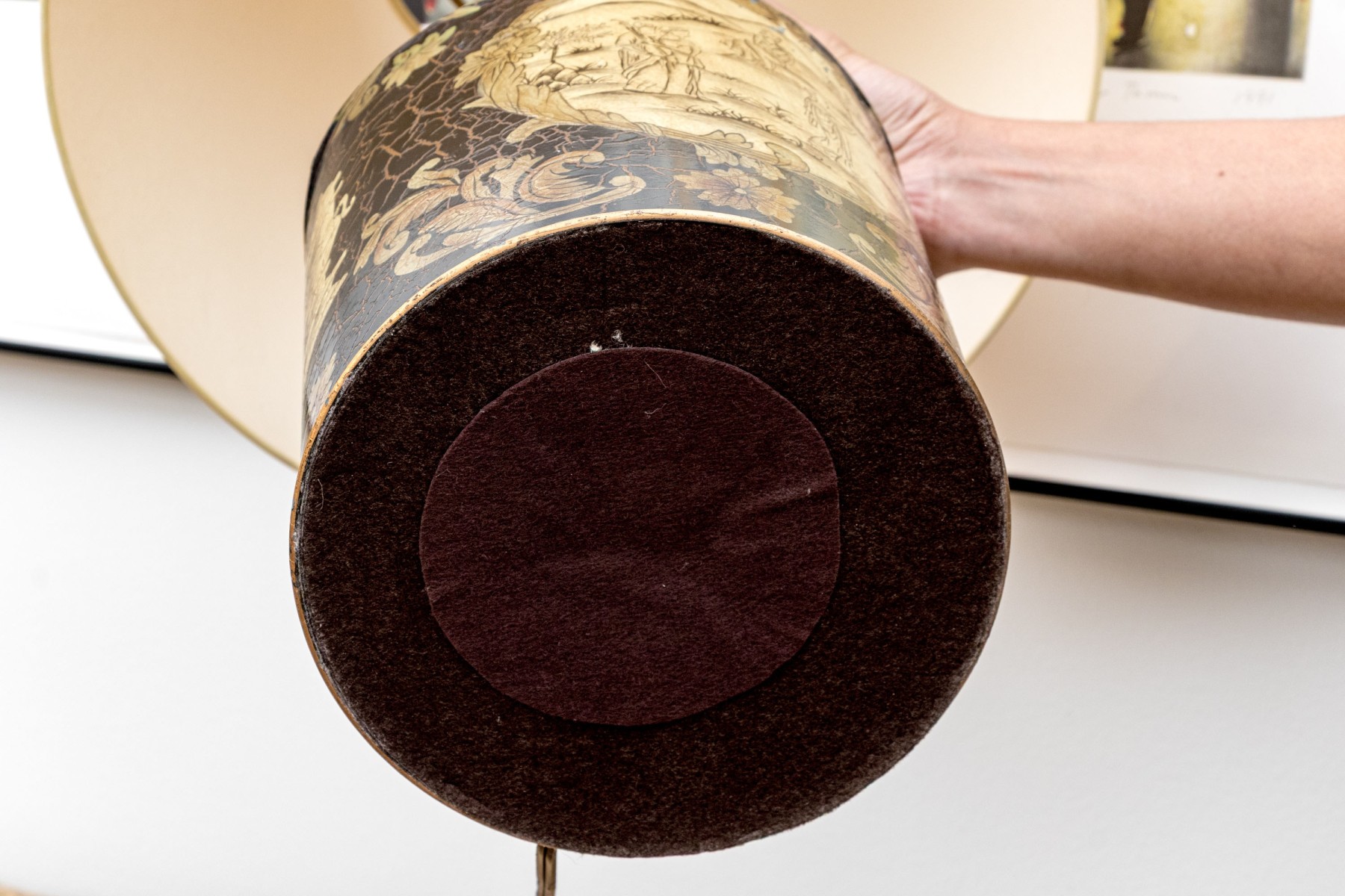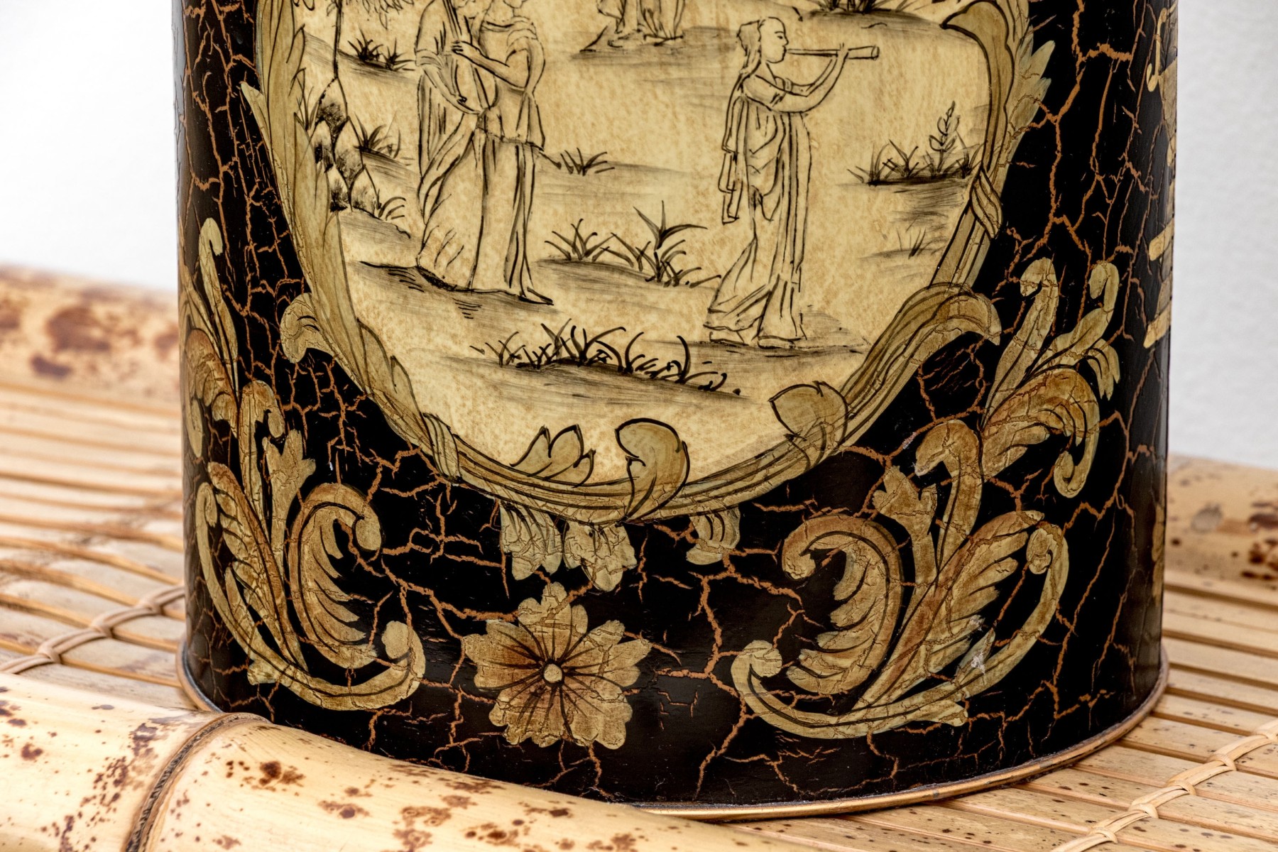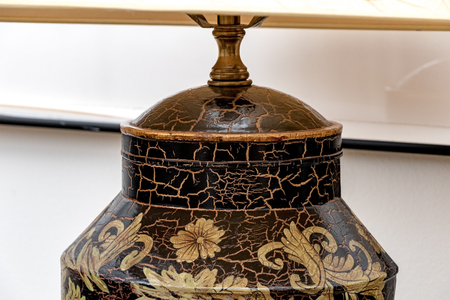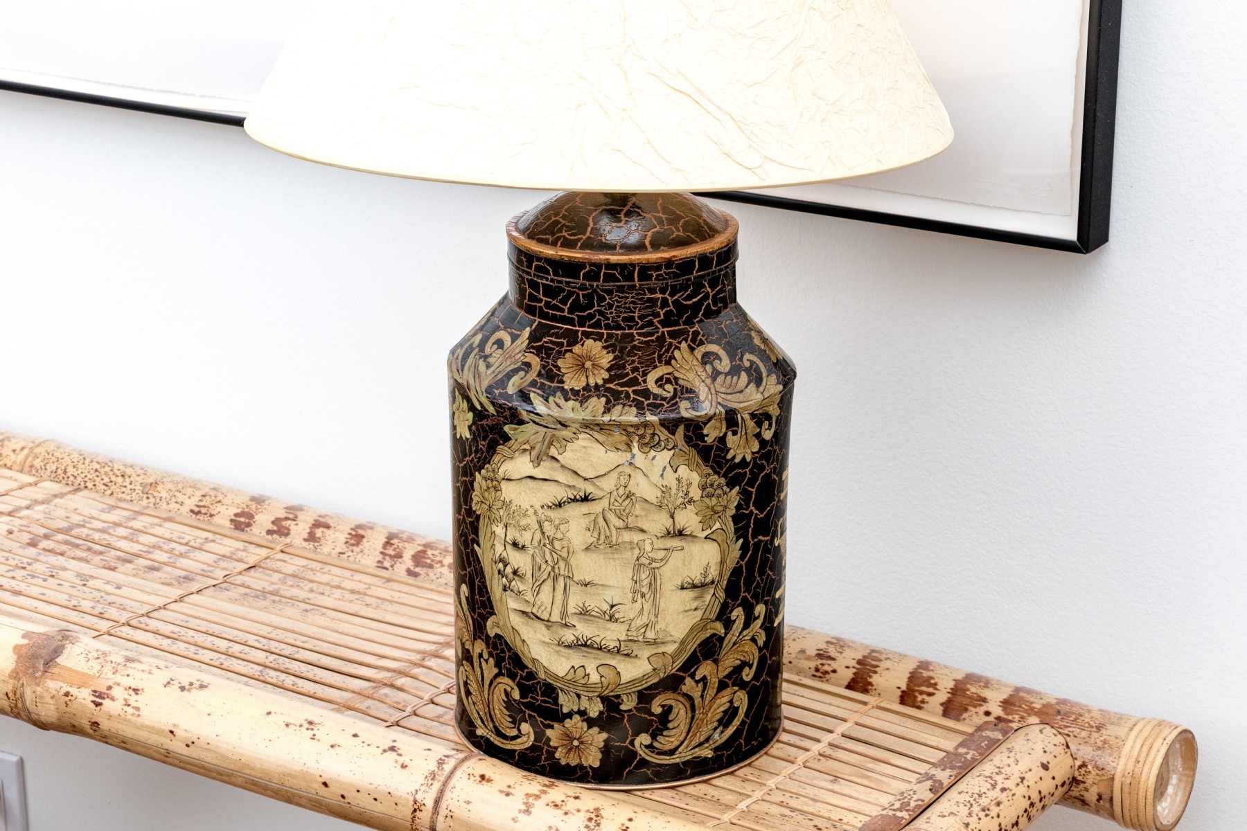 A fantastic chinoiserie table lamp in the form of a tea caddy with a black crackle tole finish, painted with a medallion center depicting figures in a natural landscape surrounded by beige flowers and foliate flourishes. Surmounted with a beige textural empire shade.