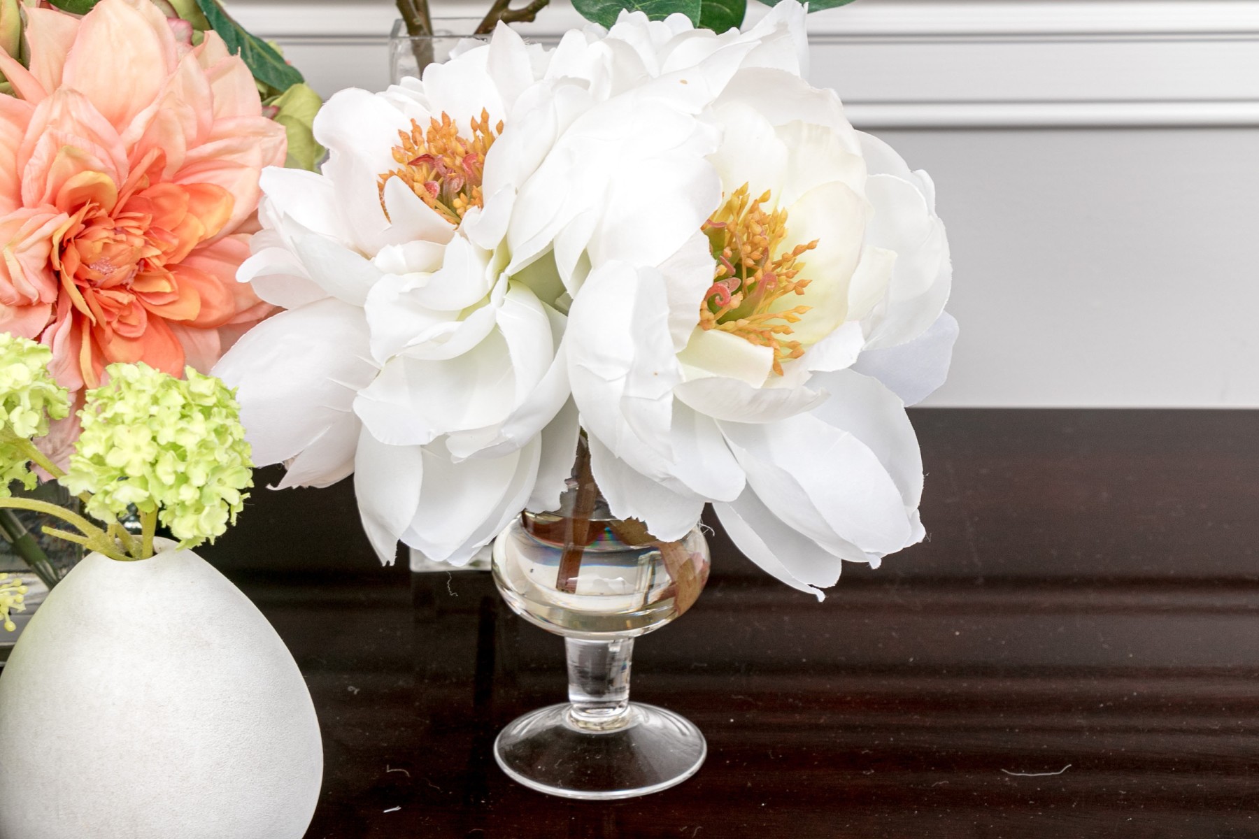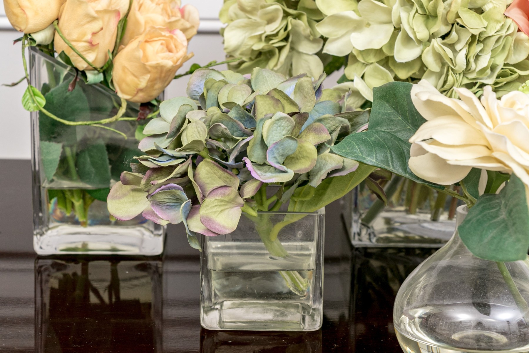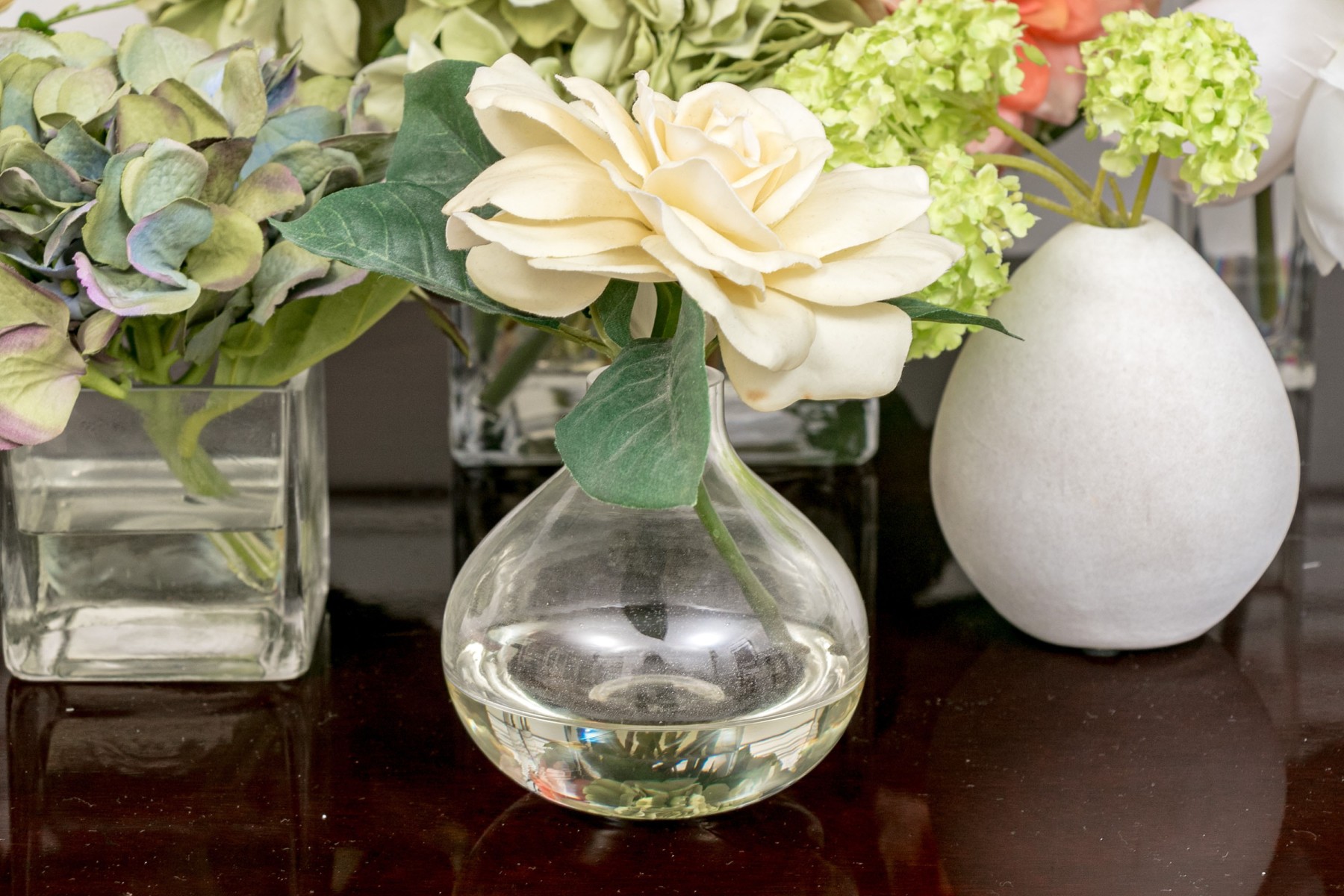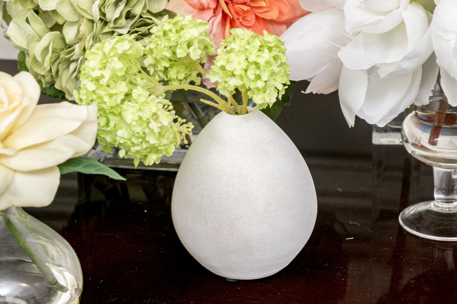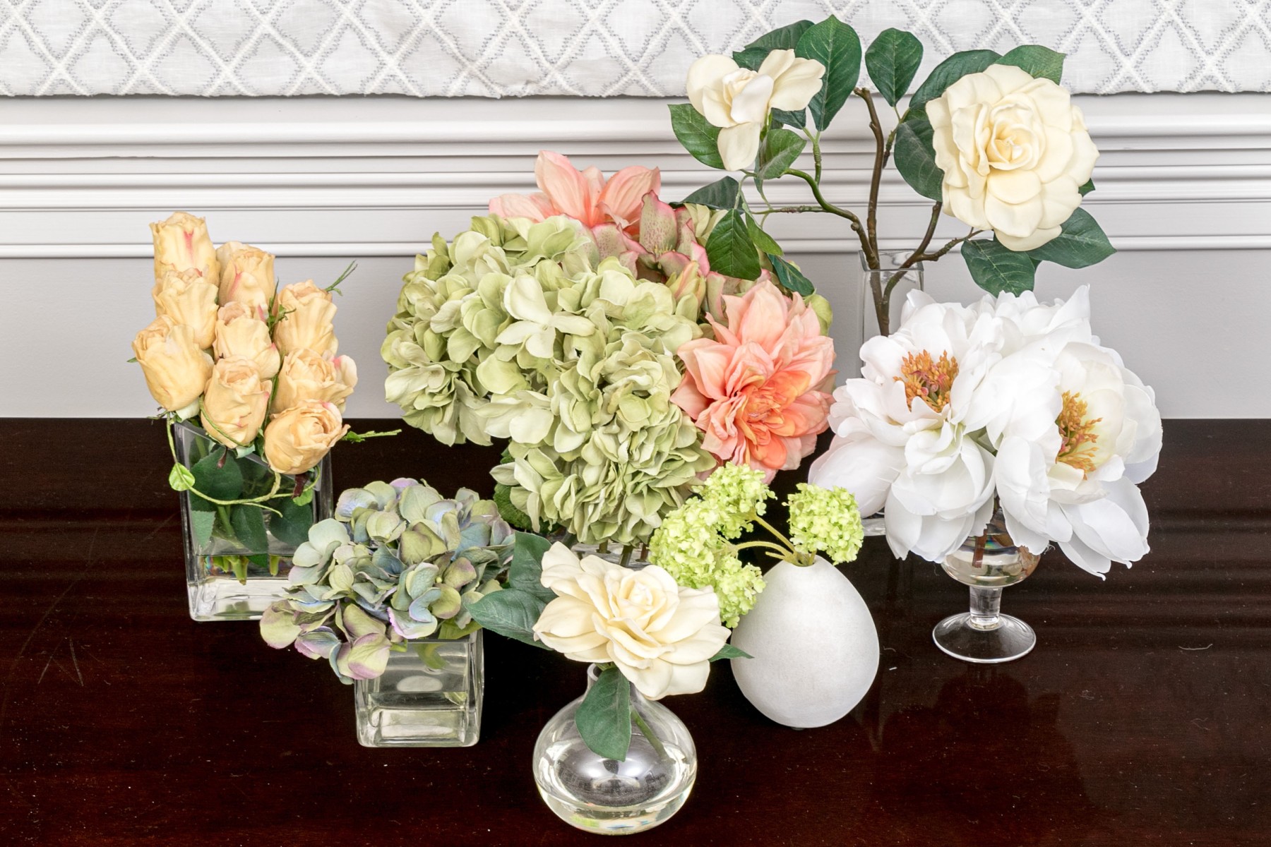 A lovely collection of 7 vases in mixed media including glass and ceramic. Each of differing form and style with faux flowers for a pop of color wherever you see fit.