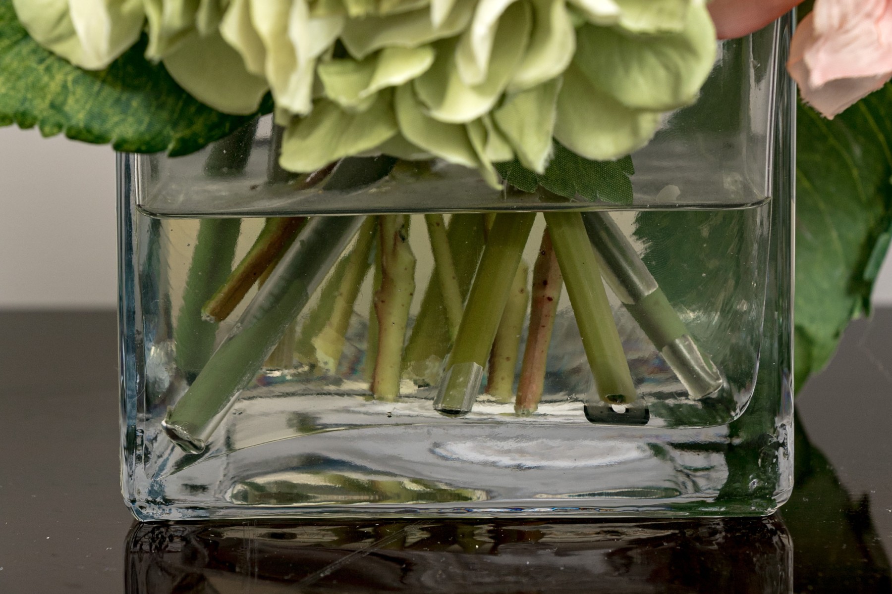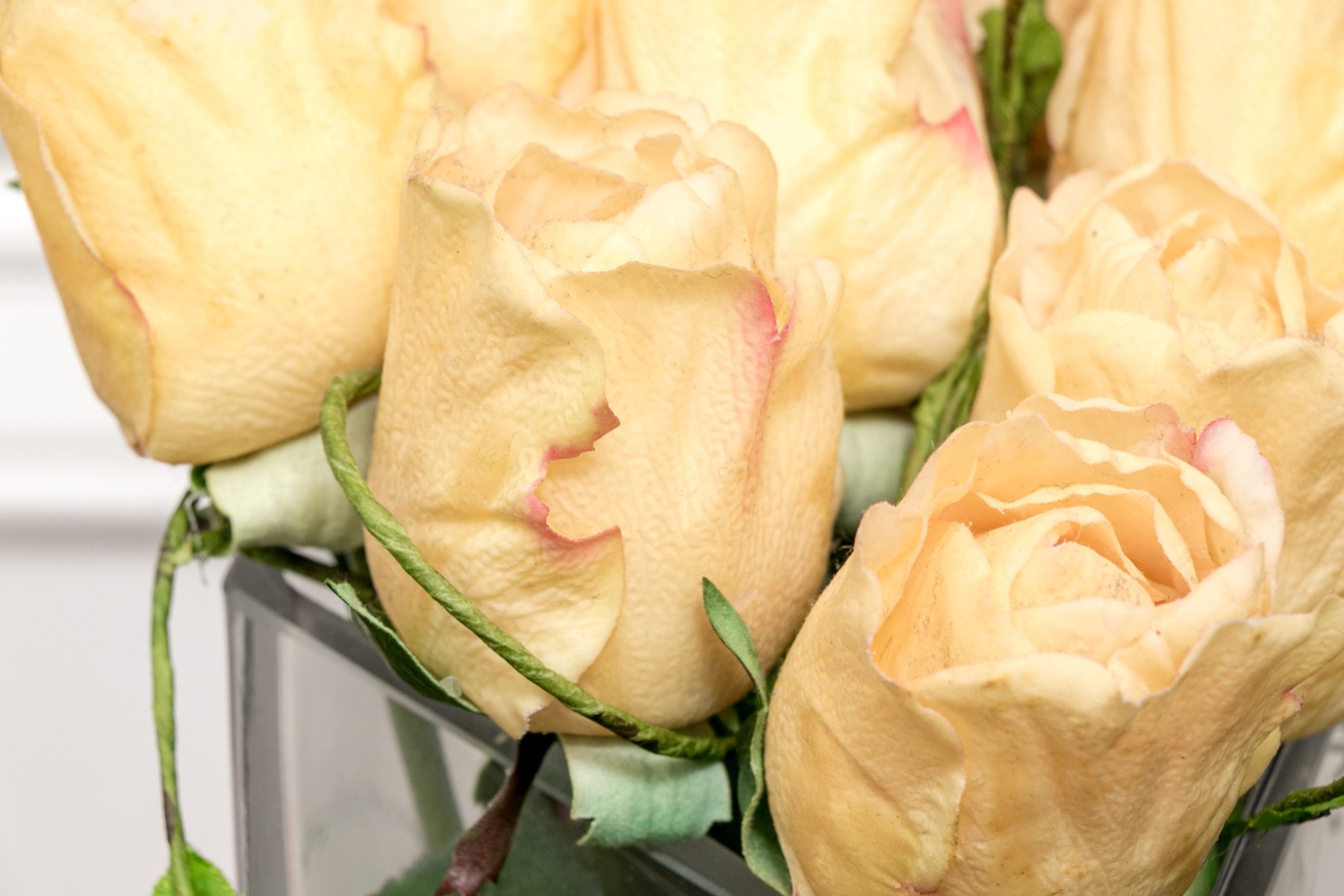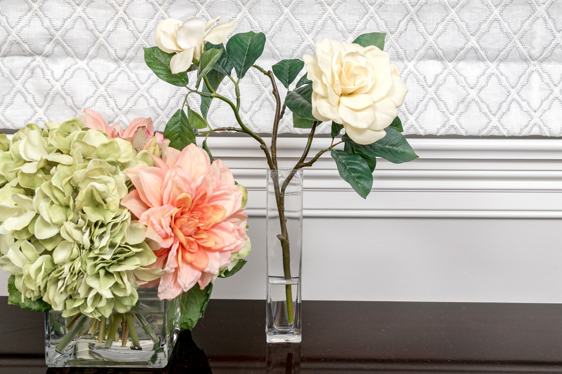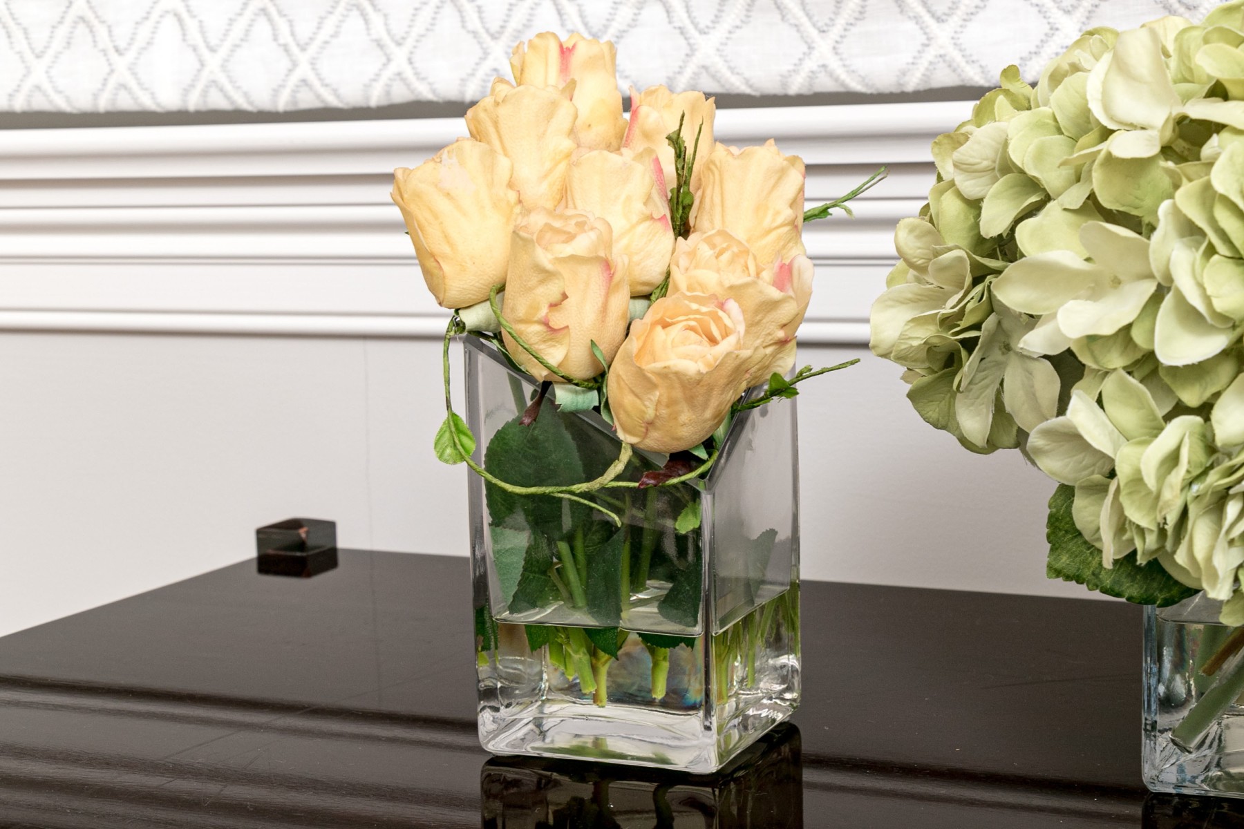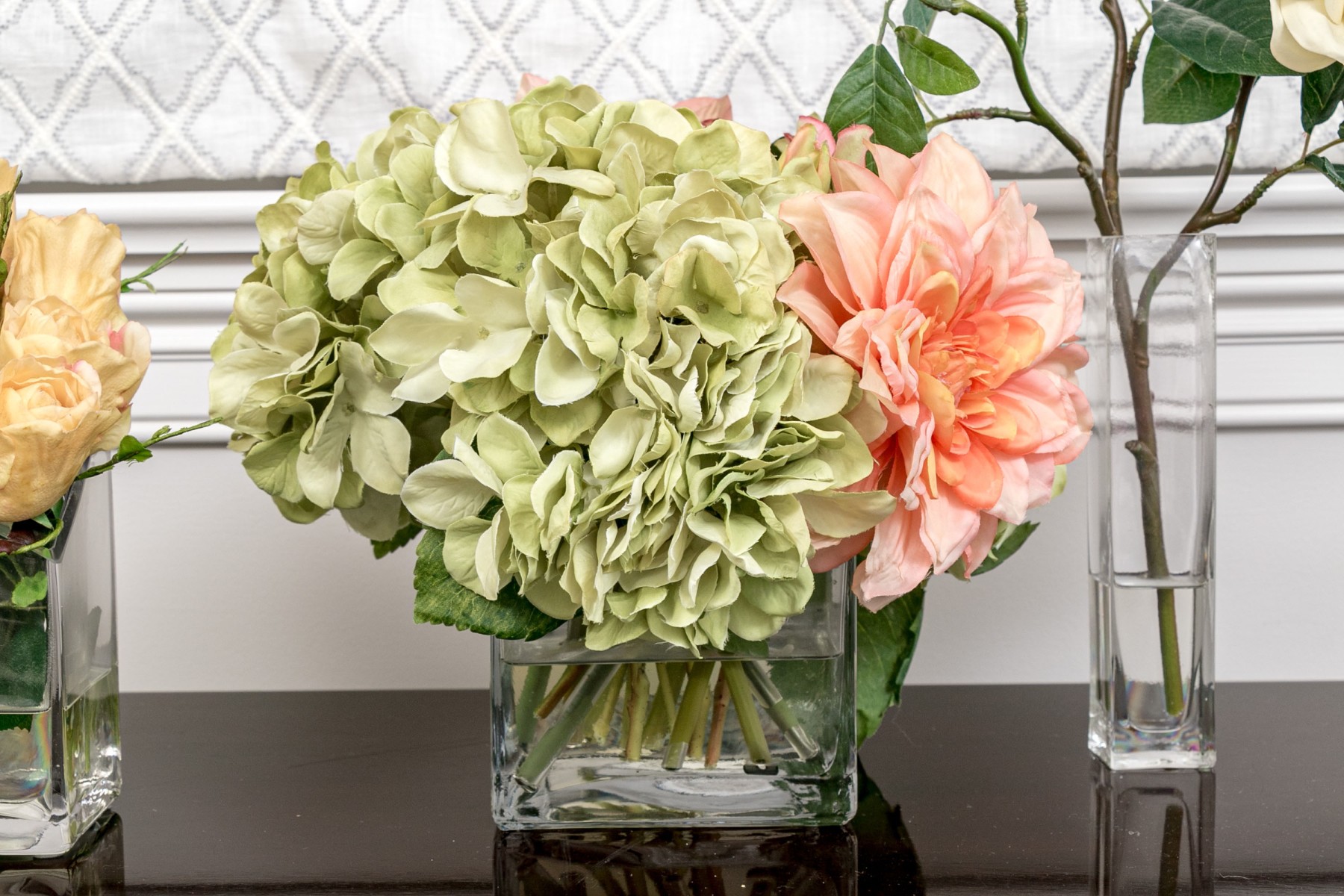 A lovely collection of 7 vases in mixed media including glass and ceramic. Each of differing form and style with faux flowers for a pop of color wherever you see fit.
