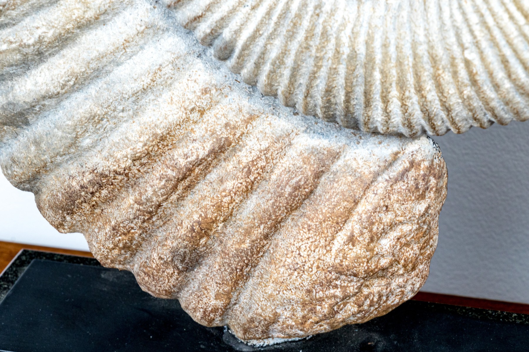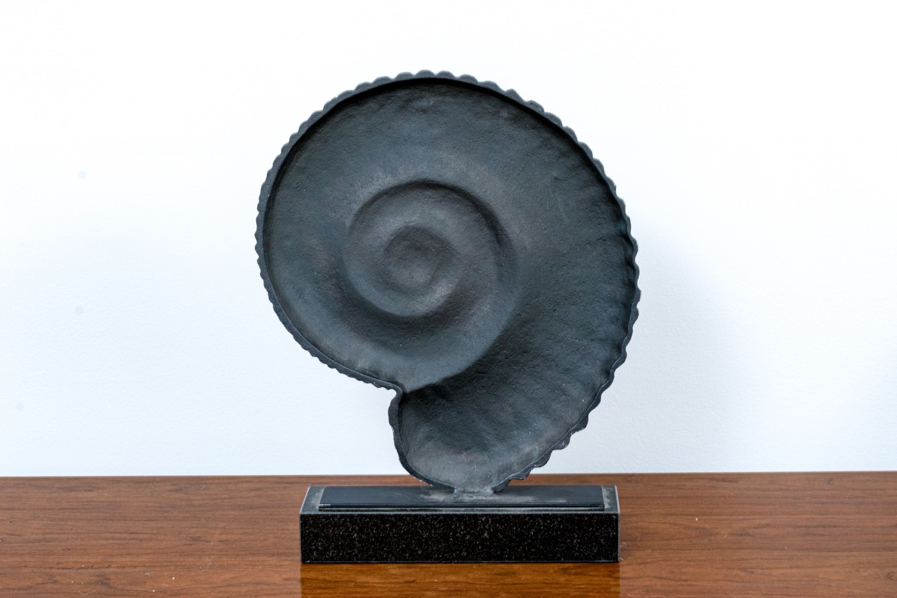 - A cast metal ammonite mounted on black base,