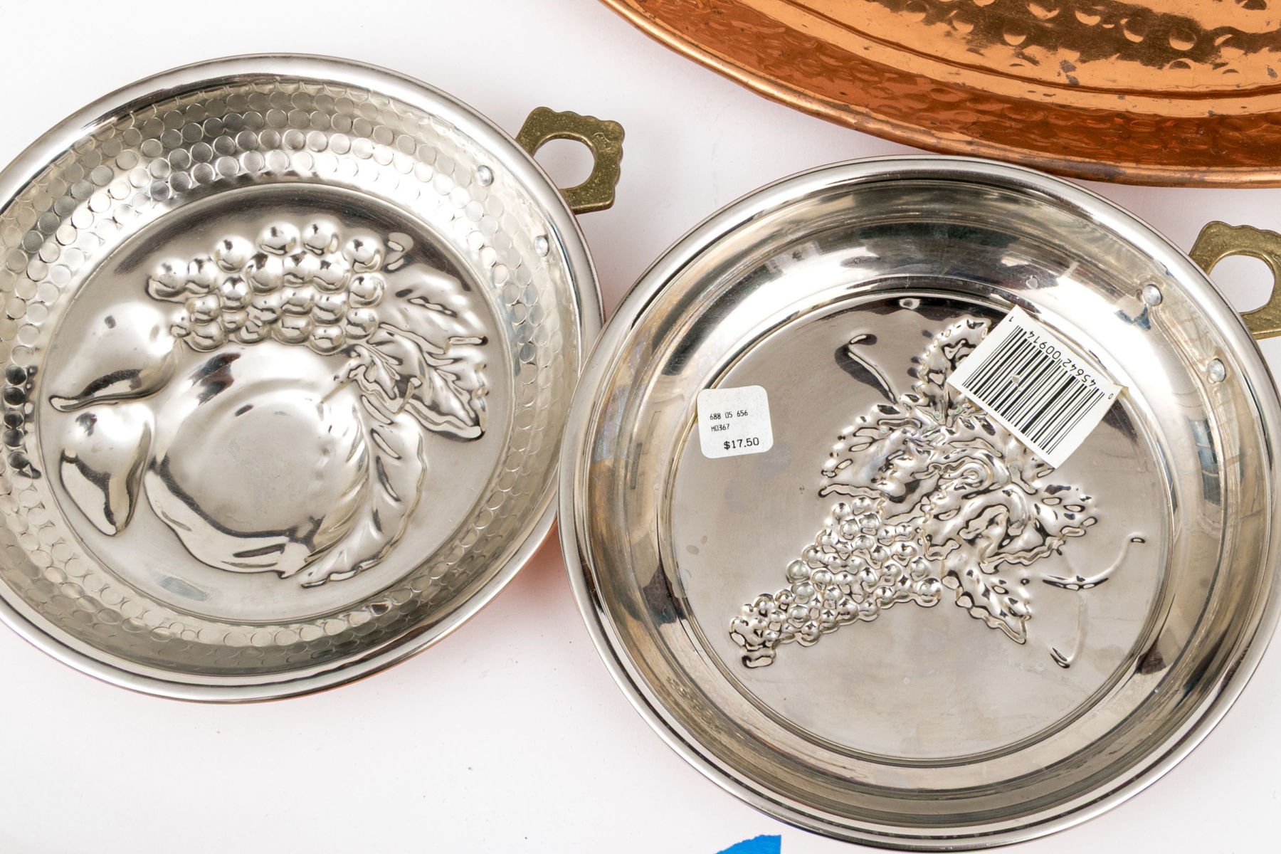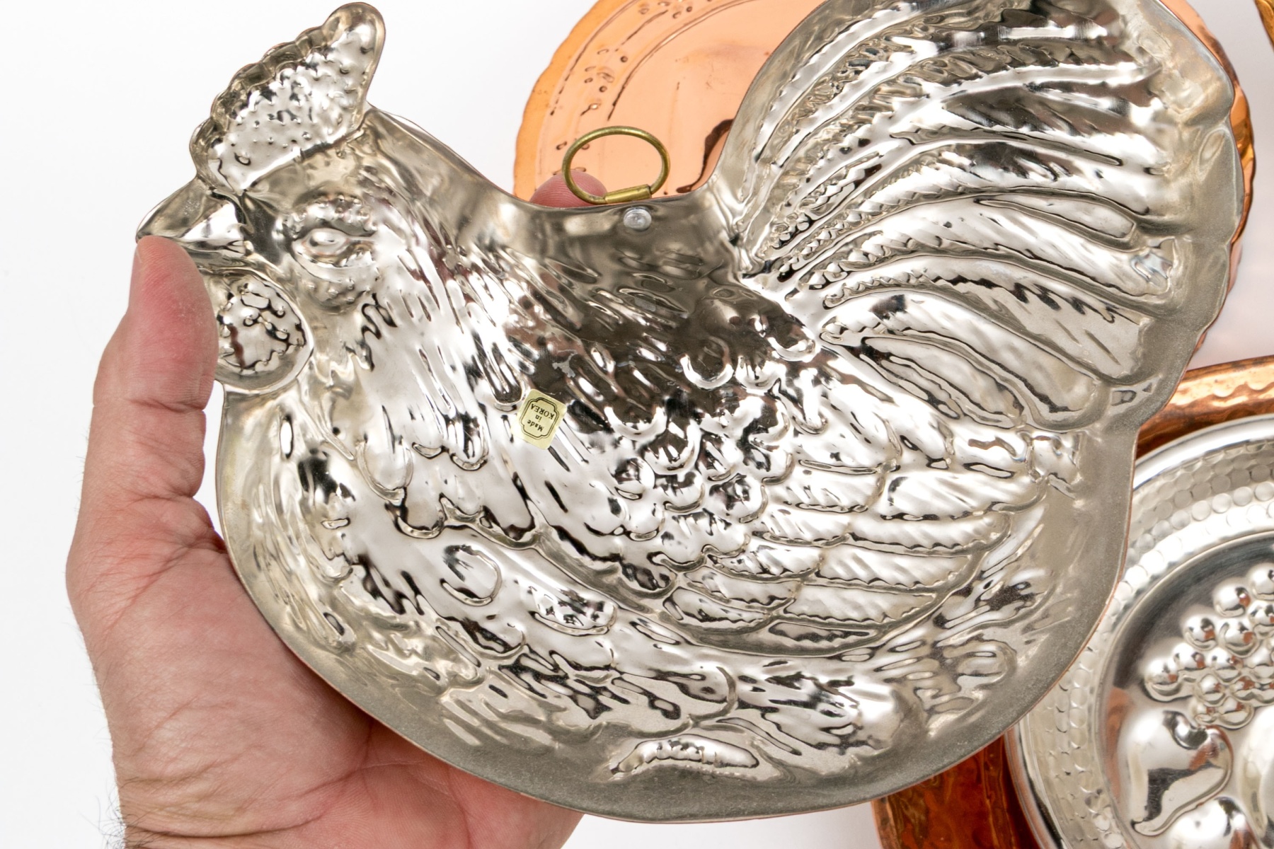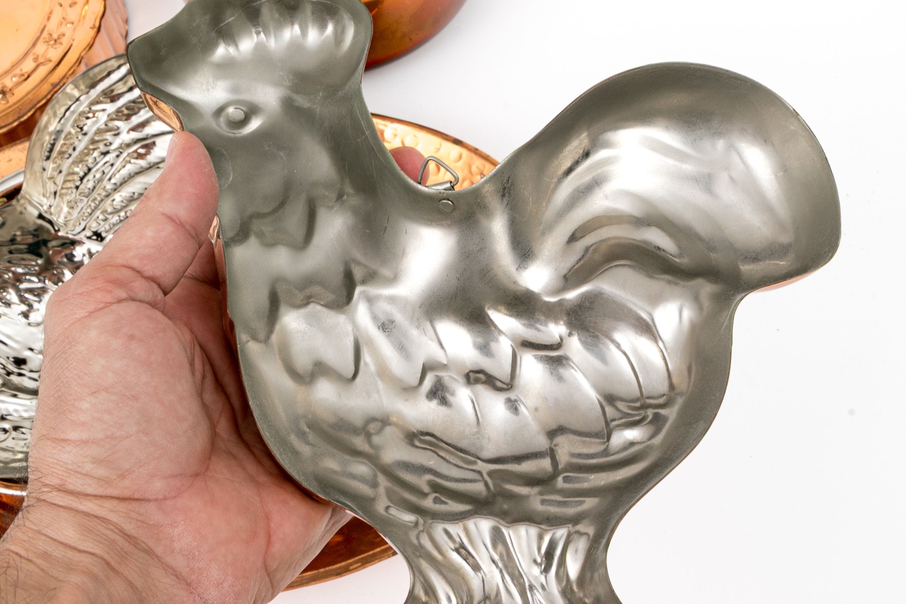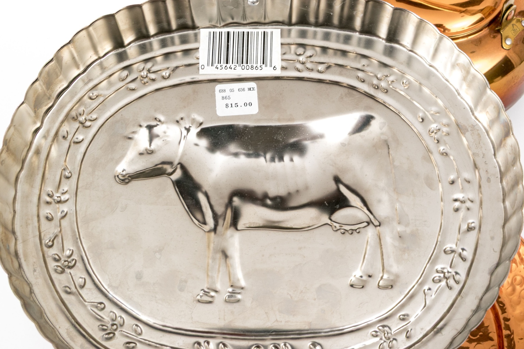 A wonderful decorative collection of copper finished kitchenware including moulds with chicken, cow, and fruit motifs; an oval serving tray; and a kettle.