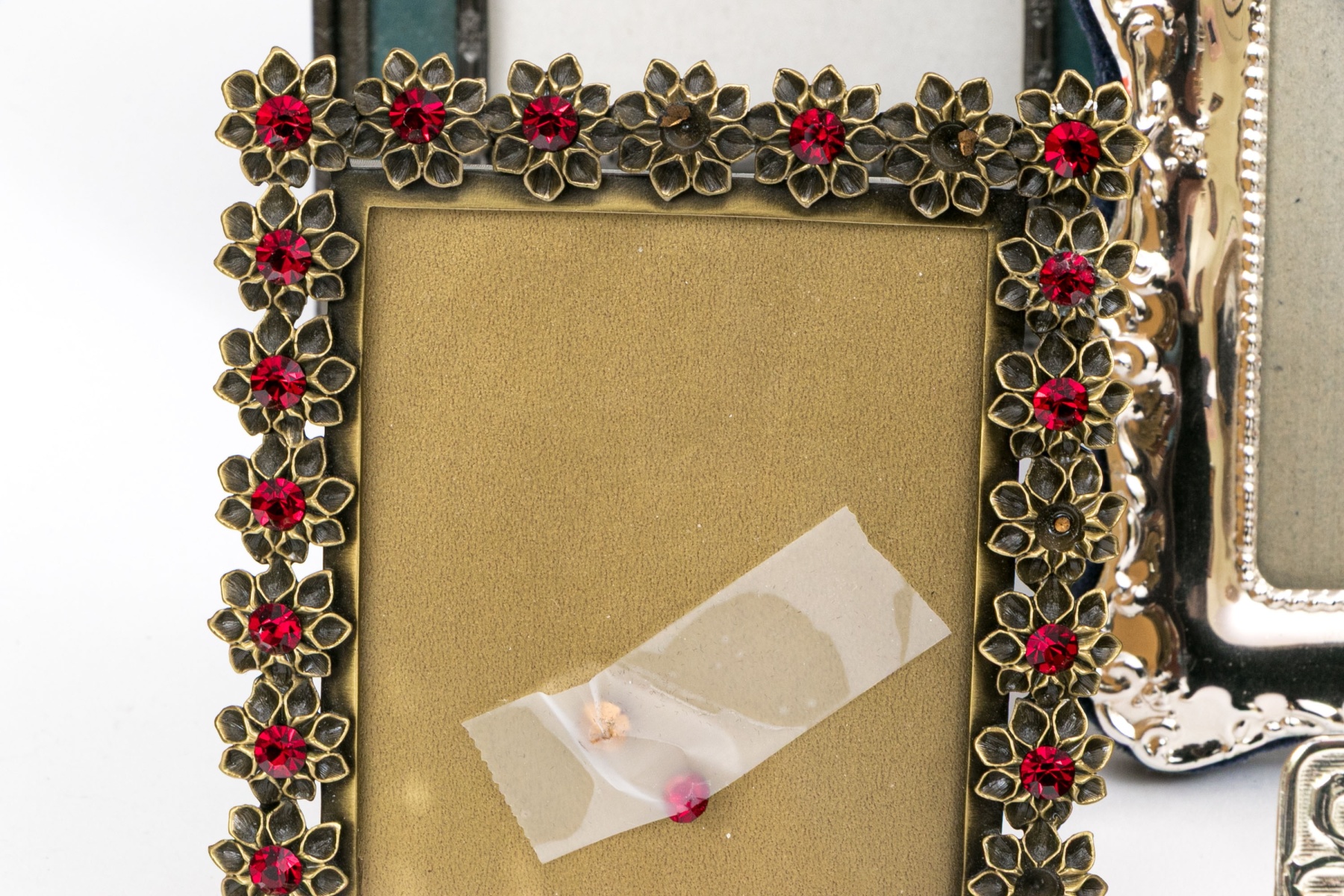 Good overall. The frame with faux rubies is missing two stones but overall a great lot.
