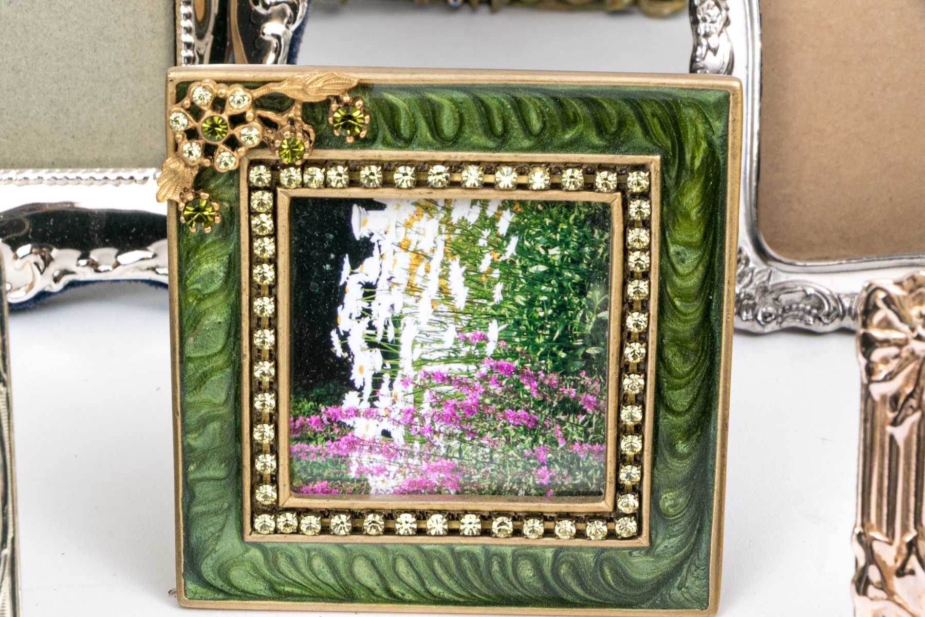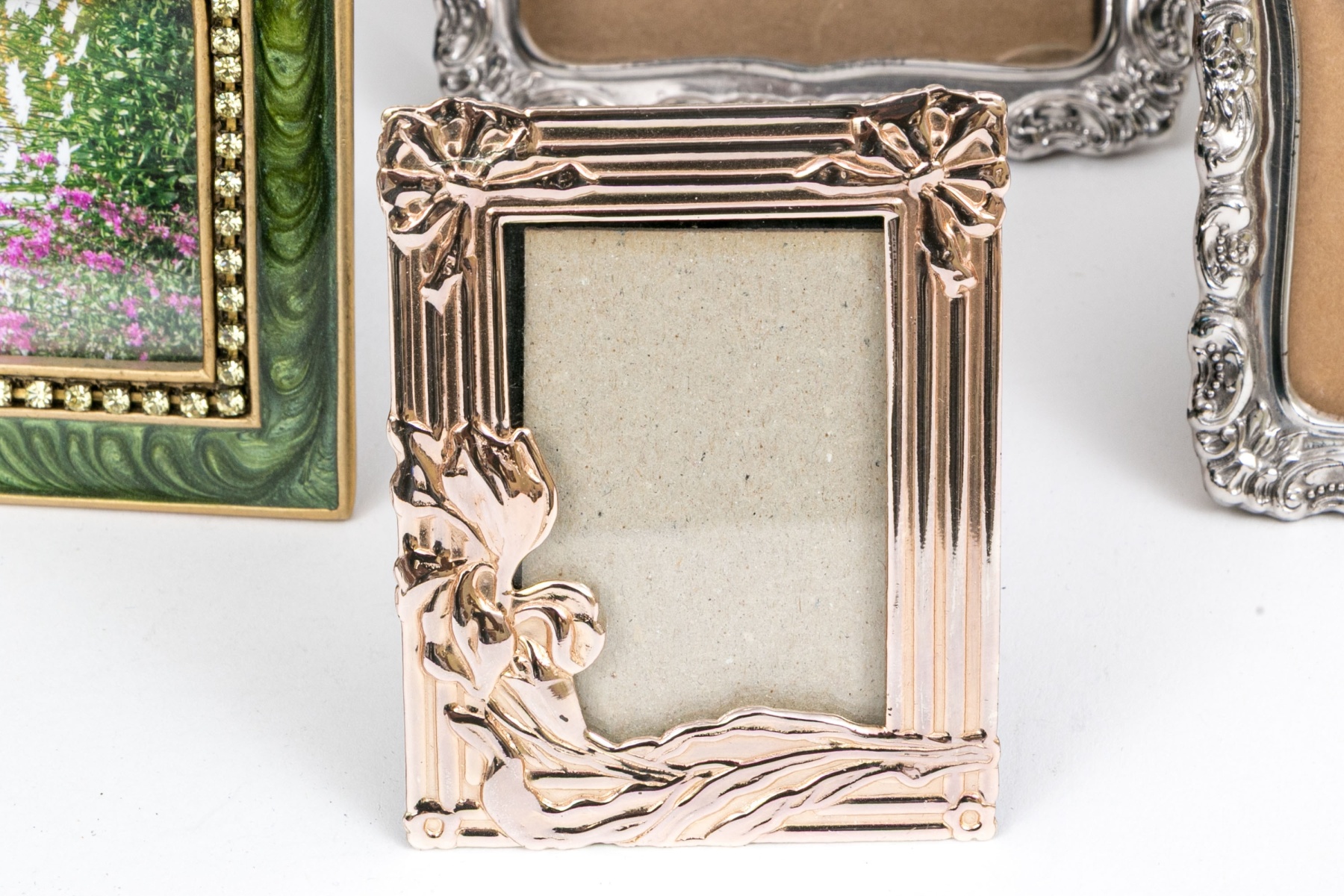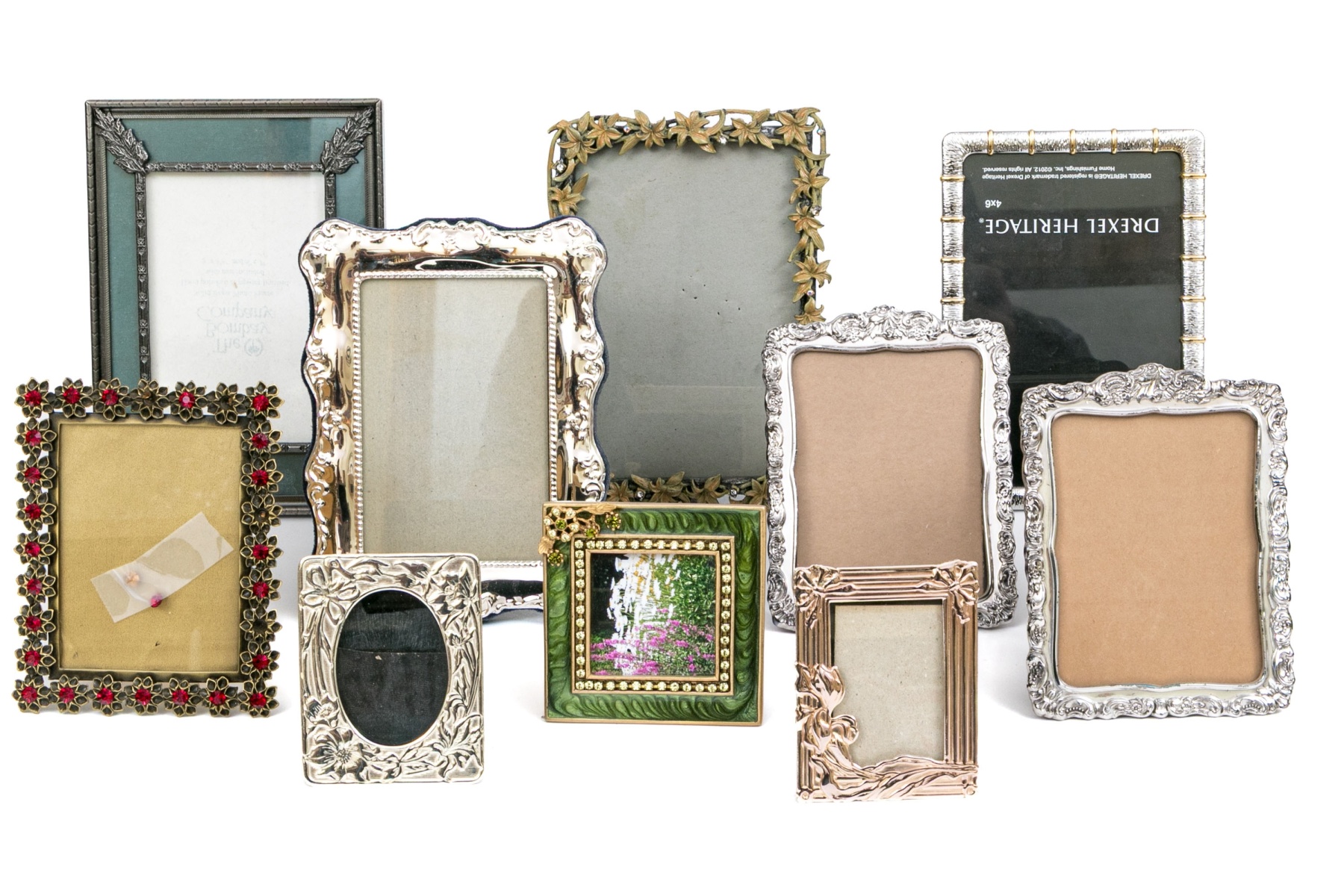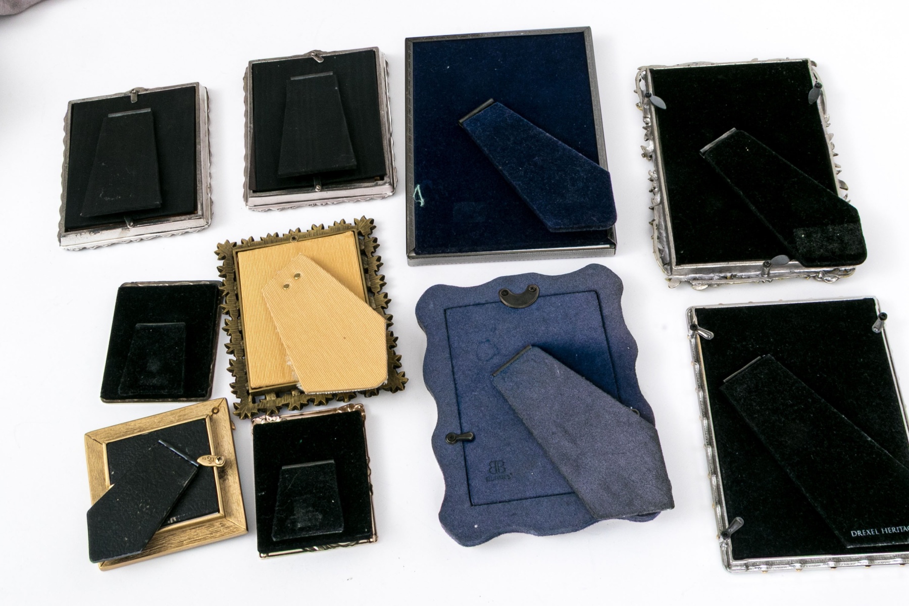 A fabulous collection of ten tabletop picture frames with easel backs includes silver plated and enameled frames of various sizes ranging from 3 3/8" H x 2 5/8" W to 6 1/2" H x 4 1/2" W.