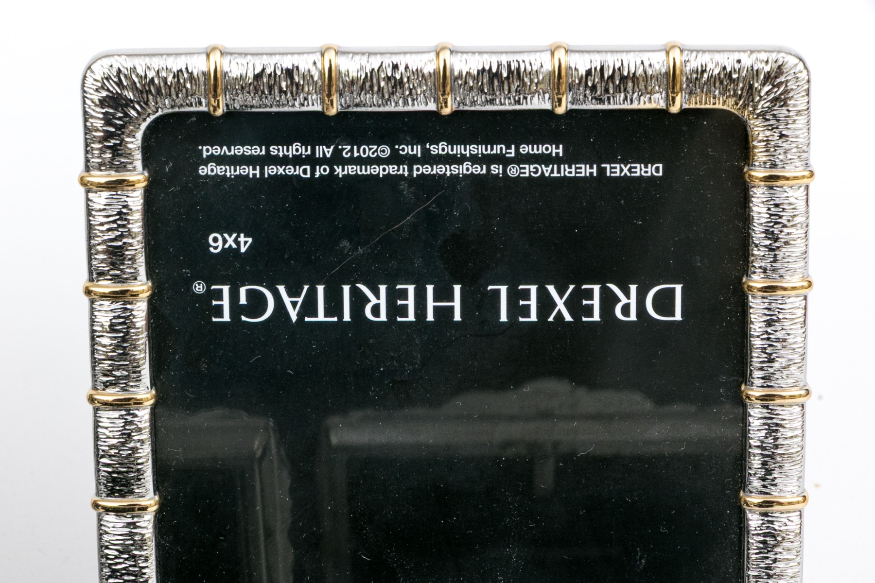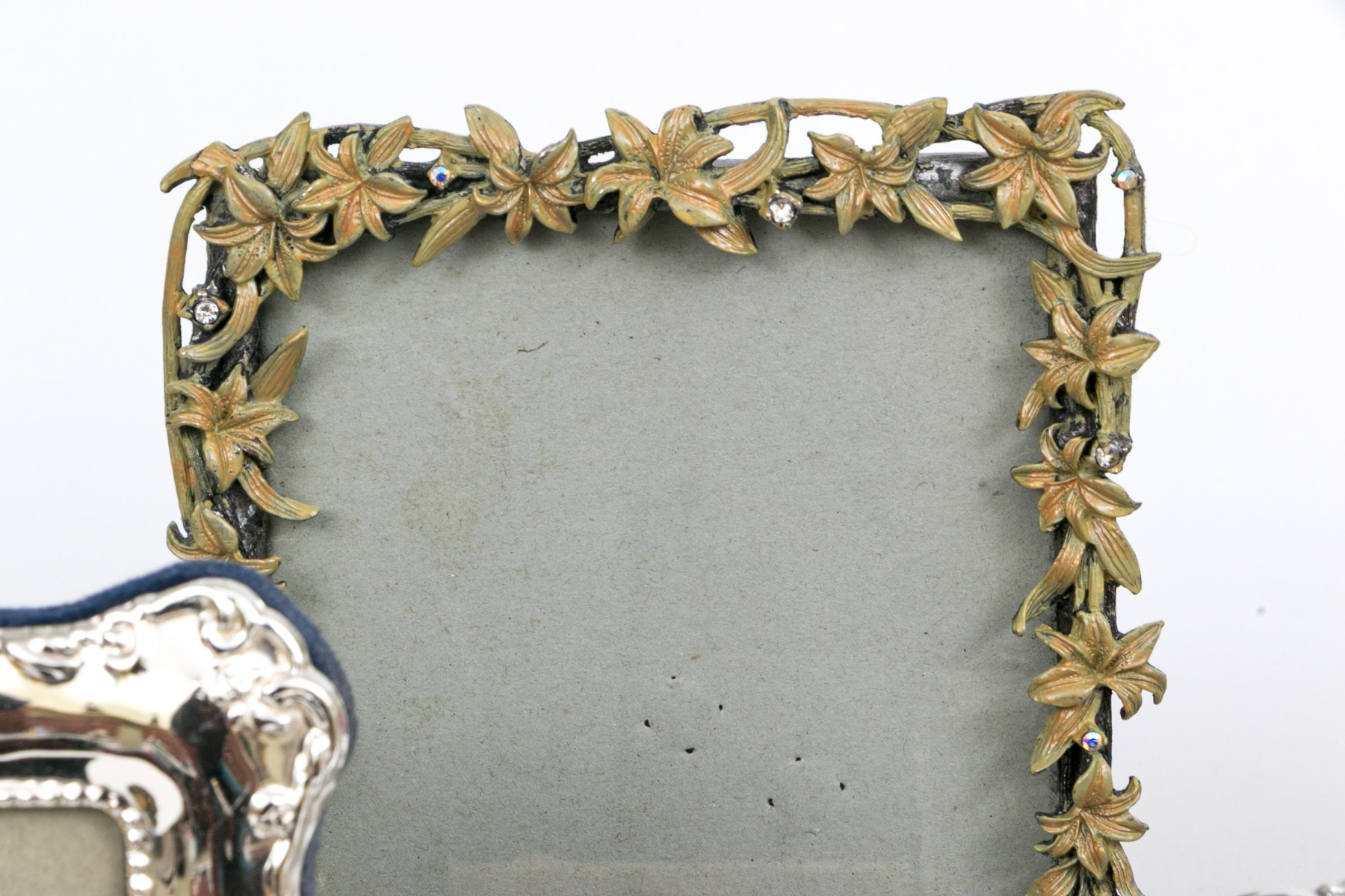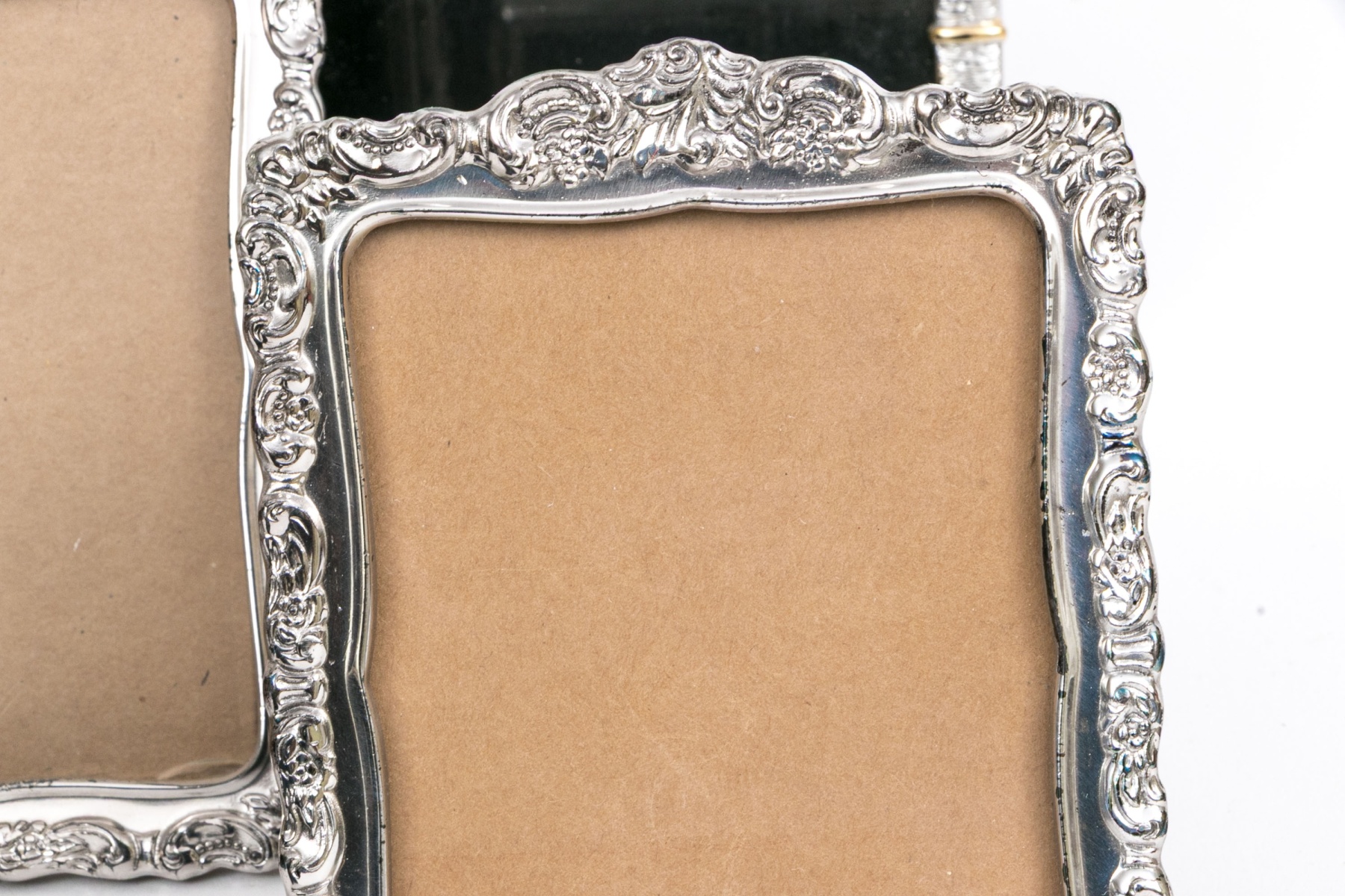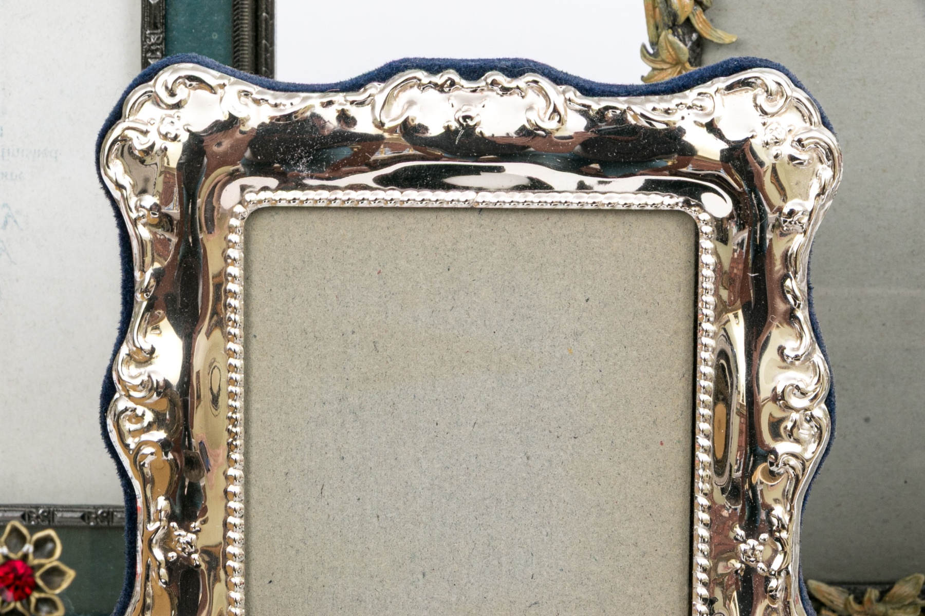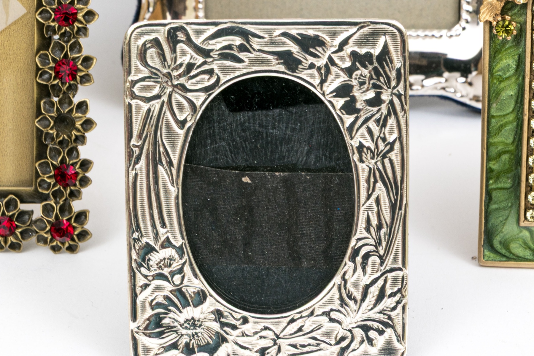 A fabulous collection of ten tabletop picture frames with easel backs includes silver plated and enameled frames of various sizes ranging from 3 3/8" H x 2 5/8" W to 6 1/2" H x 4 1/2" W.