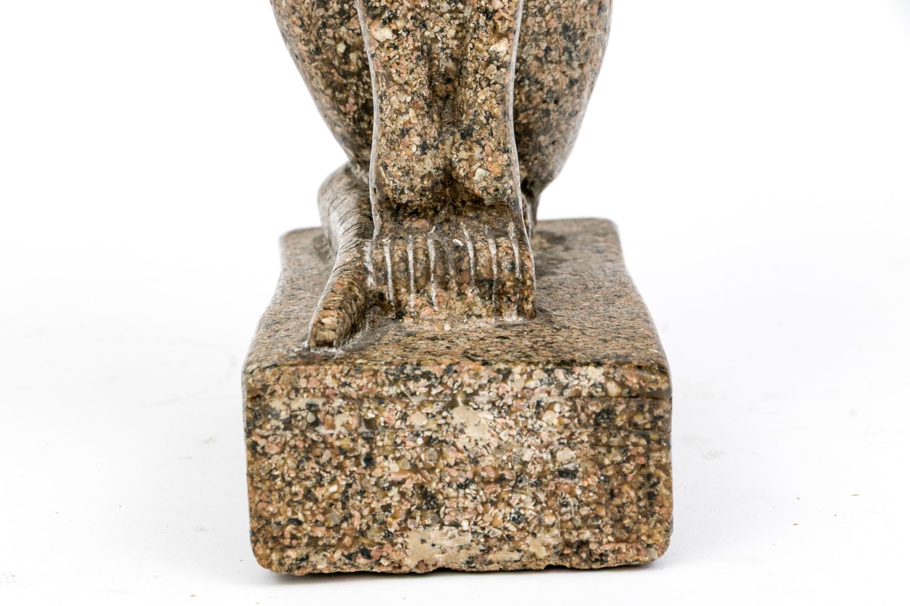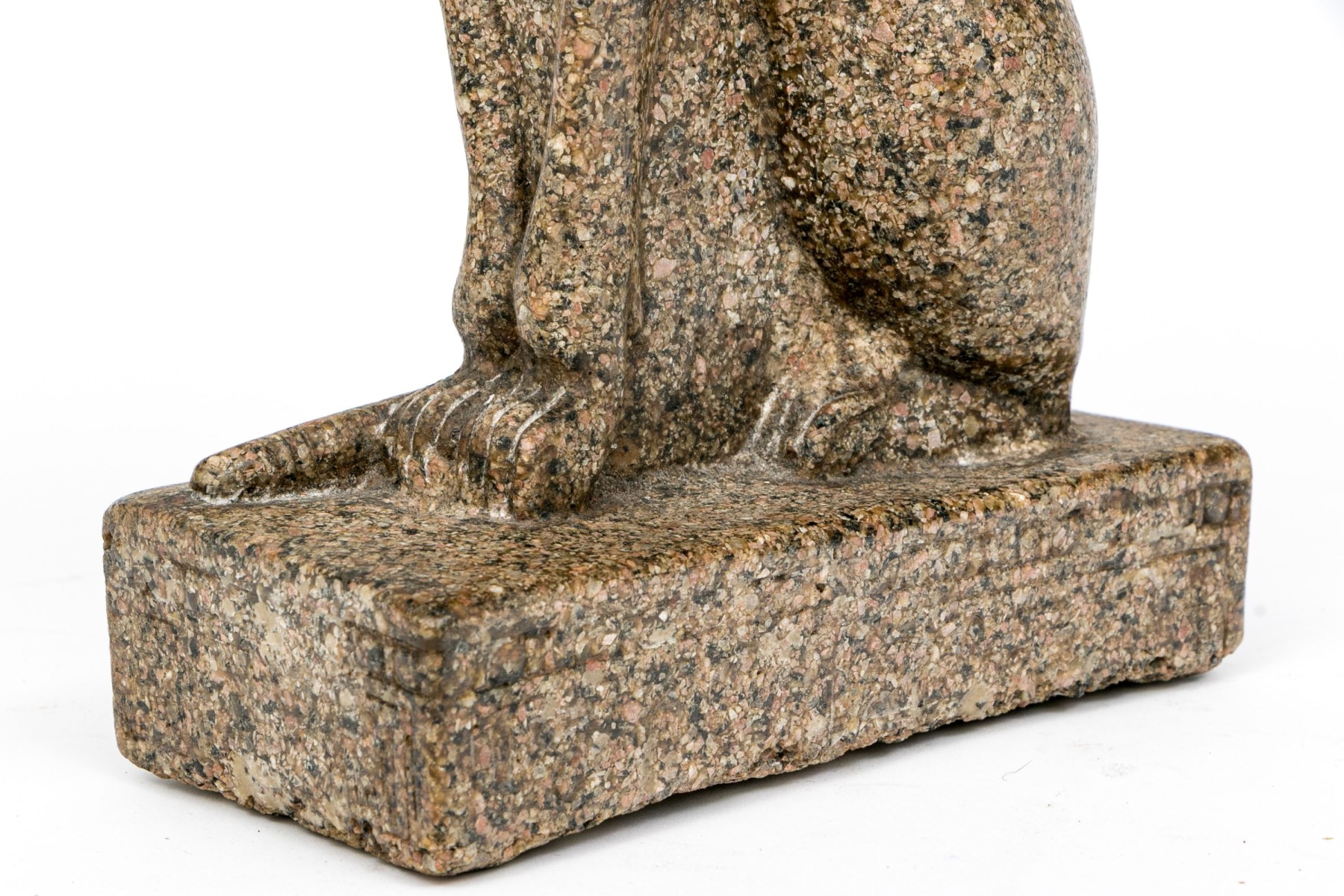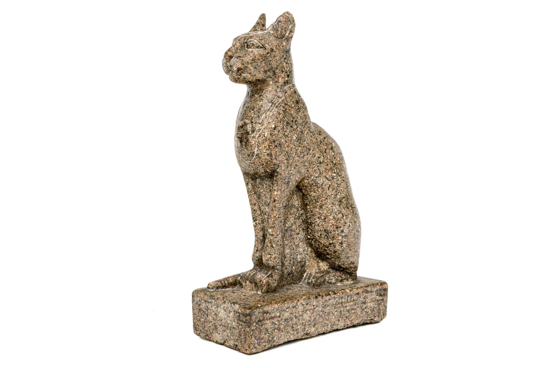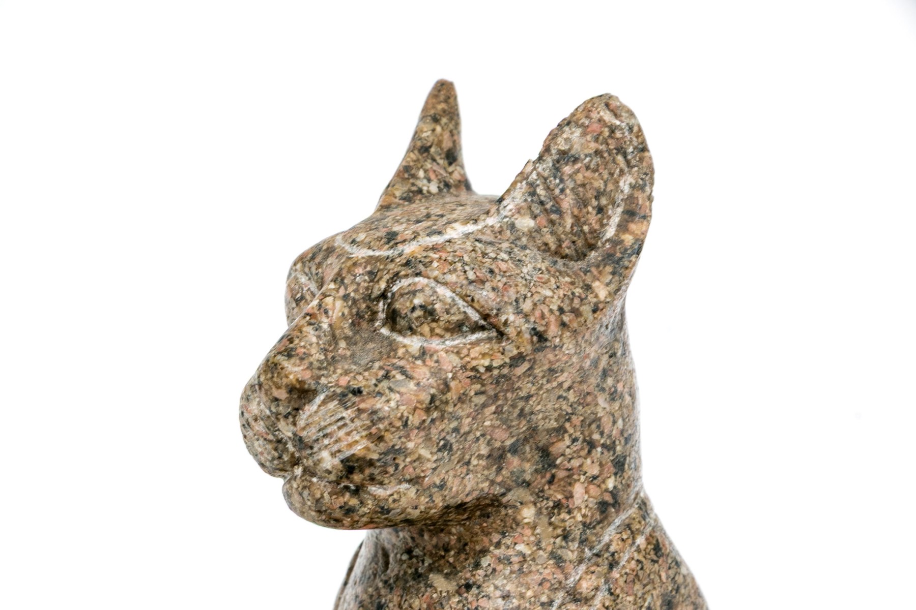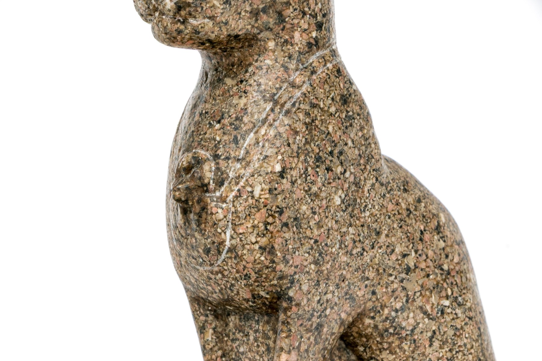 A decorative composite figurine of a stately cat in an attentive seated position over a rectangular base. Beautifully detailed and in a gorgeous olive, brown, and black speckled faux granite finish.