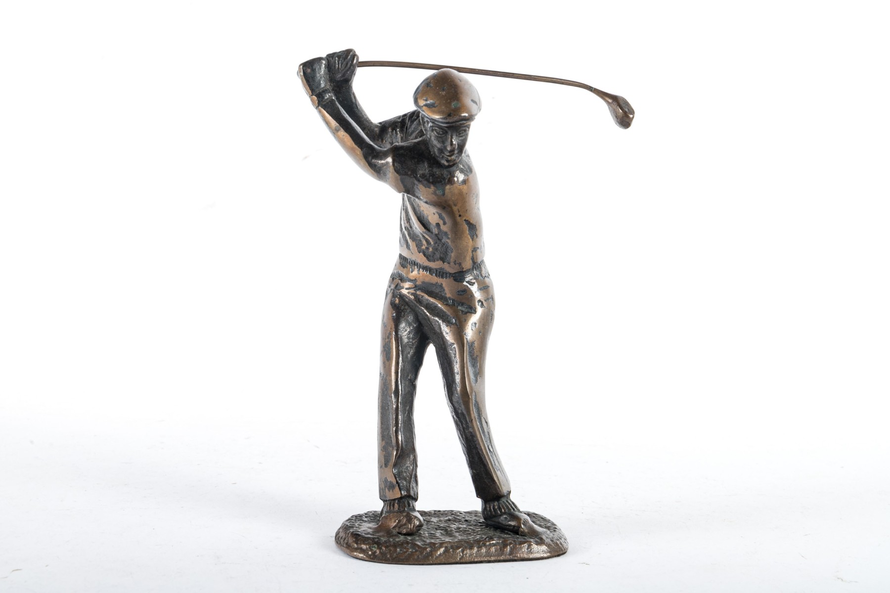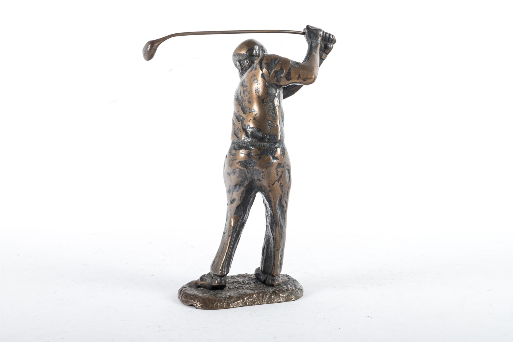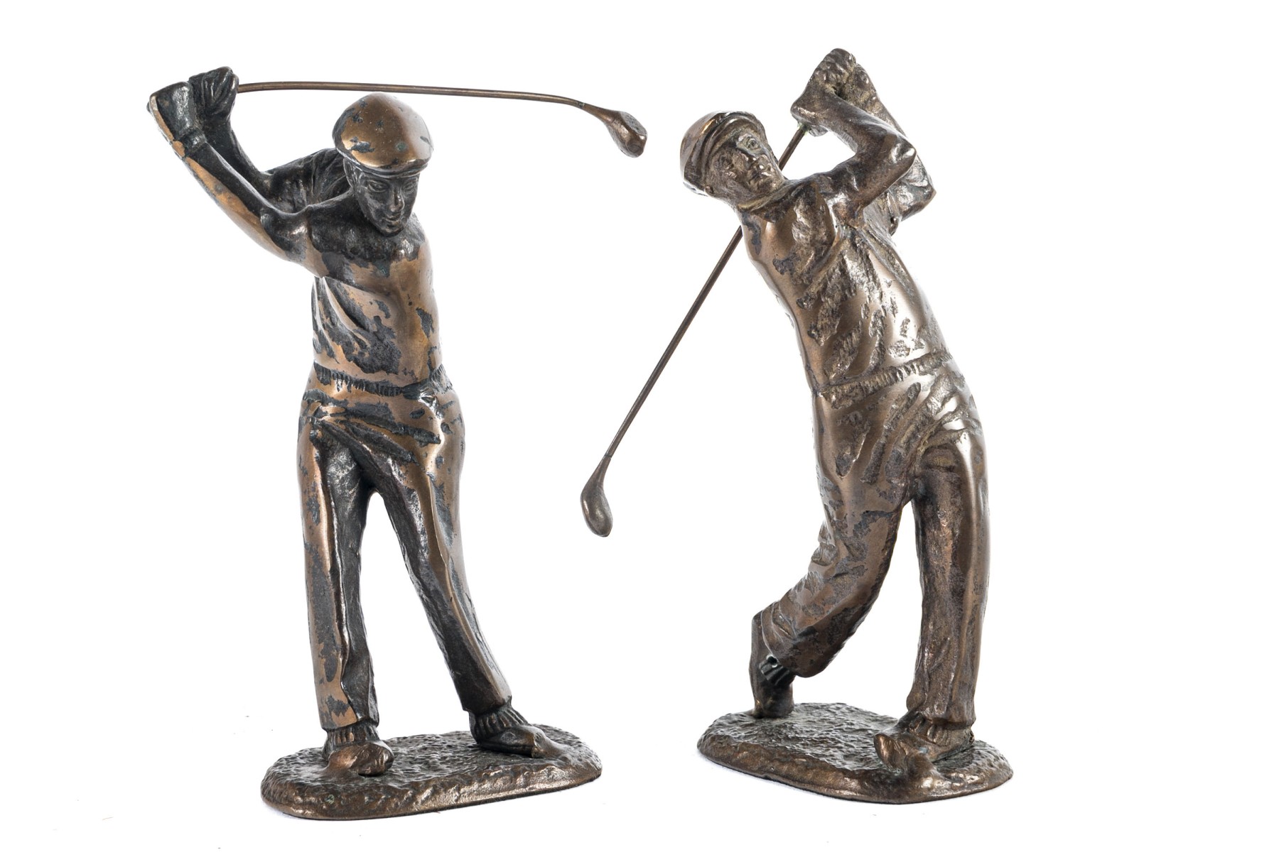 Decorative Crafts Inc. duo of bronze golfers swinging their clubs. Nicely detailed and textured throughout. One figure has the manufacturer's label on the underside of the base.