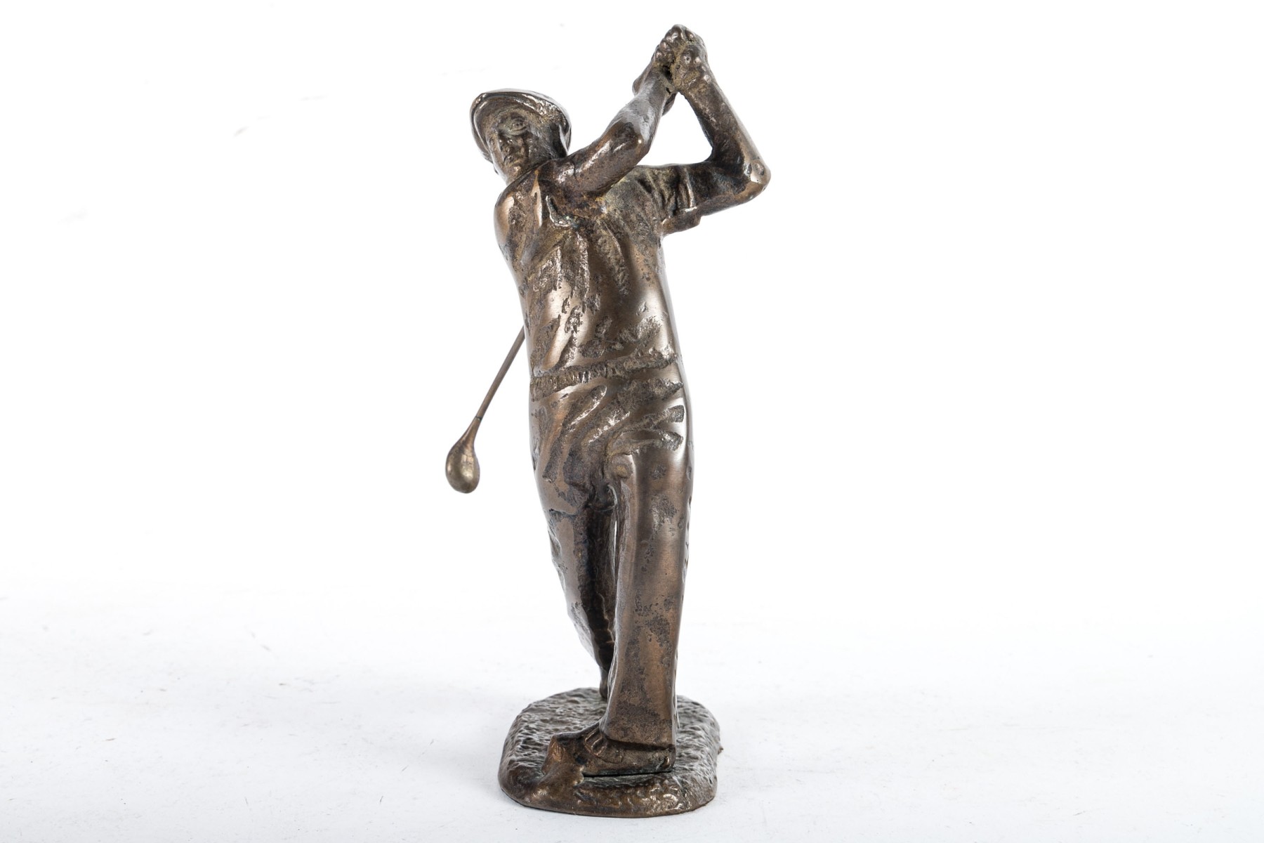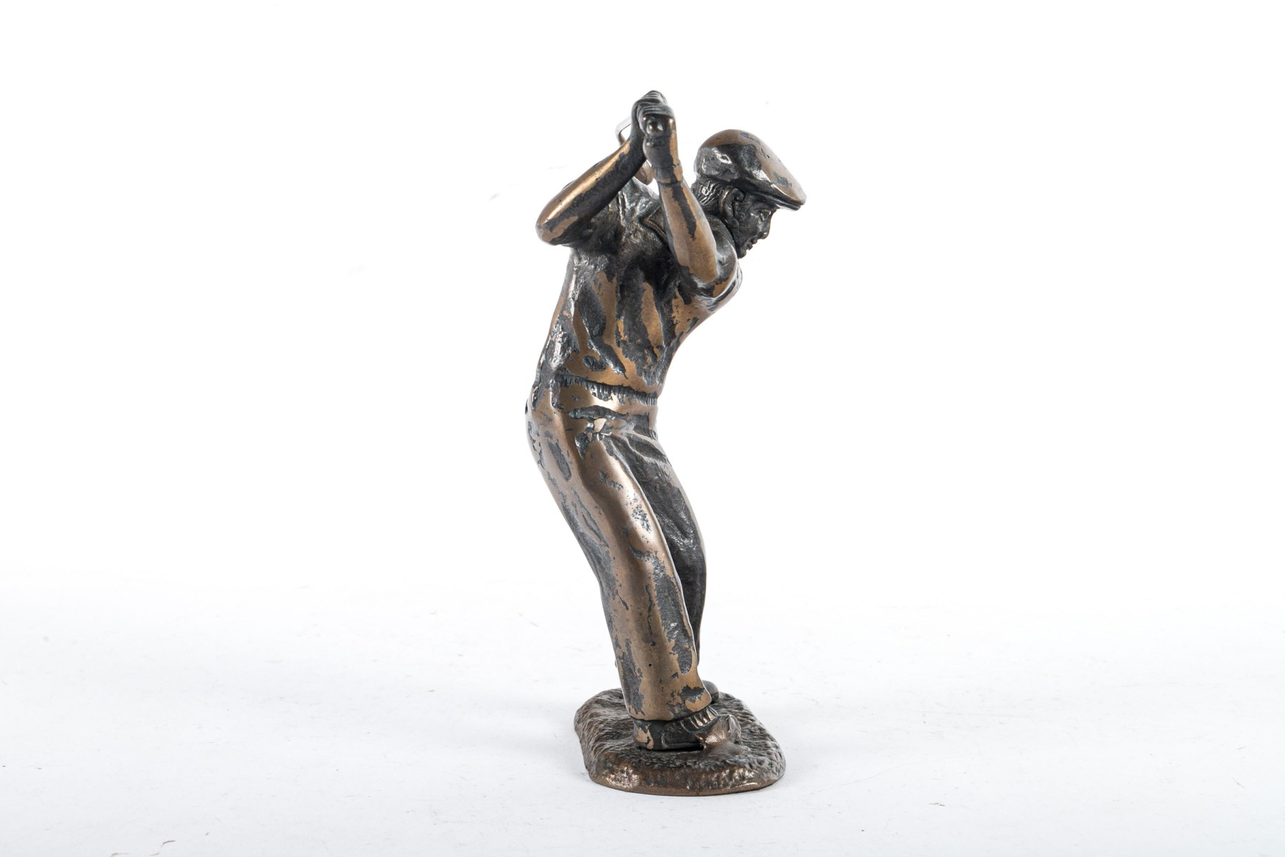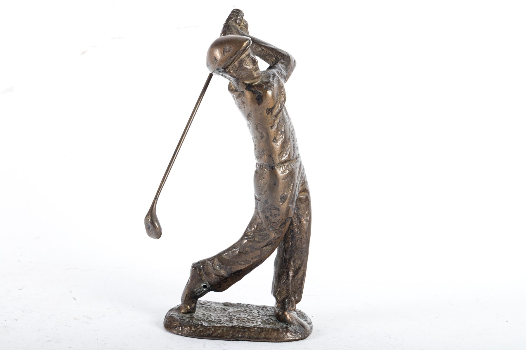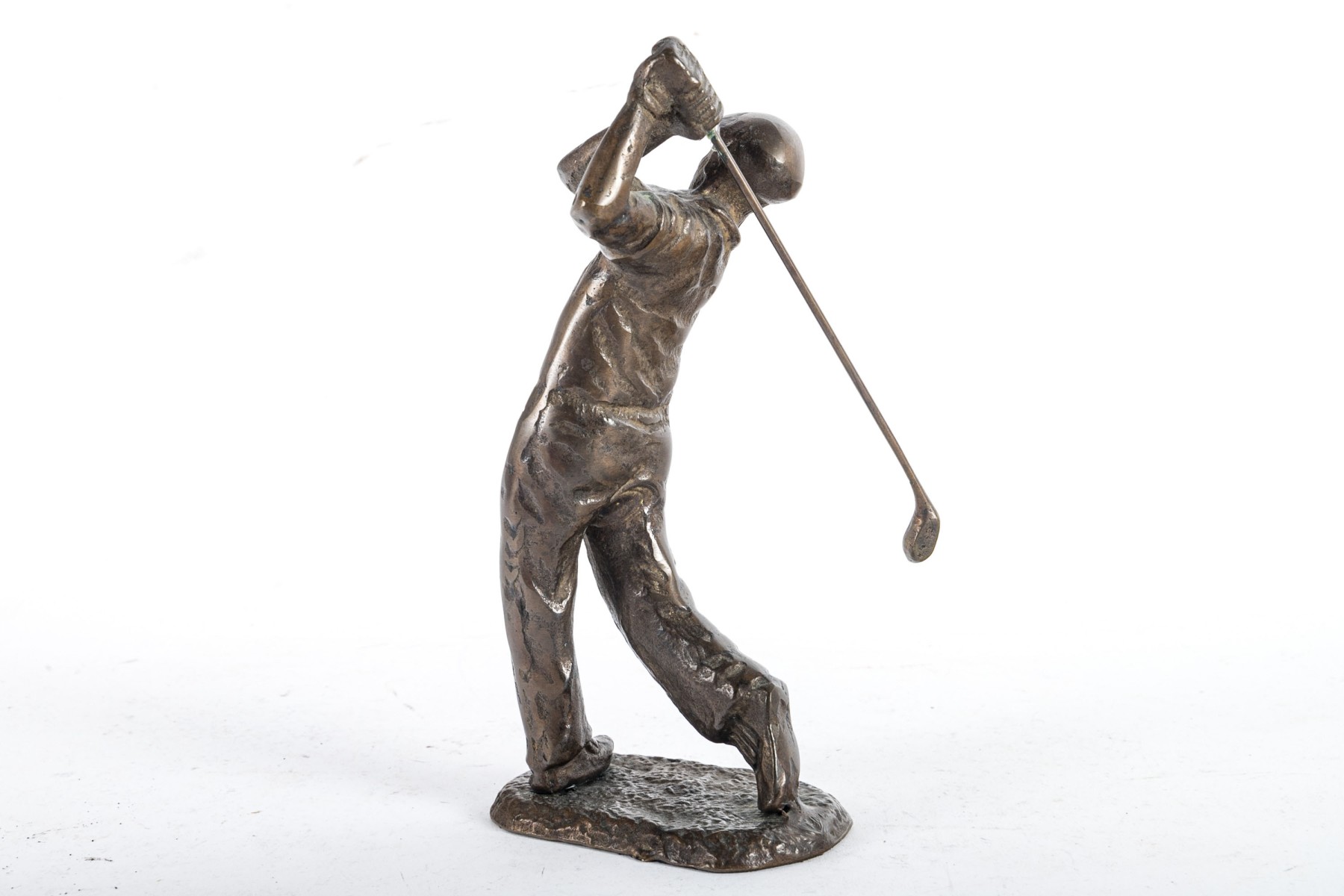 Decorative Crafts Inc. duo of bronze golfers swinging their clubs. Nicely detailed and textured throughout. One figure has the manufacturer's label on the underside of the base.