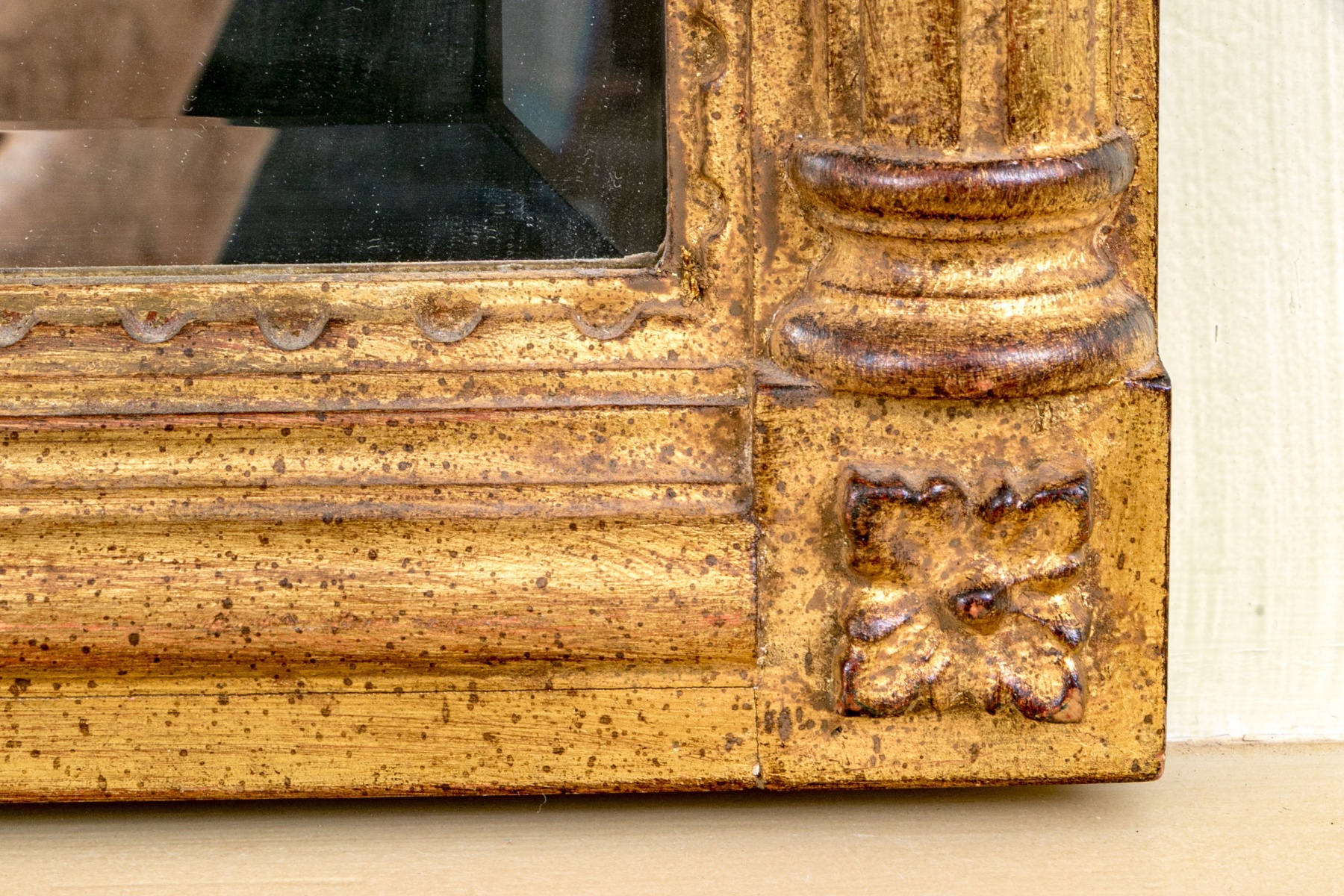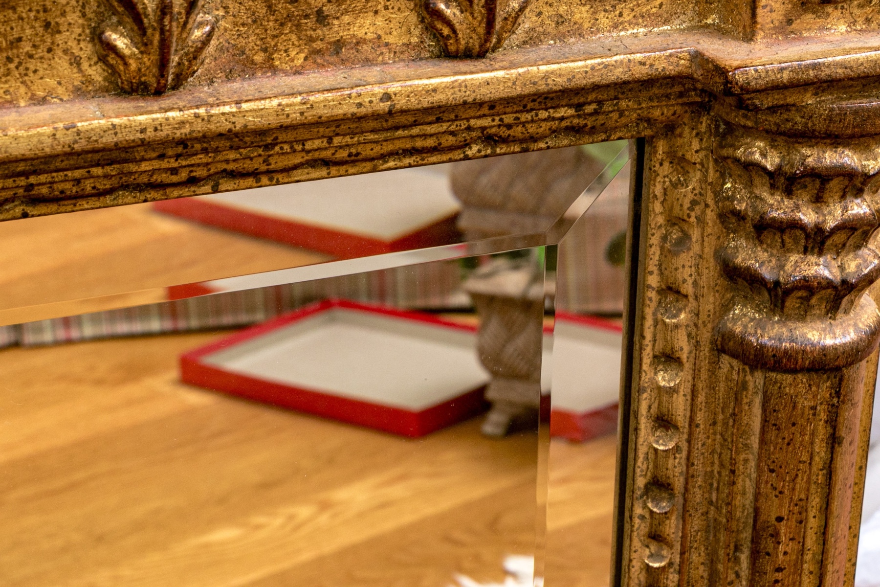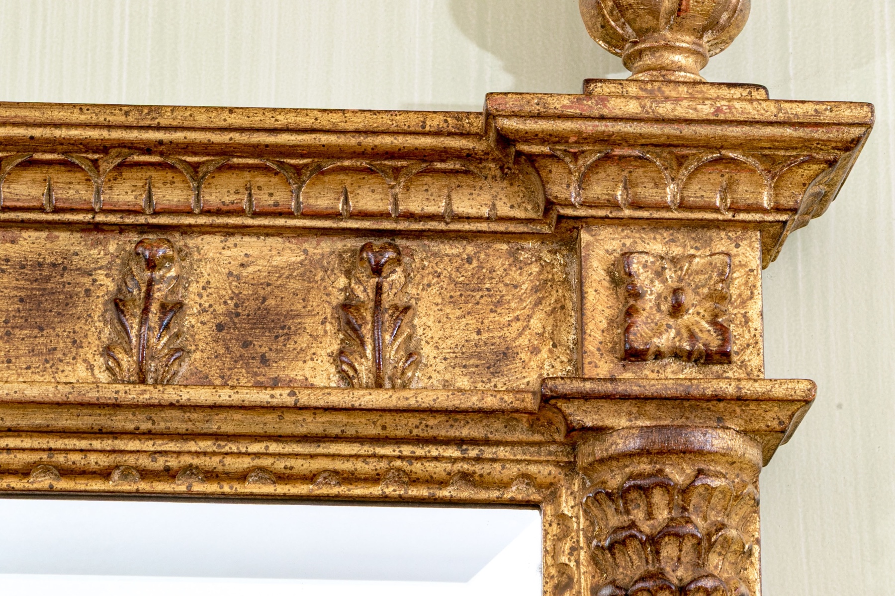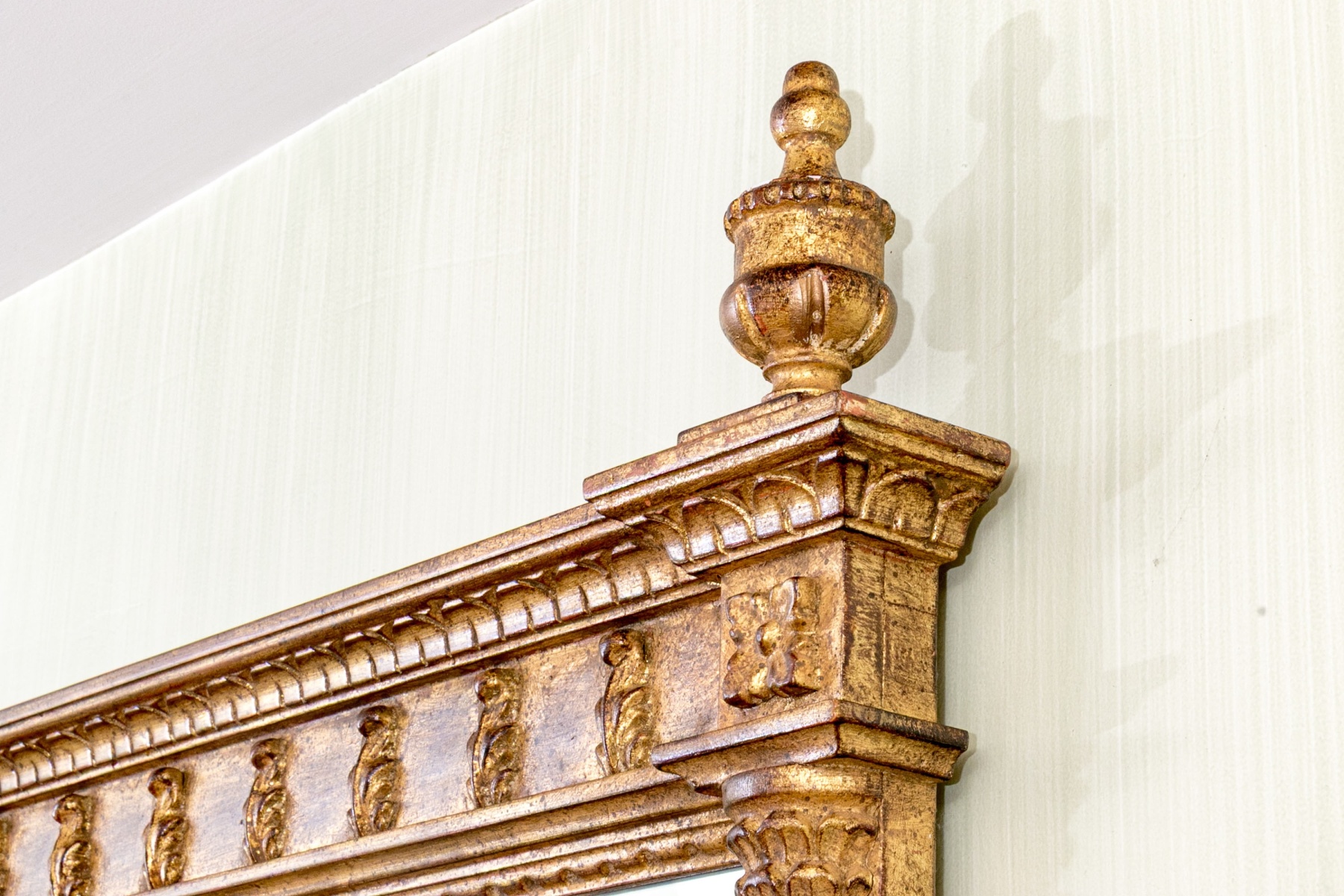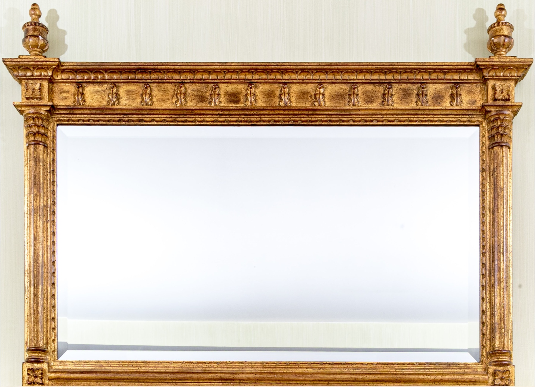 A gorgeous Decorative Crafts Inc. rectangular beveled mirror in a stunning antiqued neoclassical frame showcasing urn form finials at the ends of a crown moulded top with petaled relief and a frieze of vertical feather motifs echoing feathery capitals of fluted column posts at the sides.