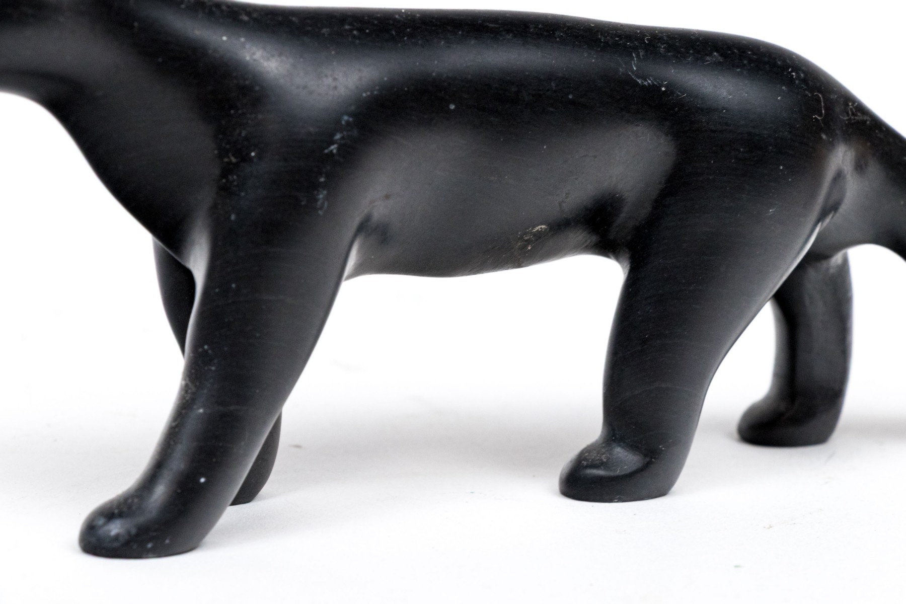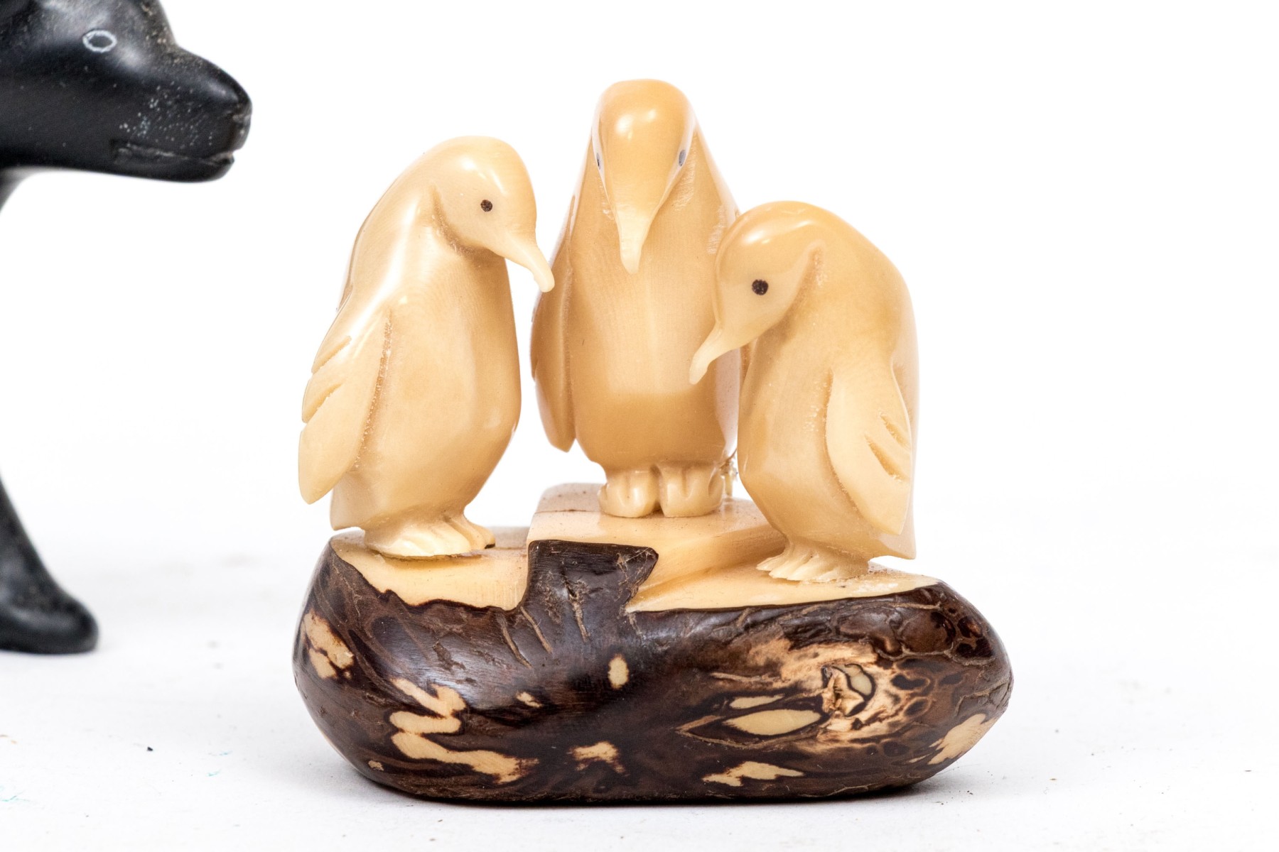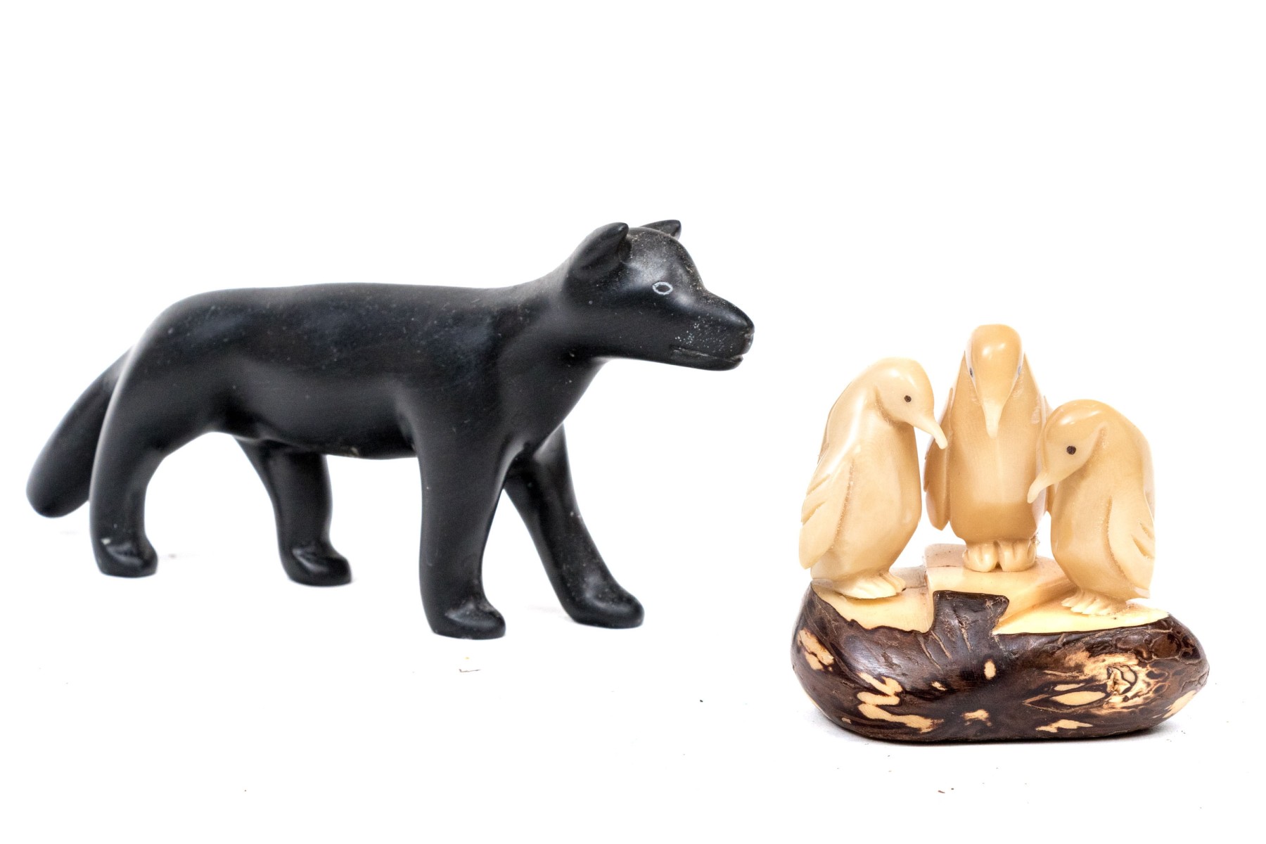 A wonderful duo of decorative animal figurine comprised of a black metal wolf signed Joe E. under one paw, along with a bone carving of three penguins.