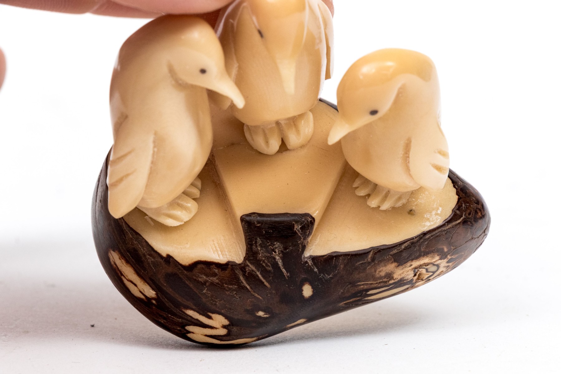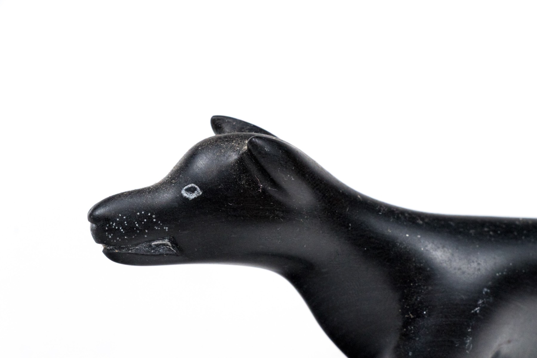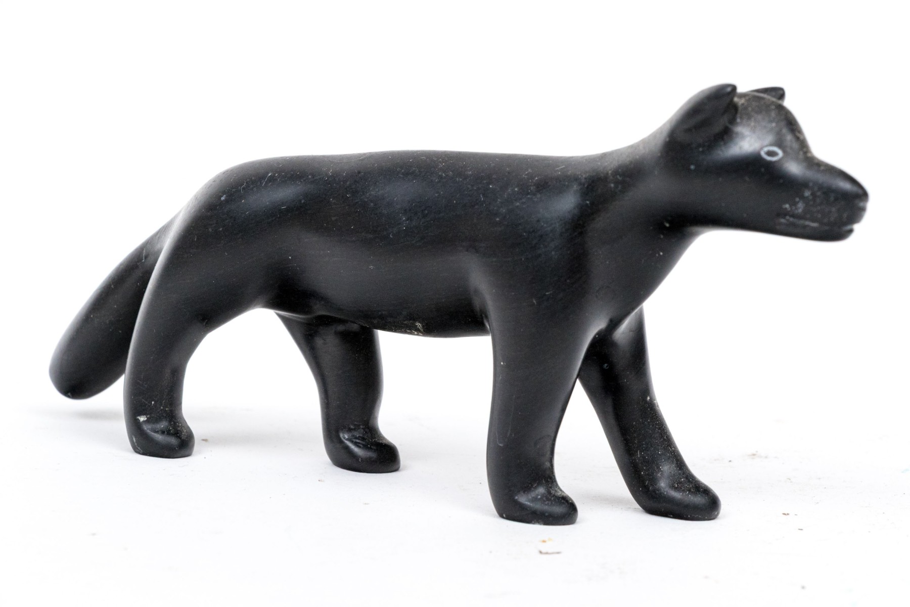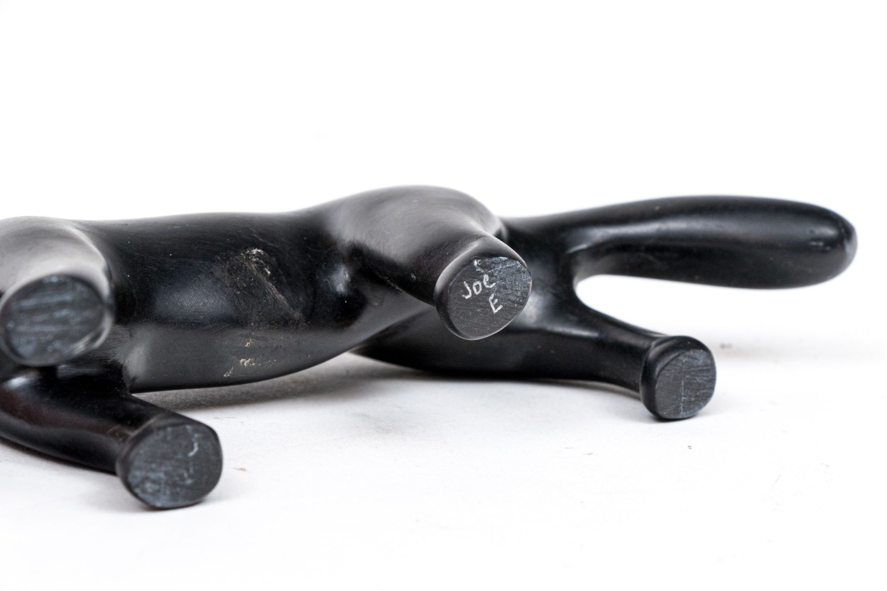 A wonderful duo of decorative animal figurine comprised of a black metal wolf signed Joe E. under one paw, along with a bone carving of three penguins.
