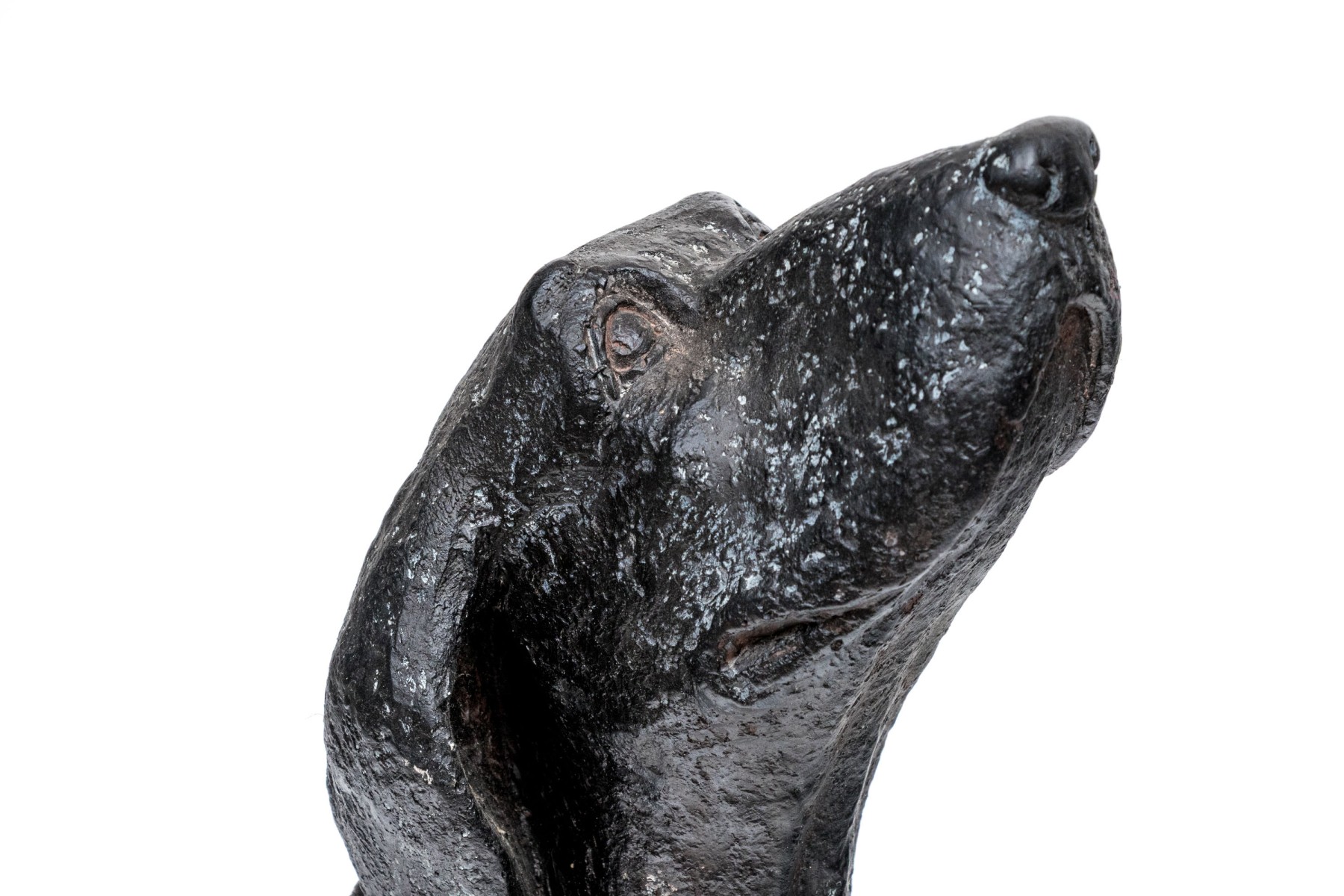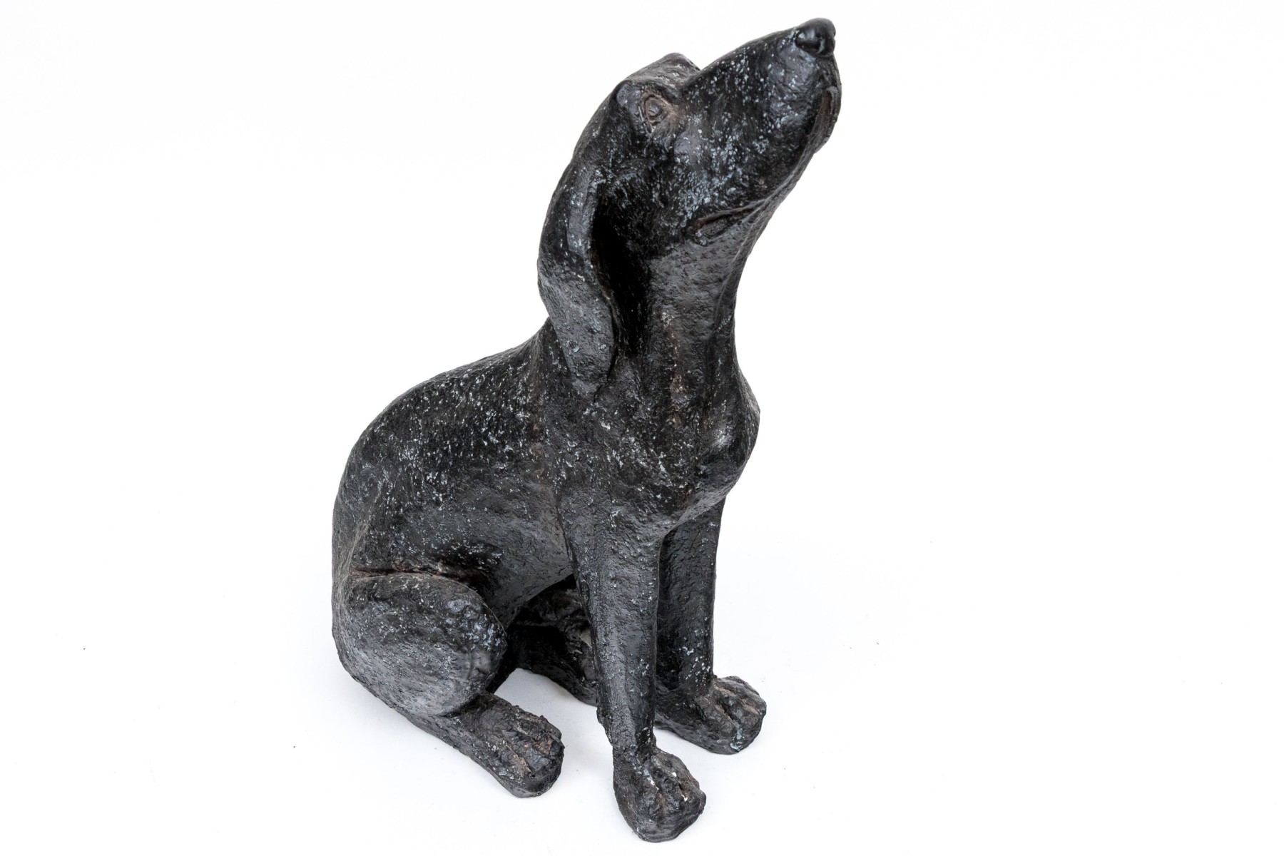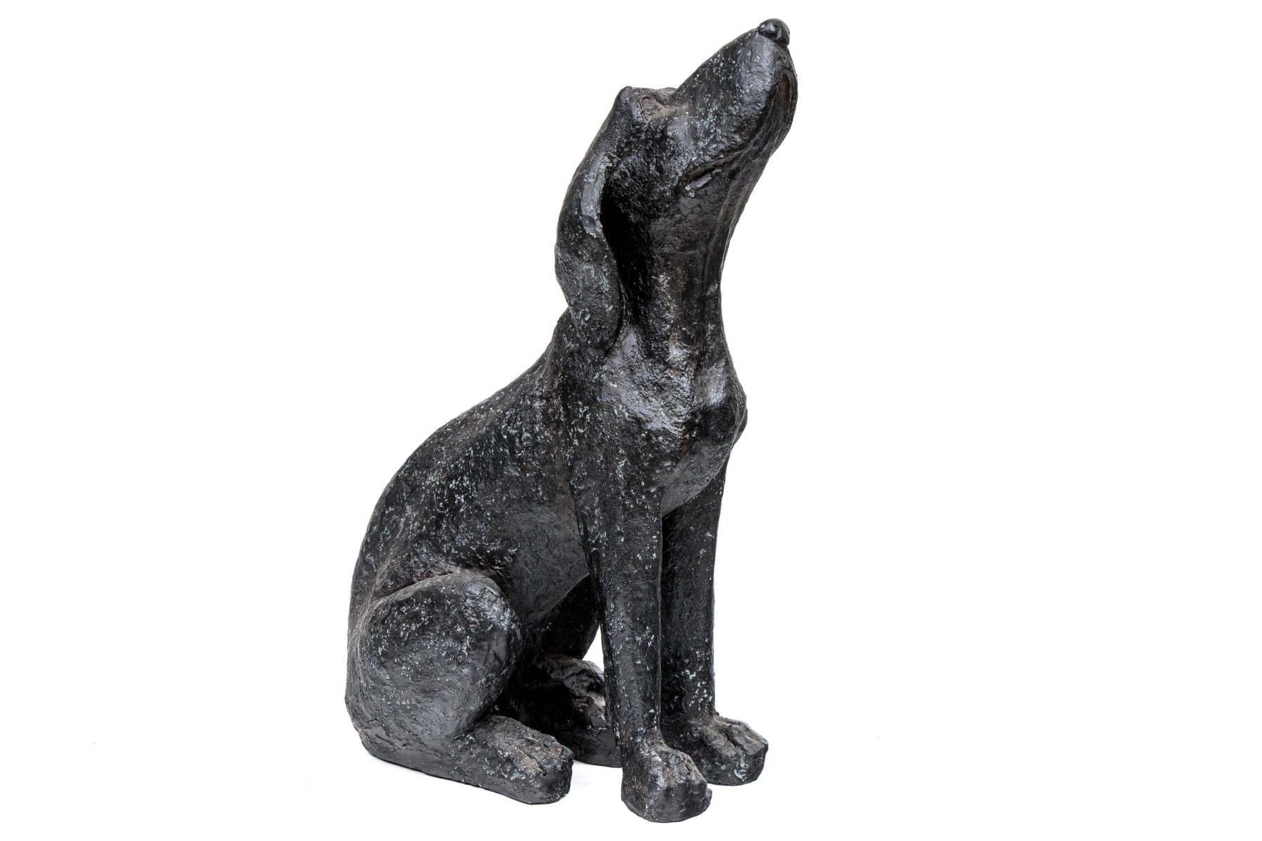 A charming decorative black resin figure of a seated dog with long floppy ears posed with its head lifted and nose pointed up attentively. Nicely detailed and textured throughout.