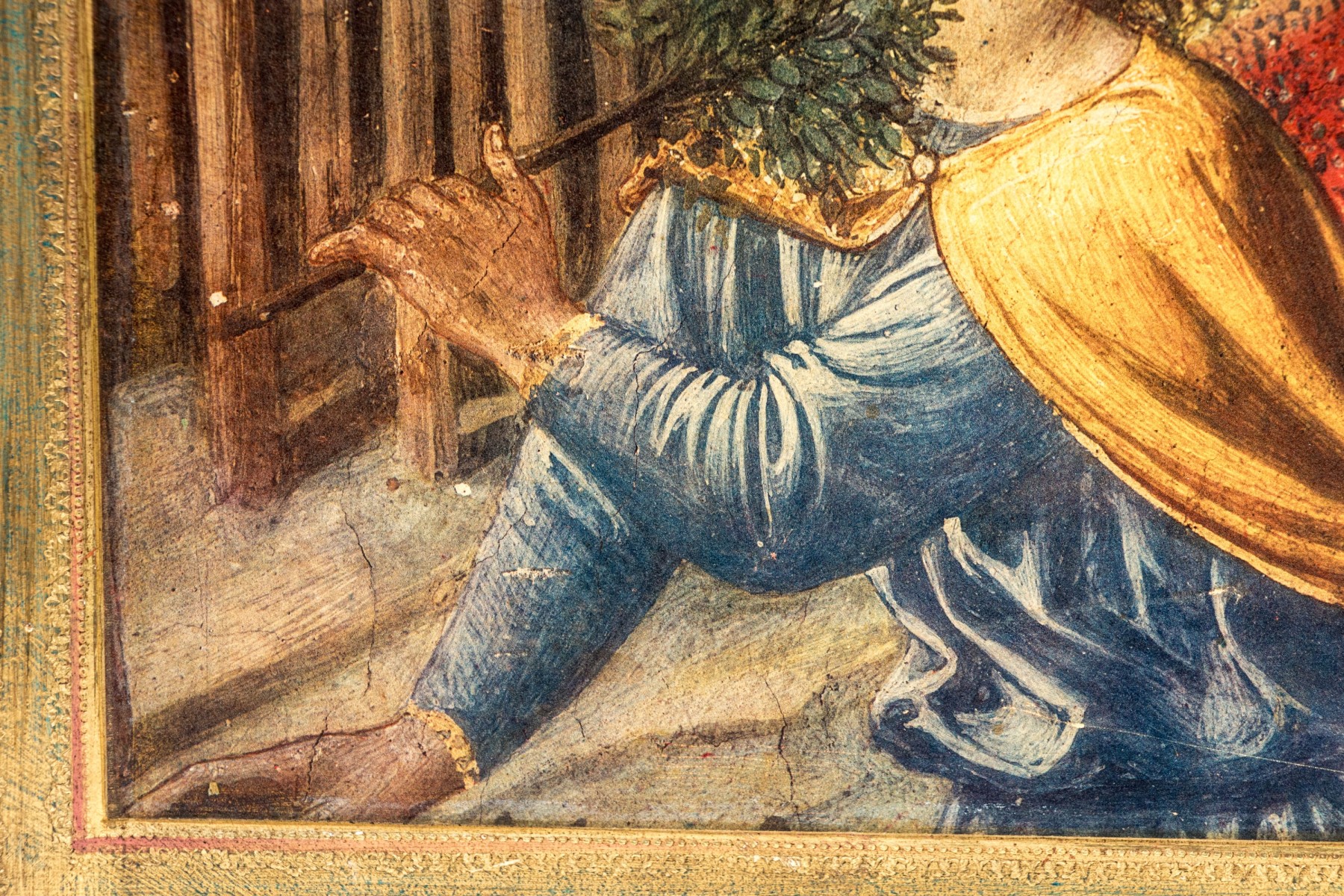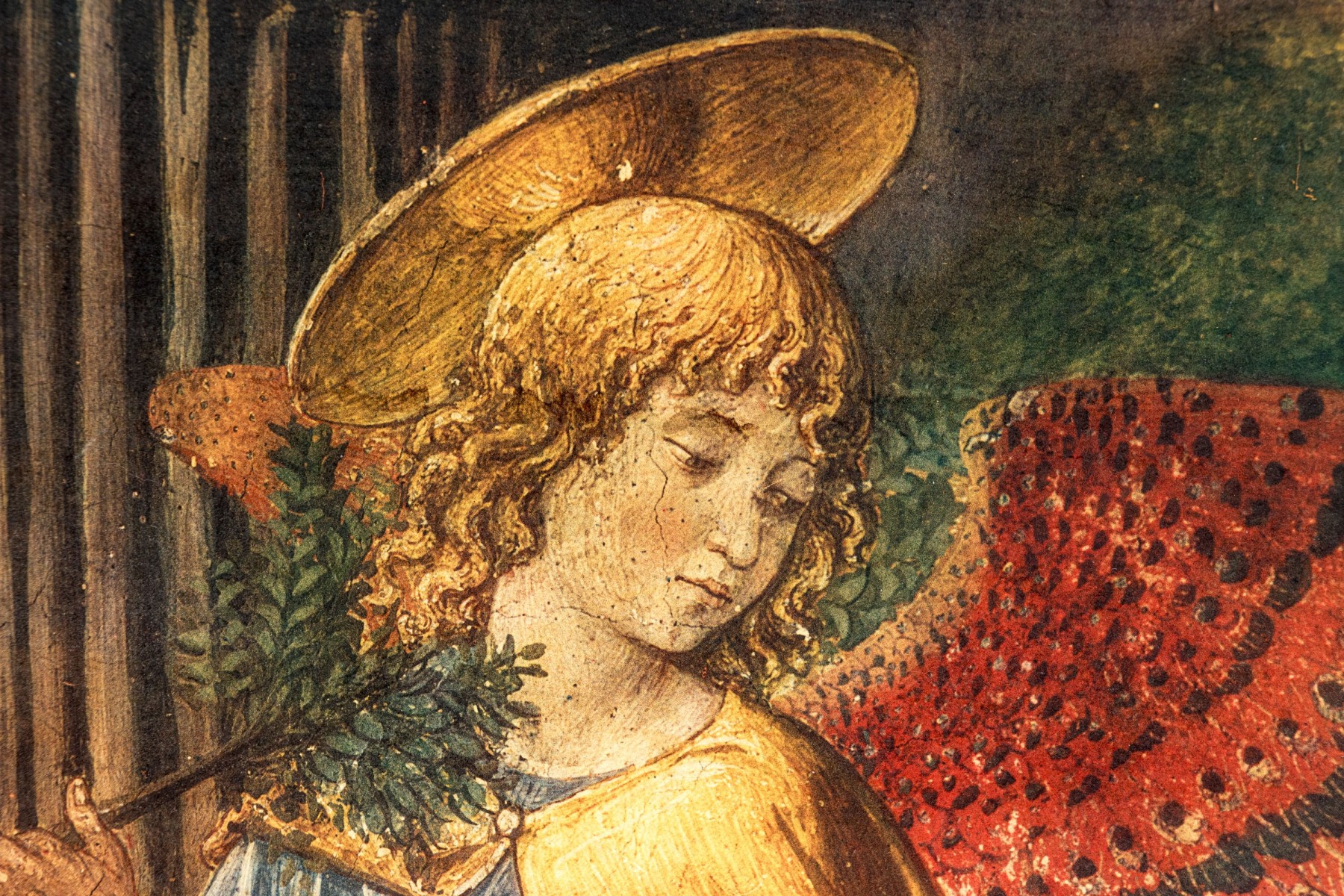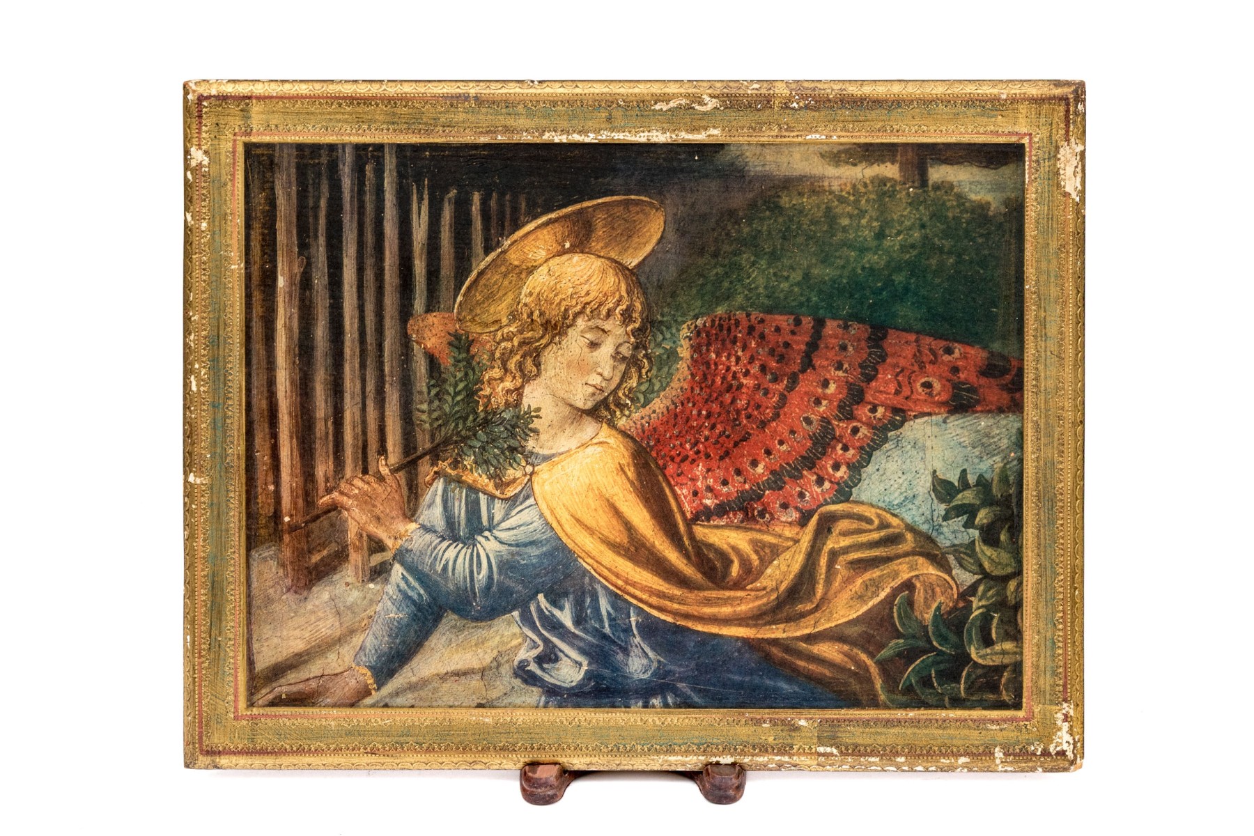 Depicting an angel with gilt halo holding an olive branch with gilt finished trim. Presented unframed. Affixed with an Alinari Brothers paper label on the frame verso.