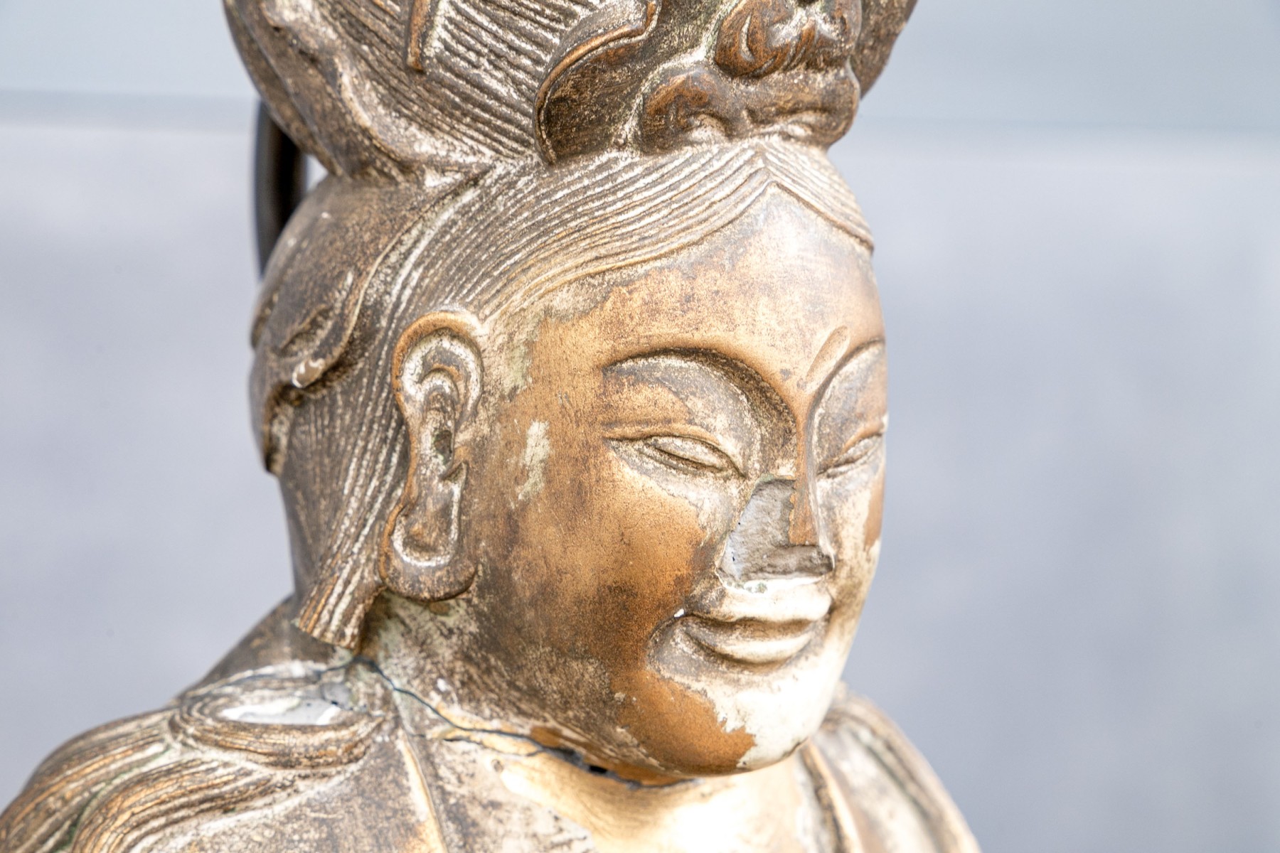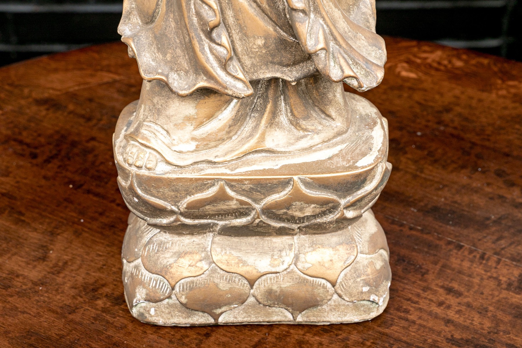 Presented standing on a lotus base with hands clasped wearing wonderfully draped robe.
